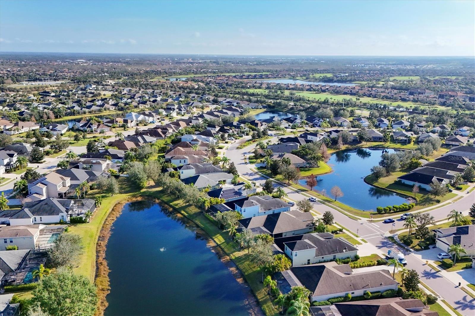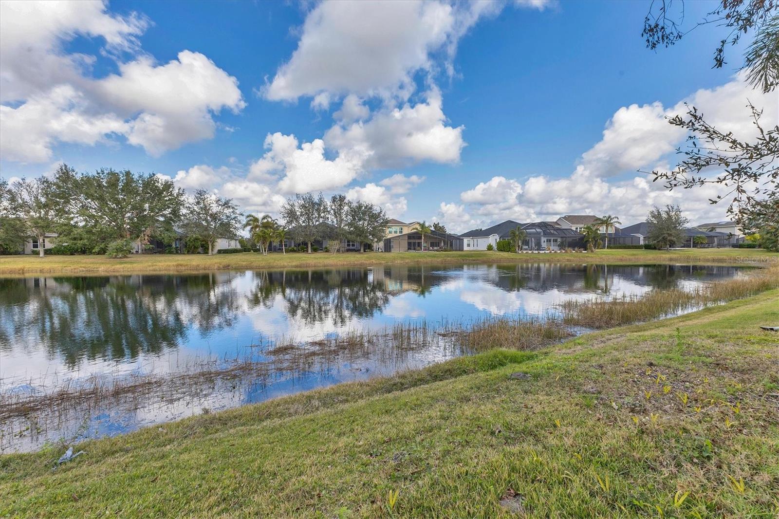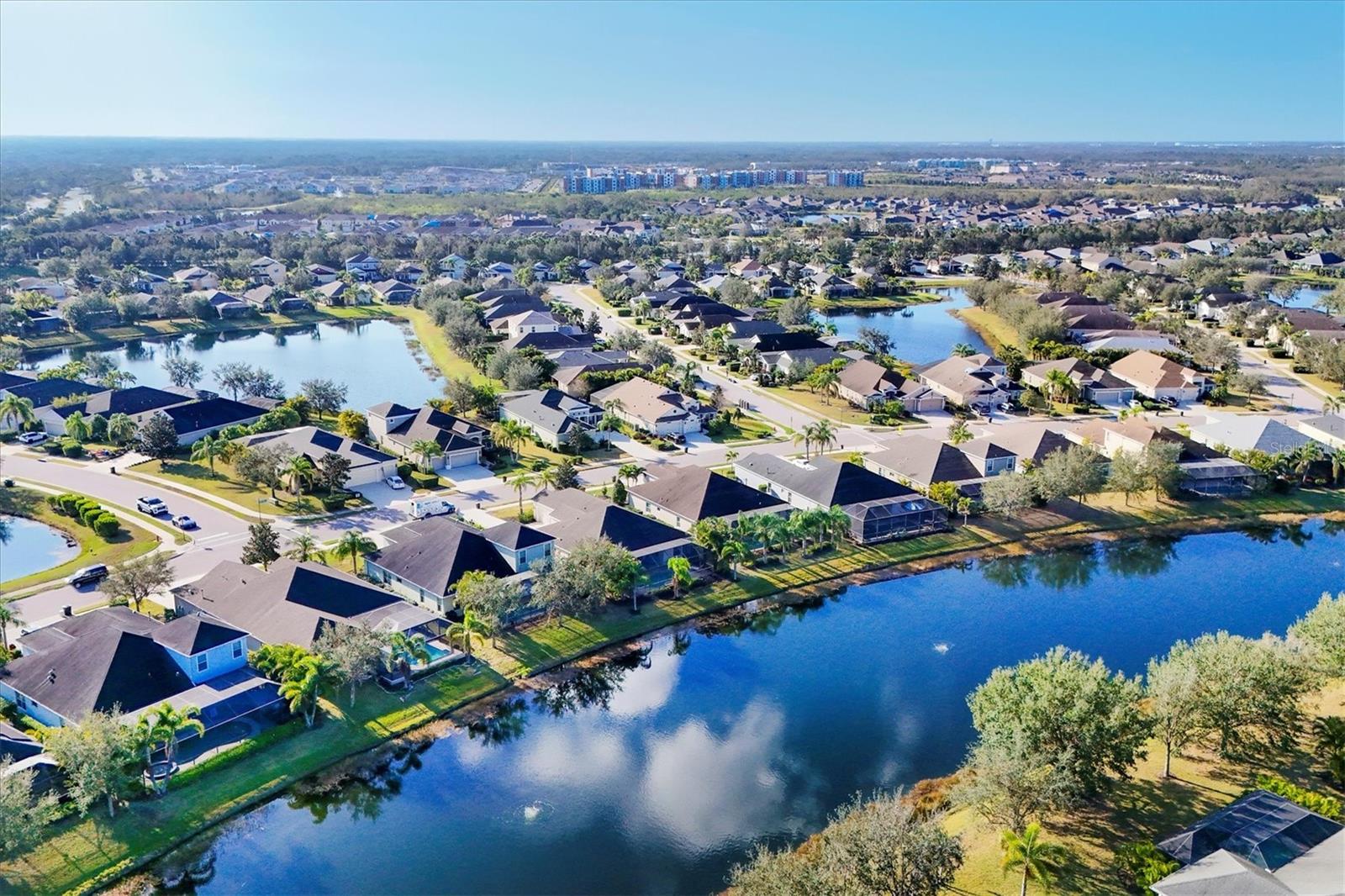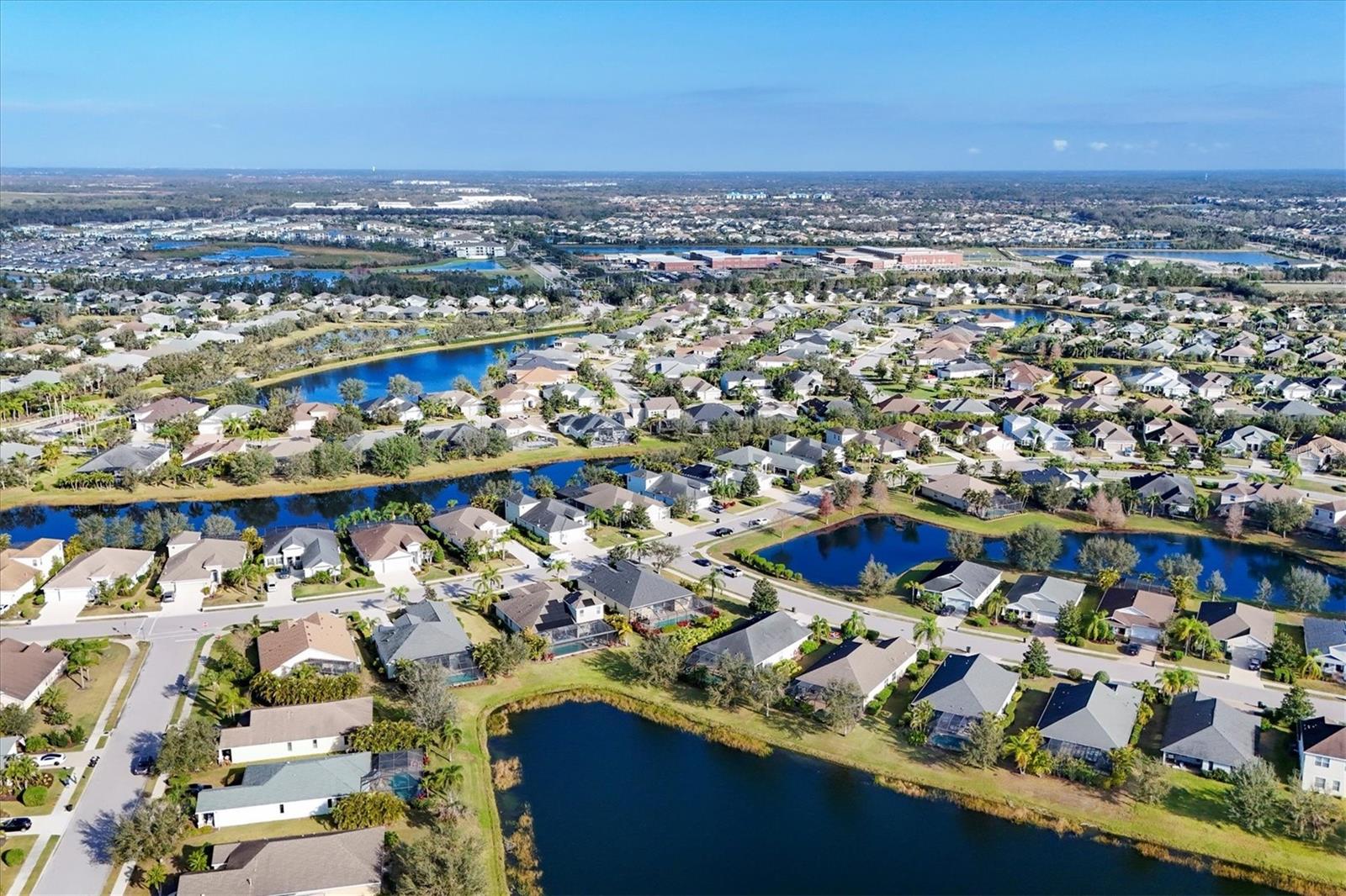 PRICE IMPROVEMENT!!! This stunning home with 2,999 sq ft of living space features 4 bedrooms plus 2 dens and 4 full baths, with a primary bedroom located on both floors for ultimate convenience. The interior boasts high ceilings and 18x18 ceramic tile throughout the main living areas, creating an elegant and open atmosphere. Enjoy serene lake views from your backyard, complete with a heated pool for year-round relaxation. The great room features tray ceilings and pocket sliders that open to a spacious lanai, perfect for entertaining. The open kitchen is a chef’s dream, with granite countertops, Cherry Spice cabinetry, and a gourmet island. The home also includes a formal dining room, a laundry room with extra storage, and a spacious 3-car garage. Set in a Lakewood Ranch gated community, residents enjoy access to tennis courts, dog parks, a splash park, and plenty of walking trails for outdoor recreation. Minutes to UTC, hospital, interstate and plenty of shopping and restaurants.