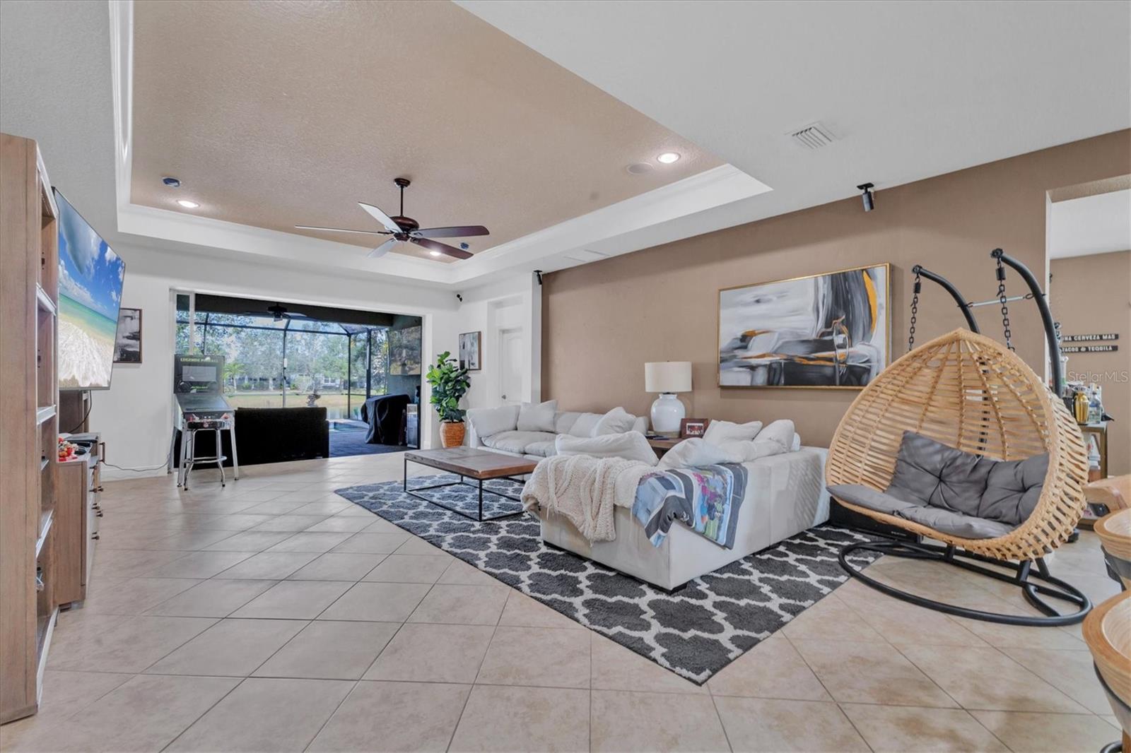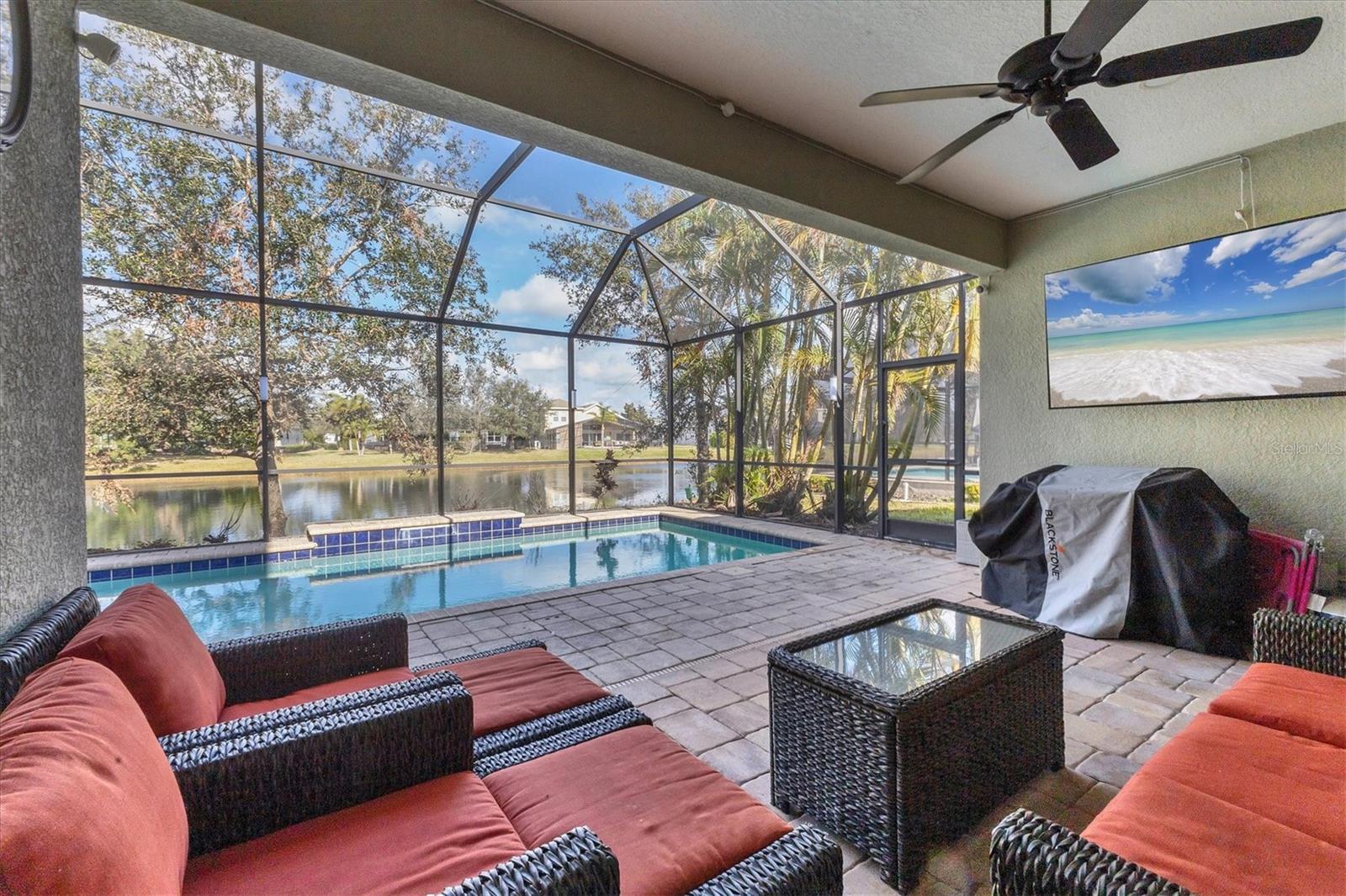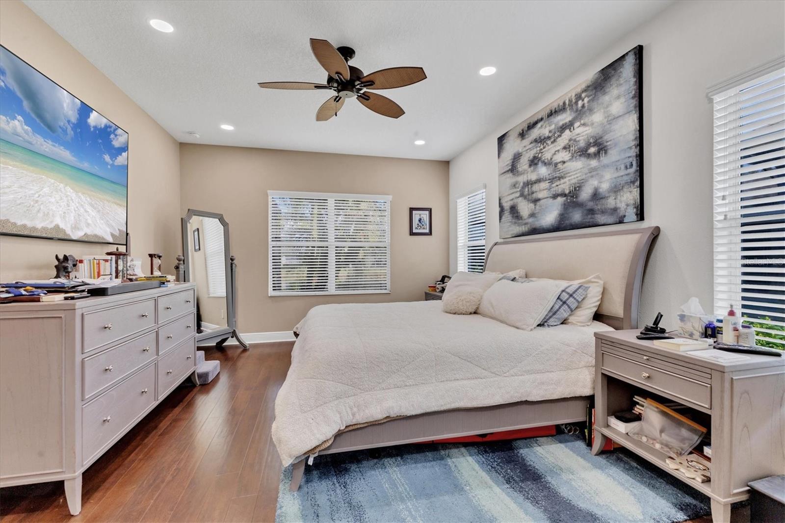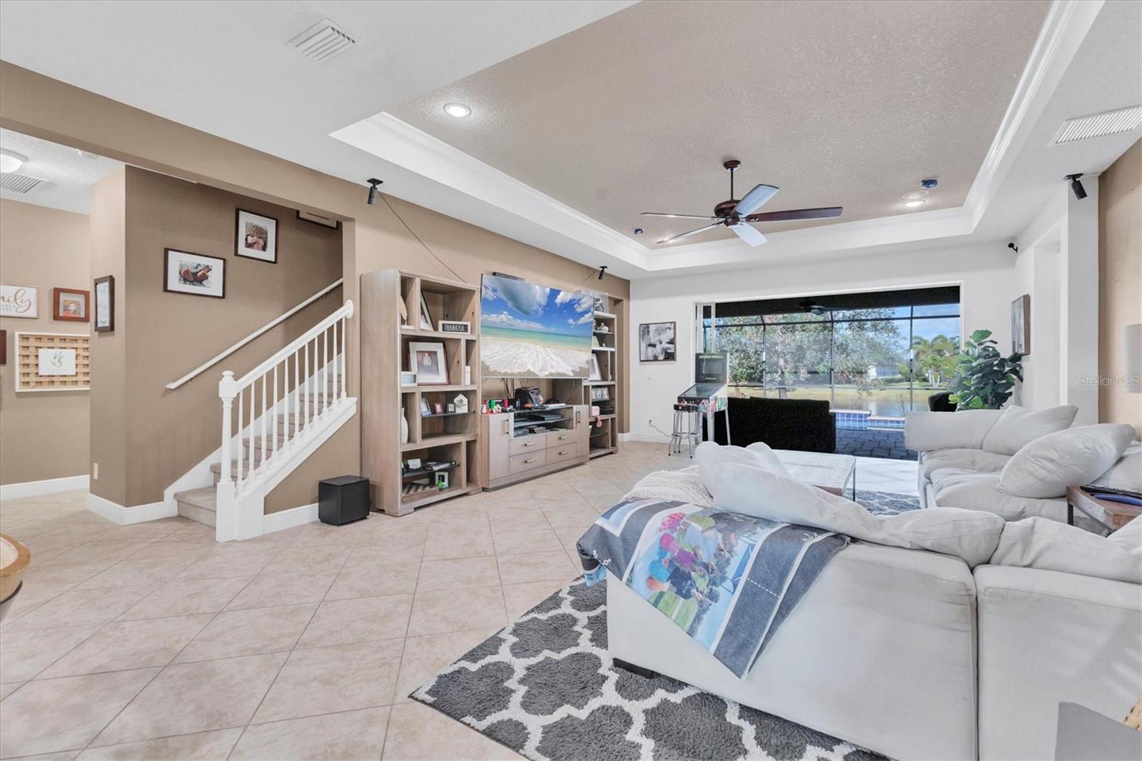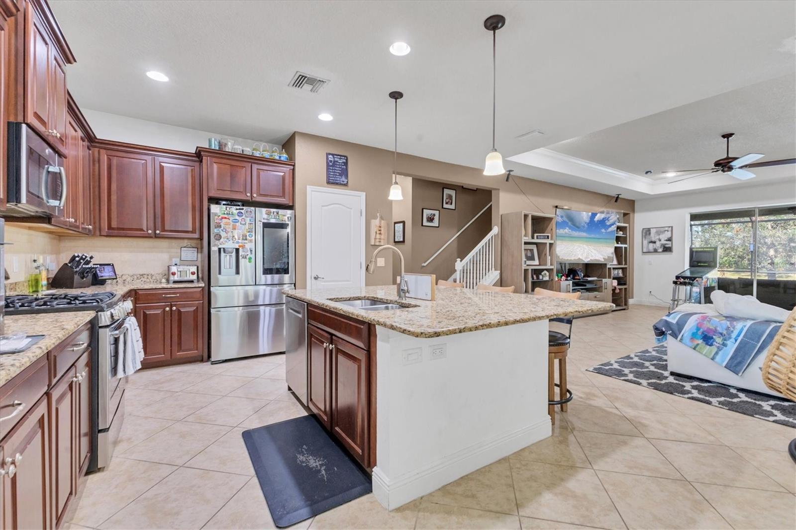 PRICE IMPROVEMENT!!! This stunning home with 2,999 sq ft of living space features 4 bedrooms plus 2 dens and 4 full baths, with a primary bedroom located on both floors for ultimate convenience. The interior boasts high ceilings and 18x18 ceramic tile throughout the main living areas, creating an elegant and open atmosphere. Enjoy serene lake views from your backyard, complete with a heated pool for year-round relaxation. The great room features tray ceilings and pocket sliders that open to a spacious lanai, perfect for entertaining. The open kitchen is a chef’s dream, with granite countertops, Cherry Spice cabinetry, and a gourmet island. The home also includes a formal dining room, a laundry room with extra storage, and a spacious 3-car garage. Set in a Lakewood Ranch gated community, residents enjoy access to tennis courts, dog parks, a splash park, and plenty of walking trails for outdoor recreation. Minutes to UTC, hospital, interstate and plenty of shopping and restaurants.