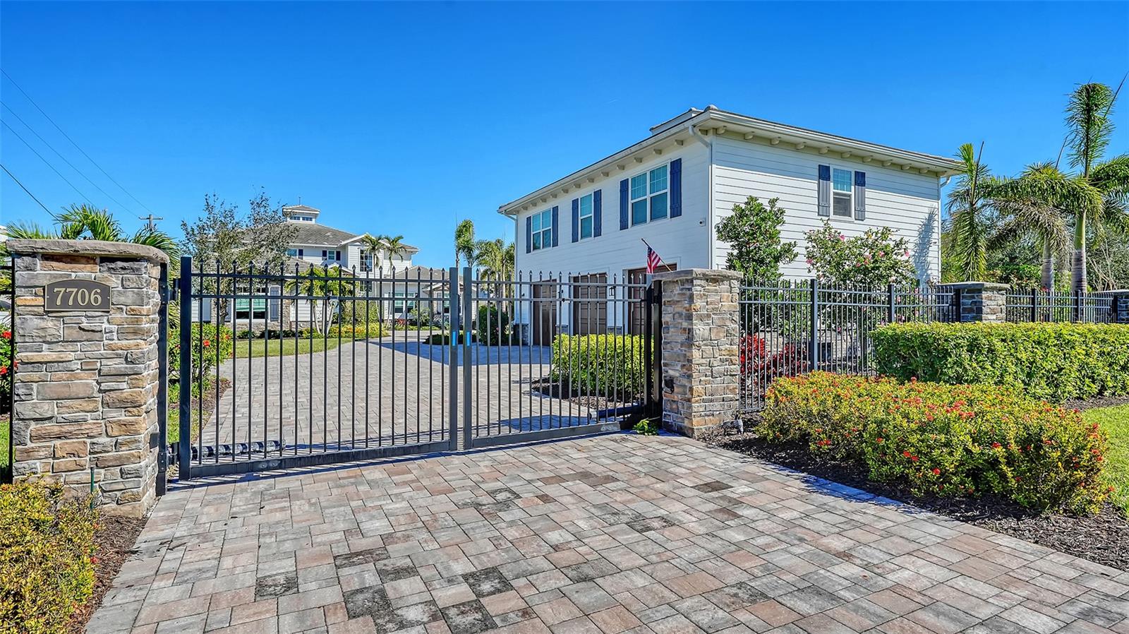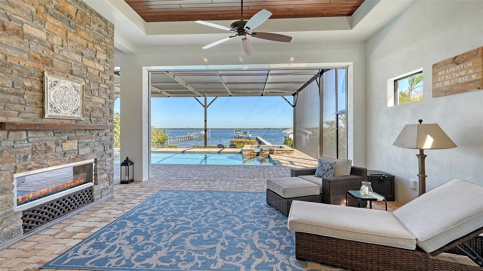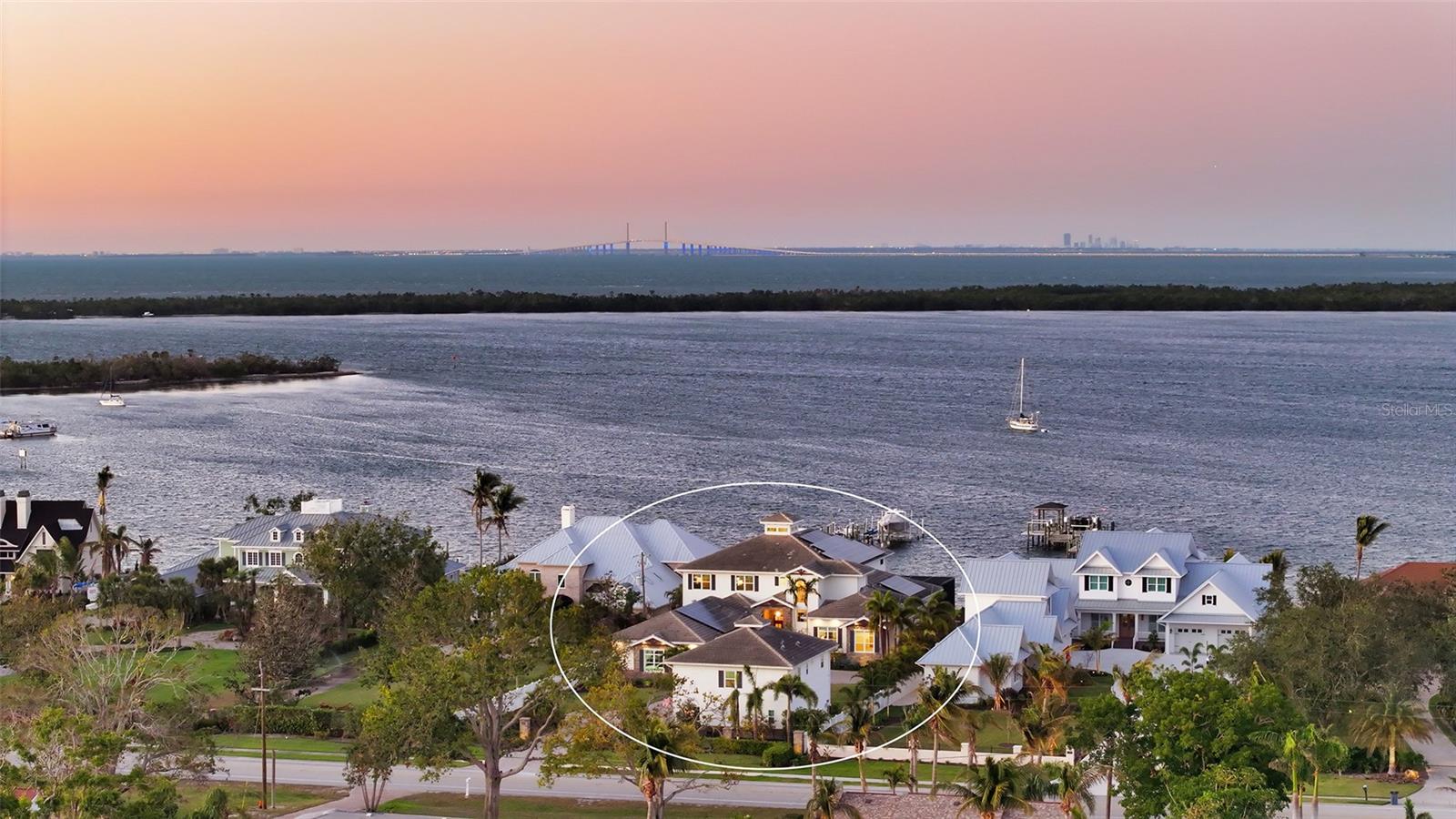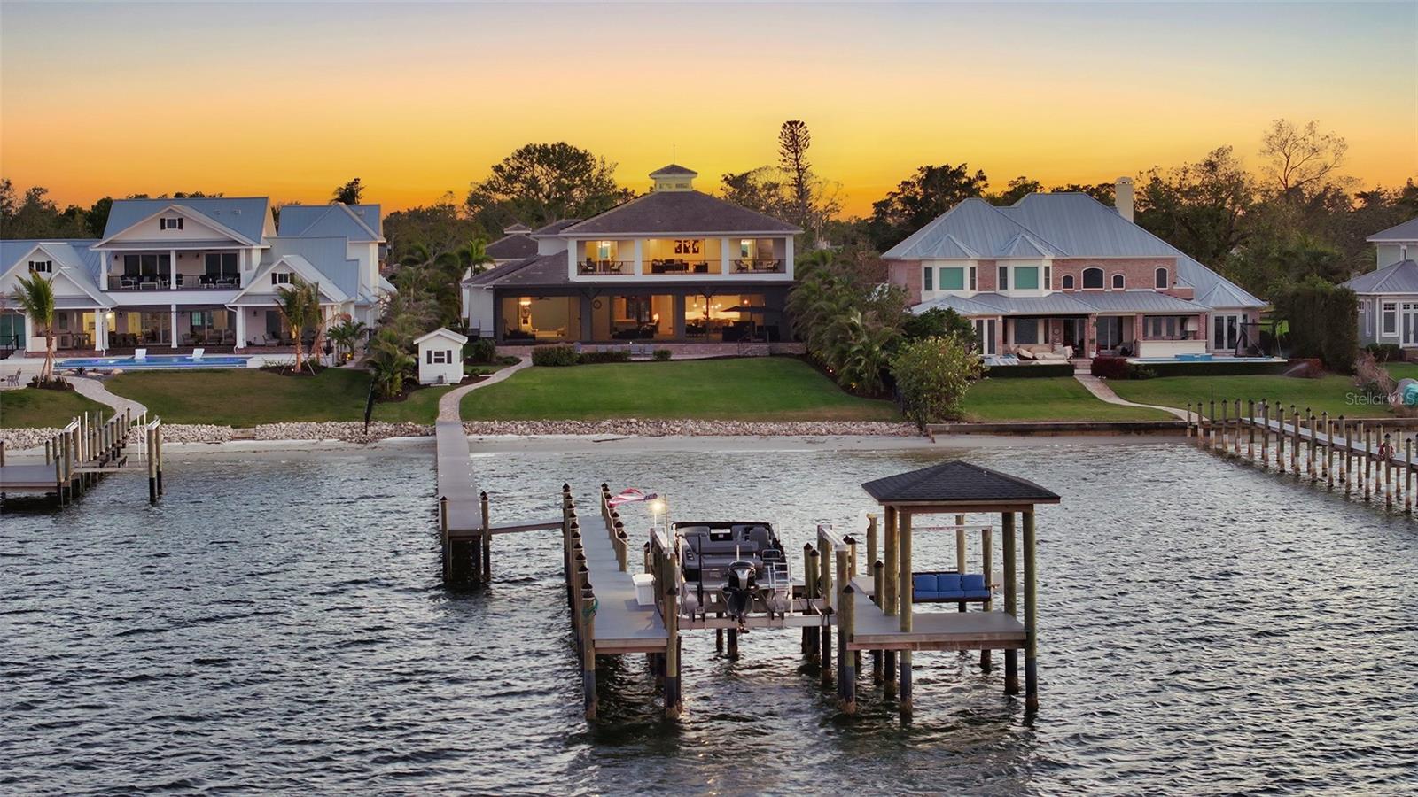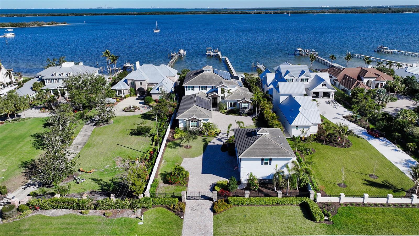 Embodying the pinnacle of storm-resilient luxury, this exceptional waterfront estate is thoughtfully fortified with premier safety features. Solar panels paired with backup batteries seamlessly operate the first floor of the main home and fully power the guest house during outages. A 500-gallon buried propane tank, concrete roof tiles, hurricane impact glass throughout, and a full suite of electronic and metal hurricane shutters — including five remote-controlled systems enclosing the main floor covered lanai and second-floor remote screens — offer peace of mind through every season. A true boater’s paradise on the Manatee River, this modern custom estate offers direct access to the Gulf of Mexico, with idyllic destinations like Anna Maria Island, Longboat Key, Sarasota, and St. Petersburg just moments away by water. Built in 2020 and spanning 6,621 square feet, the residence combines architectural elegance with cutting-edge smart home technology for effortless living. Situated on elevated, flood-free ground, the home has weathered all storms unscathed, according to the owner. The main residence and 1,344-square-foot guest home together feature a seven-car garage, ideal for collectors or additional storage. Inside, five bedrooms, five full and two half baths are thoughtfully designed with premium finishes, including engineered hardwood flooring and hurricane-rated materials. The primary suite is a serene retreat, boasting a luxurious steam shower with 13 spray heads, soaking tub, towel warmers, and travertine tile. A gourmet kitchen is equipped with Wolf, Sub-Zero, and Bosch appliances, dual islands, and an expansive walk-in pantry with a built-in Sub-Zero freezer. Designed for grand entertaining, the living room features coffered ceilings, a gas fireplace, and custom cabinetry, while the expansive lanai redefines outdoor living. Nearly 3,800 square feet of screened space includes a bespoke outdoor kitchen, two-sided fireplace, saltwater pool with spa and sun shelf, and a poolside half bath—all secured by remote hurricane shutters. The guest home offers two bedrooms, a luxurious kitchen, impact glass, and a private balcony. Additional features include an electronic gated entry, lightning and surge protection, cement roof shingles, and a solar-powered system with four backup batteries. Boating enthusiasts will appreciate the five-foot TREX dock with a 16,000-pound boat lift, a 4,500-pound personal craft lift, and a powered utility shed. A private weather station provides real-time monitoring. Located within walking distance of De Soto National Memorial Park, this one-of-a-kind estate offers an unmatched lifestyle of safety, sophistication, and waterfront serenity.