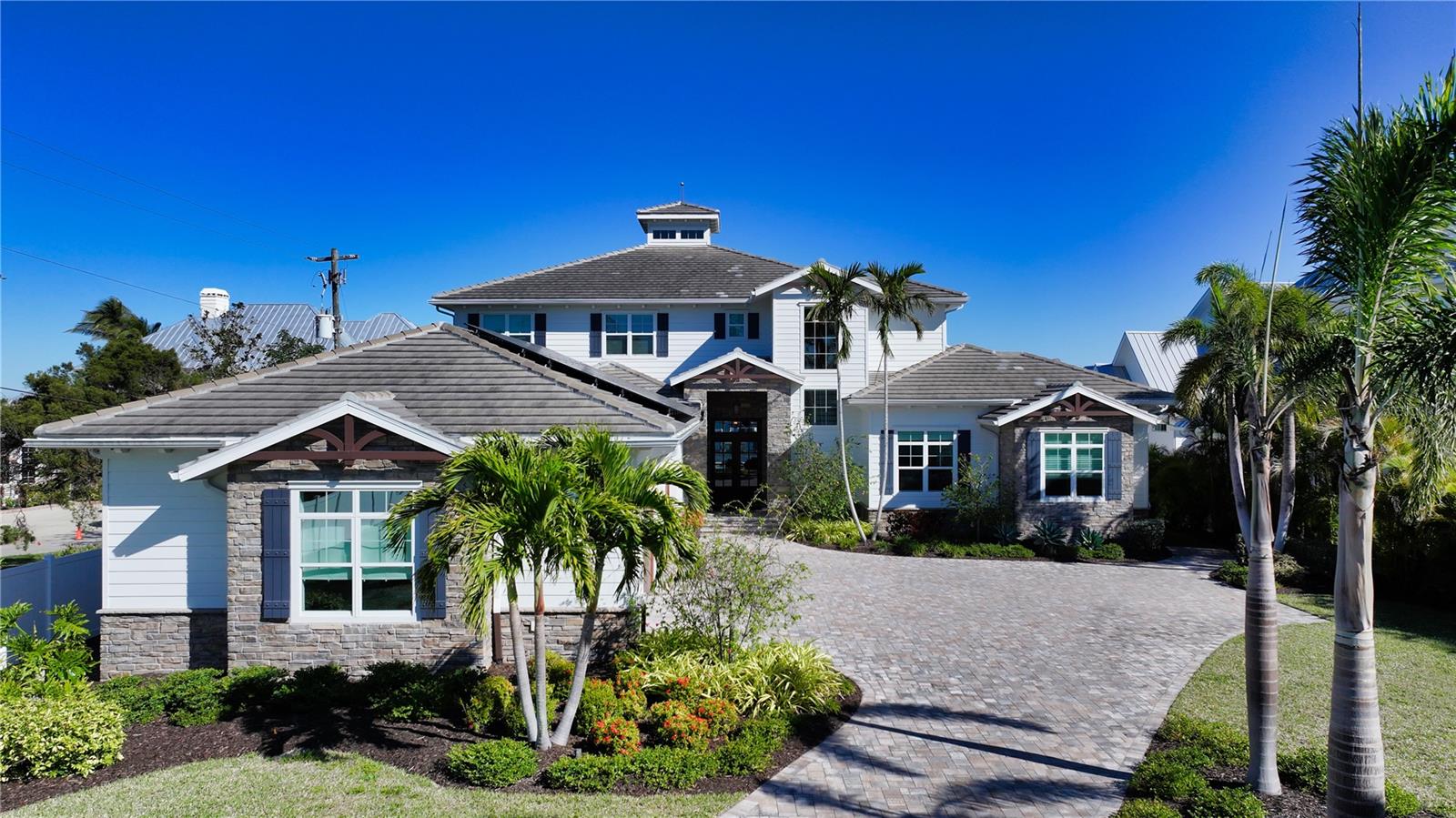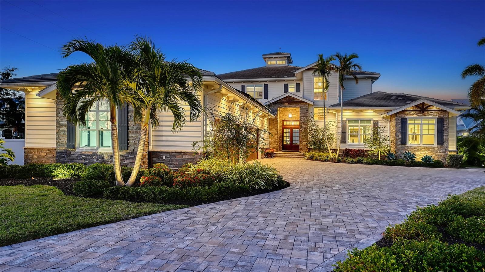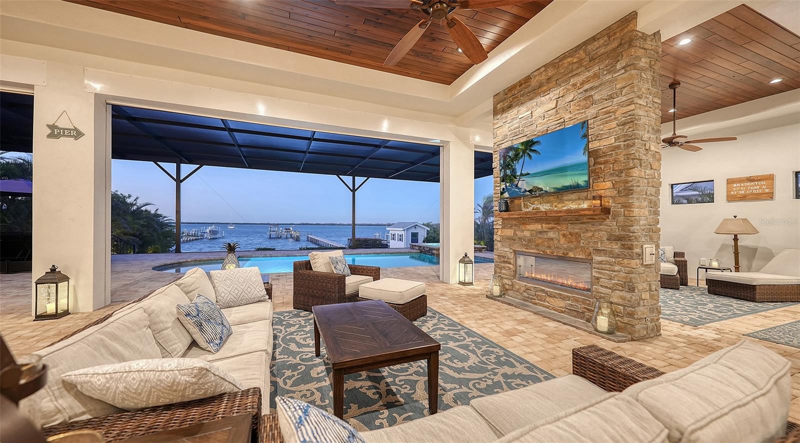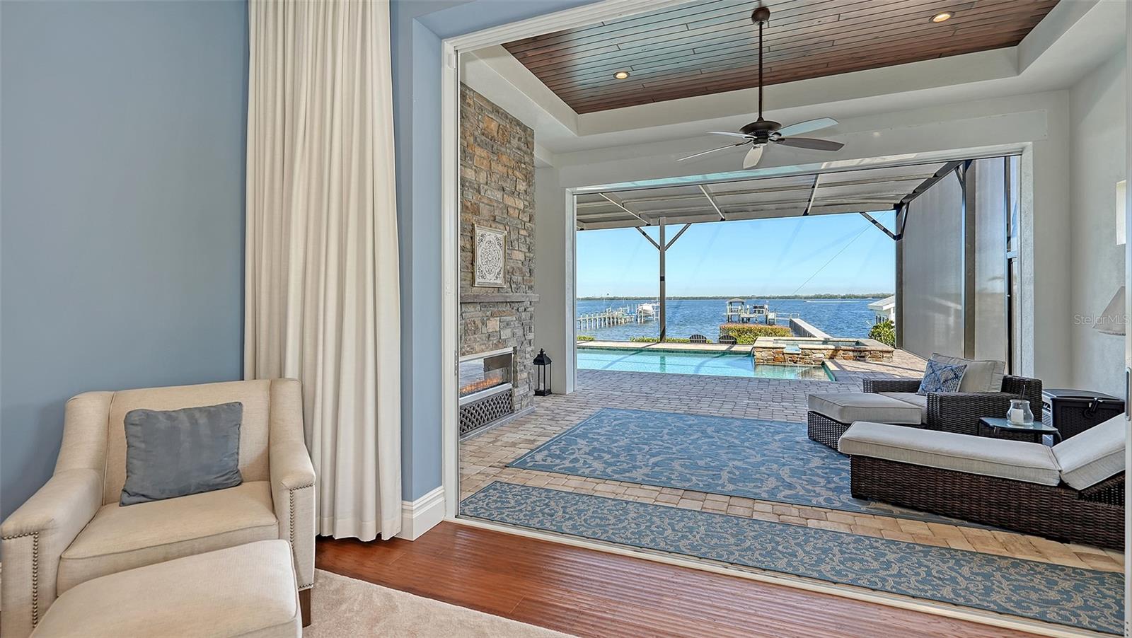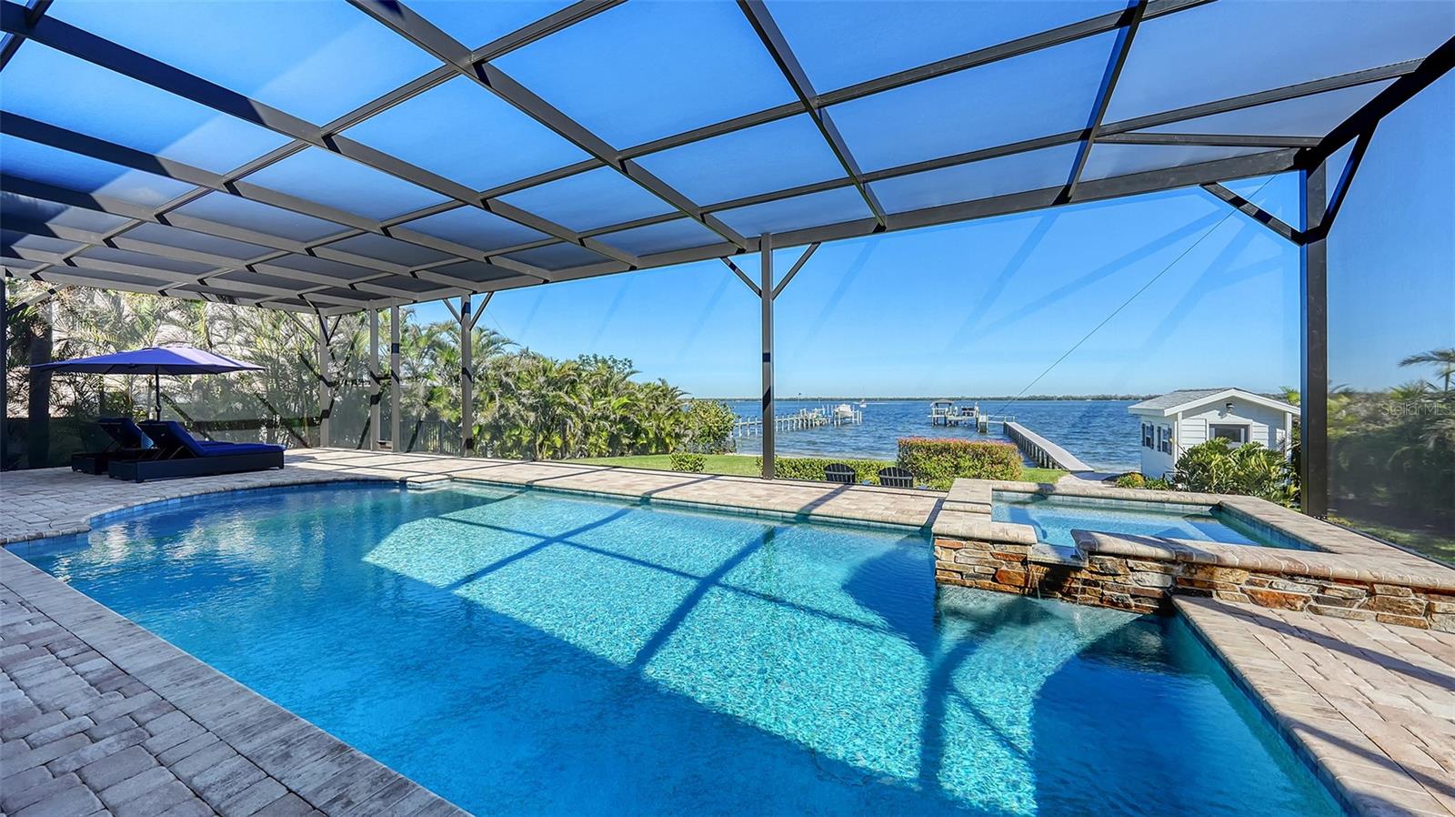 Embodying the pinnacle of storm-resilient luxury, this exceptional waterfront estate is thoughtfully fortified with premier safety features. Solar panels paired with backup batteries seamlessly operate the first floor of the main home and fully power the guest house during outages. A 500-gallon buried propane tank, concrete roof tiles, hurricane impact glass throughout, and a full suite of electronic and metal hurricane shutters — including five remote-controlled systems enclosing the main floor covered lanai and second-floor remote screens — offer peace of mind through every season. A true boater’s paradise on the Manatee River, this modern custom estate offers direct access to the Gulf of Mexico, with idyllic destinations like Anna Maria Island, Longboat Key, Sarasota, and St. Petersburg just moments away by water. Built in 2020 and spanning 6,621 square feet, the residence combines architectural elegance with cutting-edge smart home technology for effortless living. Situated on elevated, flood-free ground, the home has weathered all storms unscathed, according to the owner. The main residence and 1,344-square-foot guest home together feature a seven-car garage, ideal for collectors or additional storage. Inside, five bedrooms, five full and two half baths are thoughtfully designed with premium finishes, including engineered hardwood flooring and hurricane-rated materials. The primary suite is a serene retreat, boasting a luxurious steam shower with 13 spray heads, soaking tub, towel warmers, and travertine tile. A gourmet kitchen is equipped with Wolf, Sub-Zero, and Bosch appliances, dual islands, and an expansive walk-in pantry with a built-in Sub-Zero freezer. Designed for grand entertaining, the living room features coffered ceilings, a gas fireplace, and custom cabinetry, while the expansive lanai redefines outdoor living. Nearly 3,800 square feet of screened space includes a bespoke outdoor kitchen, two-sided fireplace, saltwater pool with spa and sun shelf, and a poolside half bath—all secured by remote hurricane shutters. The guest home offers two bedrooms, a luxurious kitchen, impact glass, and a private balcony. Additional features include an electronic gated entry, lightning and surge protection, cement roof shingles, and a solar-powered system with four backup batteries. Boating enthusiasts will appreciate the five-foot TREX dock with a 16,000-pound boat lift, a 4,500-pound personal craft lift, and a powered utility shed. A private weather station provides real-time monitoring. Located within walking distance of De Soto National Memorial Park, this one-of-a-kind estate offers an unmatched lifestyle of safety, sophistication, and waterfront serenity.