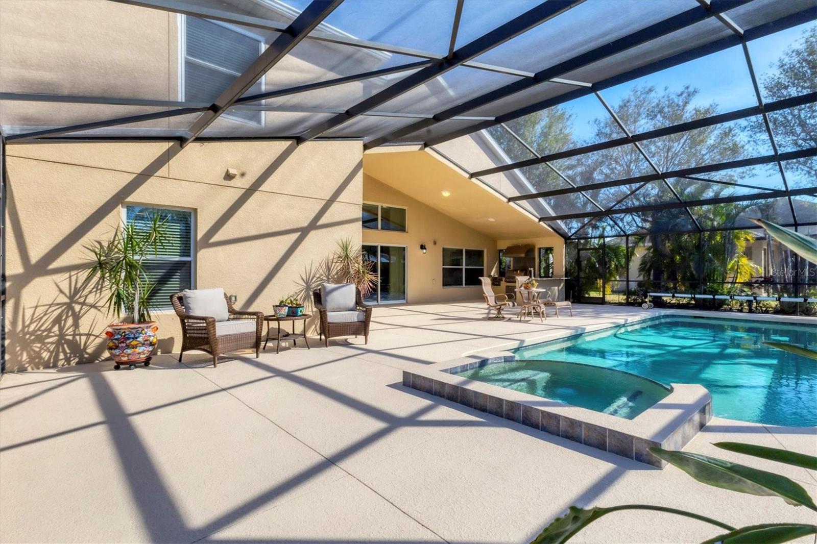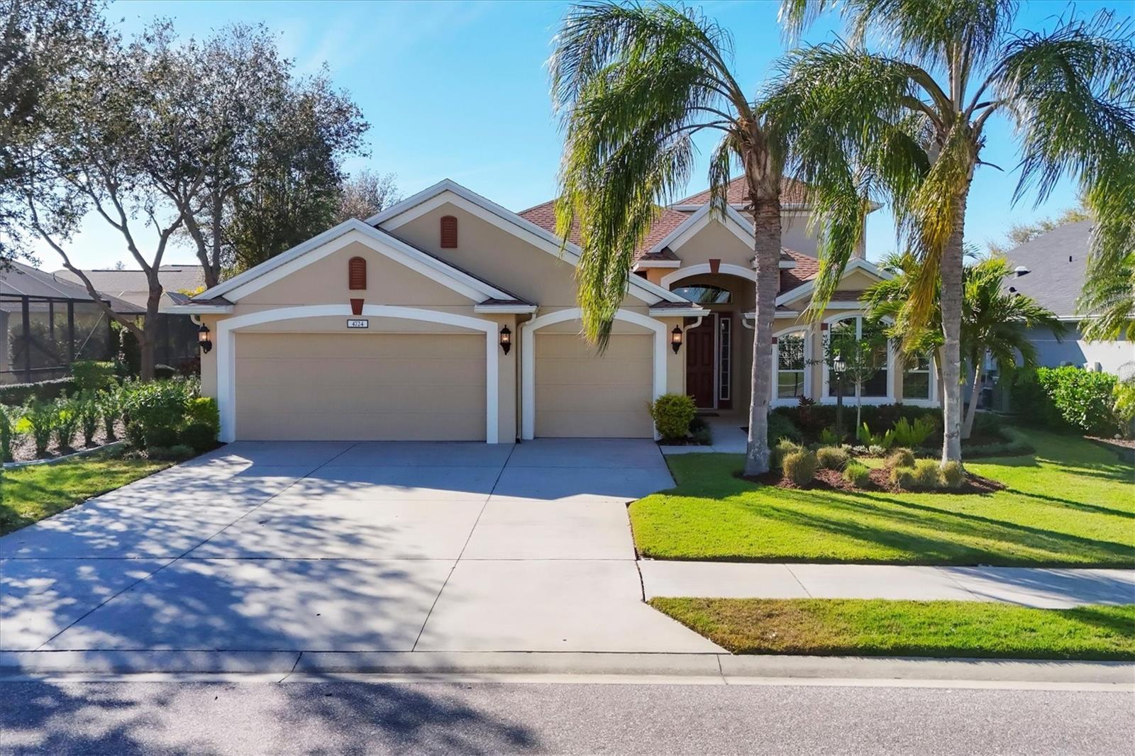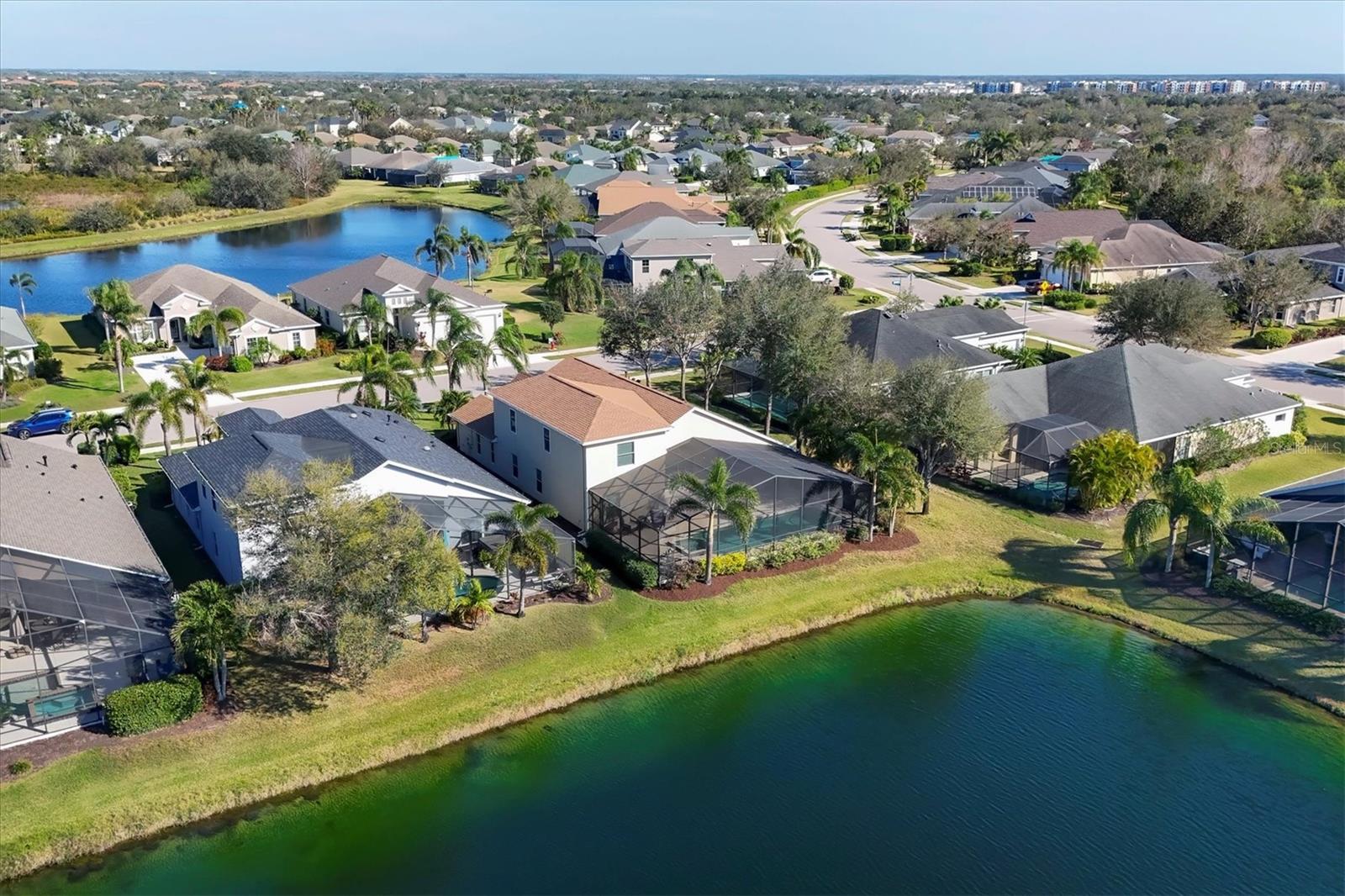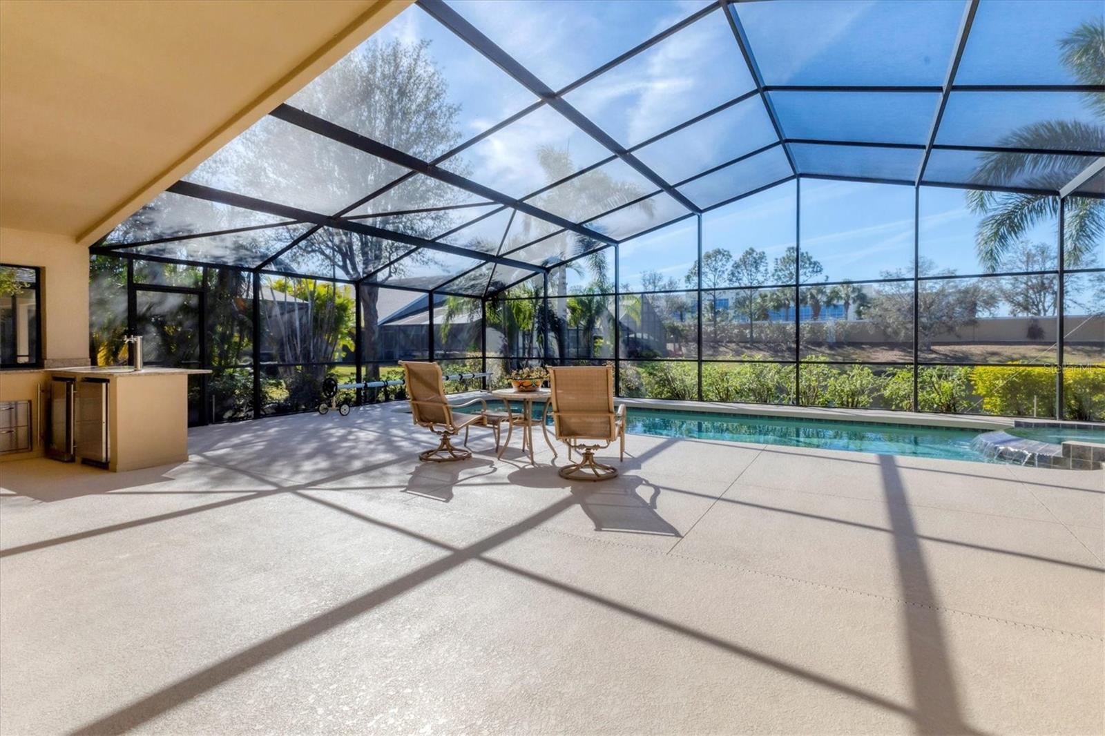 Welcome to this exceptional Cardel Homes Kingfisher 3 model offering four bedrooms and a den, three baths in the desirable Central Park neighborhood of Lakewood Ranch. The open concept kitchen and great room create a seamless flow for everyday living, featuring high windows, large island, breakfast bar, walk-in-pantry and built-in-desk. A separate dining room and living room provide additional space for more formal gatherings, while the eat-in area off the kitchen offers a cozy spot for casual meals. The private primary suite is a sanctuary, complete with dual sinks, soaking tub, large walk-in shower and an oversized closet. Two additional guest bedrooms are conveniently downstairs and share a full bath with direct access to the pool area. The spacious layout includes a large upstairs bonus room with a private bedroom and full bath, making it ideal for guests or a quiet retreat. Ready for a swim - The perfect saltwater gas heated 30 ft length pool provides for daily swimming laps ending with a relaxing 6-person spa! Enjoy this outdoor space with ceiling speakers connected to the in-door great room surround sound system. At the end of day, grill in the outdoor kitchen and tap the kegerator or retrieve a soda or sparkling water from the beverage cooler. This home is packed with premium features and recent upgrades, including Gunstock Oak laminate and tasteful tile flooring throughout, hurricane impact windows on the second floor and shutters on the ground level, a new roof in 2023, a new air-conditioning unit and heat pump in 2024, and a rescreened lanai in 2024. Additional highlights include an EcoWater Systems purification system, a surround sound system in the great room and lanai, and a freshly painted interior and garage floor. In one of Lakewood Ranch's sought-after communities, this home is just minutes from A-rated schools, shopping and dining. Residents of Central Park enjoy an abundance of amenities, including parks, nature trails, a sports complex, dog parks, a playground, a splash pad and vibrant monthly social events.