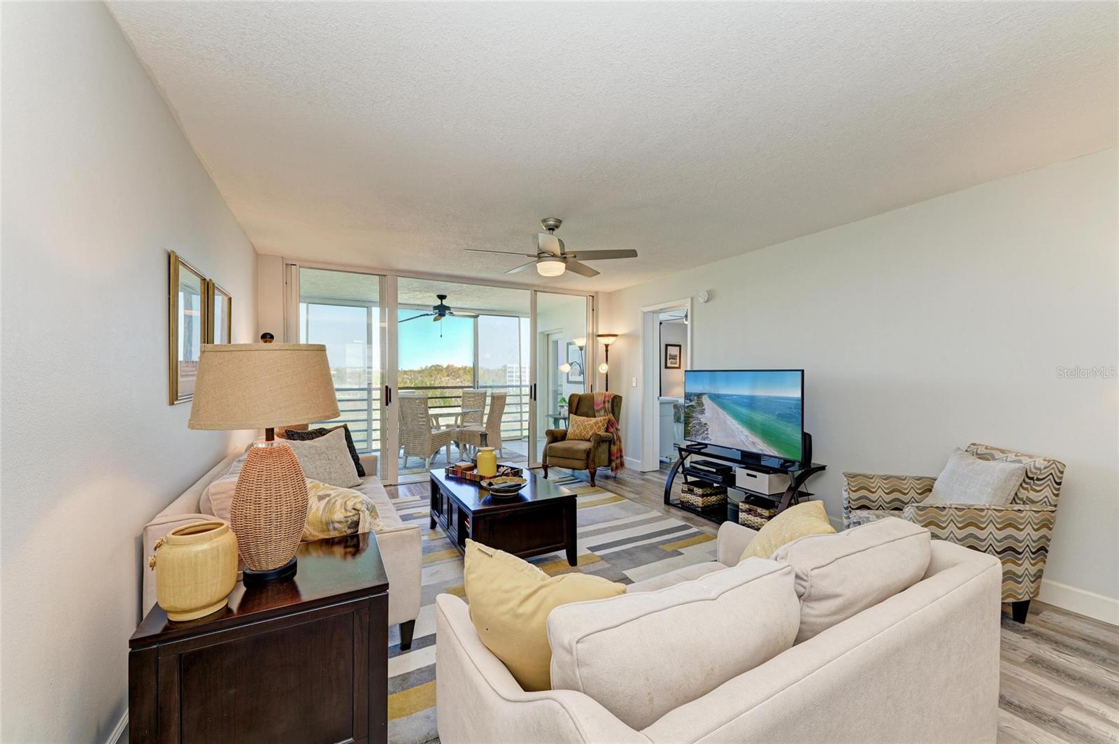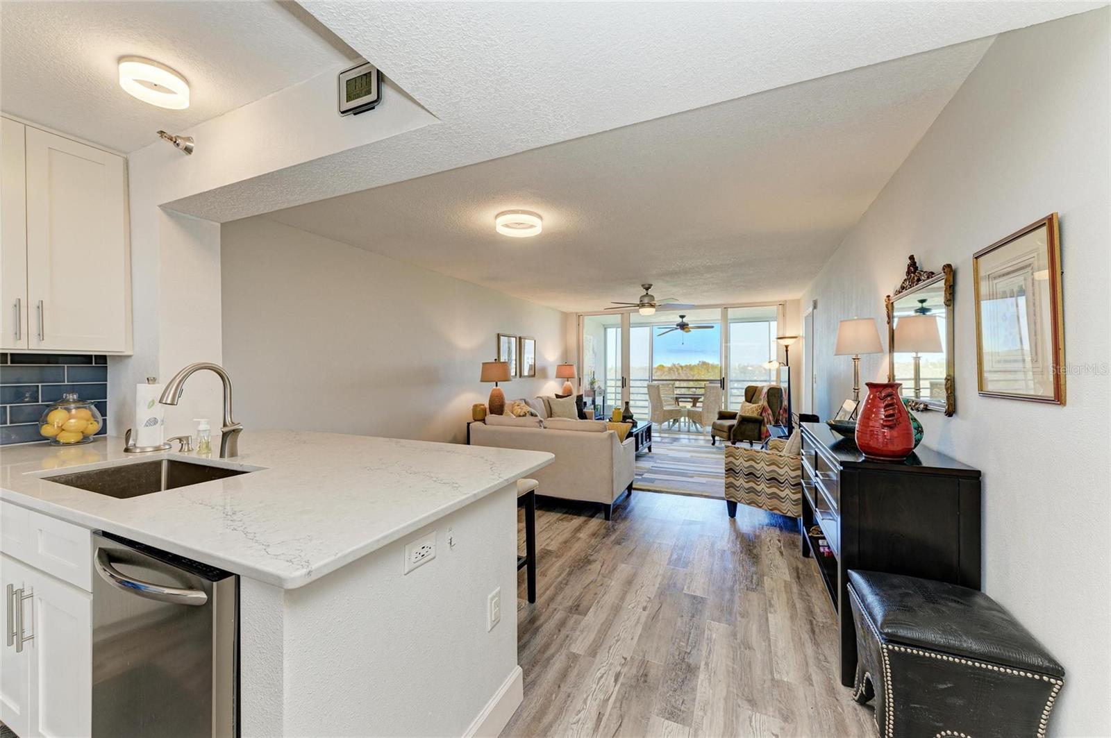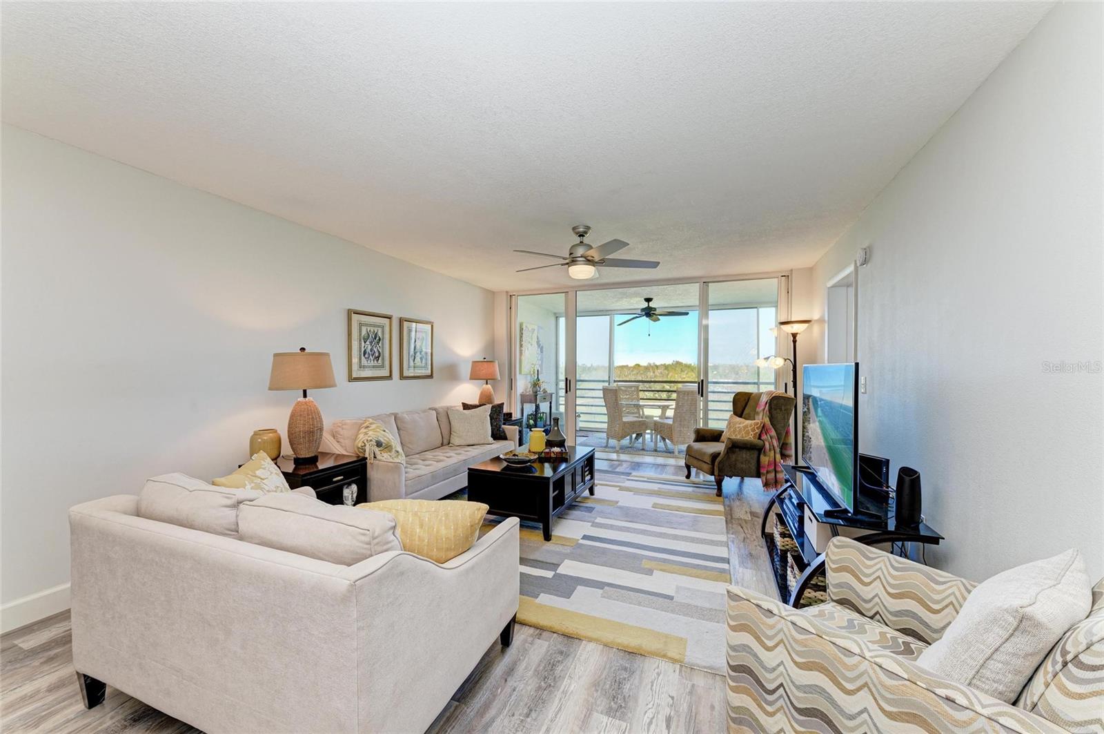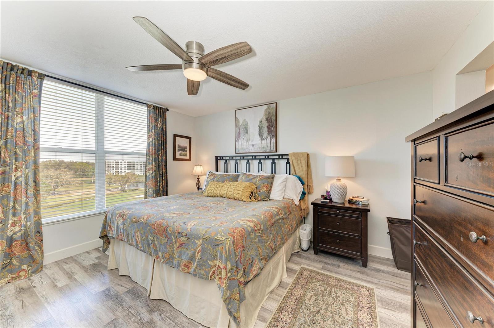 GOLF ON A BUDGET...You'll never miss a Tee Time again when you LIVE ON THE COURSE!!! IF you prefer the BEACH this one has that going for it too! Located just minutes (7 miles to be exact) from Anna Maria Island where you can stroll, take some sun or swim in the Gulf of America. At this price you may be thinking, "what's the catch?"...There isn't one with this Amazing 4th Floor unit featuring: A KITCHEN to die for...with 42" Custom Coastal Cupboard Cabinets (soft close of course), Arabescato Ivory Quartz countertops, Blue Slate glass backsplash, Farm Sink for the Big pots after a spaghetti dinner, a Pantry with easy access pull out drawers, Stainless Steel Appliances, an eat in area perfect for two to share morning coffee and a generous Breakfast Bar ideal for lunch on the go as you head out for another perfect day in Paradise. The OPEN FLOOR PLAN is perfect for entertaining new found friends or visiting relatives from up north, split bedrooms offer privacy for guests and a quiet separate space ideal as an in house office. The Primary bedroom easily fits a King size bed, has an oversized walk in closet, offers a private updated bath with Luxury Vanity, comfort height water closet and has access to the glass enclosed Florida room great for watching golfers during the day or a late night libation with that special person in your life. All new Antique Grey LVT flooring through out, new 6" base boards, updated second bath, in unit laundry, sprinkler system, Milestone Inspection completed, all new fans and fixtures the list just goes on...OH and did I mention the UNDER BUILDING COVERED PARKING with elevator access to keep you safe and dry when you're coming home from shopping or the grocery store? Community amenities include: HEATED POOL with SPA, nicely appointed clubhouse with Fitness Center and Billiard table, 18 Hole pay to play Executive Course. Bike riding distance to GT Bray a county park that offers an Olympic Pool and Water Play area for Kids or Grand Kids, Pickle ball and tennis courts, softball fields and basketball gym. Close to IMG, PET FREINDLY and All Ages Welcome! It may be hard to believe but you haven't missed your opportunity to own a GOLF COURSE GET AWAY in the Sunny Southland...so don't wait, call today and start enjoying your permanent vacation!