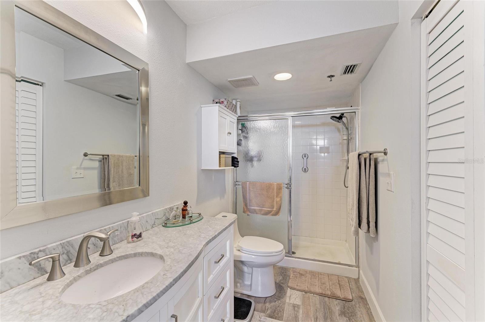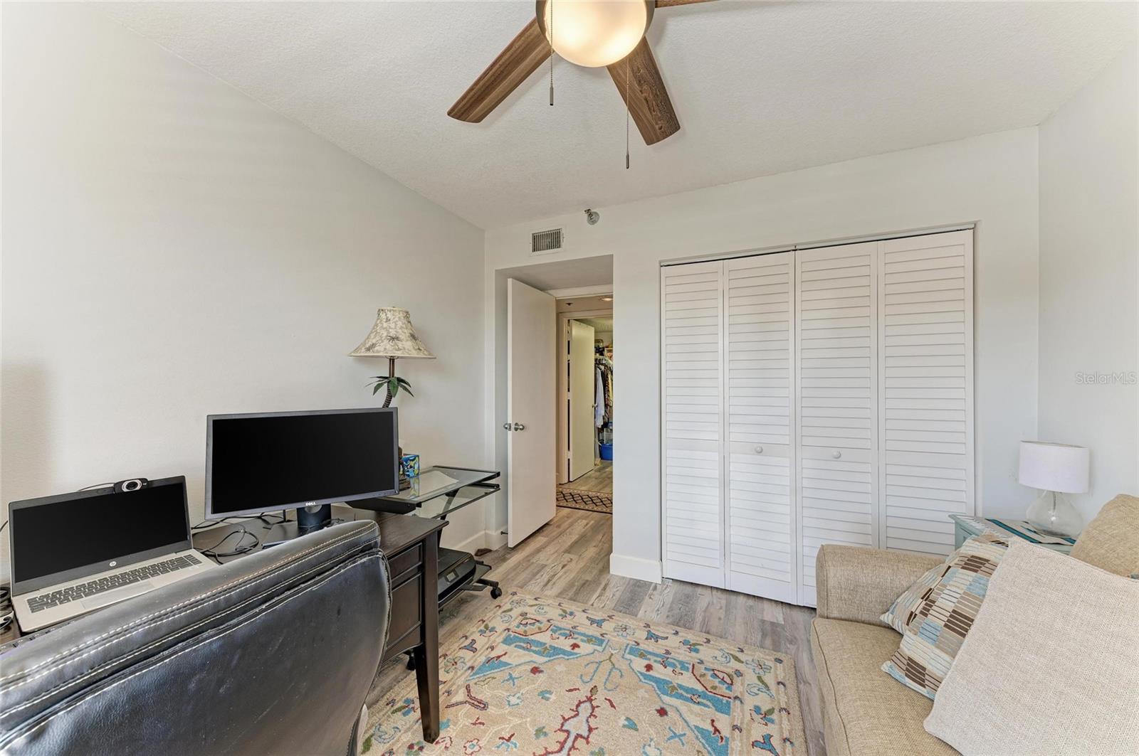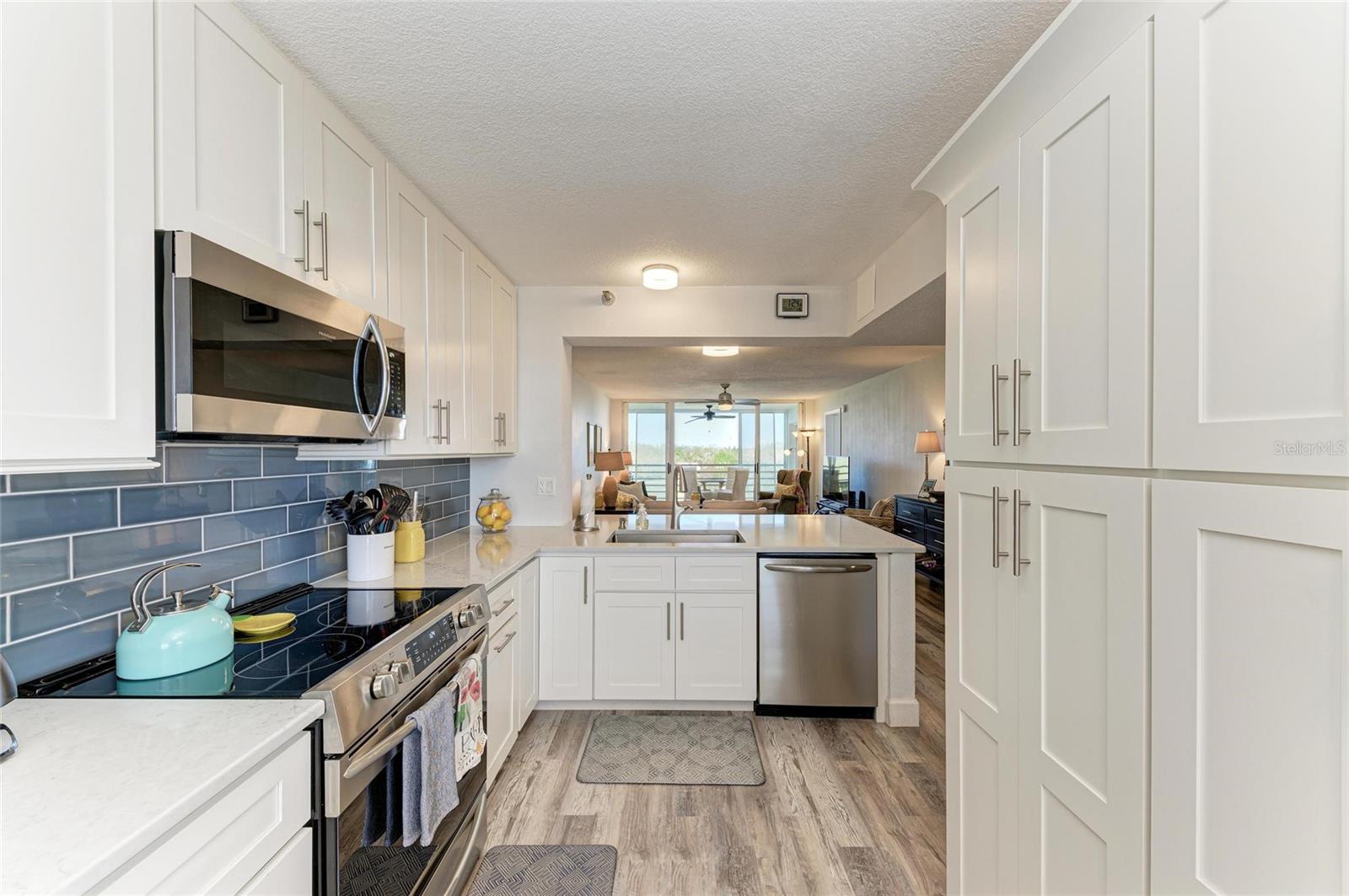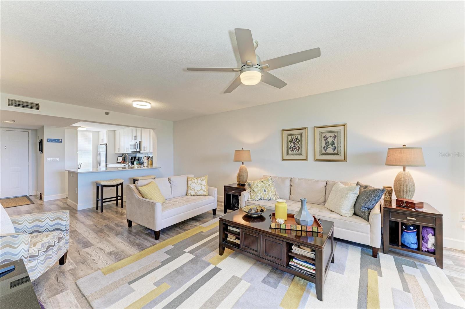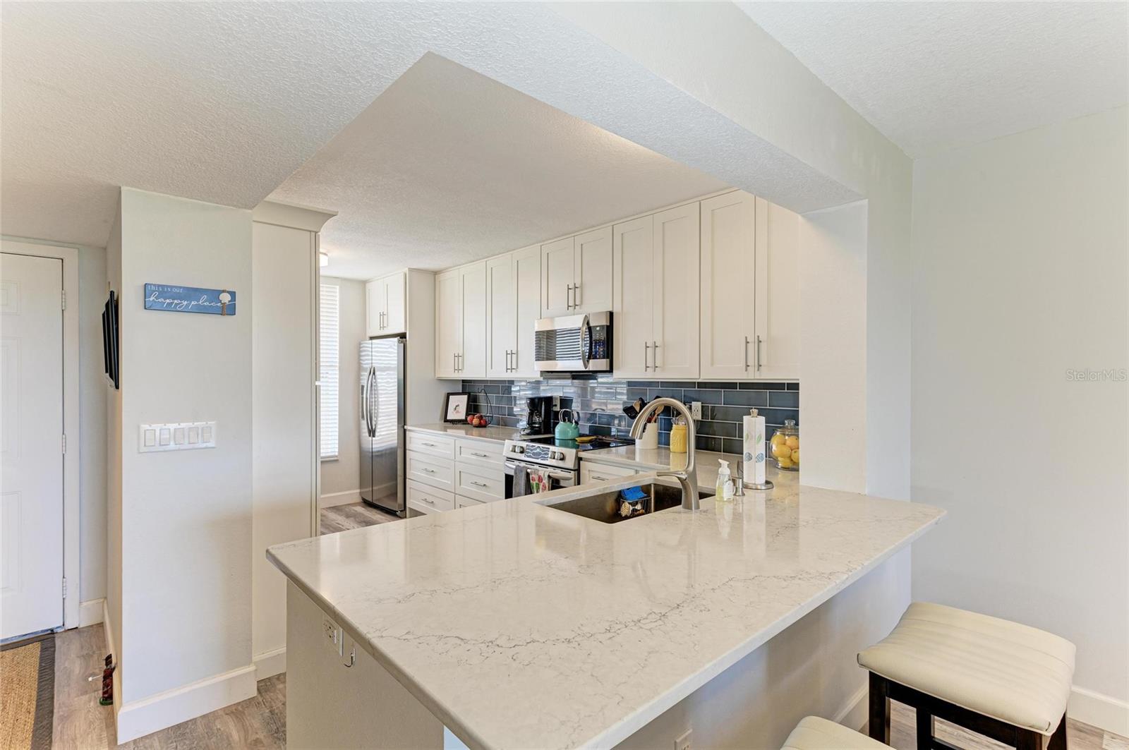 GOLF ON A BUDGET...You'll never miss a Tee Time again when you LIVE ON THE COURSE!!! IF you prefer the BEACH this one has that going for it too! Located just minutes (7 miles to be exact) from Anna Maria Island where you can stroll, take some sun or swim in the Gulf of America. At this price you may be thinking, "what's the catch?"...There isn't one with this Amazing 4th Floor unit featuring: A KITCHEN to die for...with 42" Custom Coastal Cupboard Cabinets (soft close of course), Arabescato Ivory Quartz countertops, Blue Slate glass backsplash, Farm Sink for the Big pots after a spaghetti dinner, a Pantry with easy access pull out drawers, Stainless Steel Appliances, an eat in area perfect for two to share morning coffee and a generous Breakfast Bar ideal for lunch on the go as you head out for another perfect day in Paradise. The OPEN FLOOR PLAN is perfect for entertaining new found friends or visiting relatives from up north, split bedrooms offer privacy for guests and a quiet separate space ideal as an in house office. The Primary bedroom easily fits a King size bed, has an oversized walk in closet, offers a private updated bath with Luxury Vanity, comfort height water closet and has access to the glass enclosed Florida room great for watching golfers during the day or a late night libation with that special person in your life. All new Antique Grey LVT flooring through out, new 6" base boards, updated second bath, in unit laundry, sprinkler system, Milestone Inspection completed, all new fans and fixtures the list just goes on...OH and did I mention the UNDER BUILDING COVERED PARKING with elevator access to keep you safe and dry when you're coming home from shopping or the grocery store? Community amenities include: HEATED POOL with SPA, nicely appointed clubhouse with Fitness Center and Billiard table, 18 Hole pay to play Executive Course. Bike riding distance to GT Bray a county park that offers an Olympic Pool and Water Play area for Kids or Grand Kids, Pickle ball and tennis courts, softball fields and basketball gym. Close to IMG, PET FREINDLY and All Ages Welcome! It may be hard to believe but you haven't missed your opportunity to own a GOLF COURSE GET AWAY in the Sunny Southland...so don't wait, call today and start enjoying your permanent vacation!