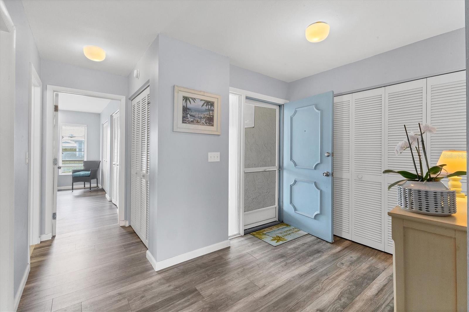 Charming! Tucked in the heart of Village Green, one of Bradenton's most sought-after 55+ communities, this spacious 2-bedroom, 2-bathroom end unit is sure to steal your heart. As you stroll through this inviting condo, you'll appreciate the open layout, beginning with the living and dining room combination that flows seamlessly into the expansive Florida room—an extension of the home with sliding glass pocket doors that allow for effortless indoor-outdoor living. Open the windows and let the refreshing breeze in as you gaze out onto your large backyard, just steps from the heated community pool. Whether enjoying a quiet morning or relaxing in the evening, the peaceful surroundings make for the perfect backdrop. The separate dinette area is ideal for quaint dinners or sipping coffee while taking in the view through the sliding glass doors. The kitchen and bathrooms have been beautifully renovated with modern finishes, while still retaining the home’s original charm. Low-maintenance flooring throughout makes for easy upkeep. The quiet street ends in a cul-de-sac, ensuring no busy cut-through traffic and creating a serene environment. With ample storage space, this condo is move-in ready—simply pack up your house and make Village Green your new home. Located just a short distance from the stunning beaches of Anna Maria Island, this property offers the perfect balance of peaceful retreat and convenience to everything you need.