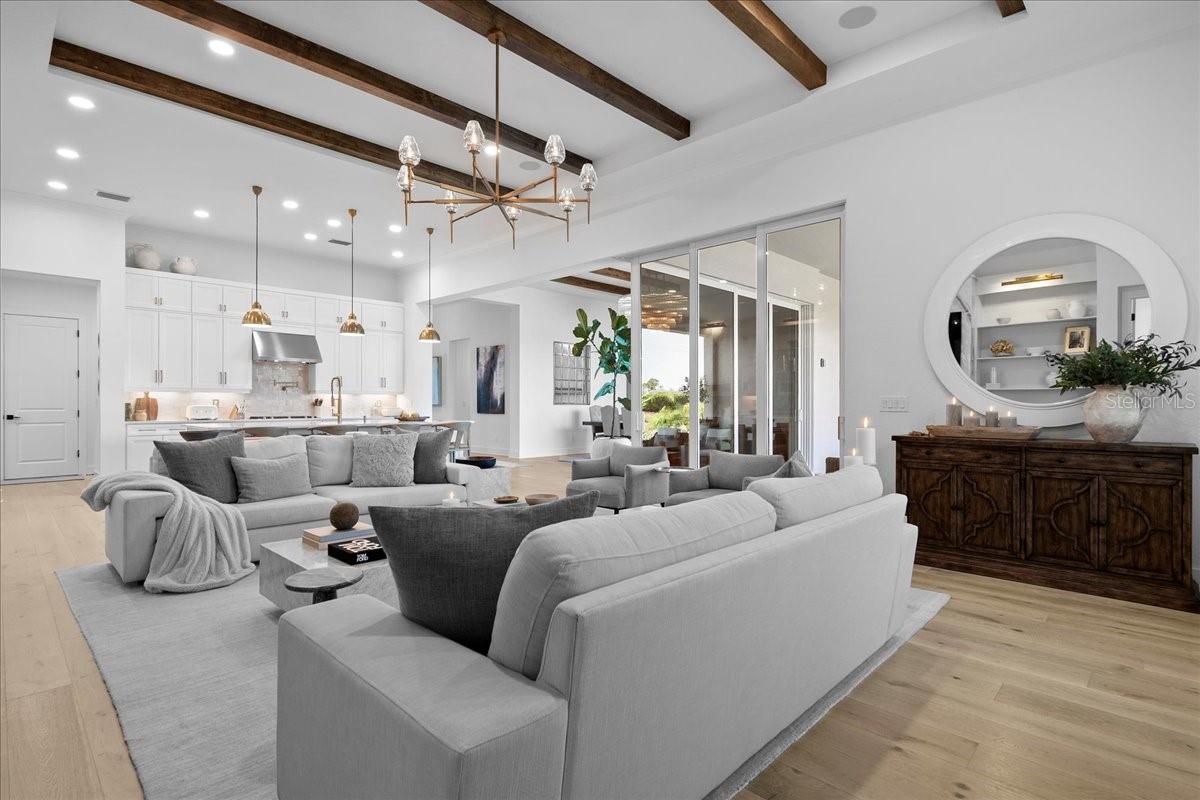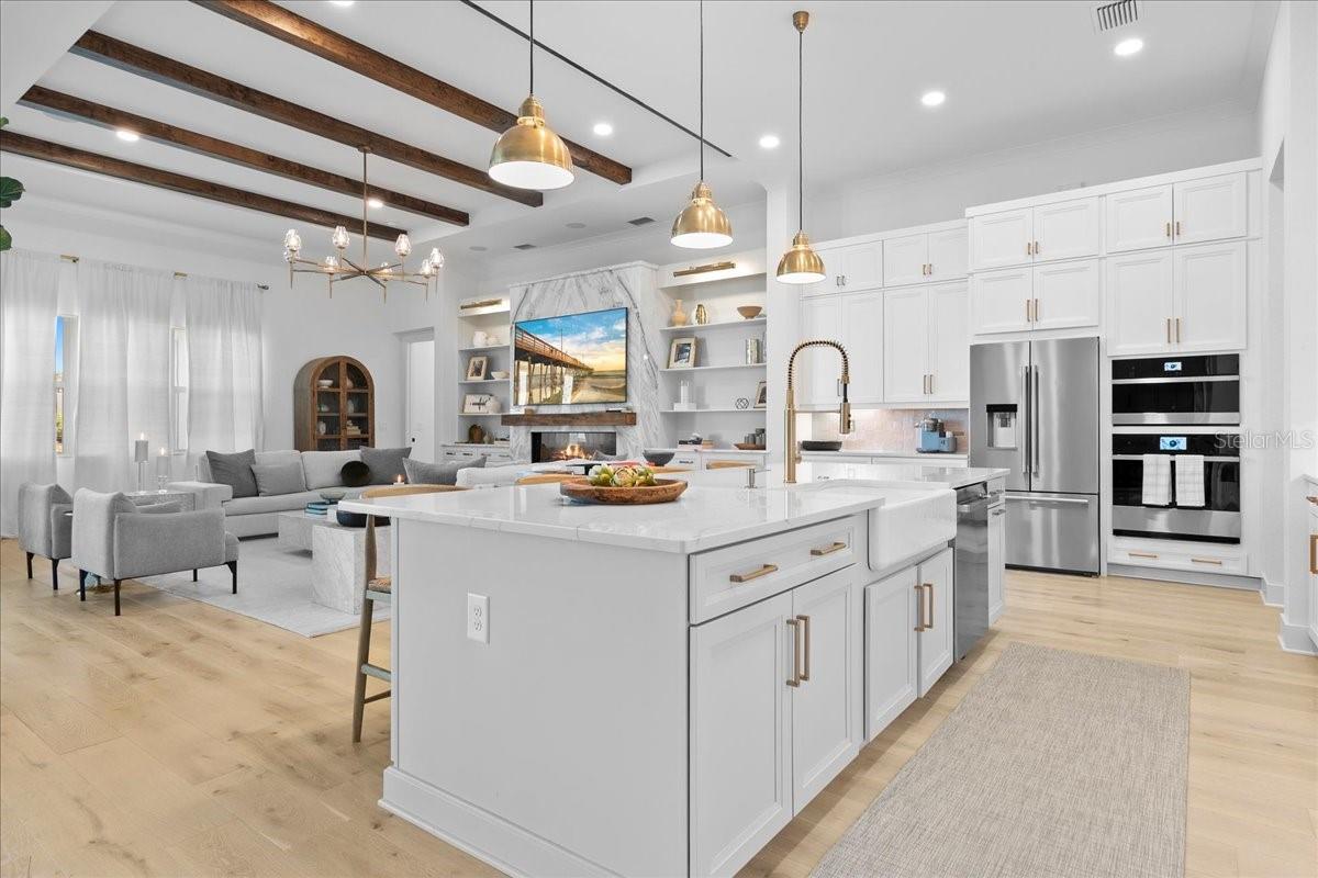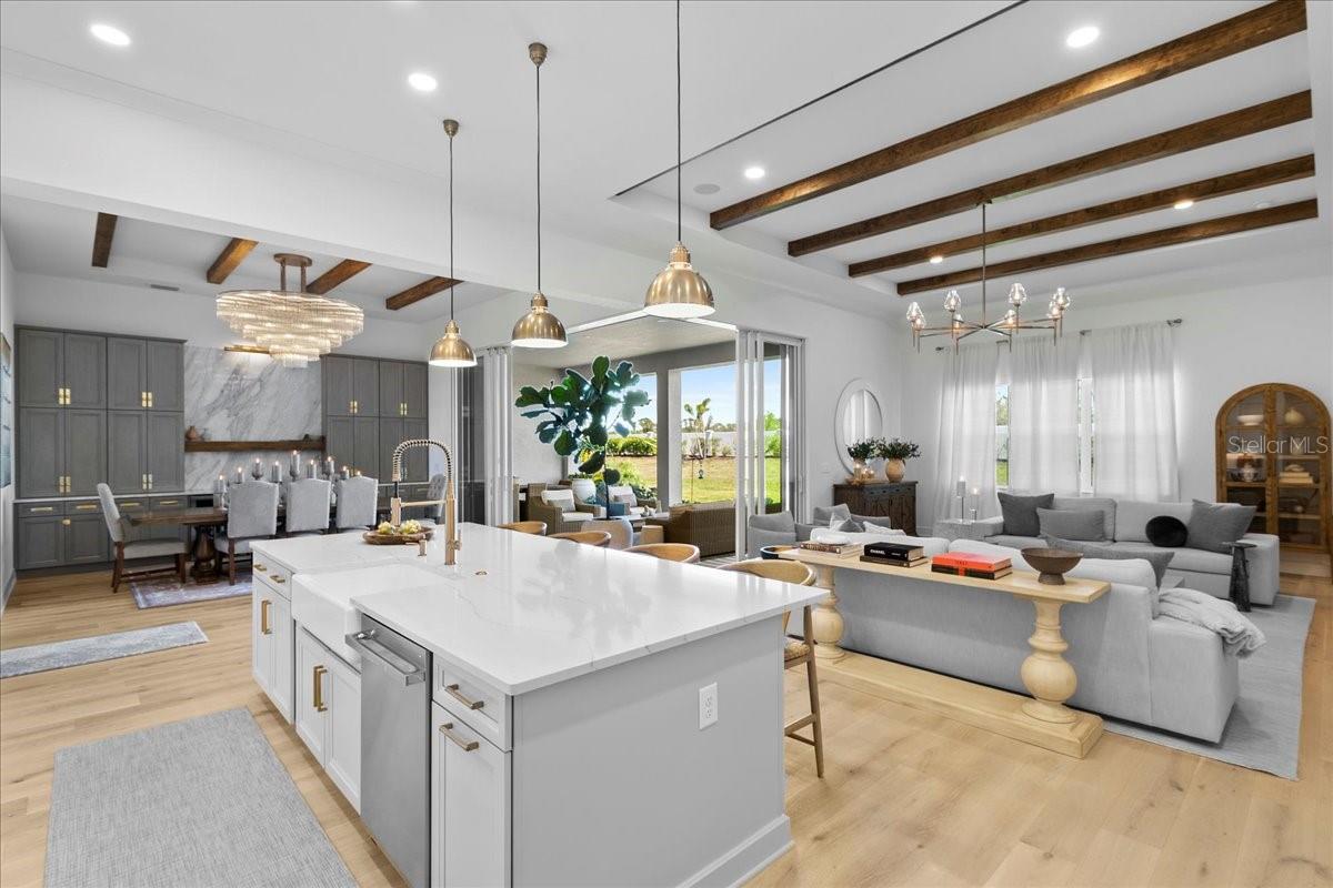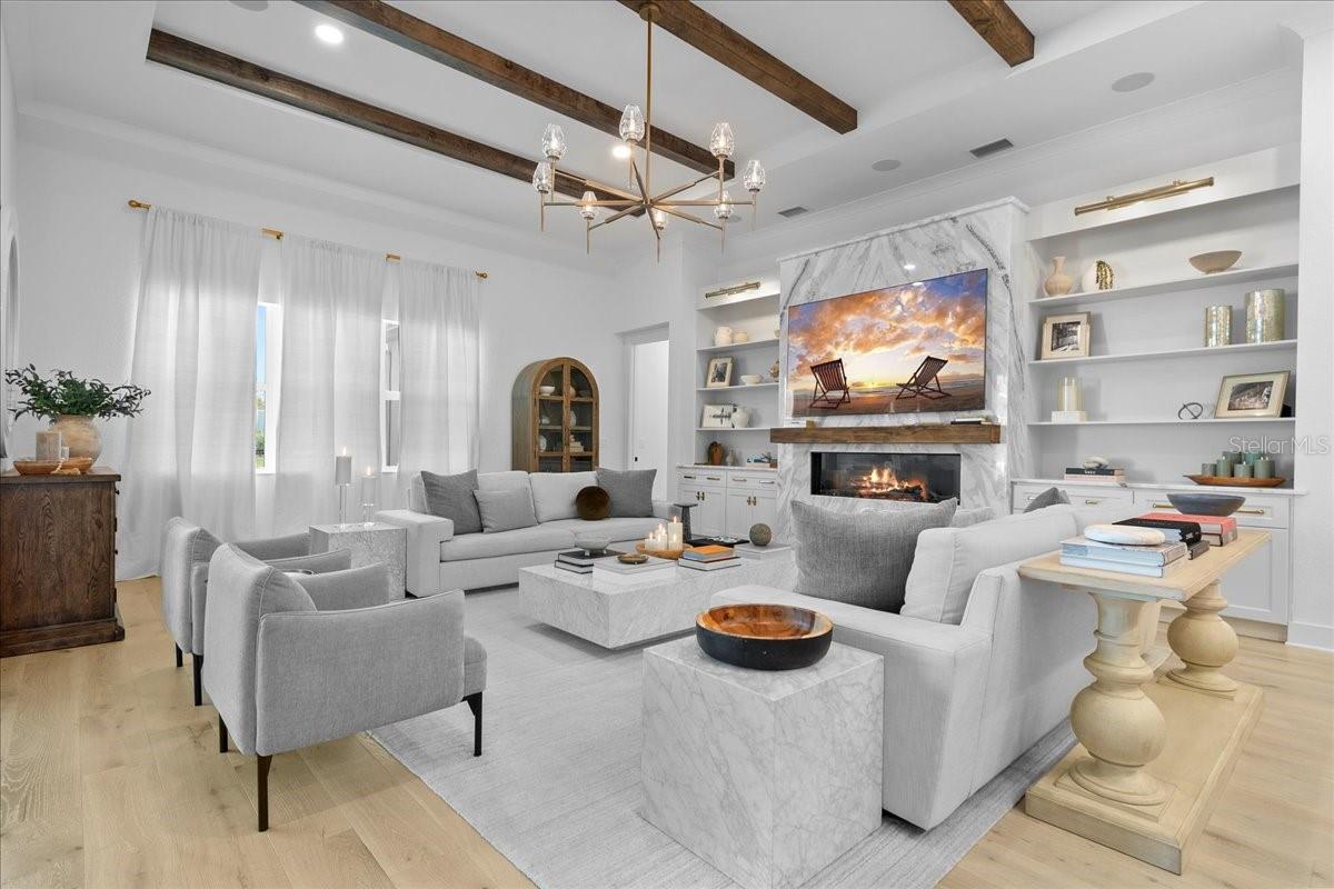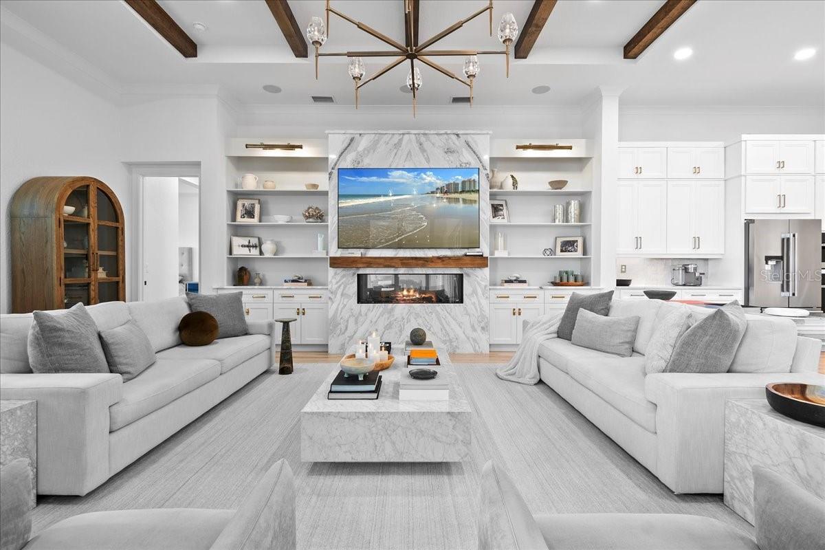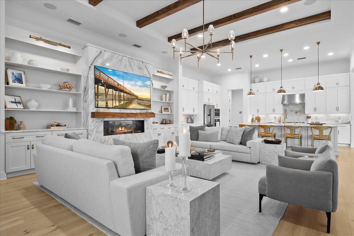 Beautifully crafted home with designer-appointed interior finishes and custom stone and wood built ins. Greet your guests through double doors in a welcoming foyer with 12 ft. tray ceilings and Restoration Hardware chandeliers. Entering the great rooms your eyes are drawn to the custom wood ceiling beams and the light, bright and open layout. Complementing the well-designed open kitchen is an immense center island with breakfast bar as well as tons of counter space and a second row of upper cabinets. An upgraded cooktop and hood further elevate the look. The covered backyard retreat is perfect for activities, complete with 90-degree corner sliders that expand your living space. The home is complete with designer curated finishes and crown molding. Discover what luxury living truly means and schedule a tour of this beautifully designed and upgraded home. More luxury features include: Morocco hand made tile with custom pasta arm, Rare Italian Marble built ins with 3 wine and beverage fridges and custom electric fire place. Smart home with alarm system and skybell doorbell. Waterboss 950 water softener system for entire home.4 large custom garage racks and Epoxy garage floor. Rejuvenation real brass hardware on cabinets and Jen Air appliances. Custom Surround Sound speakers in ceiling