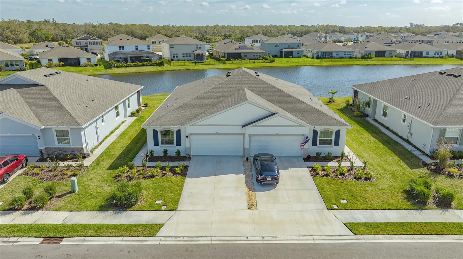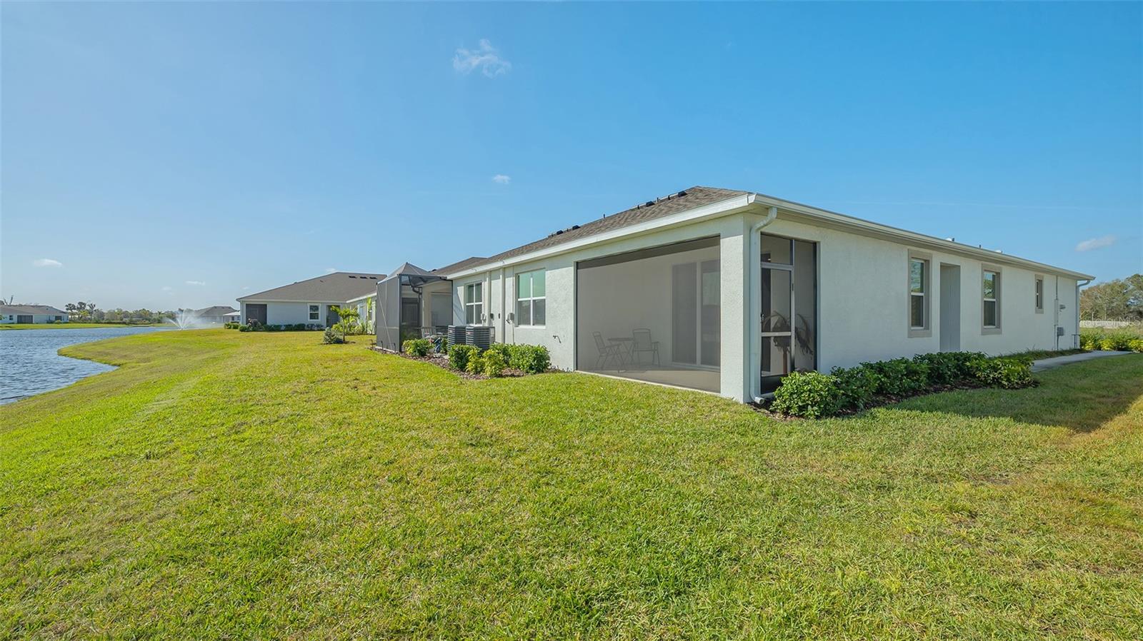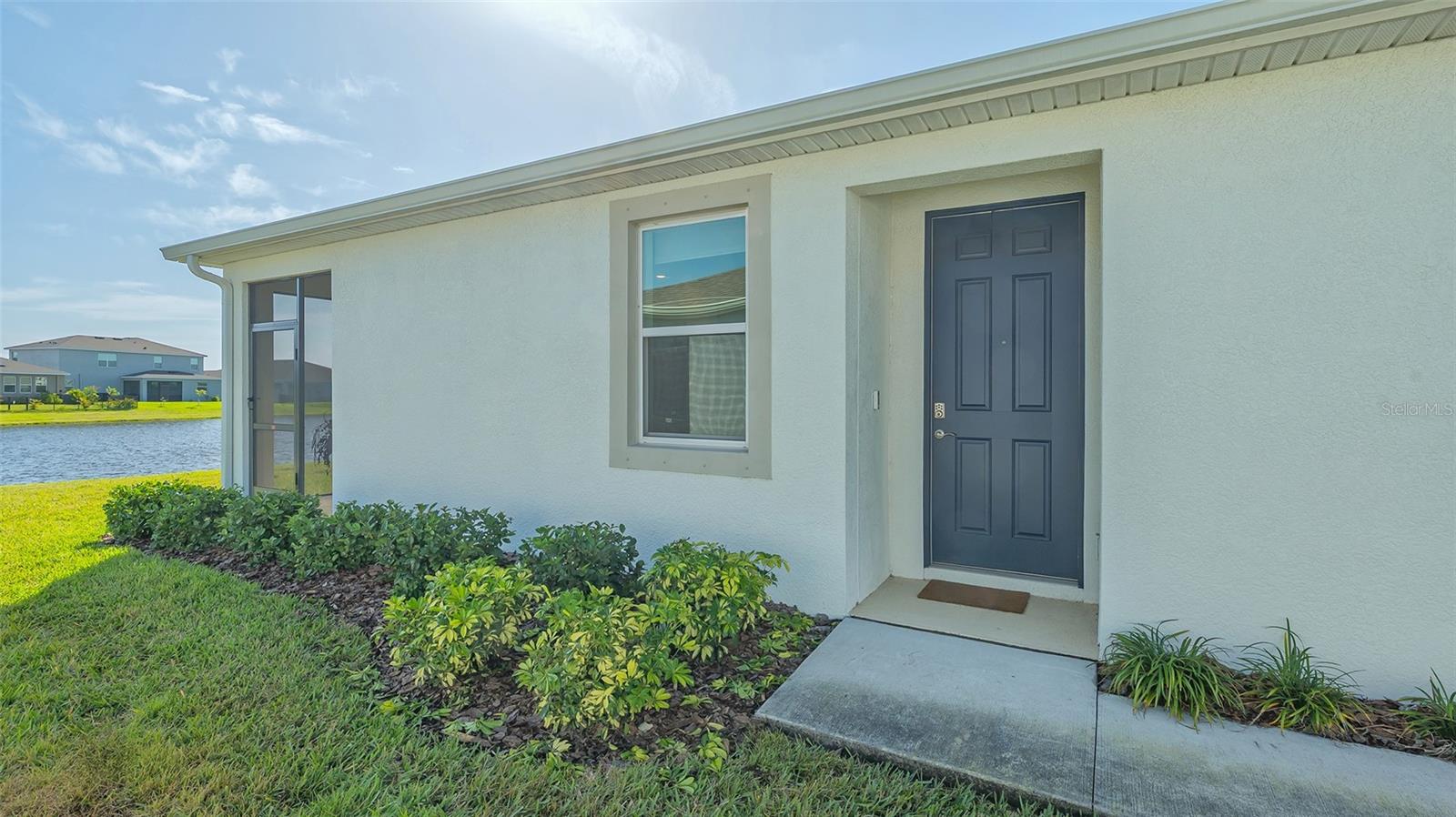 Welcome to your serene, lakefront newer build in the gated community of Coddington! Built solid with concrete block construction and a full complement of storm shutters, this lovely paired villa is a great opportunity for “new and ready now.” The interior lot and setting is the key- you’ll enjoy water views, wildlife and birds as well as atmospheric sunrises from the screened-in back porch. The open layout includes tiled main living area and an oversized kitchen with granite countertops and plenty of storage. The primary bedroom features water views through the windows, a dual vanity, and walk-in shower. The split plan allows for bedrooms two and three to have their own privacy on the opposite side of the home. Bedroom three sets up ideally as an office. This home features smart home technology that was included by the builder. The two car garage allows for abundant storage and rounds out this lovely residence. Coddington is maintenance-free meaning the association covers the lawn maintenance for you, and the community has an awesome pool and cabana, flex lawn, and playground. This newer home has been lightly lived in and is ready for new owners, schedule your private showing today!