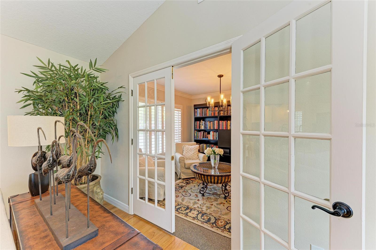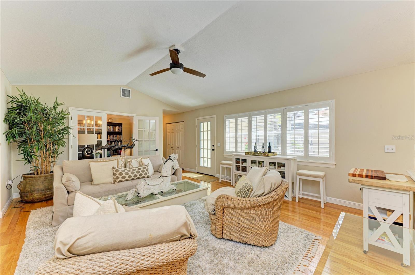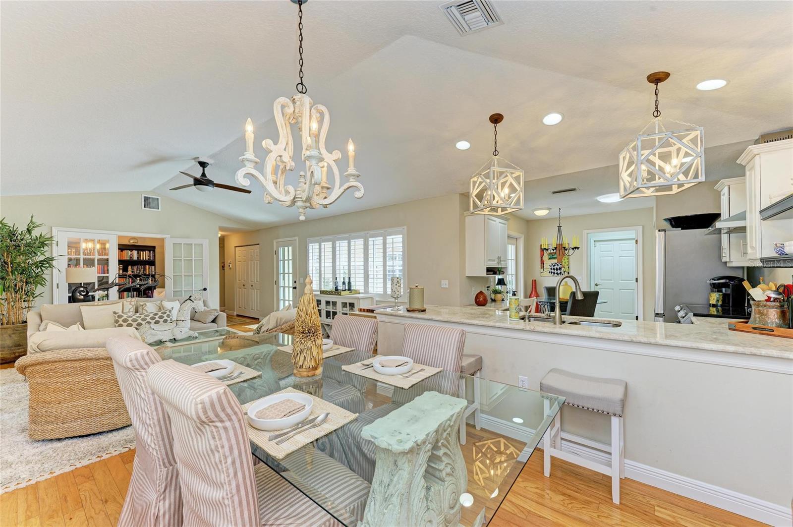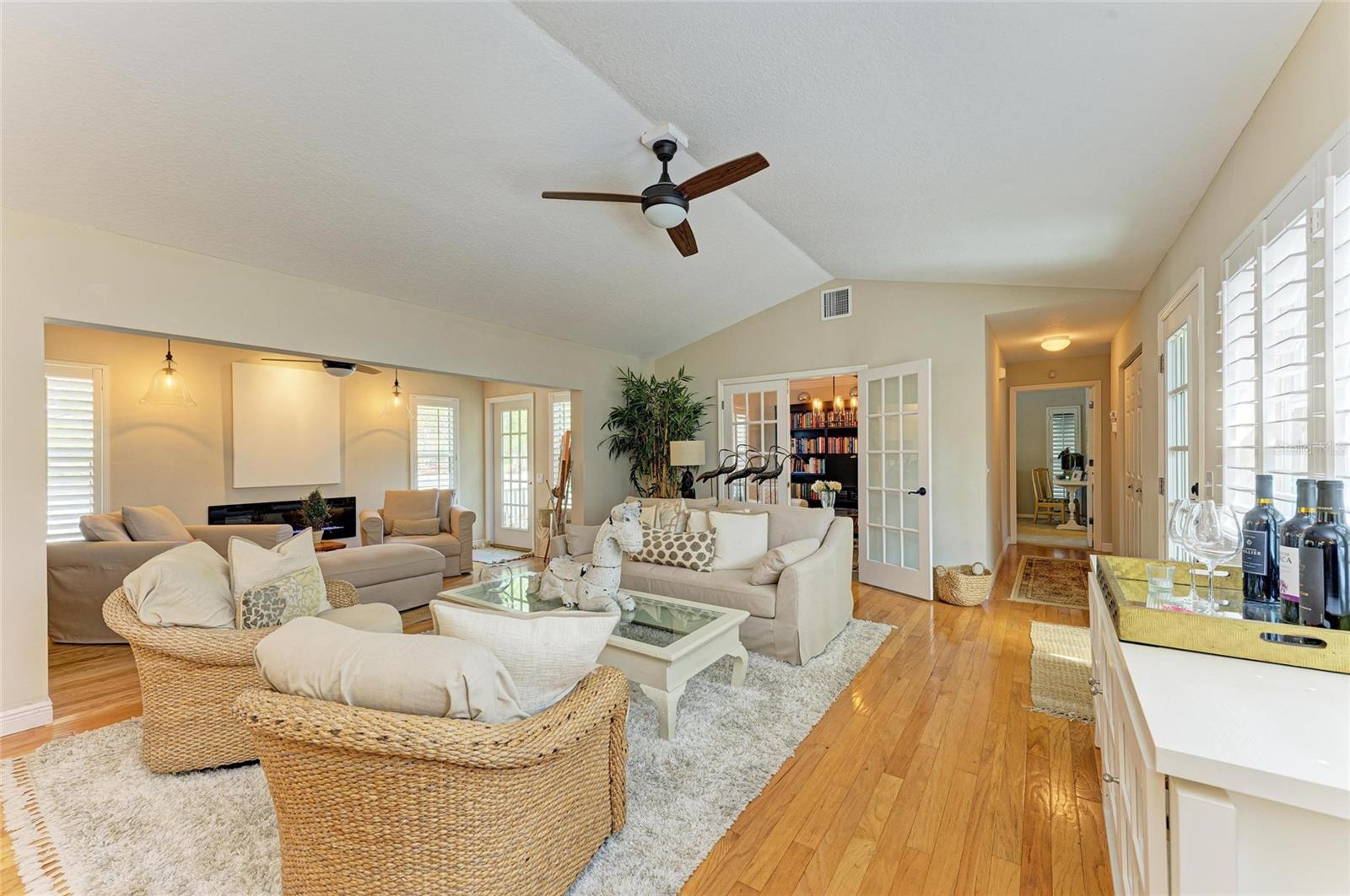 Beautifully updated and an open design you will notice the elegance from the moment you walk in the door! Whether sitting in the formal Livingroom, the cozy conversation area in front of the fireplace, or close the glass French doors to the office/library (use it as you wish). Let's not forget the beautiful kitchen with large peninsula overlooking the nice size dining area. There is even a great little spot to enjoy coffee right in the kitchen looking out onto your private deck. Also off of the kitchen is the laundry room, with extra storage and the entry from your two-car attached garage! Speaking of storage this home has no shortage of it with large closets and extra closets around every corner it seems! A large primary suite offers a walk in closet and great ensuite bath. Just down the hall you will find the second bedroom also with a walk-in closet and access to the second bath. Out the back door is an oasis with a grilling area and sitting spot to enjoy the outdoors! Literally just steps from your front door you will find the heated pool which is in a lanai for your enjoyment! The neighborhood has beautiful mature trees and landscaping. This truly is a little slice of heaven offering peace and tranquility. Schedule a showing today to see all this home and community has to offer! NOTE** Per seller total sq. ft. is larger due to recent remodel enclosing lanai and opening to main living area see permit BR231389. NOTE seller has light fixtures above kitchen island, dining table and kitchen table reserved as they are family heirlooms, will be replaced.