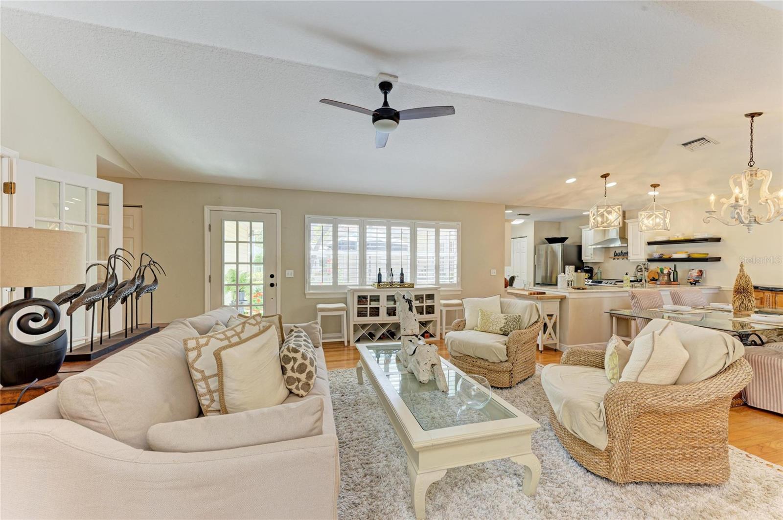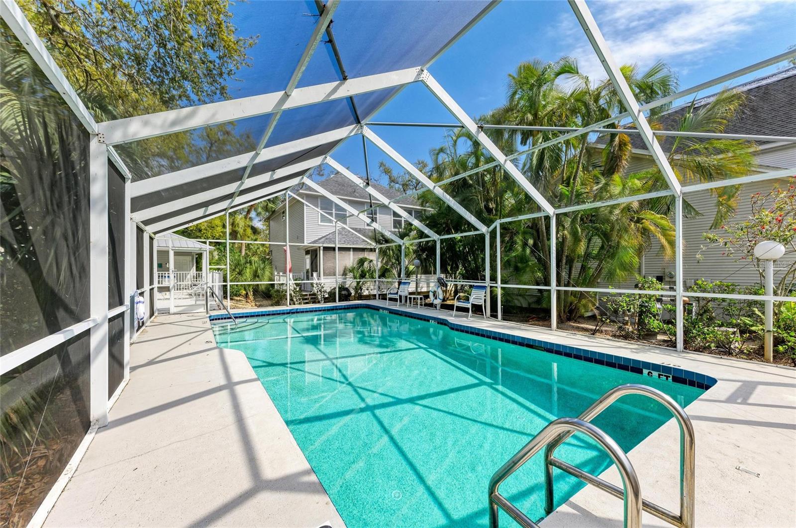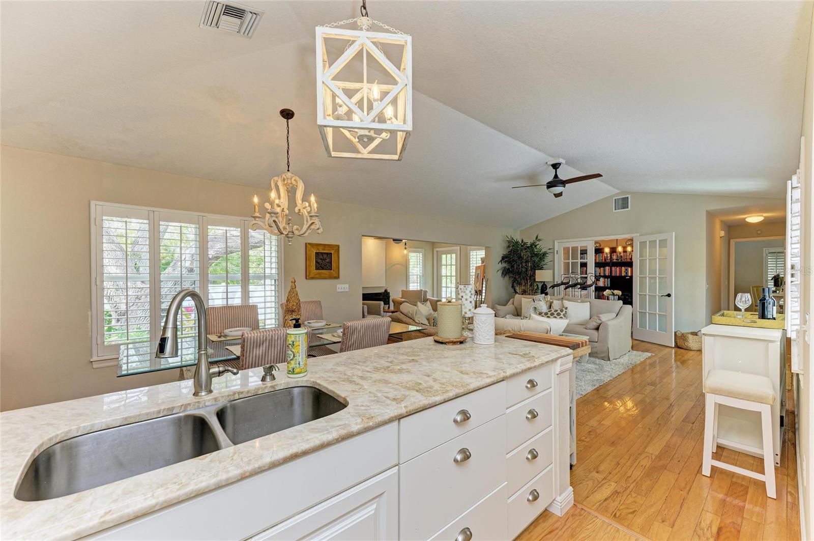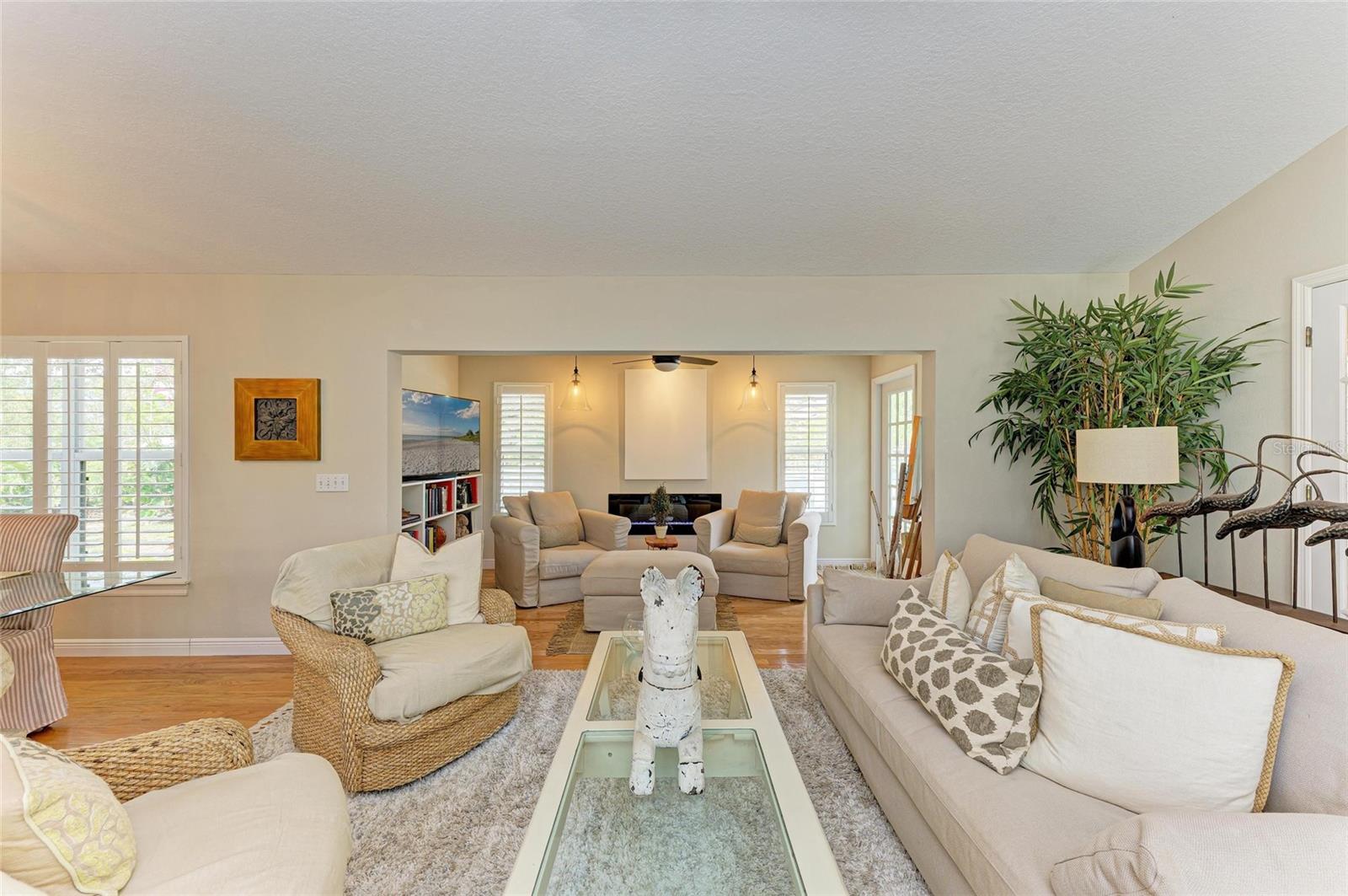 Beautifully updated and an open design you will notice the elegance from the moment you walk in the door! Whether sitting in the formal Livingroom, the cozy conversation area in front of the fireplace, or close the glass French doors to the office/library (use it as you wish). Let's not forget the beautiful kitchen with large peninsula overlooking the nice size dining area. There is even a great little spot to enjoy coffee right in the kitchen looking out onto your private deck. Also off of the kitchen is the laundry room, with extra storage and the entry from your two-car attached garage! Speaking of storage this home has no shortage of it with large closets and extra closets around every corner it seems! A large primary suite offers a walk in closet and great ensuite bath. Just down the hall you will find the second bedroom also with a walk-in closet and access to the second bath. Out the back door is an oasis with a grilling area and sitting spot to enjoy the outdoors! Literally just steps from your front door you will find the heated pool which is in a lanai for your enjoyment! The neighborhood has beautiful mature trees and landscaping. This truly is a little slice of heaven offering peace and tranquility. Schedule a showing today to see all this home and community has to offer! NOTE** Per seller total sq. ft. is larger due to recent remodel enclosing lanai and opening to main living area see permit BR231389. NOTE seller has light fixtures above kitchen island, dining table and kitchen table reserved as they are family heirlooms, will be replaced.