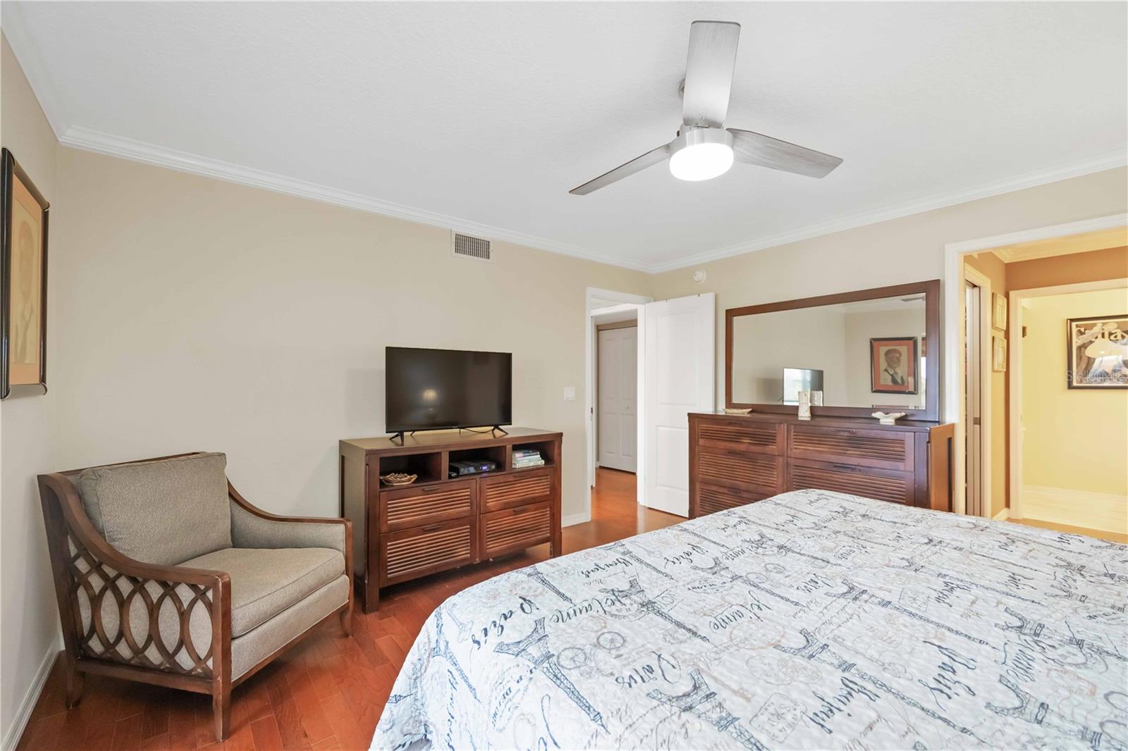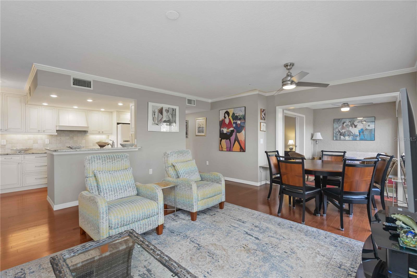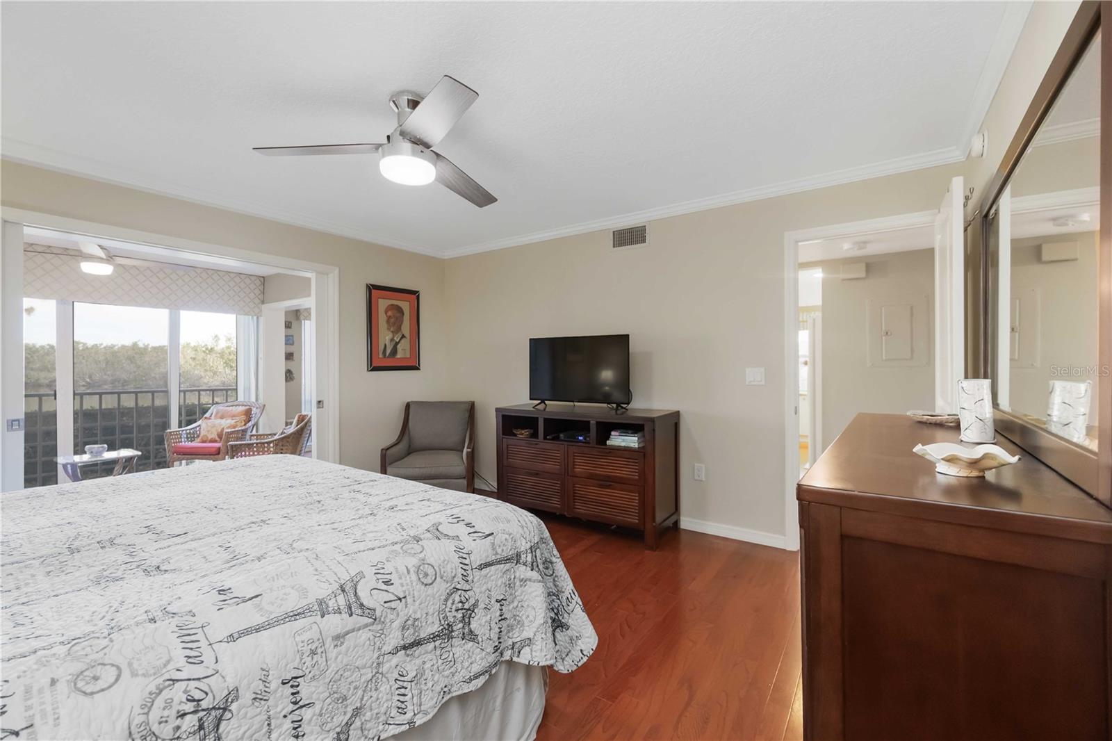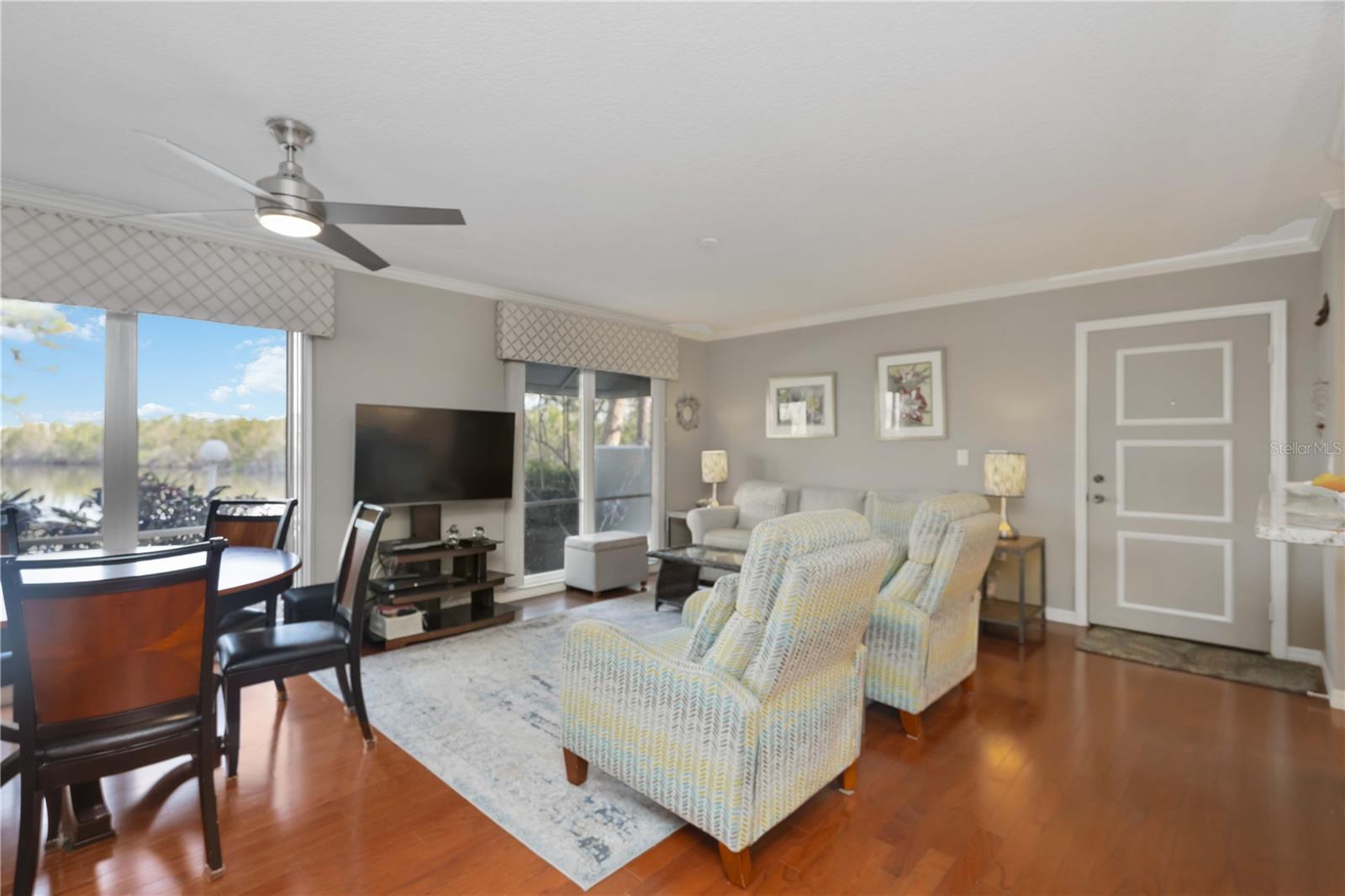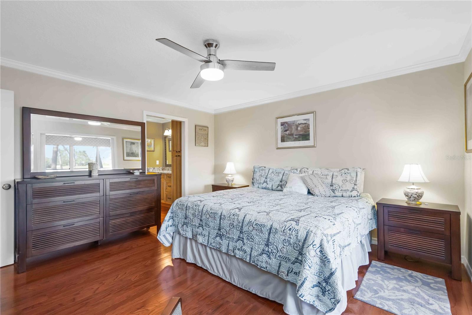 Experience unparalleled luxury in this fully updated 2-bedroom, 2-bath over 1400 sq ft condo on Perico Island. This stunning residence offers 180-degree water views from both bedrooms and the living room, enhanced by elegant crown molding and impact-resistant windows throughout. The chef’s kitchen, with its gleaming granite countertops, custom cabinetry, and top-of-the-line stainless range and dishwasher, is the heart of the home, perfect for entertaining. The engineered hardwood flooring throughout the majority of the unit truly shows off the craftmanship and pride of ownership that is unmistakable throughout the property. The primary suite offers a spacious walk-in closet, custom granite top vanities, and a gorgeously re-tiled shower that reflects the condo’s coastal charm. Enjoy your privacy with unique pocket doors that will lead directly out to a secondary living area or extension of the primary suite with one of the best views of the property. The guest bathroom also shines with a new vanity and elegant tile work. Abundant wildlife can be observed right from your front door and every window of the property, providing a serene backdrop year-round. Enjoy top-notch amenities, including a tennis court and a spacious community swimming pool. Located just a short distance from the award-winning beaches of Anna Maria Island, this condo is the ideal coastal retreat.