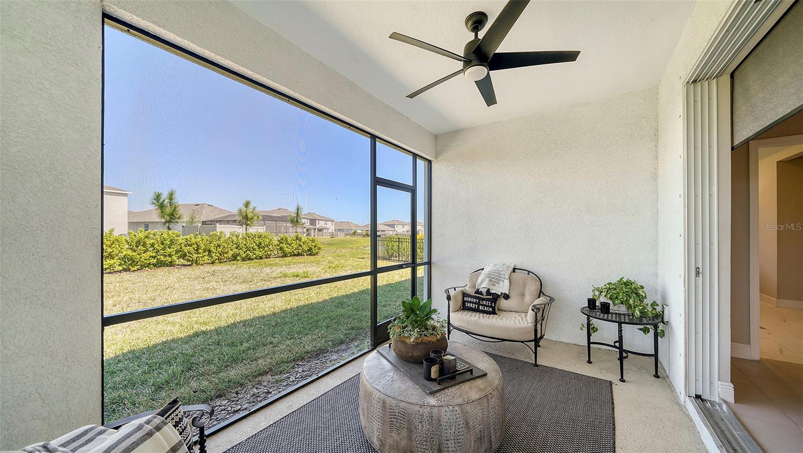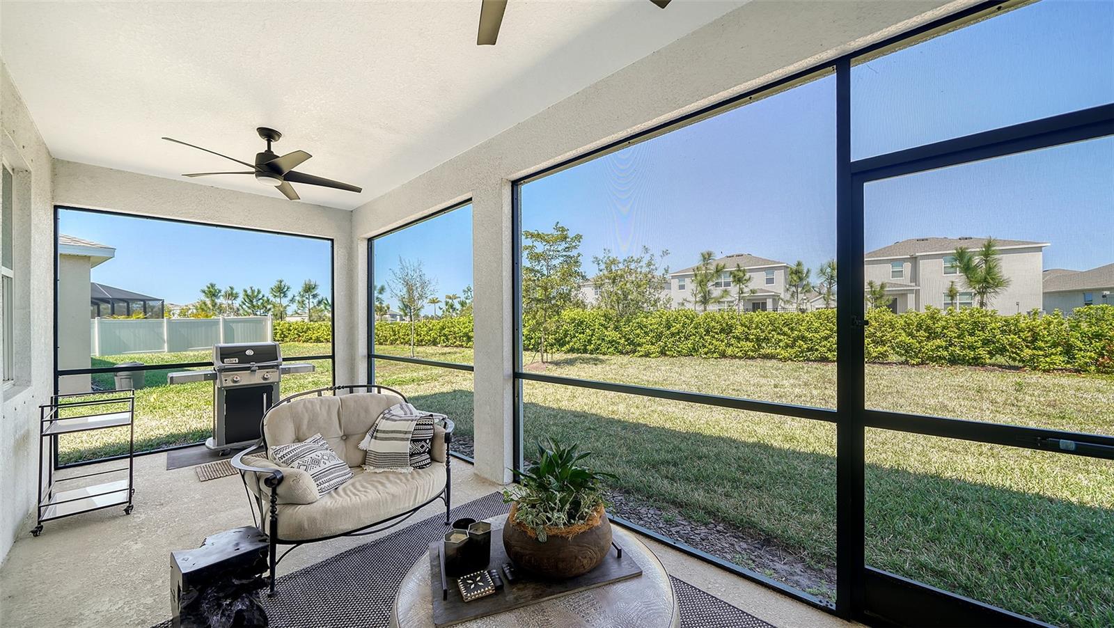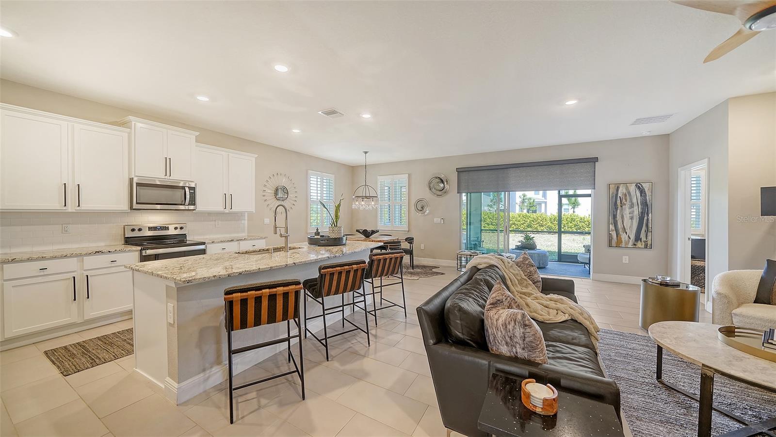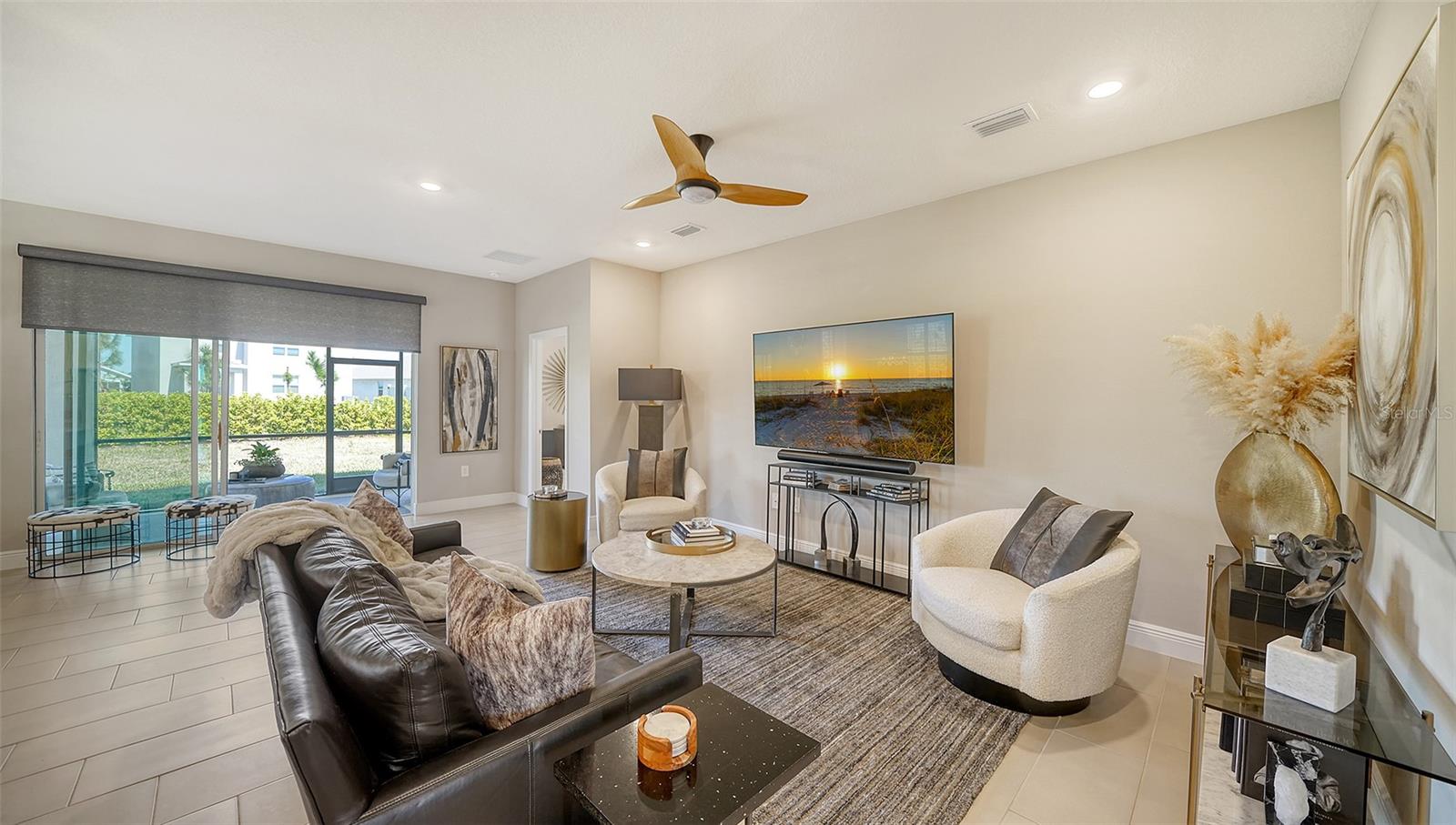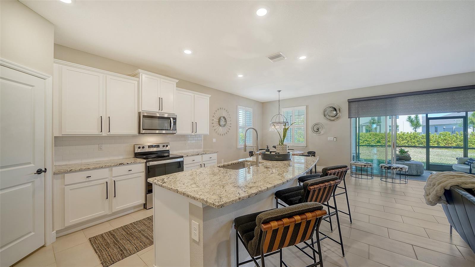Don't wait for new construction! This gorgeous, upgraded MOVE IN READY residence is ready for you! This very popular Lantana floorplan features 4 bedrooms, 2.5 baths, tile flooring throughout, plantation shutters, screened lanai, 2-car garage, and an industry-leading smart home automation system. Home is built with concrete block construction and features open concept kitchen featuring staggered, crown-molded cabinets with upgraded hardware, splendid granite counters with white tile backsplash, upgraded faucet, stainless-steel appliances, walk-in pantry, and a huge island perfect for entertaining or enjoying meals with plenty of room for seating. The living room is wonderfully placed just off the kitchen, dining area, and screened in lanai. This layout allows plenty of space for everyone to socialize together whether you're watching tv, cooking in the kitchen or relaxing and enjoying the outdoor air. There is also a guest half bathroom just off the great room topping of this area perfect for entertaining. The primary bedroom overlooks the beautiful backyard and features a tray ceiling, as well as two walk-in closets. The large primary bathroom is beautifully designed with granite countertops, two sinks, walk-in shower, bathtub, and privacy glass window for plenty of natural light. The split floor plan with bedrooms two and three is perfect for guests, family, or children's rooms. The 4th bedroom would also make a great office space as it's right near the half bath. The nearby laundry room includes the washer and dryer. Solera homeowners enjoy the state-of-the-art amenities including a luxurious resort-style pool and cabana, two playgrounds, and lawncare with very low HOA and CDD fees! Solera is located across the street from the brand-new Lakewood Ranch community library, as well as the new community park. Conveniently located near "A" rated schools, LWR Main St., Waterside, airports, premiere shopping/UTC, dining, golf and of course the beaches!!!!