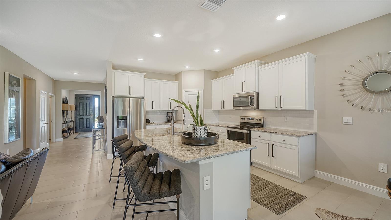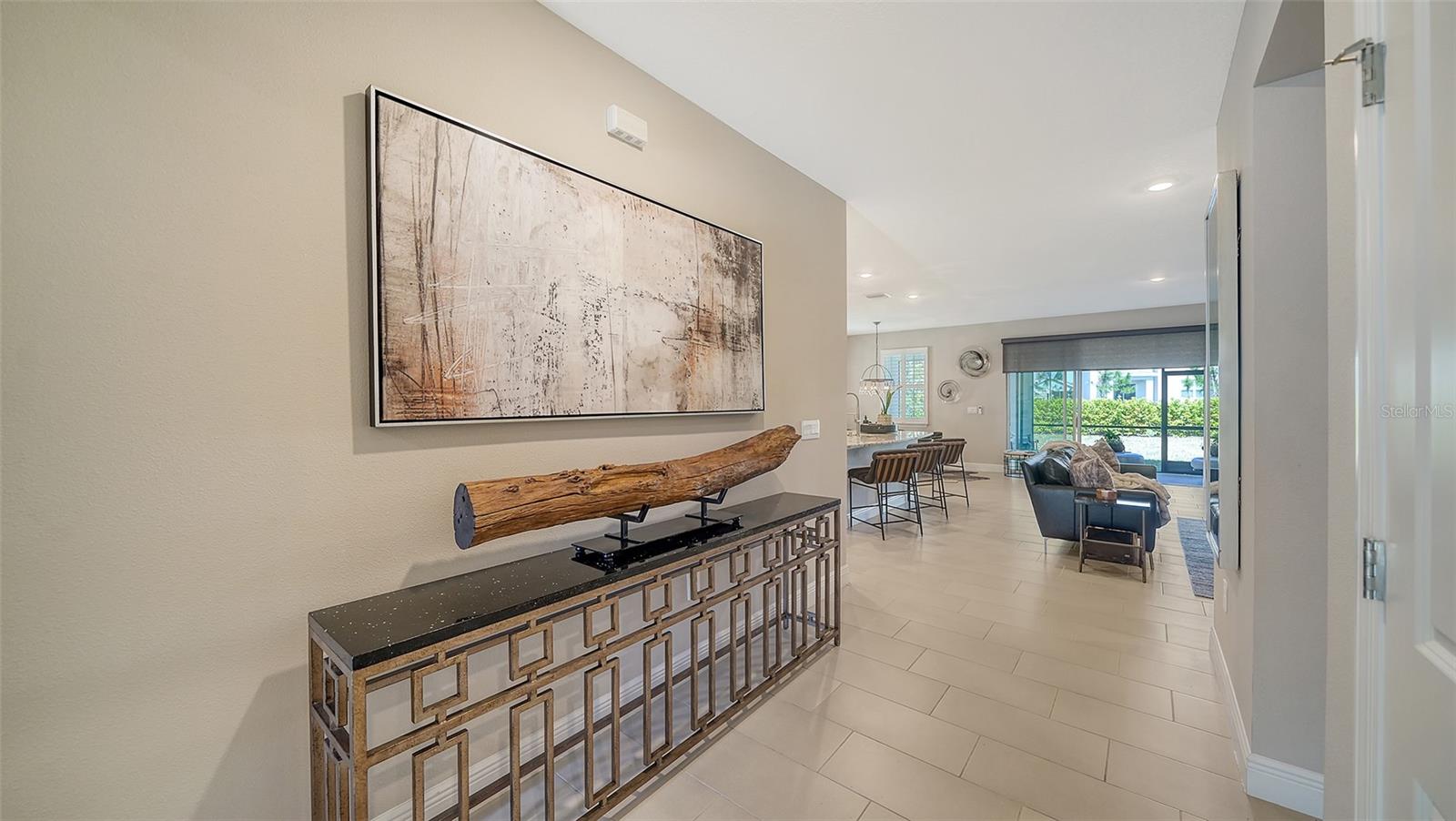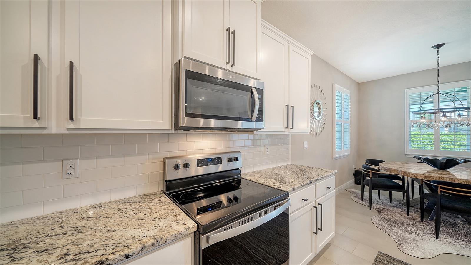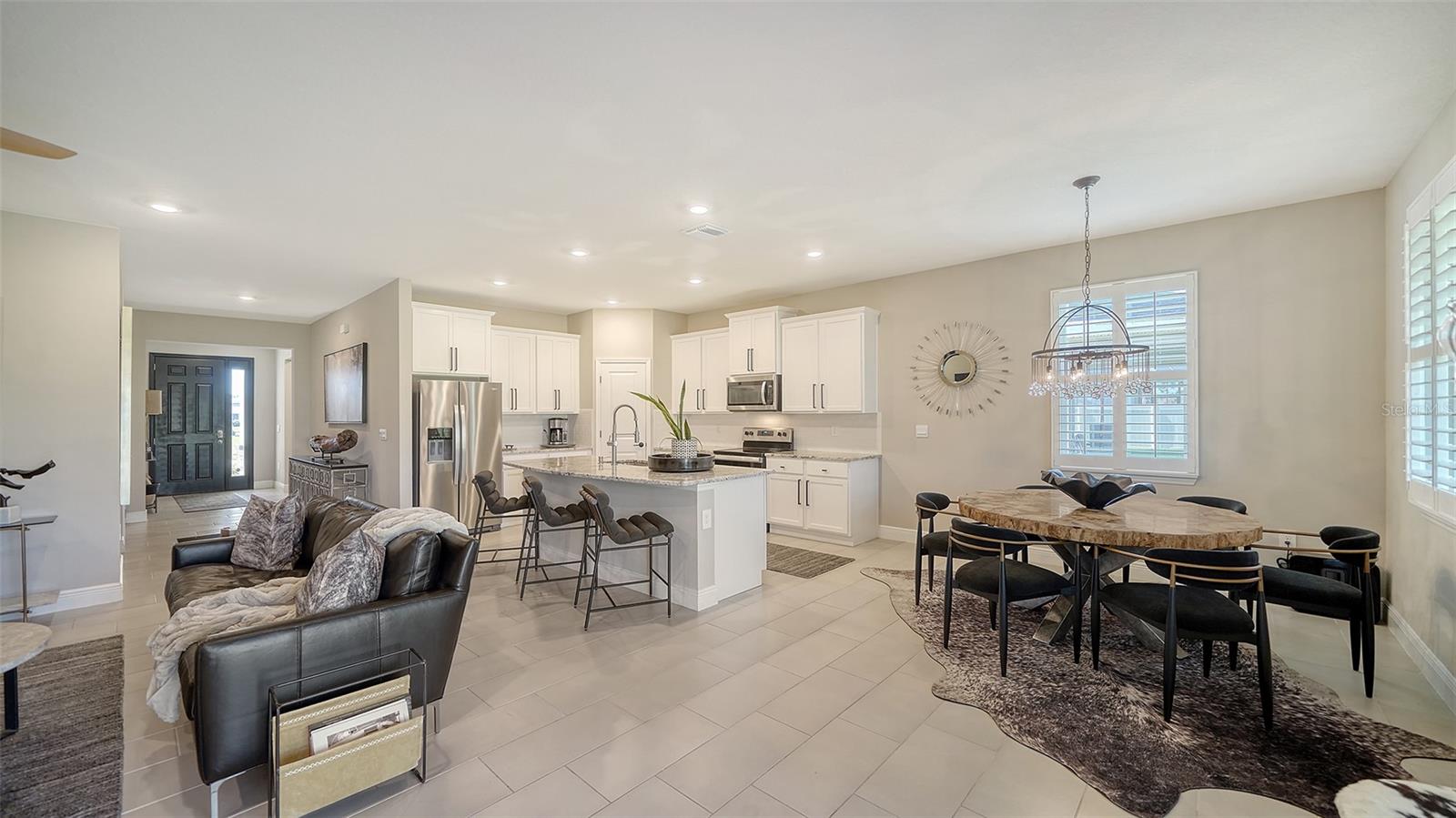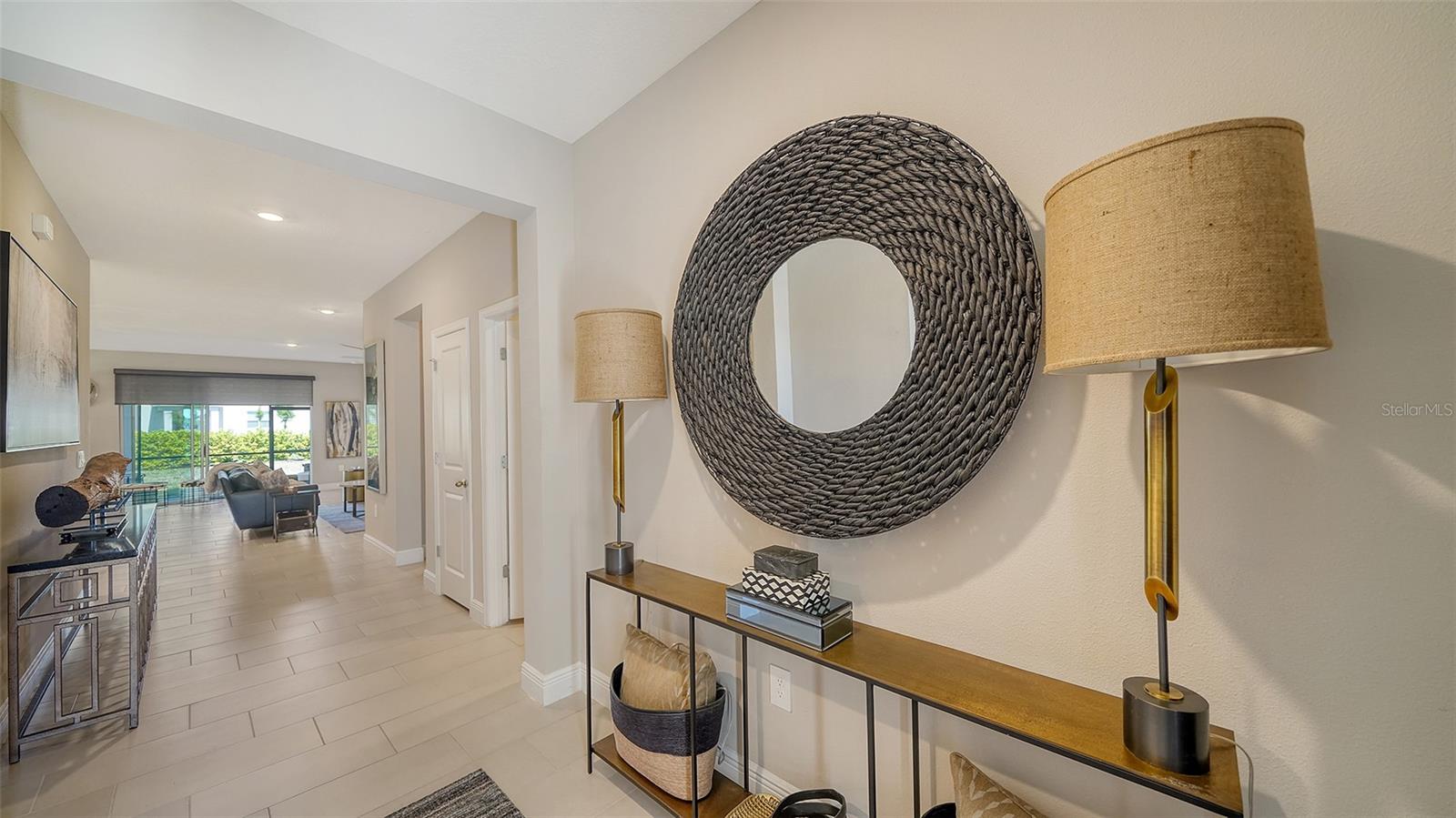 Don't wait for new construction! This gorgeous, upgraded MOVE IN READY residence is ready for you! This very popular Lantana floorplan features 4 bedrooms, 2.5 baths, tile flooring throughout, plantation shutters, screened lanai, 2-car garage, and an industry-leading smart home automation system. Home is built with concrete block construction and features open concept kitchen featuring staggered, crown-molded cabinets with upgraded hardware, splendid granite counters with white tile backsplash, upgraded faucet, stainless-steel appliances, walk-in pantry, and a huge island perfect for entertaining or enjoying meals with plenty of room for seating. The living room is wonderfully placed just off the kitchen, dining area, and screened in lanai. This layout allows plenty of space for everyone to socialize together whether you're watching tv, cooking in the kitchen or relaxing and enjoying the outdoor air. There is also a guest half bathroom just off the great room topping of this area perfect for entertaining. The primary bedroom overlooks the beautiful backyard and features a tray ceiling, as well as two walk-in closets. The large primary bathroom is beautifully designed with granite countertops, two sinks, walk-in shower, bathtub, and privacy glass window for plenty of natural light. The split floor plan with bedrooms two and three is perfect for guests, family, or children's rooms. The 4th bedroom would also make a great office space as it's right near the half bath. The nearby laundry room includes the washer and dryer. Solera homeowners enjoy the state-of-the-art amenities including a luxurious resort-style pool and cabana, two playgrounds, and lawncare with very low HOA and CDD fees! Solera is located across the street from the brand-new Lakewood Ranch community library, as well as the new community park. Conveniently located near "A" rated schools, LWR Main St., Waterside, airports, premiere shopping/UTC, dining, golf and of course the beaches!!!!