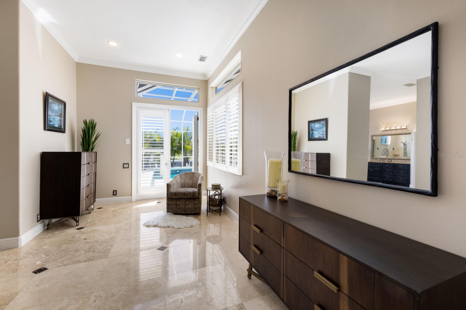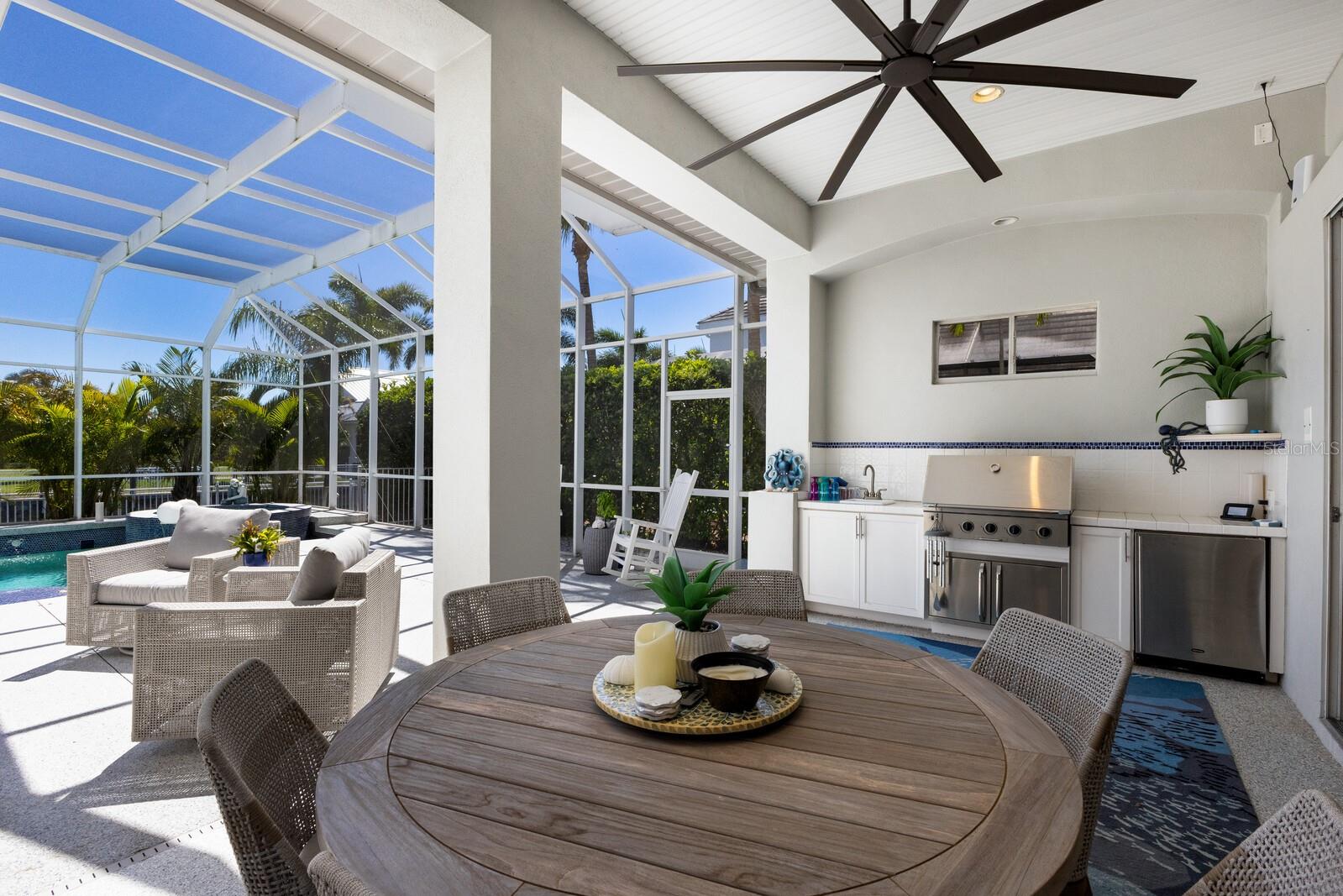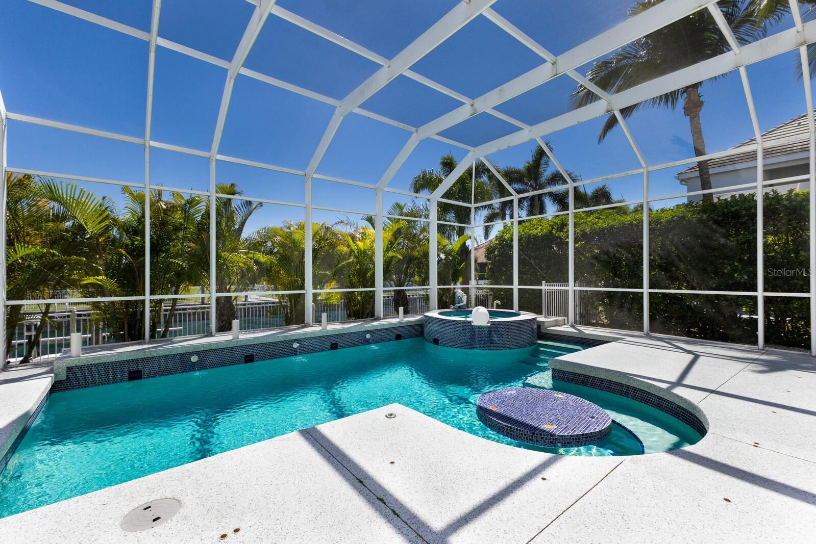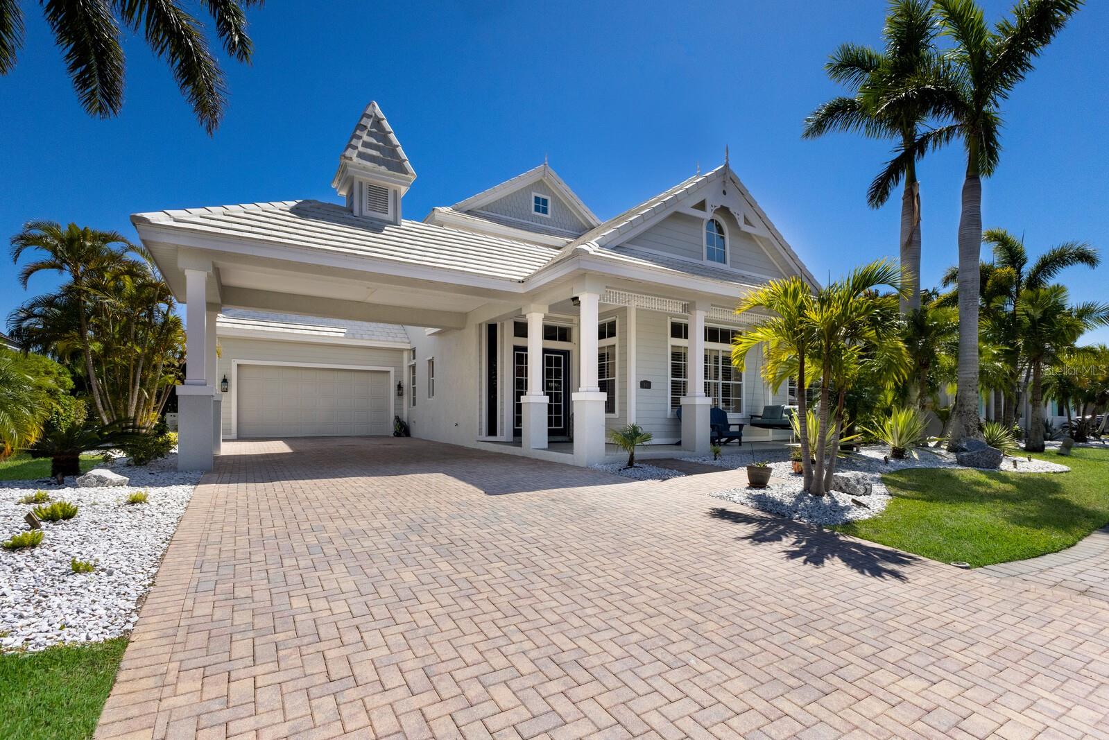 Step into the epitome of coastal elegance with this stunning five-bedroom residence, complete with an office and bonus loft, located in the prestigious gated boating community of Harbour Walk at the Inlets. Exuding Key West charm, this Rutenberg custom home captivates with a port cochère, three-car tandem garage, and a welcoming front porch that sets the tone for the luxury within. Modern conveniences include a Generac whole-house backup generator, water softener, kitchen reverse osmosis system, impact glass throughout, and new storm shutters for peace of mind. Enter through glass double doors into a breathtaking foyer, where a stunning wooden staircase anchors the space, complemented by the living room and formal dining room. The sophisticated interior boasts travertine flooring, cathedral ceilings, walls of oversized windows and glass sliders that bathe each room in natural light. The heart of the home is the chef’s kitchen, featuring custom cabinetry with glass display panels, stainless steel appliances and a granite center island perfect for casual dining. Adjacent, the spacious family room with soaring ceilings seamlessly transitions to the covered lanai and pool area, adding another 1,200 square feet of outdoor living space. Enjoy the refined polyaspartic flooring that extends from the lanai to the front entry and garage, offering a low-maintenance yet stylish touch. Indulge in year-round entertaining on the outdoor summer kitchen, complete with a built-in gas grill. The heated swimming pool and spa are a showstopper, with a swim-up table and seating, all framed by nearly 100 feet of canal frontage. The new 22,000-pound boat lift offers effortless access to the Manatee River—a true boater’s paradise. Retreat to the first-floor primary suite, an expansive haven with a private seating area, terrace access, and a luxurious en-suite bathroom. The dedicated office on the main level features custom built-ins, providing a quiet and functional workspace. Upstairs, discover the versatile bonus loft room with a morning kitchen and outdoor balcony overlooking the patio and waterfront. Four additional bedrooms, one configured as a den with a Murphy bed, accommodate guests with style. Two bedrooms share a Jack-and-Jill bathroom, while a fifth bedroom offers a private en-suite and walk-in closet. Ideally positioned, this boater’s dream home is only minutes from the vibrant dining and shopping scenes of Sarasota, Bradenton, and Lakewood Ranch. Plus, with quick access to award-winning beaches like Anna Maria Island, Longboat Key, and Siesta Key, as well as proximity to an abundance of premier golf courses, this home captures the essence of Florida luxury living. Your waterfront paradise awaits in Harbour Walk at the Inlets—embrace the ultimate blend of luxury and lifestyle!