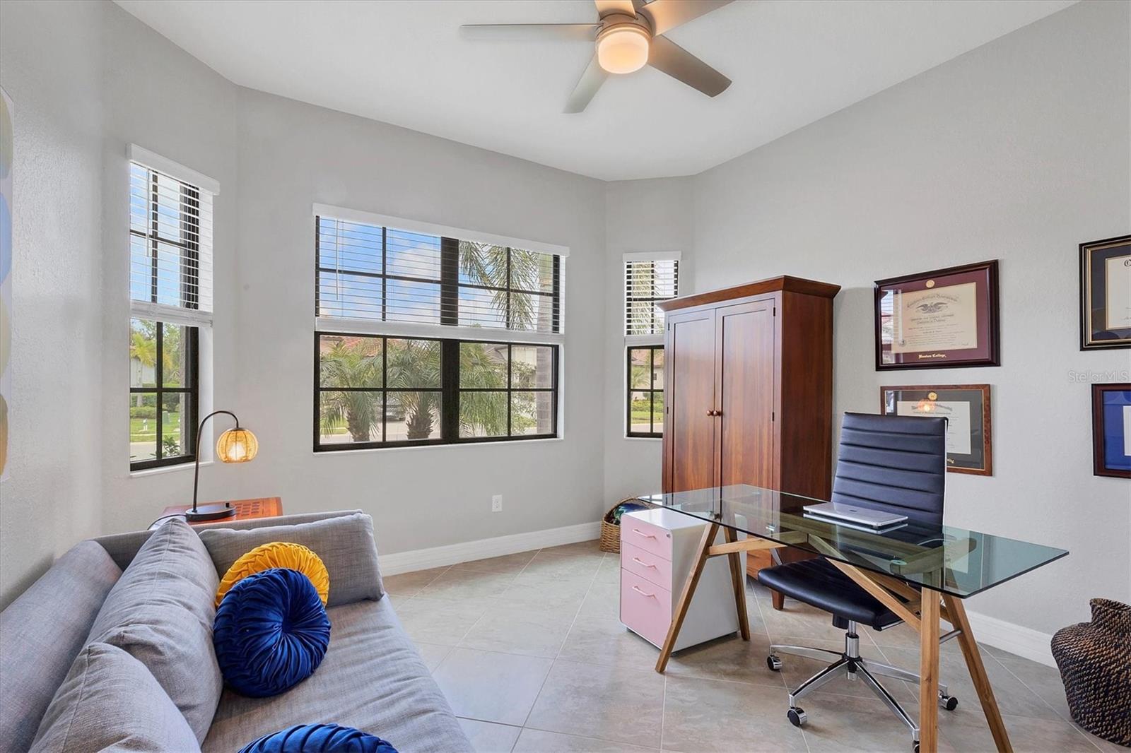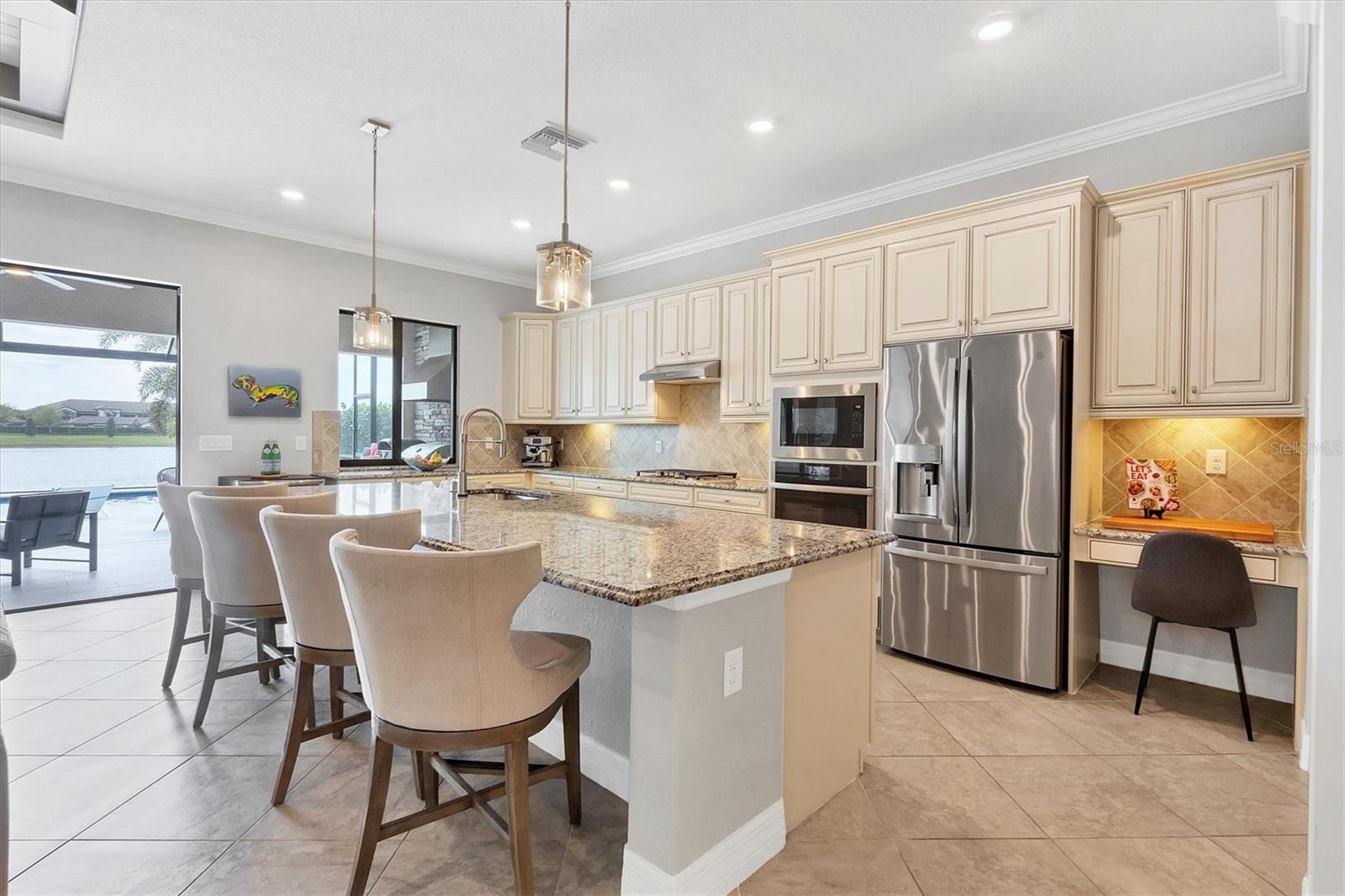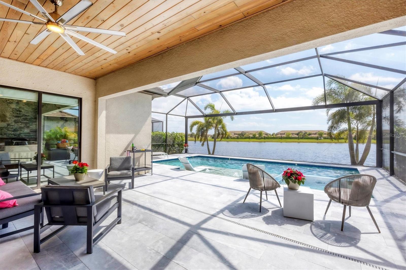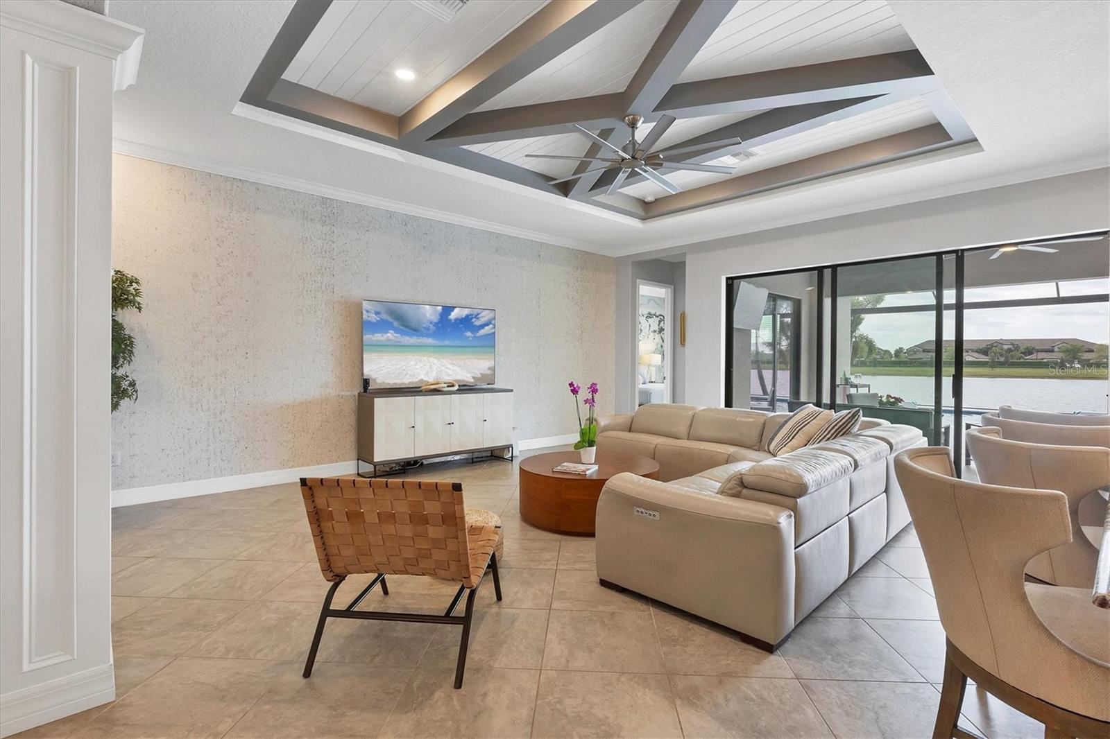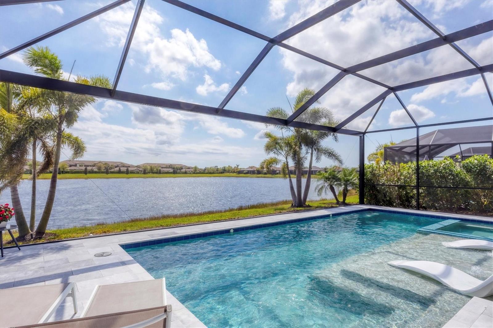 Everything today’s discerning buyers desire, such as unparalleled lake views, casual elegance and resort amenities, can be found in this stunning Angelina open floor plan home behind the gates of Lakewood National Golf Club. From the moment you enter, the expansive water views draw you through the living space and out to the travertine-tiled lanai. A grand rectangular pool with a sun shelf invites you to relax, while the panoramic screen framed by swaying palms ensures uninterrupted serenity. The lake stretches wide, offering a rare open vista of shimmering water. Designed for effortless indoor-outdoor living, the lanai boasts an abundance of covered space, a wood-paneled ceiling and a fully equipped outdoor kitchen, ideal for entertaining or unwinding in the beauty of nature. Inside, elegance meets functionality with a generous pale-toned gourmet kitchen, featuring a gas cooktop, wall ovens, loads of counter space, an island sink and a fun pass-through to the outdoor kitchen. Architectural details like beamed ceilings and wainscoting enhance the warm, inviting ambiance. Membership included to Lakewood National 36-hole Arnold Palmer-designed golf course, lighted Har-Tru tennis, pickleball, bocce ball, a grand dining clubhouse, tiki bar dining, salon/spa, fitness and resort pools.