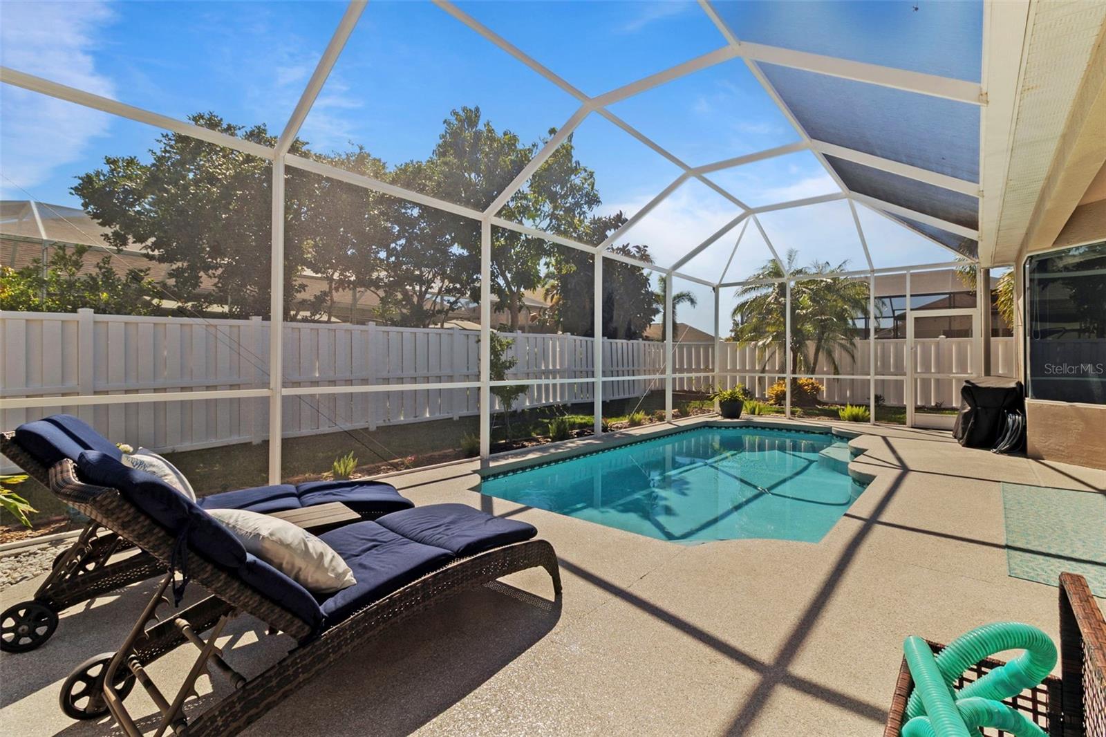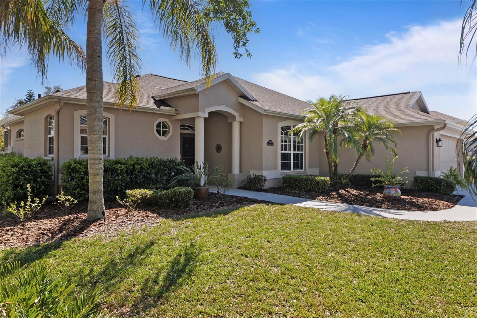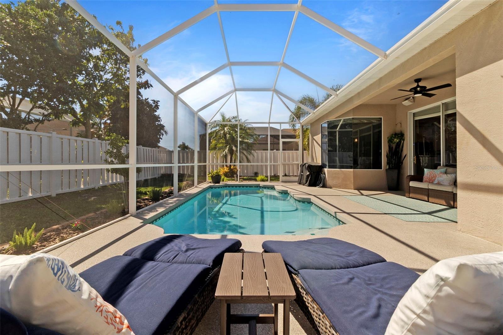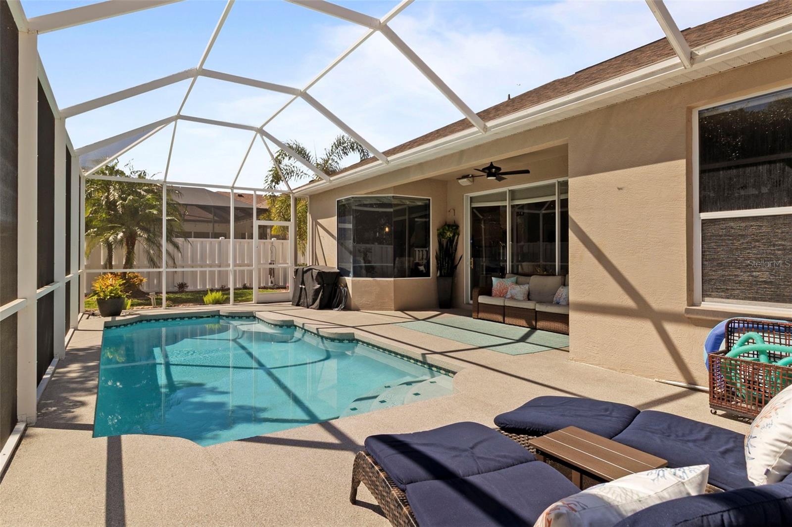 Welcome to this BEAUTIFUL home that immediately catches your eye with its open design. Upon entering, you're greeted by an expansive layout which seamlessly leads to a covered lanai and a SPARKLING POOL beyond. The thoughtfully designed SPLIT FLOOR PLAN situates provides privacy for the owner. The master en-suite has dual sinks, a large soaking tub and a Roman shower. The Master bedroom has two closets, one of which is a large walk-in with CUSTOM BUILT-INS. At the heart of the home lies a centrally located GORGEOUS KITCHEN with stunning SPARKLING STONE COUNTERTOPS and beautiful backsplash tiles, equipped with a new natural gas range, a center island with breakfast bar counter-height seating for 3-4, lovely WHITE CABINETS, a pantry, and an influx of NATURAL LIGHT from strategically placed windows. The spacious formal dining room, great room, and bright dinette with AQUARIUM WINDOWS overlooking the pool make this home perfect for entertaining. For outdoor gatherings, the adjoining lanai offers a PRIVATE BACKYARD OASIS with a SPARKLING POOL, comfortable seating areas, lush vegetation, and low-maintenance PVC fencing so your pets can have fun in the backyard. SIGNIFICANT UPGRADES over the past three years include a NEW ROOF, NEW HVAC system, NEW POOL HEATER and pool/lanai resurfacing, new deep sink in laundry, new bathroom toilets/fixtures/lighting, and new flooring in the living/dining rooms. The new BLACKSTONE GAS GRIDDLE is staying with the house as a bonus! The furniture is available on a separate contract. Located in a friendly community surrounded by the highly rated LINKS AT GREENFIELD PLANTATION GOLF COURSE, which is a pay-as-you-play GOLF COURSE so residents enjoy the benefits of golf community living without mandatory memberships. The community's proximity to elementary and middle schools, accessible via sidewalks without leaving the neighborhood, adds to its appeal. Additionally, its close proximity to LAKEWOOD RANCH offers the advantages of nearby amenities without the associated high fees. With a LOW HOA fee of only $500 per year and NO CDD FEE, this home is conveniently located just two miles east of I-75, providing easy access to all the area has to offer which includes the brand new development underway which includes Costco, Target, multiple restaurants and shops.
