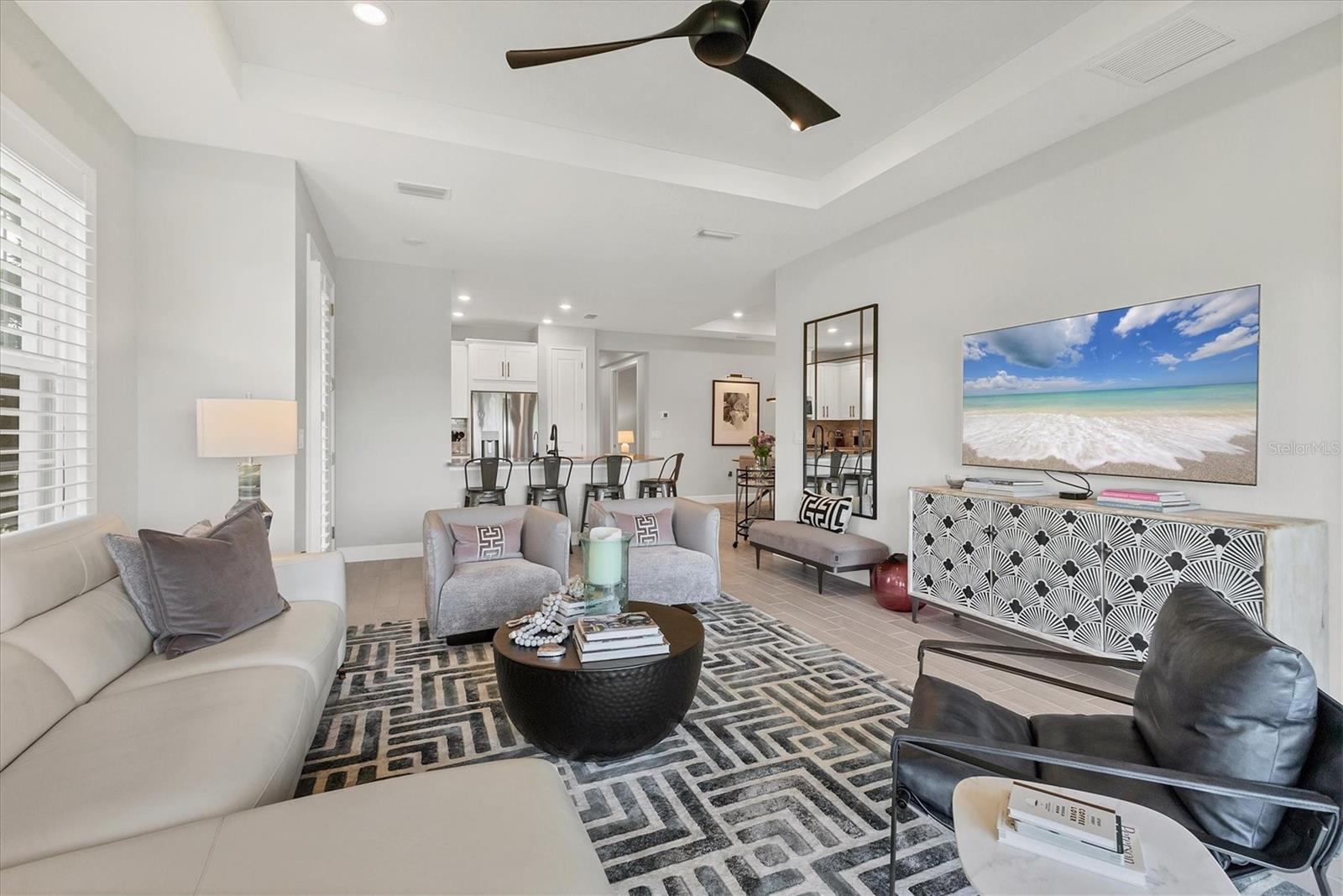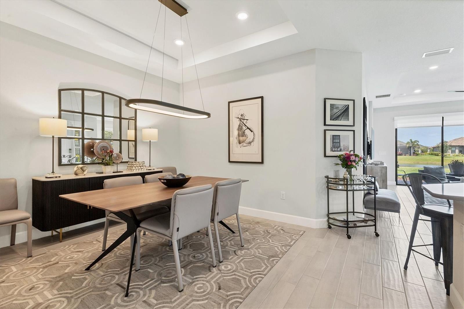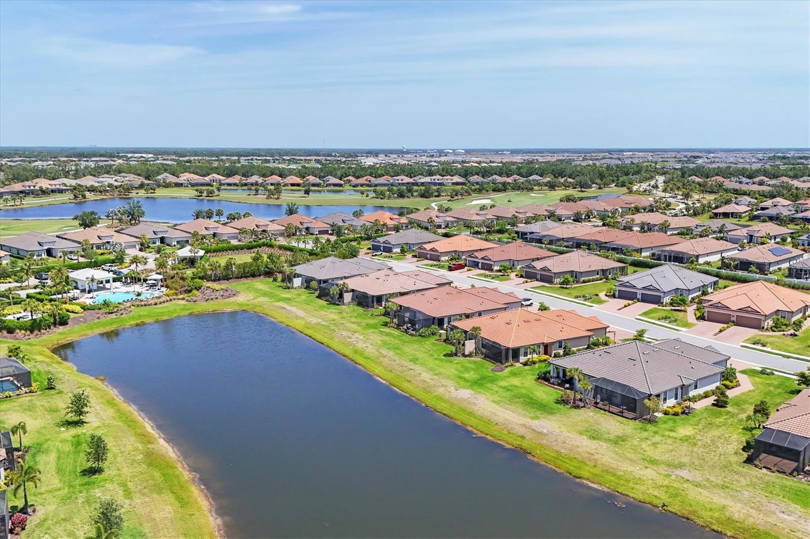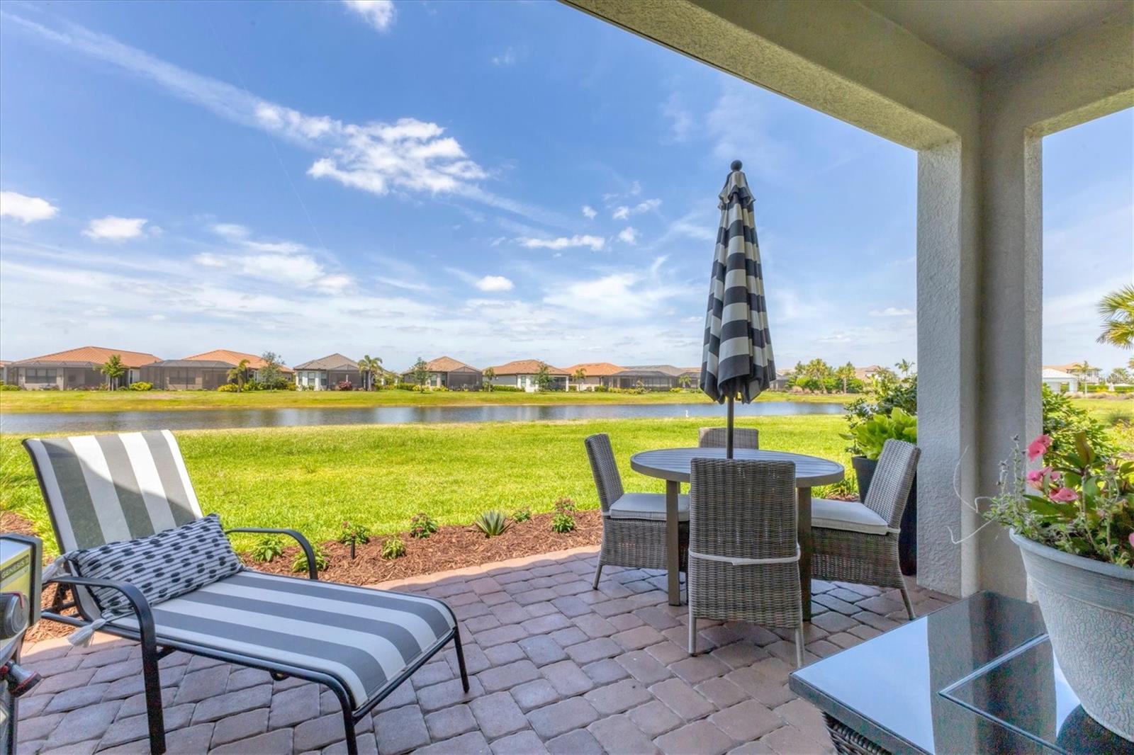 Welcome to the epitome of luxury & lifestyle in the highly sought-after, gated community of Esplanade at Azario in Lakewood Ranch. This stunning 2-bedroom, 2-bathroom home with a spacious office/den sits peacefully on a quiet cul-de-sac with beautiful water views, offering an unmatched blend of professional design, comfort, & serene Florida living. Unlike new construction homes, this move-in ready residence features tens of thousands in premium upgrades, high-end finishes, & thoughtful design touches that far exceed builder-grade standards. Step inside through the front door & you’ll immediately feel the difference. The open-concept floor plan is filled with natural light & flows effortlessly between the living, dining, & gourmet kitchen areas - perfect for entertaining or enjoying quiet evenings. Throughout the main living areas, attractive wood-look tile flooring adds both style & durability, while the bedrooms feature plush, upgraded carpet for added comfort. The heart of the home is the chef’s kitchen, where no detail has been spared. Enjoy level 5 shaker-style soft-close cabinetry with upgraded, deep pots/pans drawers, quartz countertops, custom marble tile backsplash, reverse osmosis water filtration system, Glamour-line stainless steel appliances. Whether you’re whipping up breakfast or hosting a gourmet dinner, this space combines beauty & function with ease. It flows into the beautiful dining room with a striking, contemporary chandelier hung from the tray ceiling! Sophistication continues throughout the home with tray ceilings, 8-foot solid-core doors, plantation shutters, fresh paint, recessed lighting, and designer ceiling fans. The owner’s suite is a peaceful retreat, featuring expansive windows overlooking the water & a luxurious en-suite bath with dual vanities, quartz countertops, stylish mirrors, makeup station, beautifully tiled shower with frameless glass door & a customized walk-in closet. The family room opens up to a private paver patio through large stacking sliding glass doors with Hunter Douglas Powerview motorized remote-control shades, where you’ll enjoy picture-perfect sunsets over the tranquil pond - often visited by herons, cranes, & other wildlife. The outdoor space is pre-wired for a pool and pre-plumbed for a summer kitchen, giving you the freedom to design your dream backyard oasis. The newly updated landscaping completes this tropical haven. The comfortable & versatile den featuring convenient pocket doors performs as an office, sitting area, and/or an additional sleeping area when needed. A spacious laundry room features new front-load washer/dryer, upper cabinetry, built-in shelving & a utility sink with pull-down faucet for added convenience. The home is designed in a split floor plan which provides privacy for your guests. The attached two-car garage boasts overhead storage racks & epoxy-coated floors. As a resident of Azario, you’ll enjoy resort-style amenities, including an 18-hole championship golf course with PGA professional instruction, pickleball, tennis, bocce ball, zero-entry pool & spa, poolside tiki bar, culinary center with multiple restaurants, full-service wellness spa, state-of-the-art fitness center, dog park, vibrant calendar of social events & activities. This immaculately maintained home is a rare opportunity to own a highly upgraded, waterfront residence in one of Lakewood Ranch’s premier active lifestyle communities - without waiting for new construction.