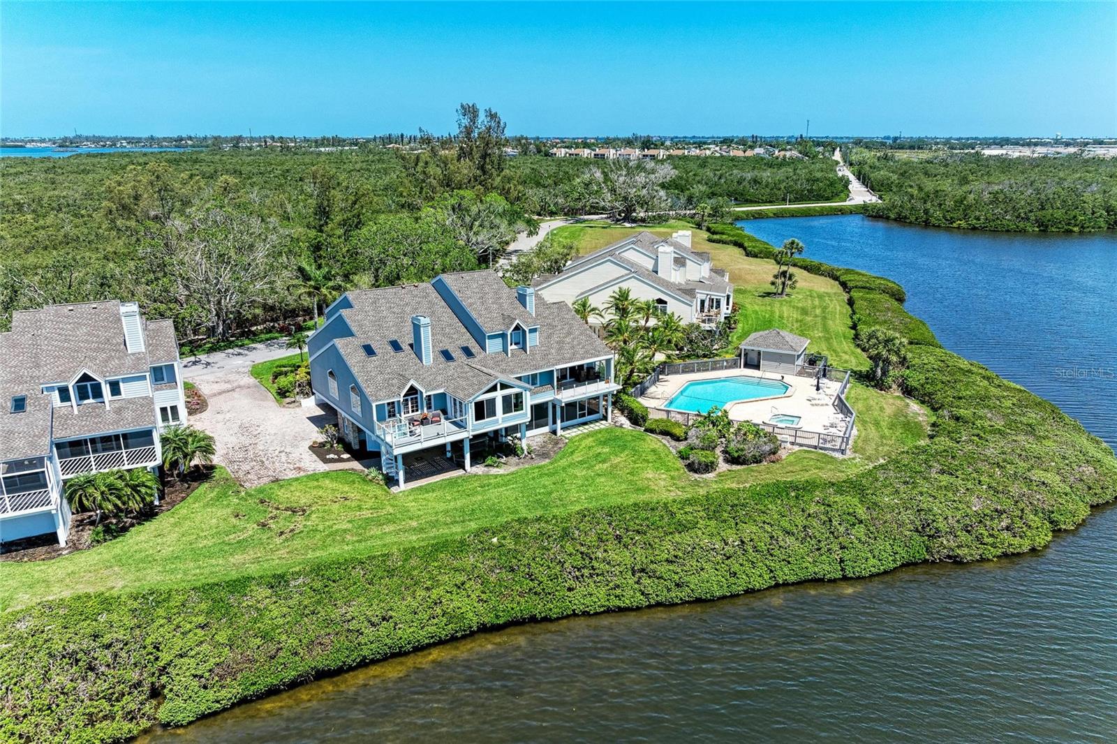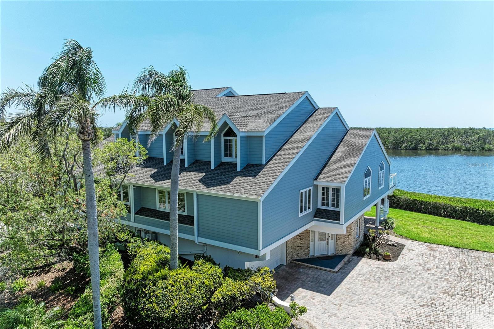 Tidy Island classic waterfront home with magnificent panoramic water views of Sarasota Bay! Even the star gazing is magnificent! Discover the epitome of waterfront living with three bedrooms and two-and-a-half baths in this 3,096 sqft home. This beautiful home invites you to experience the joy of sun-soaked days and tranquil nights by the Bay, with timeless architecture, spacious interiors, high ceilings, an abundance of natural light, plus a wood burning fireplace and private elevator. This is your opportunity to call Tidy Island home, where every day feels like a vacation. This classic floor plan is designed for easy living with wood flooring in the kitchen, dining and living room all flowing together and wonderful for entertaining and family gatherings. Enjoy the custom built kitchen with two ovens, two dishwashers, granite counters, island with sink and breakfast bar, wine fridge, tile backsplash, built-in desk and pantry. The large primary bedroom offers a walk-in closet, ensuite bathroom with a classic claw foot bathtub, quartz counters, dual sinks and plenty of cabinet and shelving space. On the top floor enjoy a big office/loft with built-in bookcases plus two bedrooms and shared bathroom. Step out onto the balcony just off the Sun/Florida Room to relax and experience breathtaking water views of Sarasota Bay to Downtown Sarasota. Take the spiral staircase to the ground floor lanai area to enjoy grilling, picnics and family gatherings. Additional great features include large storage room with epoxy flooring, interior atrium, Hunter Douglas remote control blinds, vaulted ceilings, 2 new A/C unit, 2 car garage with epoxy floors, crown molding and ceiling fans throughout. The association fee includes cable, internet, water, sewer, garbage, exterior lawn maintenance, pest control, exterior painting and roof (replaced in 2021). Tidy Island residents enjoy access to two pools and spa, fitness center, Har-Tru tennis courts, walking trails, scenic boardwalks, 24-hour security guard gate, social gatherings in the clubhouse with catering kitchen, outdoor deck with bar and gazebo. Enjoy the lush nature trails that invite you to immerse yourself in the beauty of the surrounding preserve. A kayak launch provides easy access to the Sarasota Bay plus a historical museum. Conveniently located only minutes from the sugary sands of Anna Maria Island, grocery stores, shopping, restaurants and golf course. Watch the video and click on the tour to virtually walk through the house.