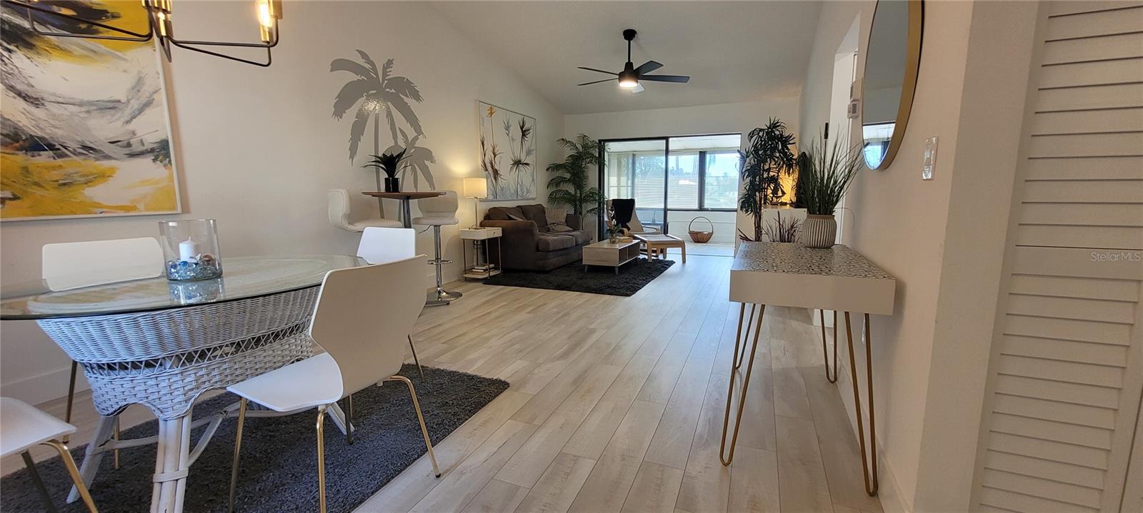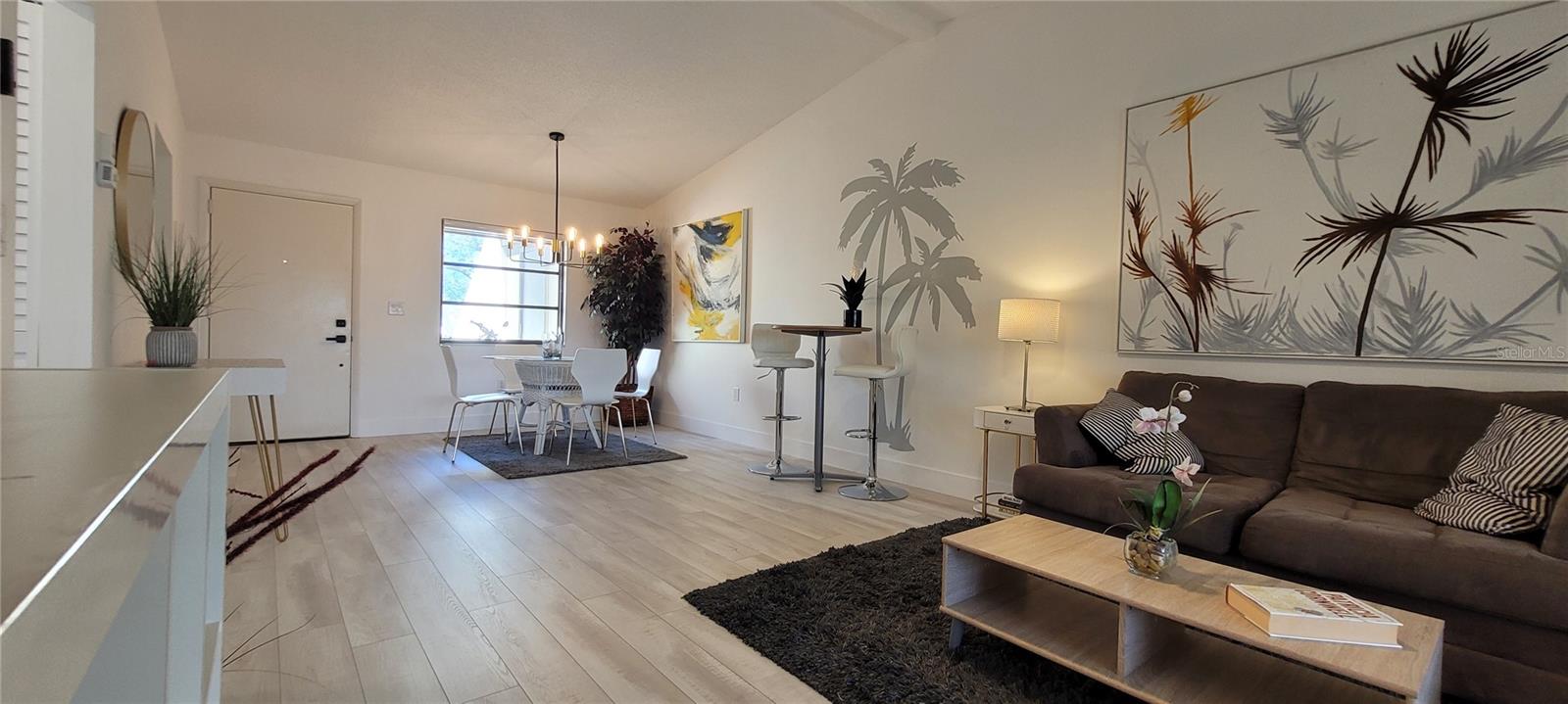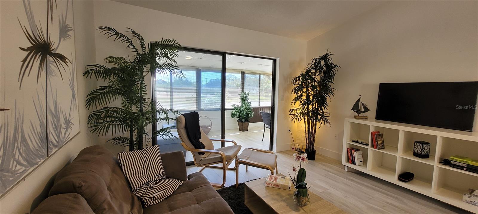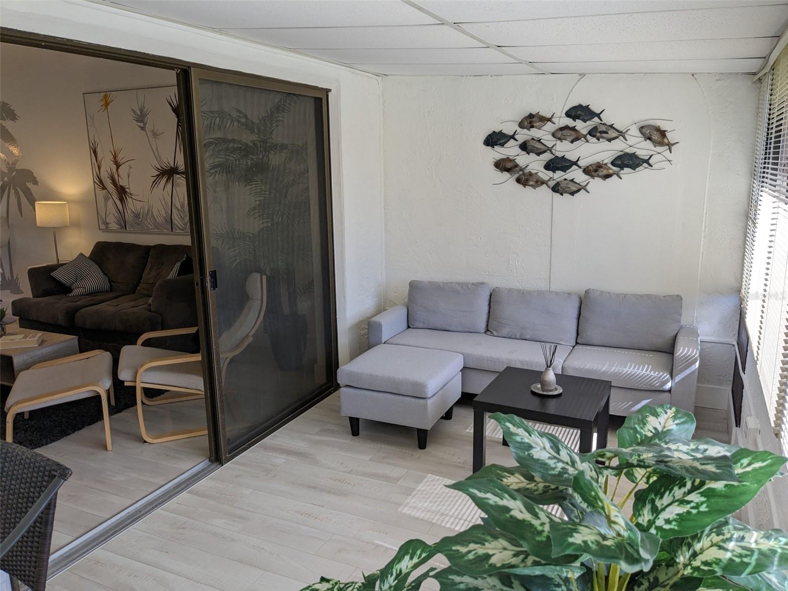 Welcome to this beautifully landscaped 55+ community. Move in ready home, remodeled in 2024 new kitchen, new stainless steel appliances with low profile range, a new stainless hood and new undermount kitchen sink, high-end quartz countertops with a ceramic backsplash. New led lighting throughout the home, new luxury vinyl plank flooring and base moldings throughout the home. Spacious vaulted ceilings in the dining and living rooms. Large bedroom with lots of closet space. Large double glass patio sliders from living room to the air conditioned and window enclosed large lanai. More bonuses, it is a south facing property with lots of bright sunlight and full privacy with no properties straight across from you looking in. Dedicated private covered parking spot also included. Community amenities include pool, ponds, fountain, tennis and pickleball courts, shuffleboard courts, a library, and a card room, ensuring there's always something to enjoy and all close to restaurants, beaches and amenities.