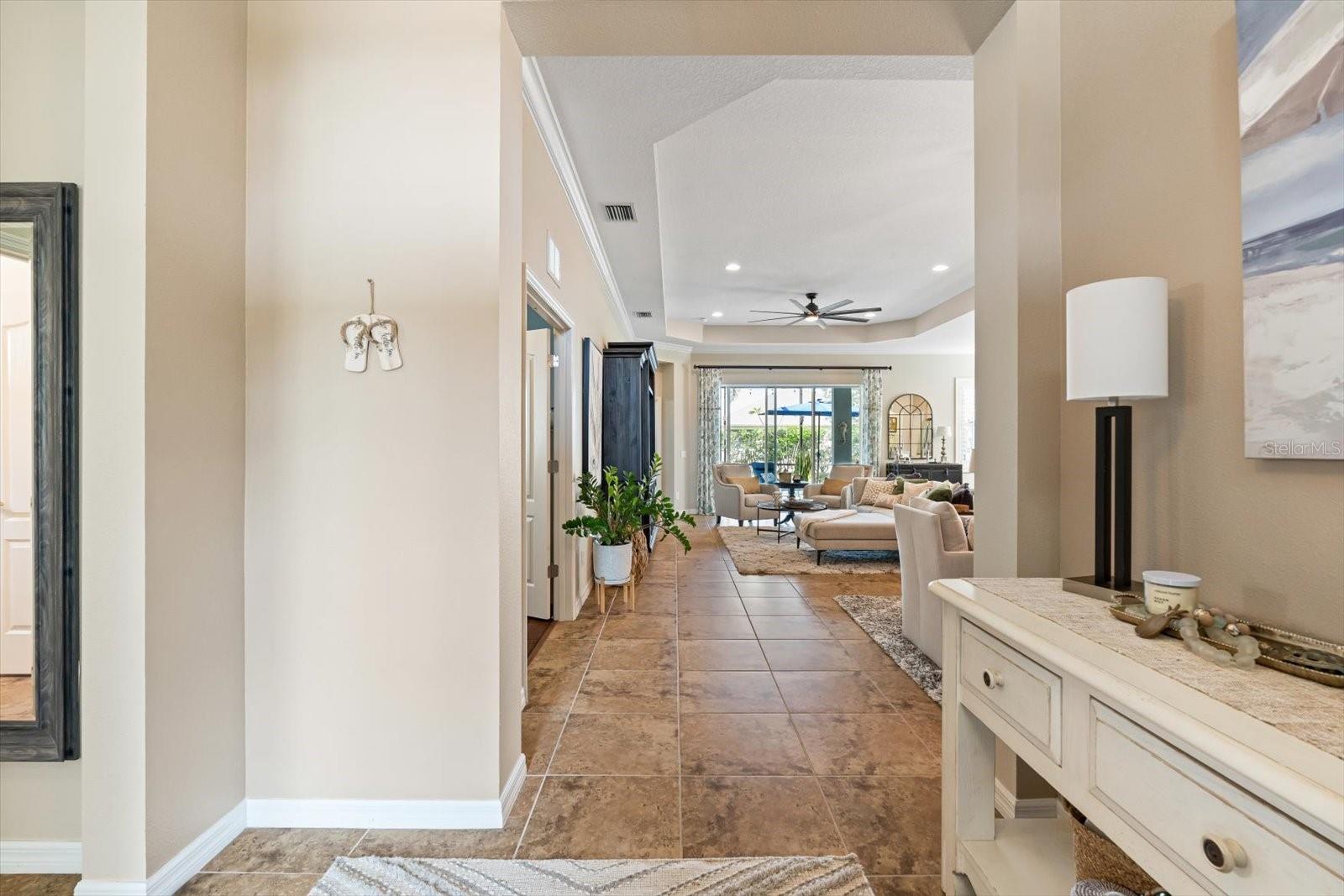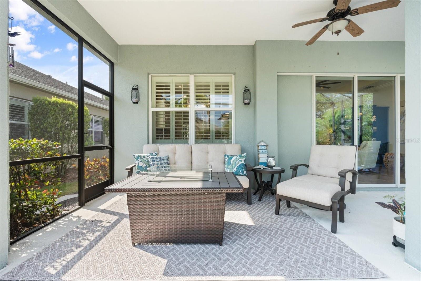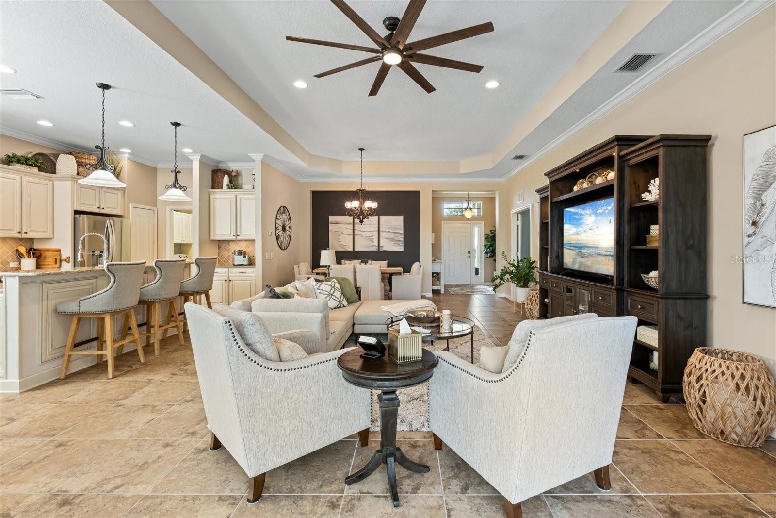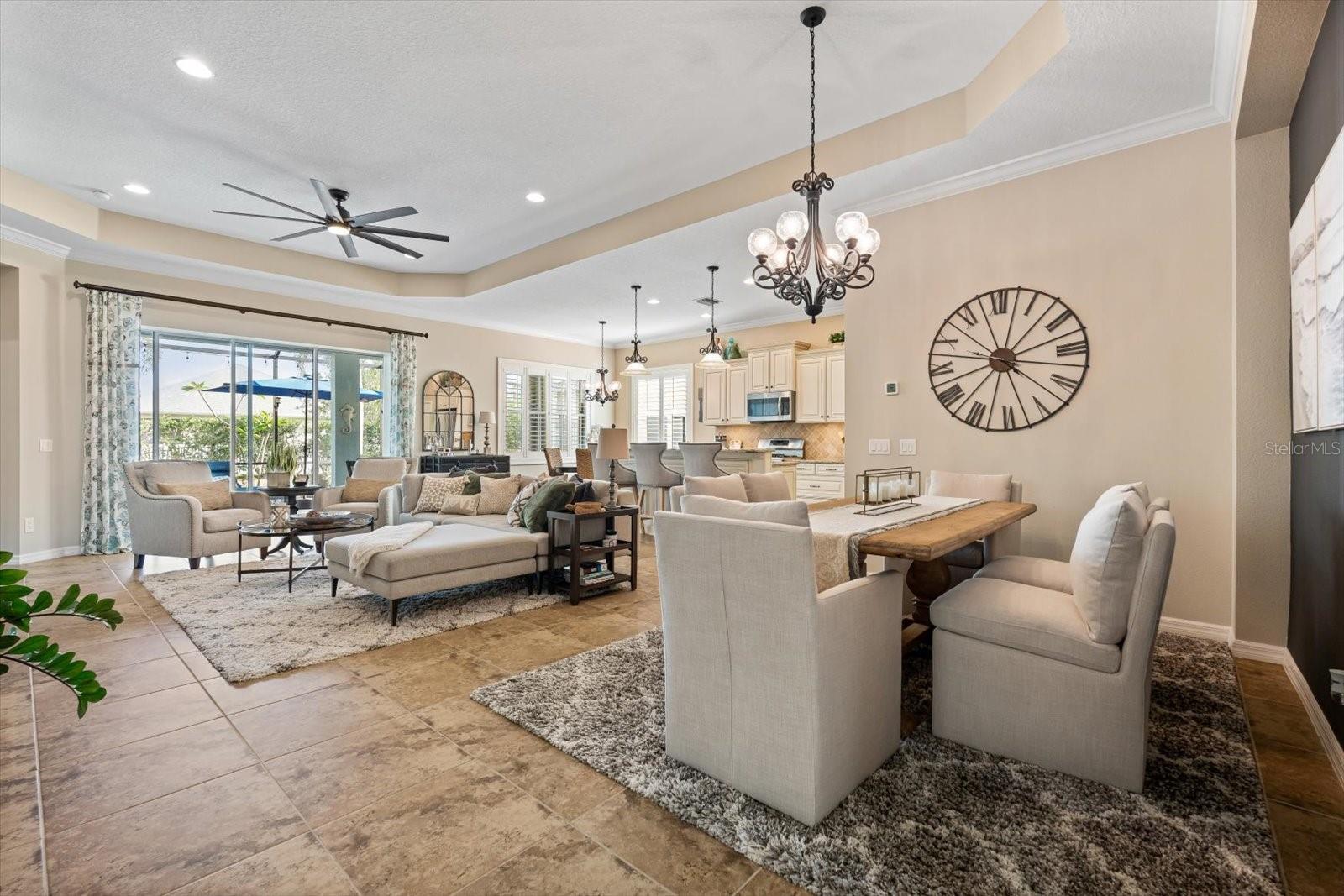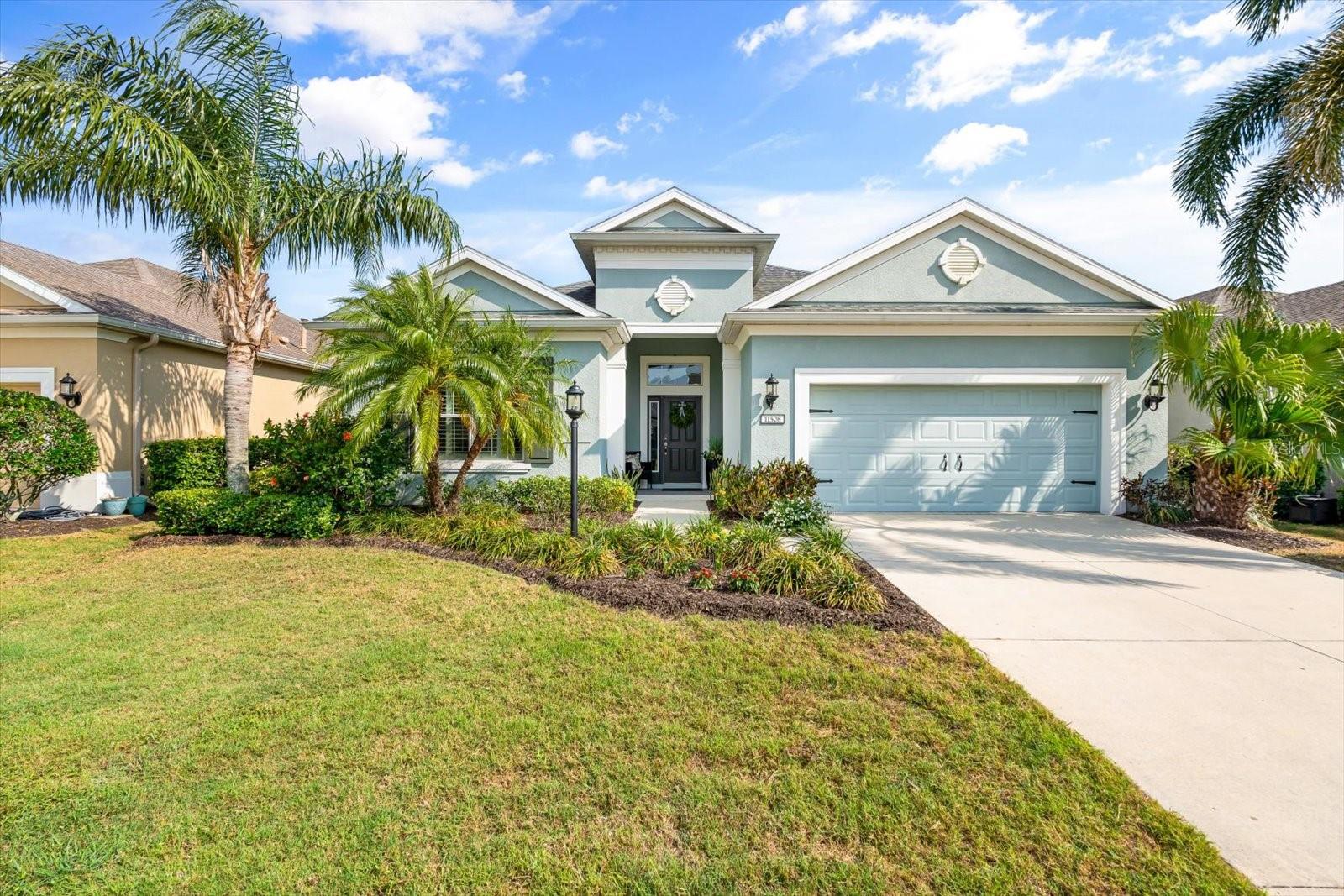 Step into refined comfort with this beautifully designed 2-bedroom, 2-bath residence, where every detail exudes sophistication. The open-concept living, dining, and kitchen area creates an inviting space ideal for both relaxing and entertaining, enhanced by crown molding and a striking coffered ceiling that adds architectural elegance. The kitchen is a chef’s dream, featuring upgraded cabinetry, granite countertops, a convenient coffee bar, and a charming breakfast nook perfect for morning gatherings. A dedicated laundry room just off the kitchen adds everyday convenience. The primary suite offers a serene retreat, complete with a luxurious custom walk-in closet, a spa-inspired en-suite bath with dual vanities, and a spacious walk-in shower with ample space for a dedicated make-up vanity. A versatile den provides the flexibility to serve as a third bedroom, home office, or creative studio, accommodating a variety of lifestyles with ease. Step outside to an extended screened-in lanai—perfect for enjoying quiet mornings, alfresco dining, or entertaining guests in a peaceful, shaded outdoor setting. Nestled in a well-appointed community, residents also enjoy access to exceptional amenities including a sparkling pool and spa, well equipped fitness center, tennis court, pickleball courts, two dog parks, play ground and soccer field. Conveniently located near Lakewood Ranch Medical Center, LECOM, Costco, and an array of shopping and dining options, this home offers not only timeless elegance and modern comfort but also everyday accessibility to the best of the area.