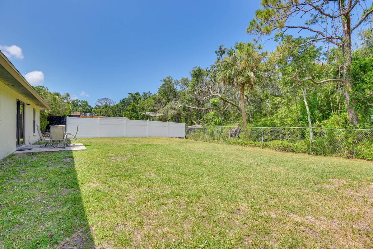This well-maintained home is currently being used as a vacation rental and is in excellent condition. The roof is new this year in 2025, A/C unit new in 2024, and the range and refrigerator were new in 2023. The bedrooms have newer wood laminate flooring installed in 2023 and ceramic tile throughout the remaining living areas. The home has a split plan with 3 bedrooms and 2 bathrooms. The utility area has been enclosed and separate from the garage. The yard has a combination of vinyl privacy fencing and chain link backing up to a green space with no rear neighbors. The neighborhood is well established and conveniently located. There is an area fenced off in the back to park a boat, trailer, or RV. This home would be great for a family, retiree, or another investor looking to continue renting short or long term.