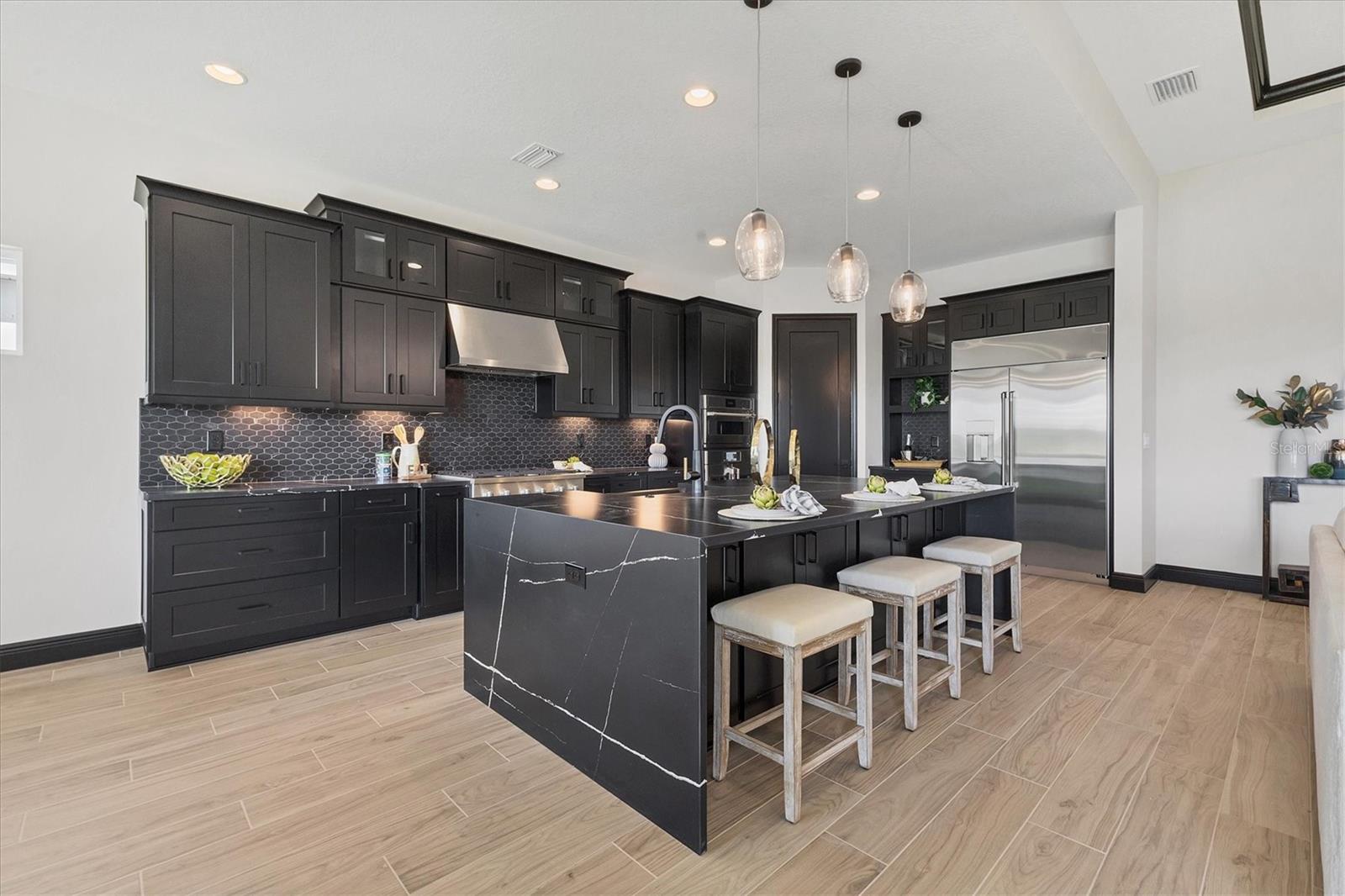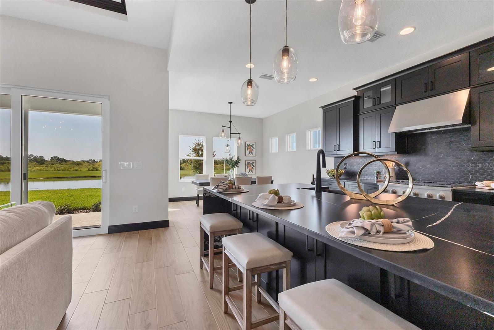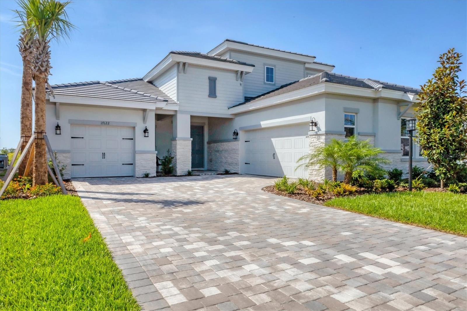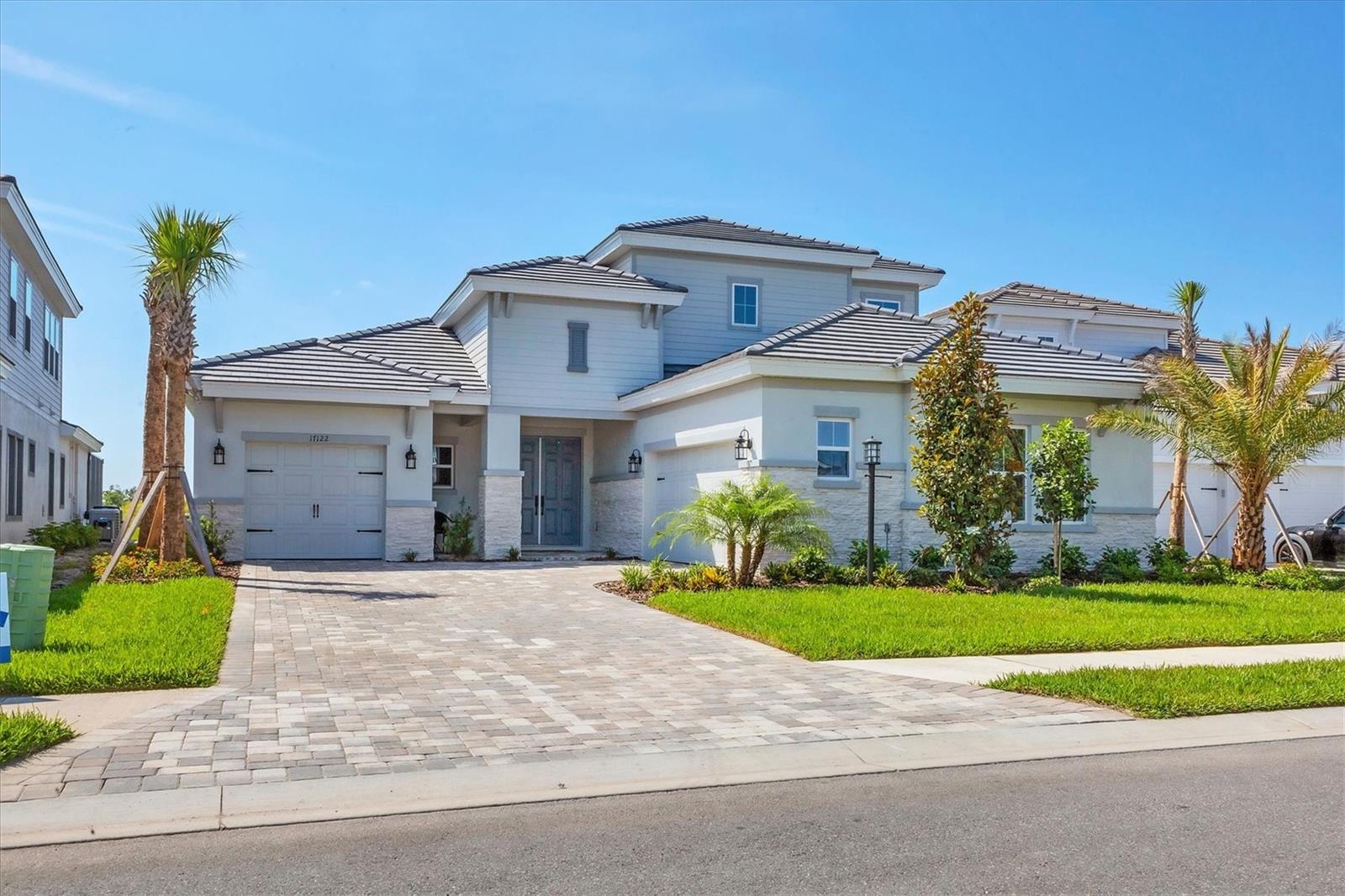 Welcome to this never-lived-in WestBay Siesta Key II model, offering over 3,700 square feet of refined living space on a quiet cul-de-sac, just a short distance from The Resort Club in Star Farms at Lakewood Ranch. This stunning two-story residence blends thoughtful design with elevated finishes, creating a balance of comfort and sophistication. Why wait to build when you can move in tomorrow? A grand double-door entry opens into a light-filled, open-concept layout with soaring 12-foot ceilings extending from the foyer through the main living areas. The spacious great room, dining space and kitchen flow seamlessly, making this home ideal for everyday living and effortless entertaining. At the heart of the home, the gourmet kitchen showcases a large waterfall-edge quartz island, GE Café appliances, Kohler apron-front farmhouse sink, walk-in pantry, glass upper cabinets and illuminated floating shelves, offering a chef-inspired environment with designer flair. The home offers four well-appointed bedrooms, each with a walk-in closet, and four full baths plus a powder bath. The expansive primary suite features a tray ceiling, additional sound insulation for peaceful relaxation, a spa-like en suite with a freestanding soaking tub, frameless glass shower with rain shower head and handheld nozzle, dual vanities and a generous walk-in closet. A large den with glass French doors provides a flexible space for a home office, library or playroom, while the oversized upstairs bonus room is pre-wired and pre-plumbed for a wet bar, fifth bedroom and guest bath, ideal for hosting guests, creating a media room or setting up a multi-generational living area. Throughout the first floor, you’ll find elegant Sandstone Beige wood-look porcelain tile, while the second floor features durable luxury vinyl for style and ease of maintenance. High-end details such as solid core doors, crown moldings, custom baseboards and thoughtful trim work elevate the entire home. A spacious laundry room with abundant cabinetry and a utility sink offers added convenience. The split three-car garage provides ample storage and functionality, while the covered lanai invites outdoor living with enough space to accommodate a custom pool. In the vibrant Star Farms community, this home comes with access to a wide array of resort-style amenities. The Resort Club features a zero-entry pool and spa, fitness center, coffee shop and private cabanas. The StarFit Fitness Center offers group classes, cardio equipment and strength training. Future amenities include a poolside bar and grill, event center and Junction Place—a family-focused complex with a baseball field, tennis courts, pickleball, basketball, sand volleyball, another resort pool and splashpad, and a pet park. Lifestyle conveniences also include concierge and hospitality services, community clubs and three planned dining venues. Enjoy the best of Lakewood Ranch living, with top-rated schools, Lakewood Ranch Medical Center, Sarasota Polo Club, 140-acre Premier Sports Campus and three town centers offering theaters, shopping and dining just minutes away. This is more than a home, it's a complete lifestyle.