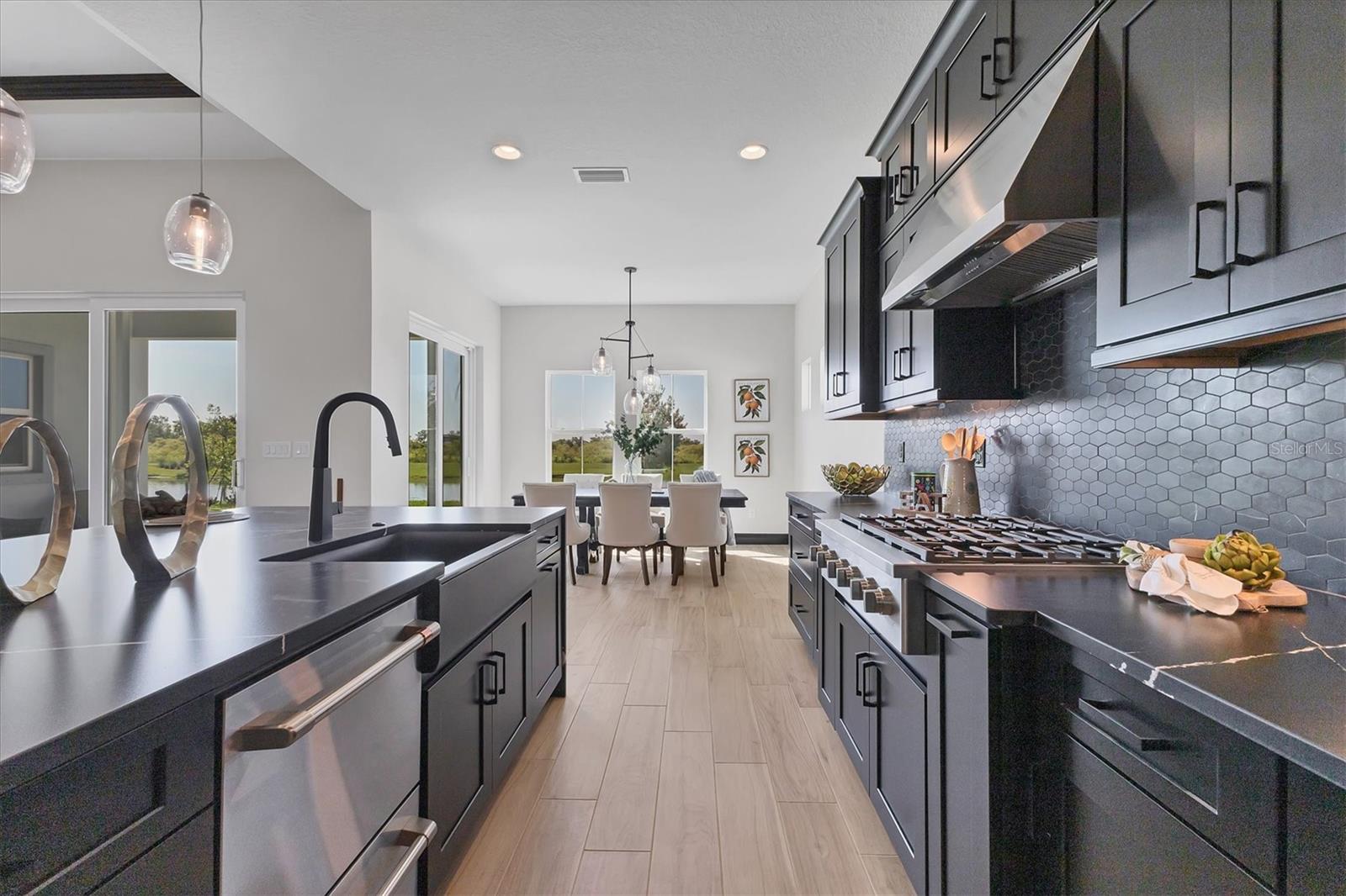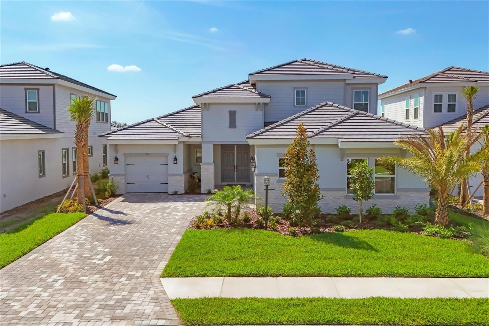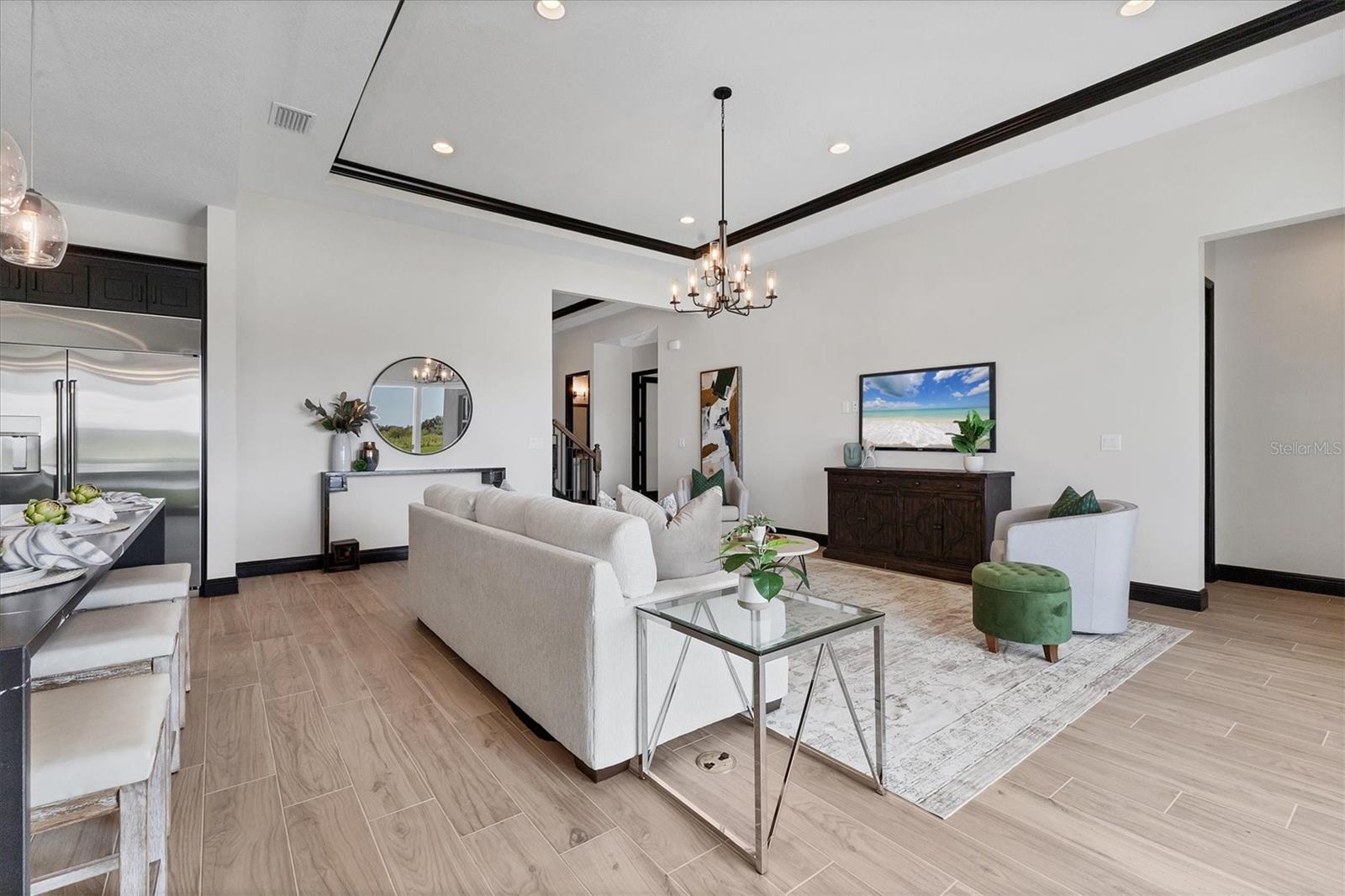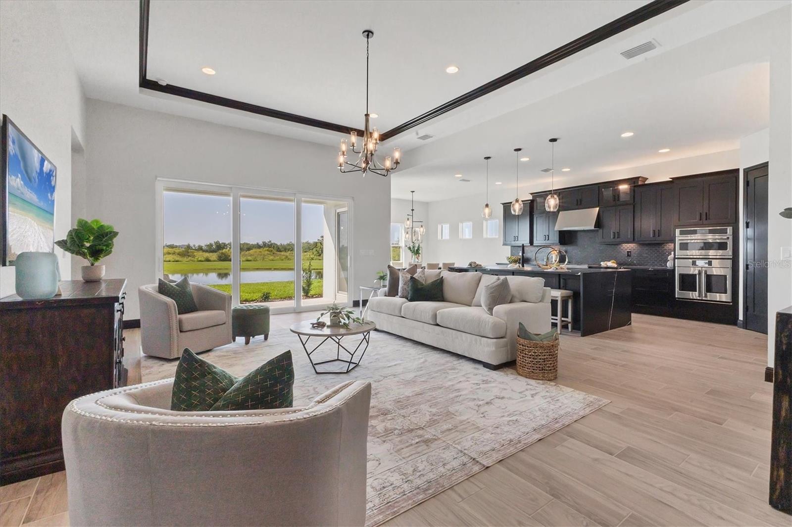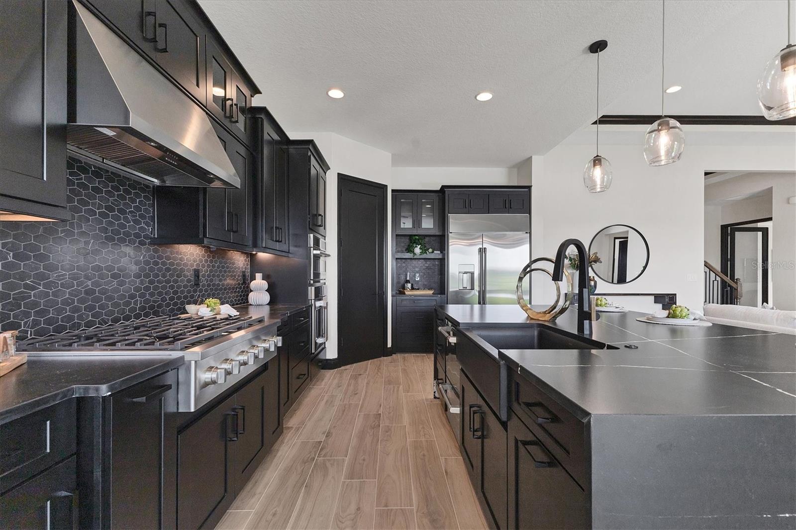 Welcome to this never-lived-in WestBay Siesta Key II model, offering over 3,700 square feet of refined living space on a quiet cul-de-sac, just a short distance from The Resort Club in Star Farms at Lakewood Ranch. This stunning two-story residence blends thoughtful design with elevated finishes, creating a balance of comfort and sophistication. Why wait to build when you can move in tomorrow? A grand double-door entry opens into a light-filled, open-concept layout with soaring 12-foot ceilings extending from the foyer through the main living areas. The spacious great room, dining space and kitchen flow seamlessly, making this home ideal for everyday living and effortless entertaining. At the heart of the home, the gourmet kitchen showcases a large waterfall-edge quartz island, GE Café appliances, Kohler apron-front farmhouse sink, walk-in pantry, glass upper cabinets and illuminated floating shelves, offering a chef-inspired environment with designer flair. The home offers four well-appointed bedrooms, each with a walk-in closet, and four full baths plus a powder bath. The expansive primary suite features a tray ceiling, additional sound insulation for peaceful relaxation, a spa-like en suite with a freestanding soaking tub, frameless glass shower with rain shower head and handheld nozzle, dual vanities and a generous walk-in closet. A large den with glass French doors provides a flexible space for a home office, library or playroom, while the oversized upstairs bonus room is pre-wired and pre-plumbed for a wet bar, fifth bedroom and guest bath, ideal for hosting guests, creating a media room or setting up a multi-generational living area. Throughout the first floor, you’ll find elegant Sandstone Beige wood-look porcelain tile, while the second floor features durable luxury vinyl for style and ease of maintenance. High-end details such as solid core doors, crown moldings, custom baseboards and thoughtful trim work elevate the entire home. A spacious laundry room with abundant cabinetry and a utility sink offers added convenience. The split three-car garage provides ample storage and functionality, while the covered lanai invites outdoor living with enough space to accommodate a custom pool. In the vibrant Star Farms community, this home comes with access to a wide array of resort-style amenities. The Resort Club features a zero-entry pool and spa, fitness center, coffee shop and private cabanas. The StarFit Fitness Center offers group classes, cardio equipment and strength training. Future amenities include a poolside bar and grill, event center and Junction Place—a family-focused complex with a baseball field, tennis courts, pickleball, basketball, sand volleyball, another resort pool and splashpad, and a pet park. Lifestyle conveniences also include concierge and hospitality services, community clubs and three planned dining venues. Enjoy the best of Lakewood Ranch living, with top-rated schools, Lakewood Ranch Medical Center, Sarasota Polo Club, 140-acre Premier Sports Campus and three town centers offering theaters, shopping and dining just minutes away. This is more than a home, it's a complete lifestyle.