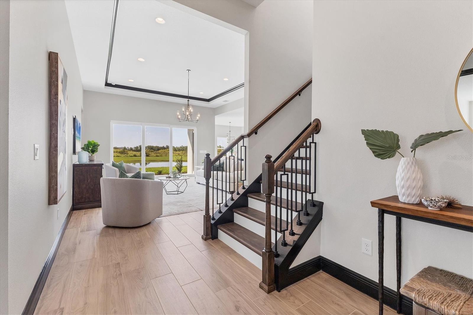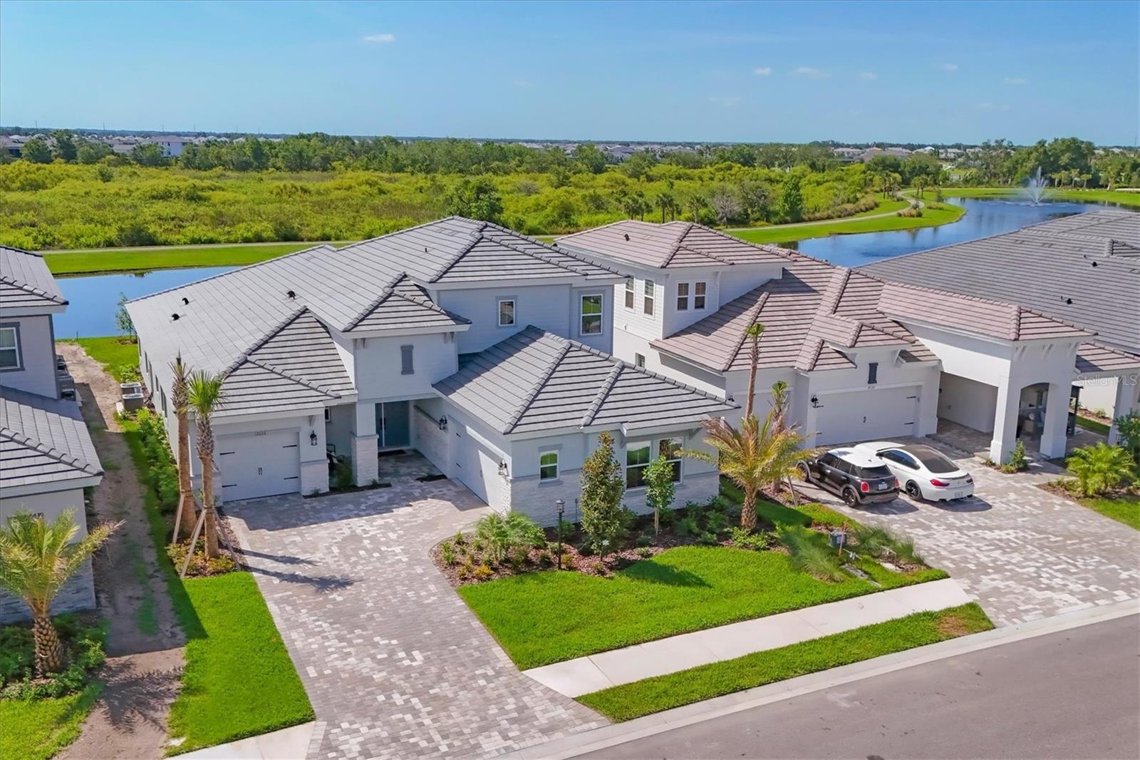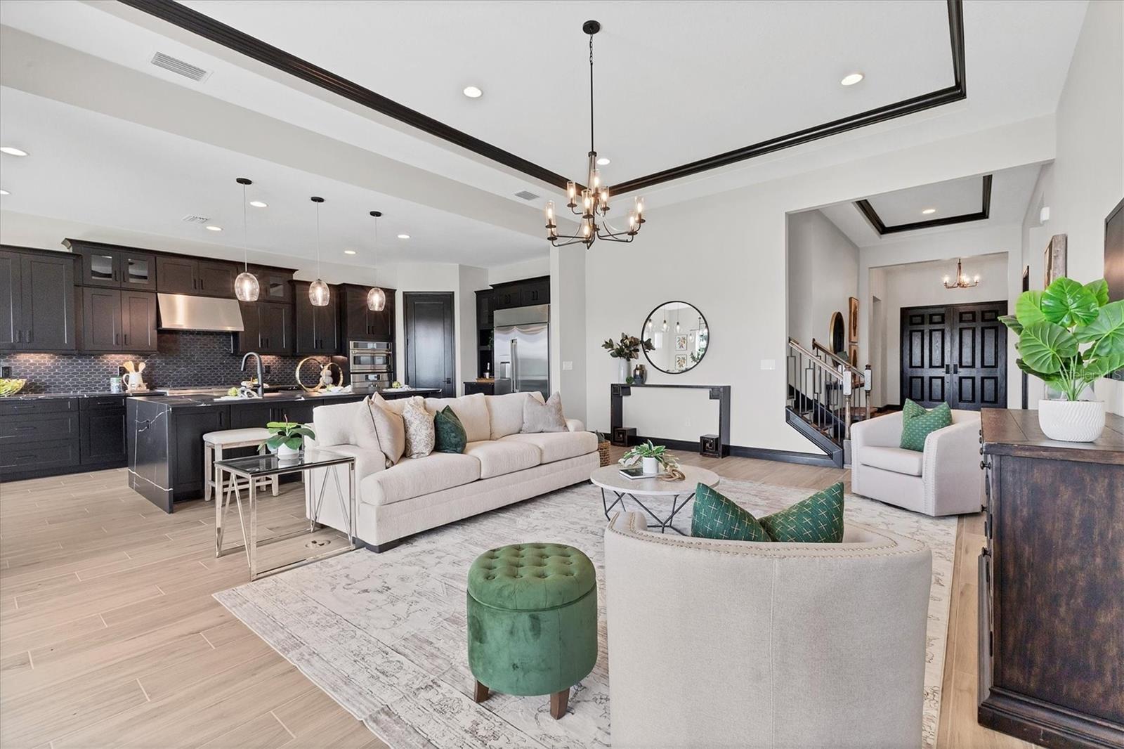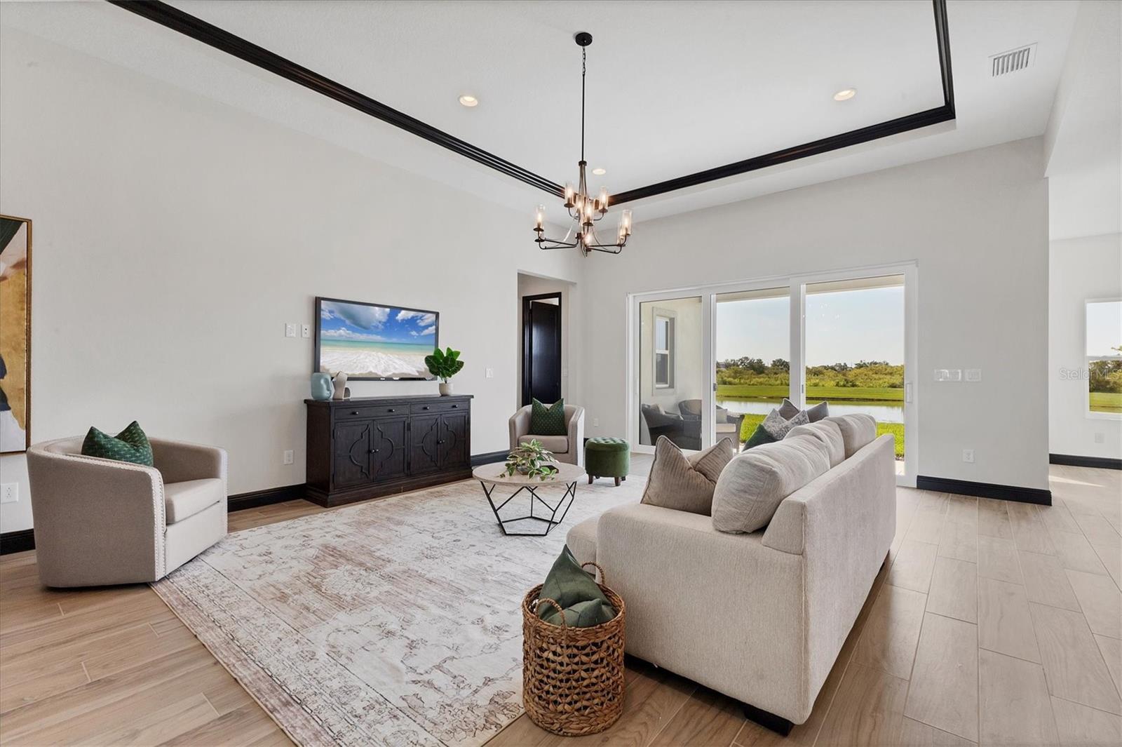 Welcome to this never-lived-in WestBay Siesta Key II model, offering over 3,700 square feet of refined living space on a quiet cul-de-sac, just a short distance from The Resort Club in Star Farms at Lakewood Ranch. This stunning two-story residence blends thoughtful design with elevated finishes, creating a balance of comfort and sophistication. Why wait to build when you can move in tomorrow? A grand double-door entry opens into a light-filled, open-concept layout with soaring 12-foot ceilings extending from the foyer through the main living areas. The spacious great room, dining space and kitchen flow seamlessly, making this home ideal for everyday living and effortless entertaining. At the heart of the home, the gourmet kitchen showcases a large waterfall-edge quartz island, GE Café appliances, Kohler apron-front farmhouse sink, walk-in pantry, glass upper cabinets and illuminated floating shelves, offering a chef-inspired environment with designer flair. The home offers four well-appointed bedrooms, each with a walk-in closet, and four full baths plus a powder bath. The expansive primary suite features a tray ceiling, additional sound insulation for peaceful relaxation, a spa-like en suite with a freestanding soaking tub, frameless glass shower with rain shower head and handheld nozzle, dual vanities and a generous walk-in closet. A large den with glass French doors provides a flexible space for a home office, library or playroom, while the oversized upstairs bonus room is pre-wired and pre-plumbed for a wet bar, fifth bedroom and guest bath, ideal for hosting guests, creating a media room or setting up a multi-generational living area. Throughout the first floor, you’ll find elegant Sandstone Beige wood-look porcelain tile, while the second floor features durable luxury vinyl for style and ease of maintenance. High-end details such as solid core doors, crown moldings, custom baseboards and thoughtful trim work elevate the entire home. A spacious laundry room with abundant cabinetry and a utility sink offers added convenience. The split three-car garage provides ample storage and functionality, while the covered lanai invites outdoor living with enough space to accommodate a custom pool. In the vibrant Star Farms community, this home comes with access to a wide array of resort-style amenities. The Resort Club features a zero-entry pool and spa, fitness center, coffee shop and private cabanas. The StarFit Fitness Center offers group classes, cardio equipment and strength training. Future amenities include a poolside bar and grill, event center and Junction Place—a family-focused complex with a baseball field, tennis courts, pickleball, basketball, sand volleyball, another resort pool and splashpad, and a pet park. Lifestyle conveniences also include concierge and hospitality services, community clubs and three planned dining venues. Enjoy the best of Lakewood Ranch living, with top-rated schools, Lakewood Ranch Medical Center, Sarasota Polo Club, 140-acre Premier Sports Campus and three town centers offering theaters, shopping and dining just minutes away. This is more than a home, it's a complete lifestyle.