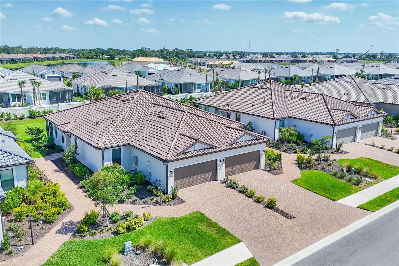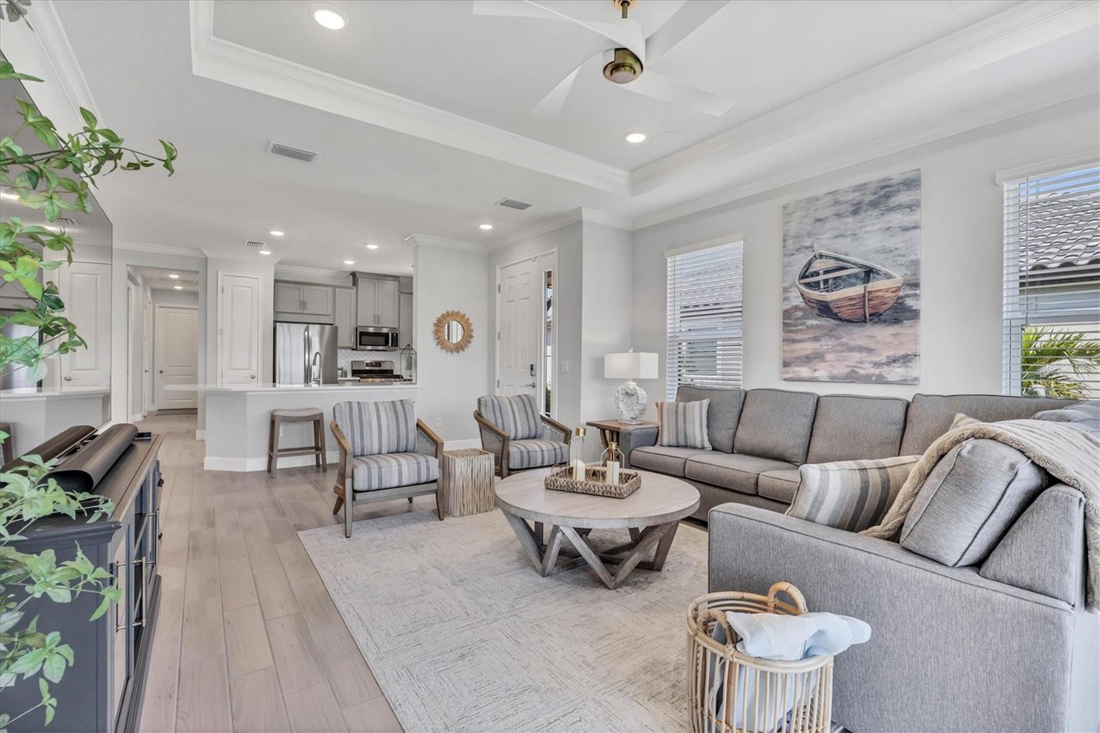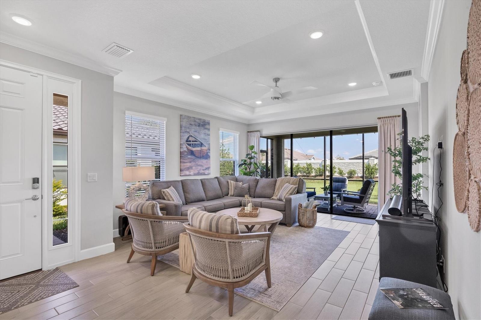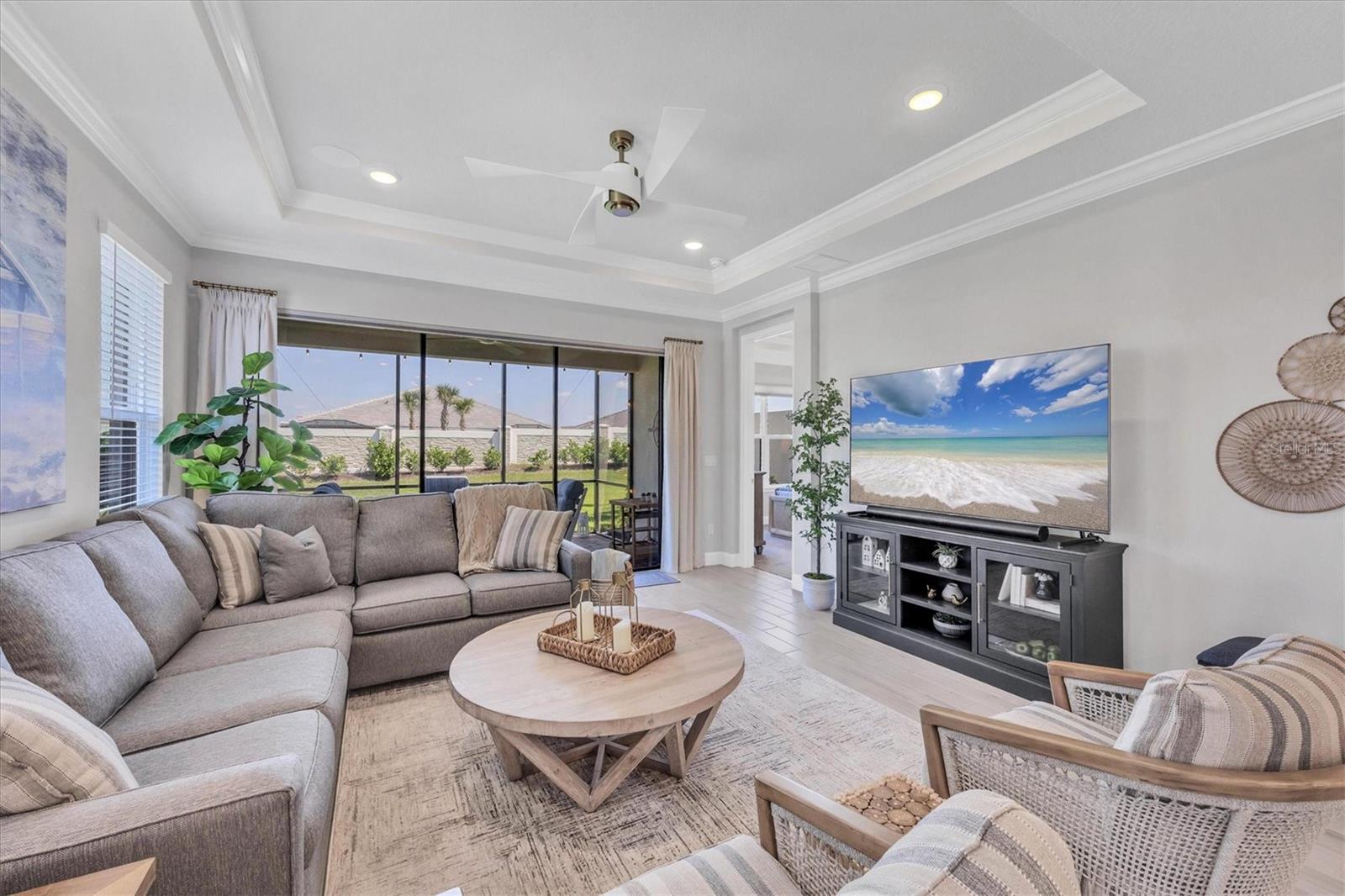 Impeccably upgraded, ideally sized 2 bedroom/2 bathroom plus office home in vibrant Azario for those seeking upscale ambiance, resort amenities and minimal maintenance in a country club setting. The Ibis open-concept floor plan has a centrally located kitchen that opens effortlessly to the great room and dining room. Countertops showcase polished quartz, solid wood gray cabinetry, under-cabinet lighting and externally vented range hood. An elegant primary suite has an oversized walk-in closet, dual-sink vanity, shower stall and water closet. At front of the home is a private guest suite with attached bath and a versatile den/office/flex space with pocket doors. Thoughtfully accentuated with tray ceilings, crown molding, 8-foot doorways, upgraded lighting package and designer fixtures. Motorized blinds provide sun control and privacy across great room's triple sliders and owner's bedroom suite windows. Extended screened lanai offers breezy landscaped views. Large laundry room with upper/lower cabinetry, utility sink, smart home technology, surround sound and epoxy-coated two-car garage. Azario offers 18-hole golf course, aqua driving range, heated beach-entry pool with cabanas, hot tub, state-of-the-art fitness center and classes. The Venue has billiards, ping-pong, cards and clubs. Full service poolside tiki bar, culinary center with cafe, fine dining, upscale lounge, patio eats, cafe, teaching kitchen and wine tastings.