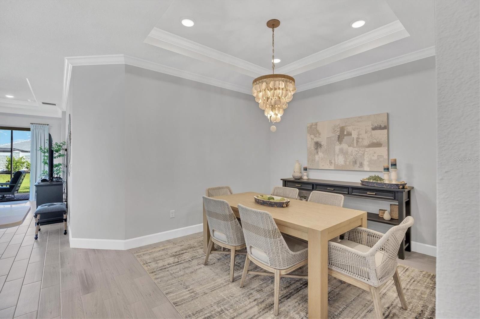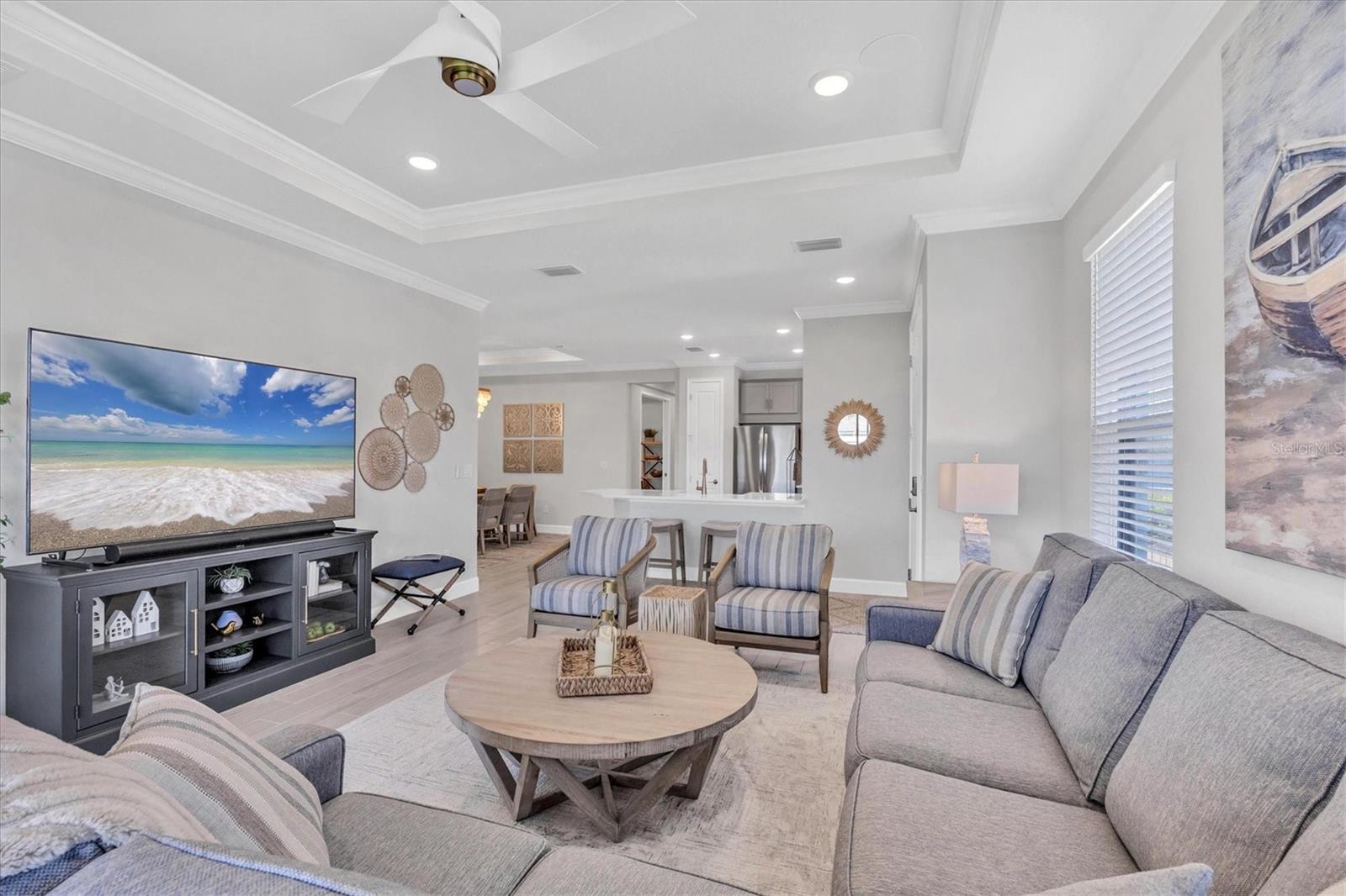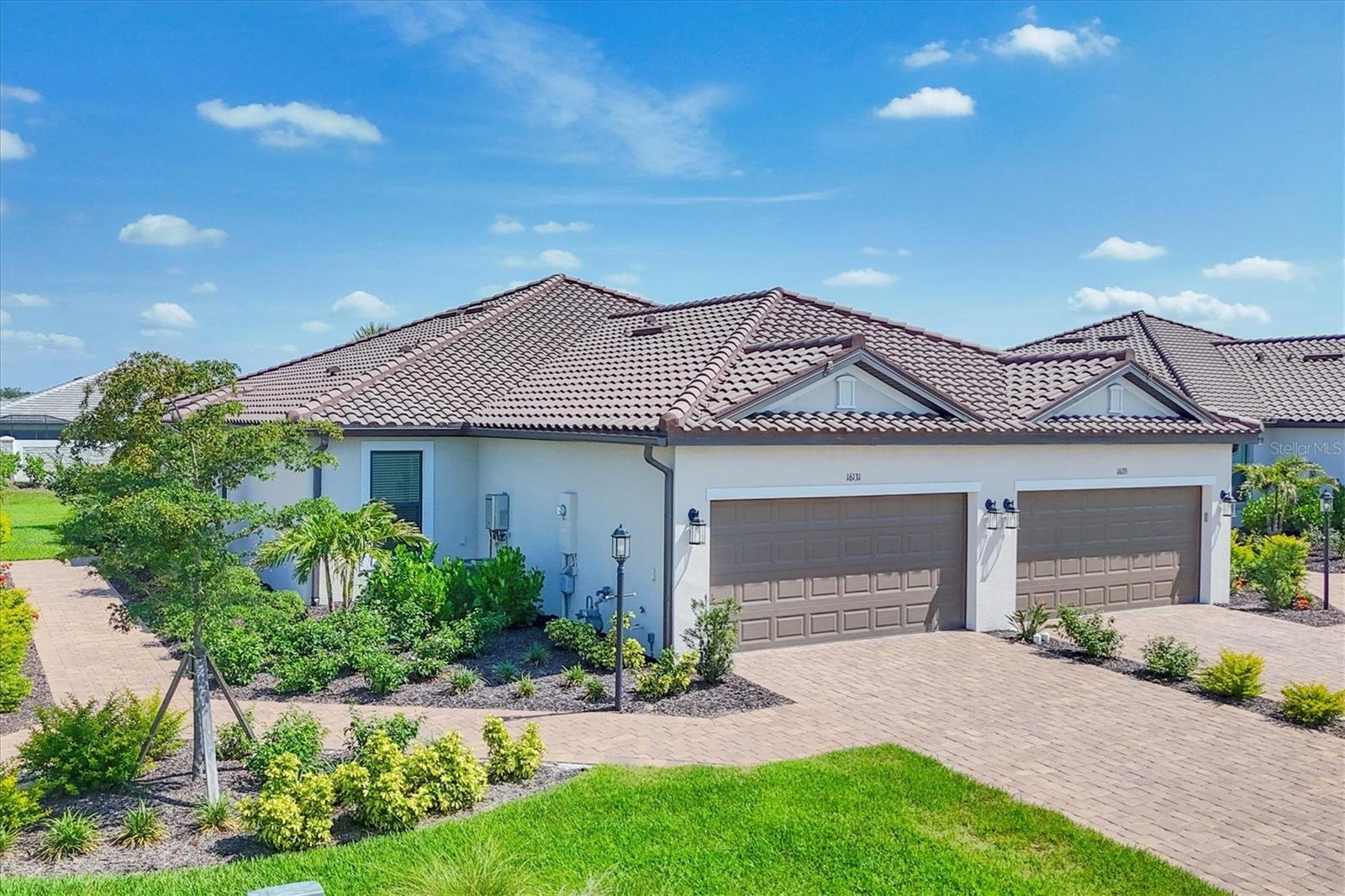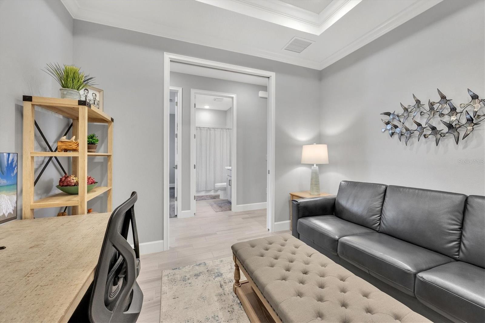 Impeccably upgraded, ideally sized 2 bedroom/2 bathroom plus office home in vibrant Azario for those seeking upscale ambiance, resort amenities and minimal maintenance in a country club setting. The Ibis open-concept floor plan has a centrally located kitchen that opens effortlessly to the great room and dining room. Countertops showcase polished quartz, solid wood gray cabinetry, under-cabinet lighting and externally vented range hood. An elegant primary suite has an oversized walk-in closet, dual-sink vanity, shower stall and water closet. At front of the home is a private guest suite with attached bath and a versatile den/office/flex space with pocket doors. Thoughtfully accentuated with tray ceilings, crown molding, 8-foot doorways, upgraded lighting package and designer fixtures. Motorized blinds provide sun control and privacy across great room's triple sliders and owner's bedroom suite windows. Extended screened lanai offers breezy landscaped views. Large laundry room with upper/lower cabinetry, utility sink, smart home technology, surround sound and epoxy-coated two-car garage. Azario offers 18-hole golf course, aqua driving range, heated beach-entry pool with cabanas, hot tub, state-of-the-art fitness center and classes. The Venue has billiards, ping-pong, cards and clubs. Full service poolside tiki bar, culinary center with cafe, fine dining, upscale lounge, patio eats, cafe, teaching kitchen and wine tastings.