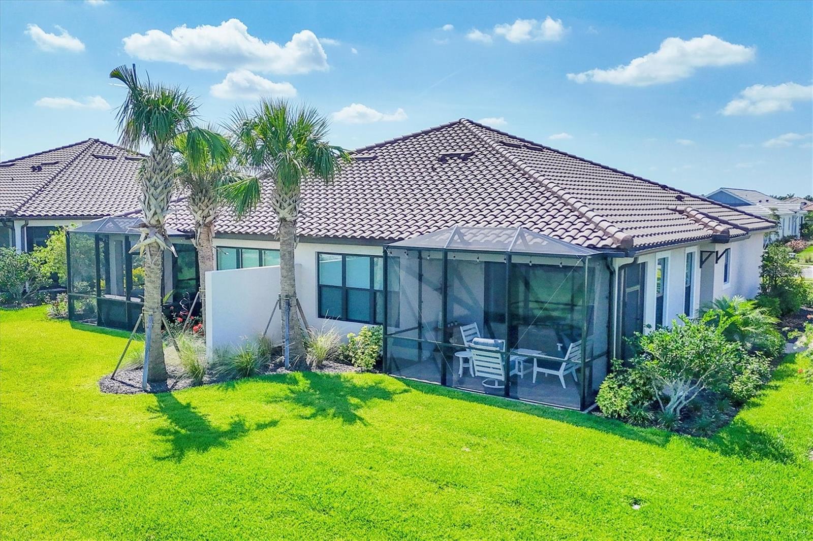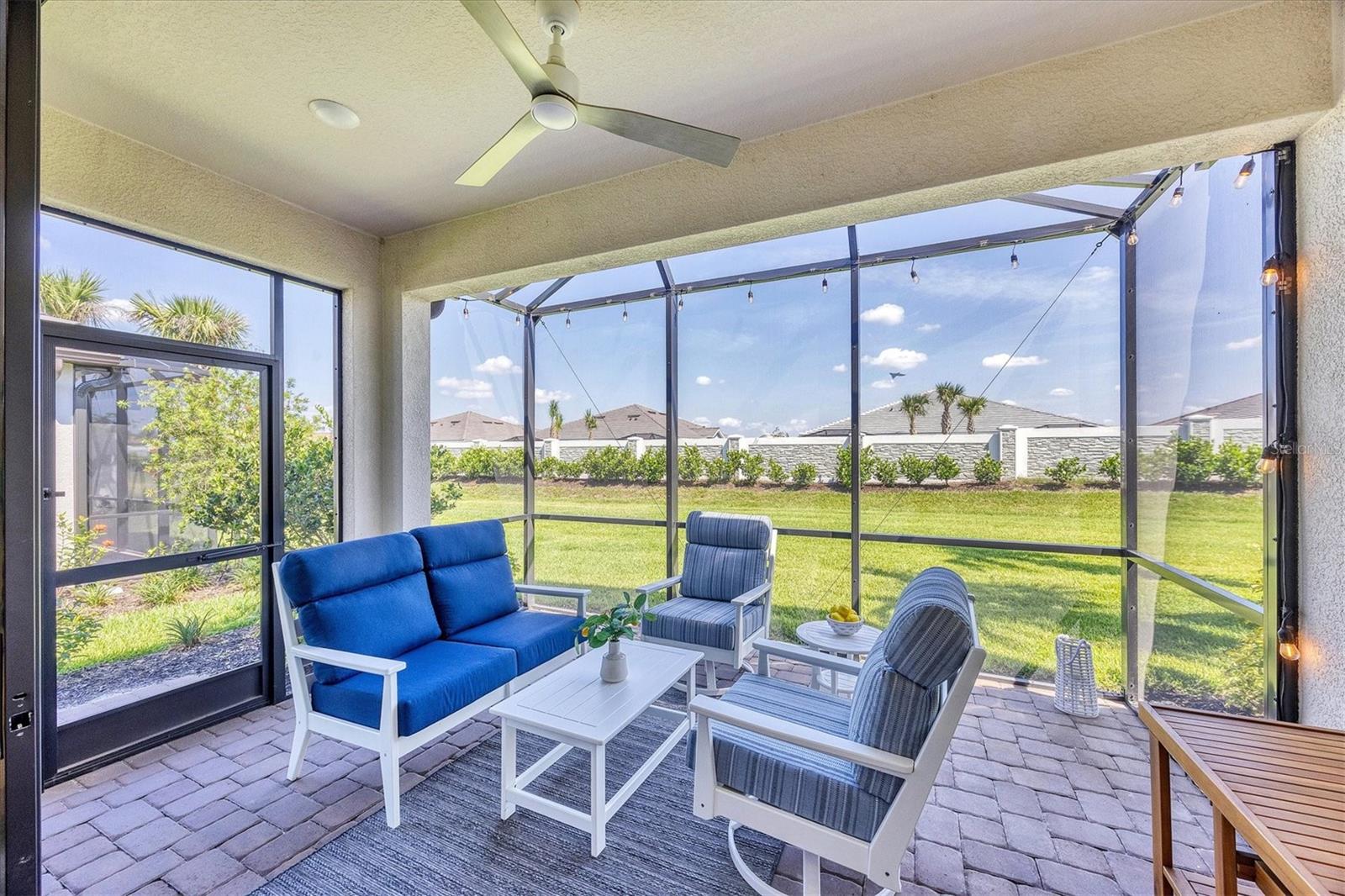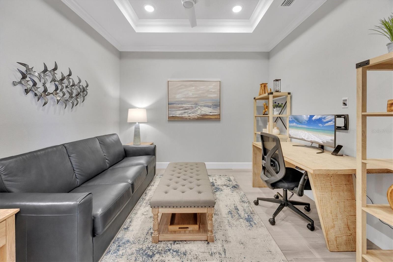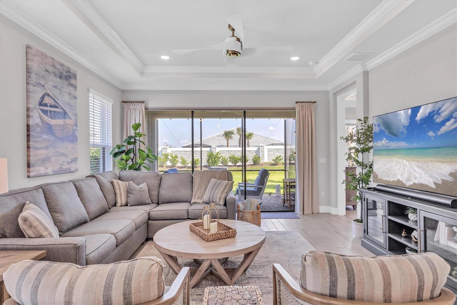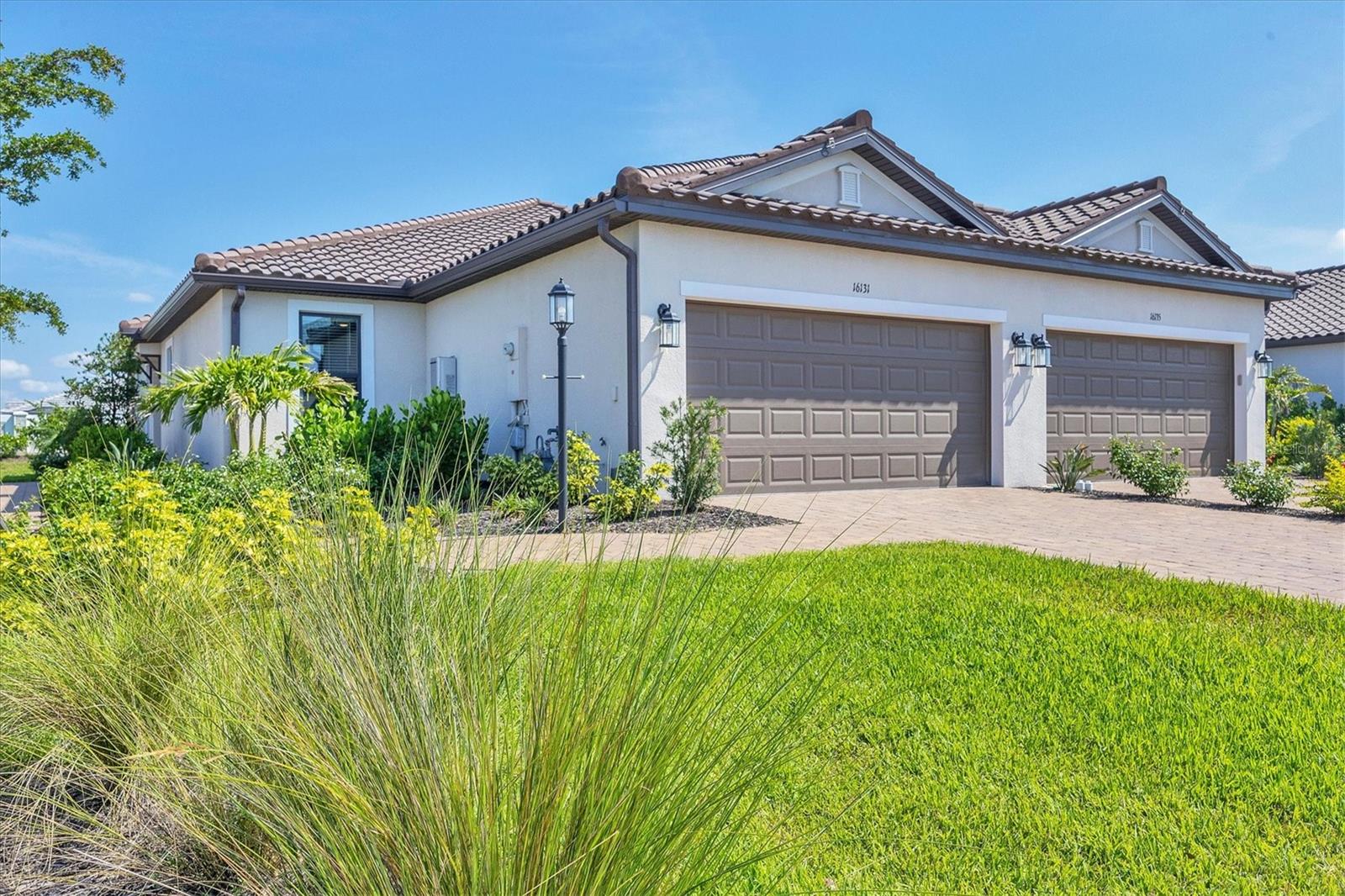 Impeccably upgraded, ideally sized 2 bedroom/2 bathroom plus office home in vibrant Azario for those seeking upscale ambiance, resort amenities and minimal maintenance in a country club setting. The Ibis open-concept floor plan has a centrally located kitchen that opens effortlessly to the great room and dining room. Countertops showcase polished quartz, solid wood gray cabinetry, under-cabinet lighting and externally vented range hood. An elegant primary suite has an oversized walk-in closet, dual-sink vanity, shower stall and water closet. At front of the home is a private guest suite with attached bath and a versatile den/office/flex space with pocket doors. Thoughtfully accentuated with tray ceilings, crown molding, 8-foot doorways, upgraded lighting package and designer fixtures. Motorized blinds provide sun control and privacy across great room's triple sliders and owner's bedroom suite windows. Extended screened lanai offers breezy landscaped views. Large laundry room with upper/lower cabinetry, utility sink, smart home technology, surround sound and epoxy-coated two-car garage. Azario offers 18-hole golf course, aqua driving range, heated beach-entry pool with cabanas, hot tub, state-of-the-art fitness center and classes. The Venue has billiards, ping-pong, cards and clubs. Full service poolside tiki bar, culinary center with cafe, fine dining, upscale lounge, patio eats, cafe, teaching kitchen and wine tastings.