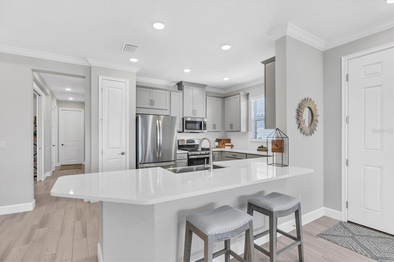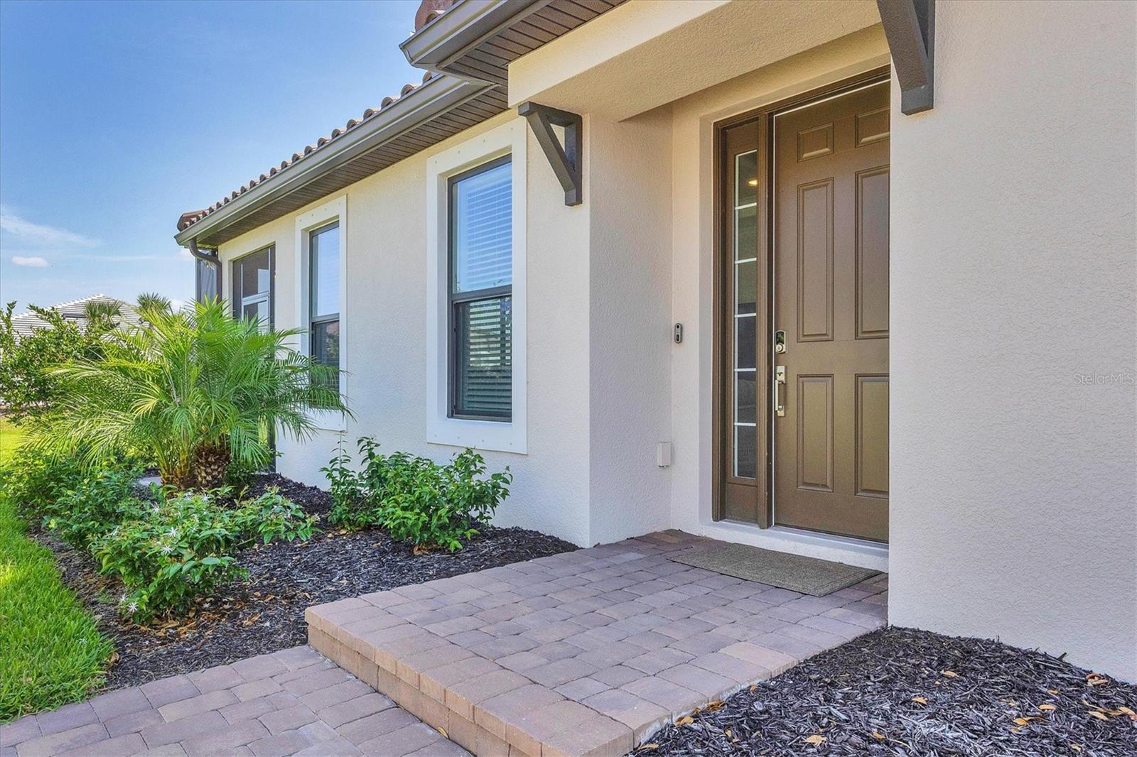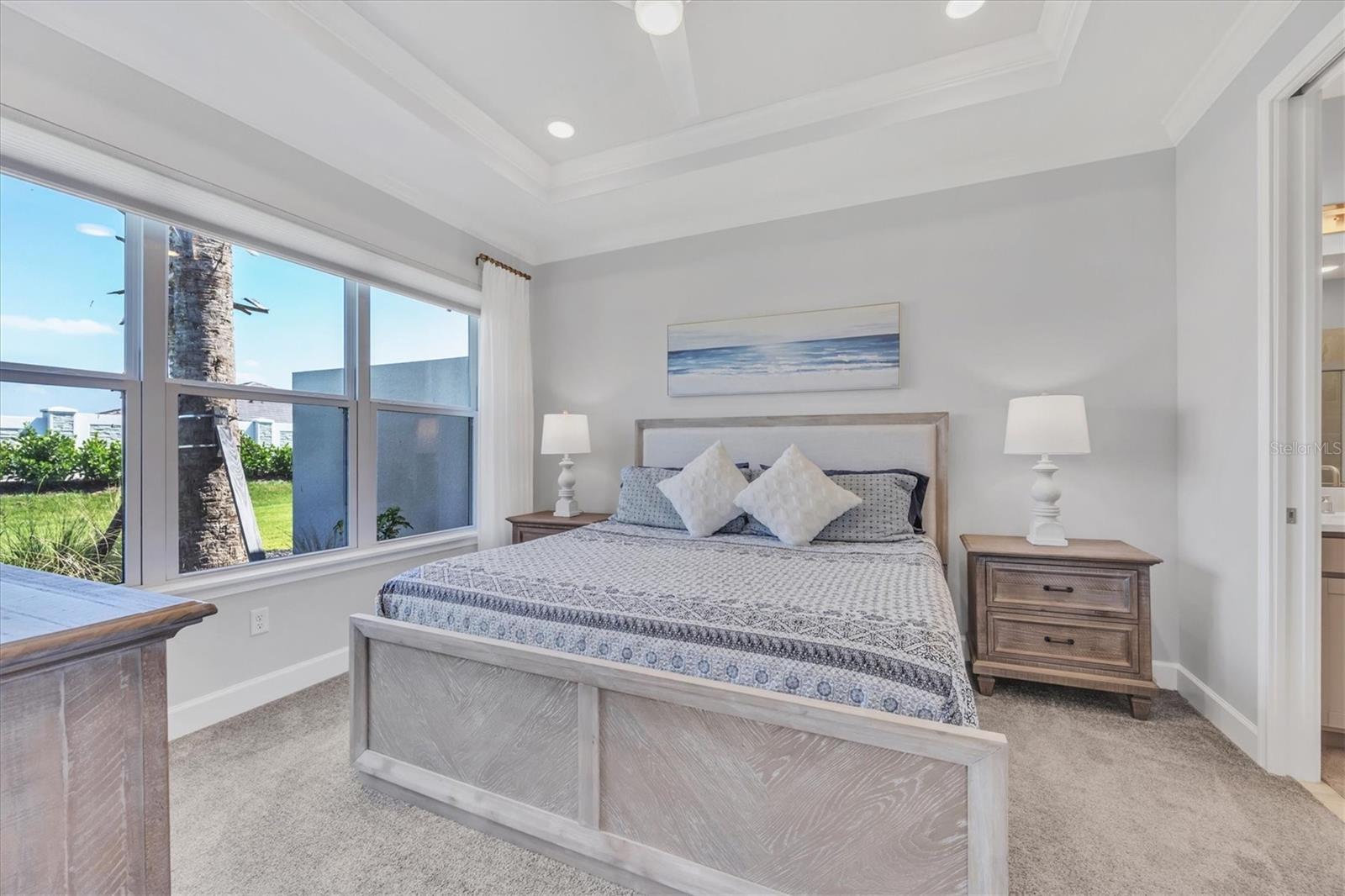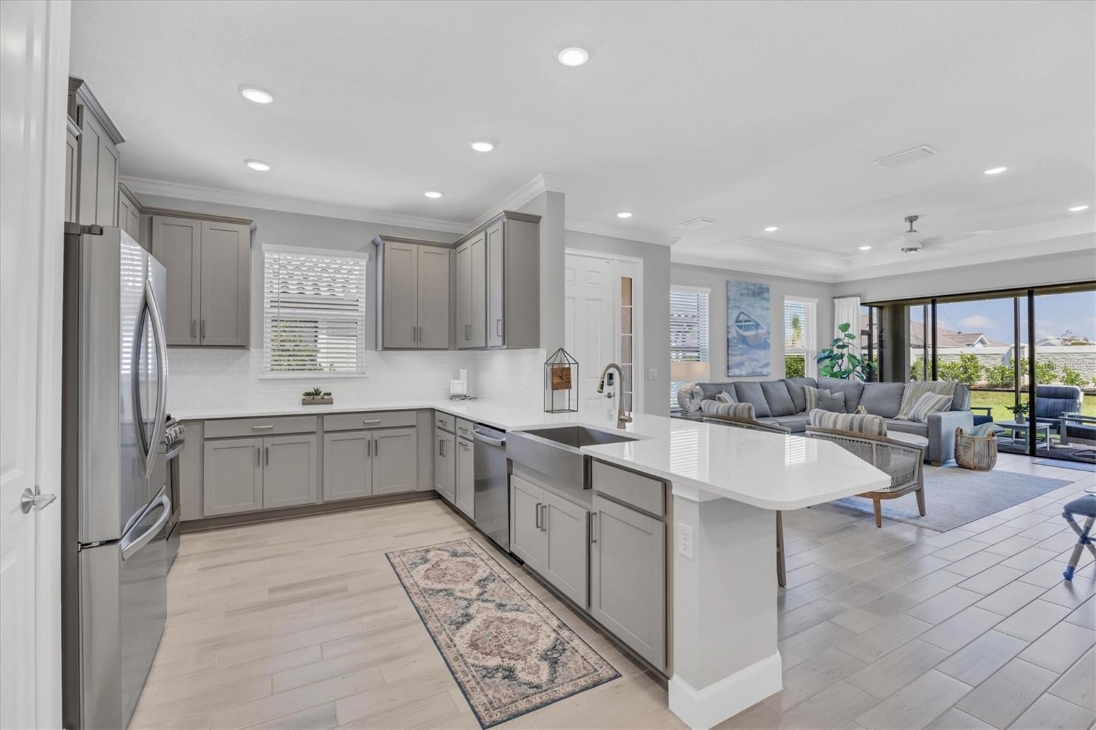 Impeccably upgraded, ideally sized 2 bedroom/2 bathroom plus office home in vibrant Azario for those seeking upscale ambiance, resort amenities and minimal maintenance in a country club setting. The Ibis open-concept floor plan has a centrally located kitchen that opens effortlessly to the great room and dining room. Countertops showcase polished quartz, solid wood gray cabinetry, under-cabinet lighting and externally vented range hood. An elegant primary suite has an oversized walk-in closet, dual-sink vanity, shower stall and water closet. At front of the home is a private guest suite with attached bath and a versatile den/office/flex space with pocket doors. Thoughtfully accentuated with tray ceilings, crown molding, 8-foot doorways, upgraded lighting package and designer fixtures. Motorized blinds provide sun control and privacy across great room's triple sliders and owner's bedroom suite windows. Extended screened lanai offers breezy landscaped views. Large laundry room with upper/lower cabinetry, utility sink, smart home technology, surround sound and epoxy-coated two-car garage. Azario offers 18-hole golf course, aqua driving range, heated beach-entry pool with cabanas, hot tub, state-of-the-art fitness center and classes. The Venue has billiards, ping-pong, cards and clubs. Full service poolside tiki bar, culinary center with cafe, fine dining, upscale lounge, patio eats, cafe, teaching kitchen and wine tastings.