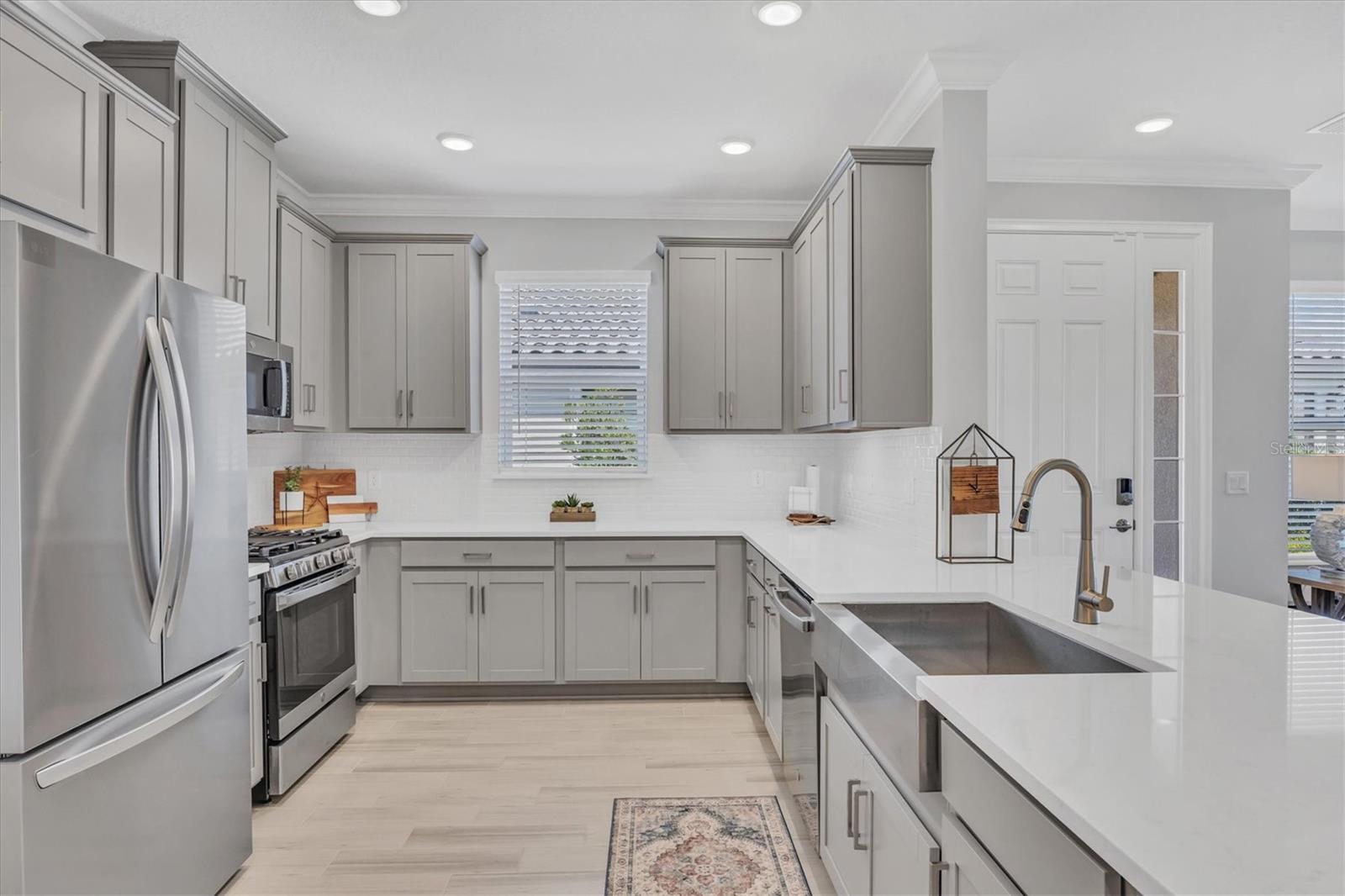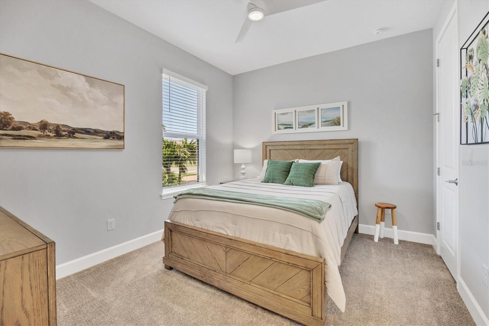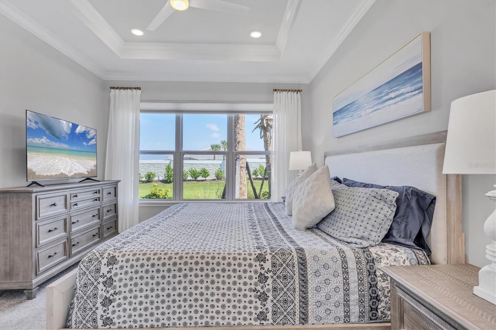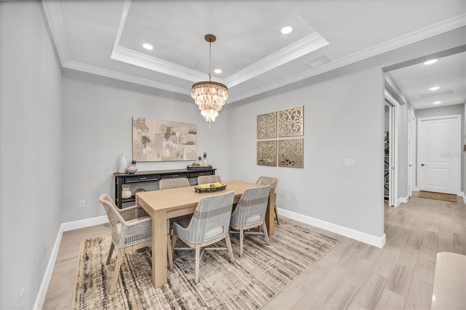 Impeccably upgraded, ideally sized 2 bedroom/2 bathroom plus office home in vibrant Azario for those seeking upscale ambiance, resort amenities and minimal maintenance in a country club setting. The Ibis open-concept floor plan has a centrally located kitchen that opens effortlessly to the great room and dining room. Countertops showcase polished quartz, solid wood gray cabinetry, under-cabinet lighting and externally vented range hood. An elegant primary suite has an oversized walk-in closet, dual-sink vanity, shower stall and water closet. At front of the home is a private guest suite with attached bath and a versatile den/office/flex space with pocket doors. Thoughtfully accentuated with tray ceilings, crown molding, 8-foot doorways, upgraded lighting package and designer fixtures. Motorized blinds provide sun control and privacy across great room's triple sliders and owner's bedroom suite windows. Extended screened lanai offers breezy landscaped views. Large laundry room with upper/lower cabinetry, utility sink, smart home technology, surround sound and epoxy-coated two-car garage. Azario offers 18-hole golf course, aqua driving range, heated beach-entry pool with cabanas, hot tub, state-of-the-art fitness center and classes. The Venue has billiards, ping-pong, cards and clubs. Full service poolside tiki bar, culinary center with cafe, fine dining, upscale lounge, patio eats, cafe, teaching kitchen and wine tastings.