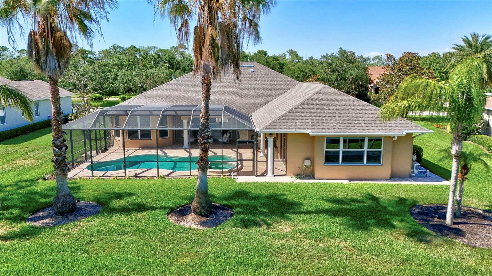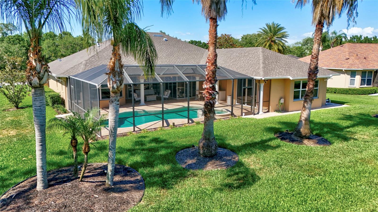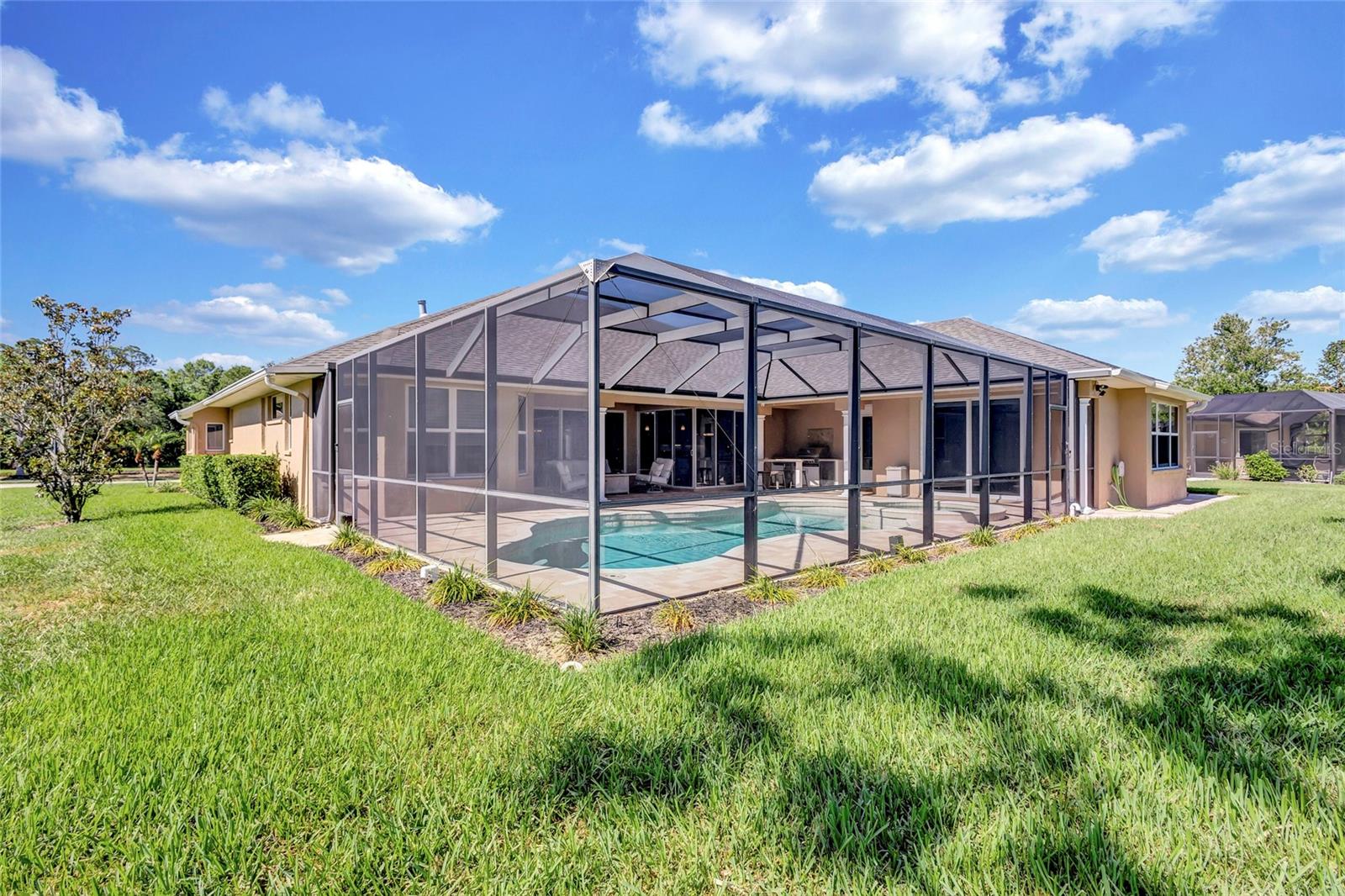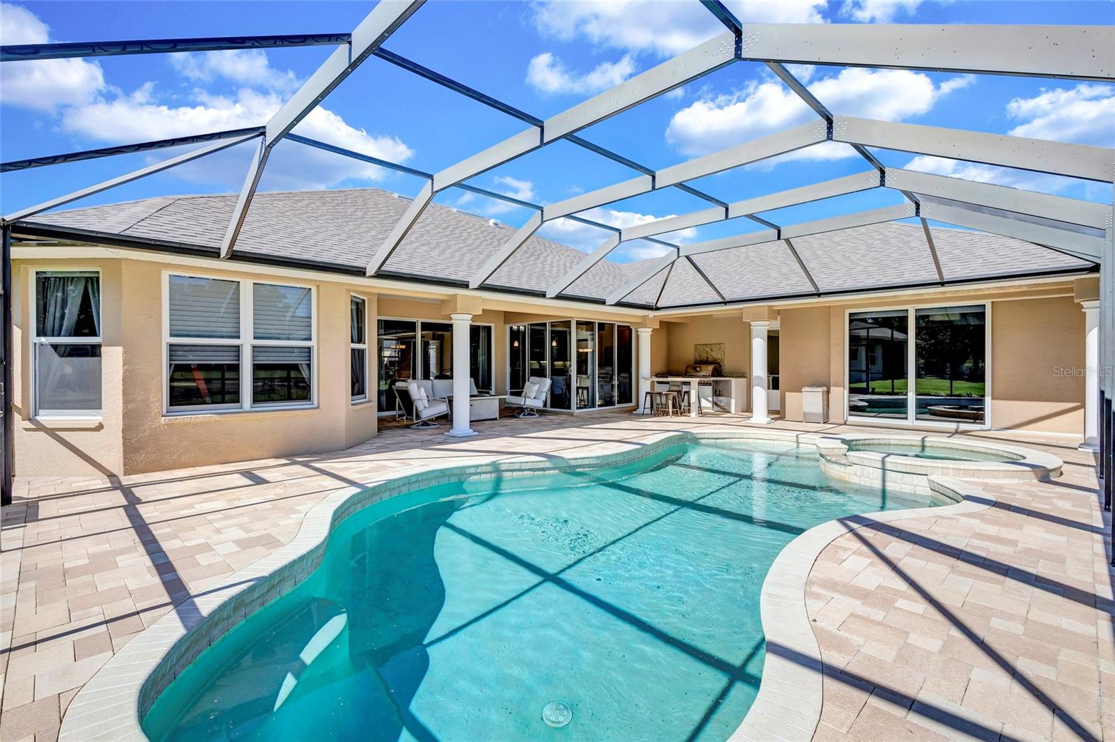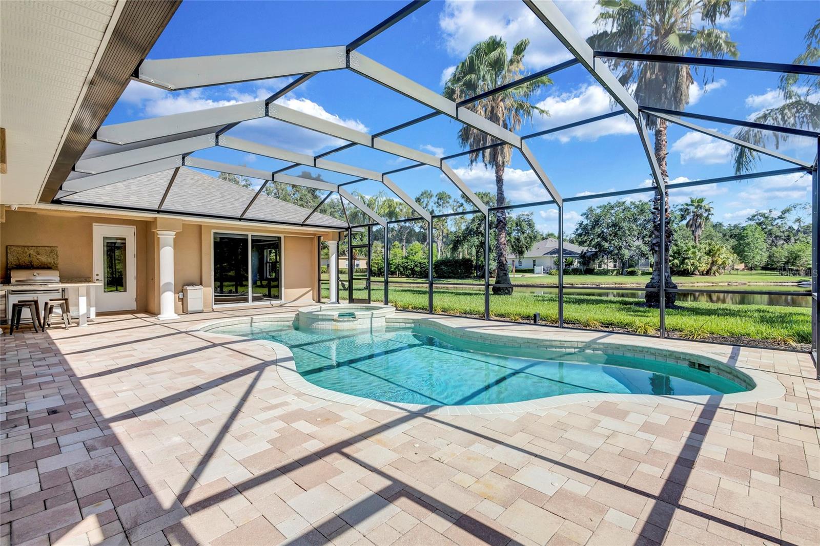 Private. Custom. Exceptional. Set on a lush, half-acre lot in sought-after Mill Creek, this custom-built 4-bedroom, 3-bath + den Salt Water pool home offers refined living with peaceful lake and preserve views both front and back. Extensively upgraded with over $100,000 in recent improvements, this move-in ready home features a brand new roof, new exterior paint, new AC system, updated pool equipment, security cameras and remote controlled room darkening blinds/ shades. IMPACT WINDOWS and a beautifully organized garage with custom shelving and epoxy flooring add even more appealing features to this amazing home. Inside, you’ll find soaring 9.5- to 14-foot ceilings, 8-foot doors, crown molding throughout, and a bright, open layout. The gourmet kitchen is a standout with 42” wood cabinetry, granite countertops, a brand-new gas range and stainless steel hood, walk-in pantry, under/over cabinet lighting, and a large bar with a breakfast nook overlooking the pool. Disappearing sliding glass doors lead to a covered lanai and sparkling pool—perfect for entertaining or relaxing in your own private oasis. The primary suite features custom closet systems, a Roman-style dual-head shower, and a separate soaking tub. Every bedroom includes a walk-in closet, and the oversized fourth bedroom offers flexible space for a bonus room, playroom, or in-law suite. A spacious laundry room with upper and lower cabinetry, electric fireplace, and an oversized 3-car garage complete the package. With low HOA fees, no CDDs, and a prime location in one of the area’s most desirable communities, this home is truly the full package.