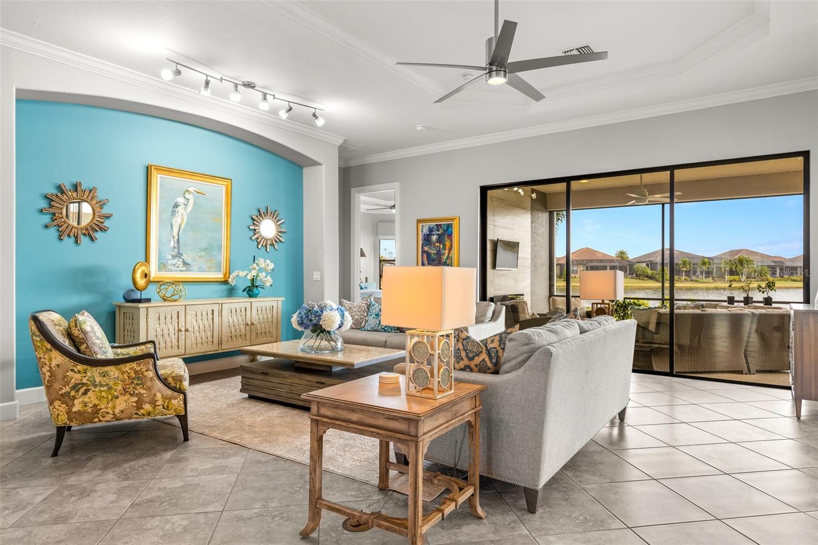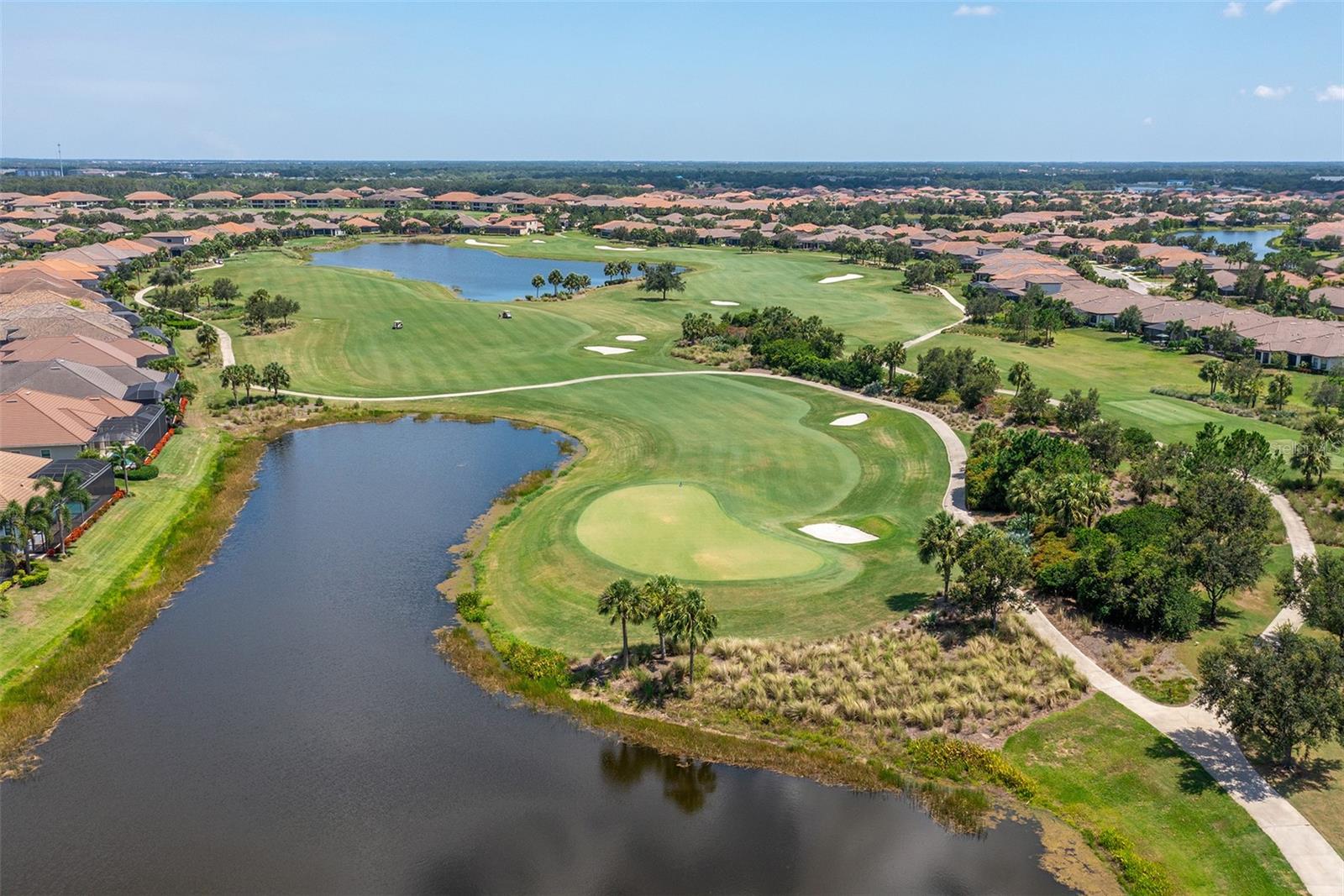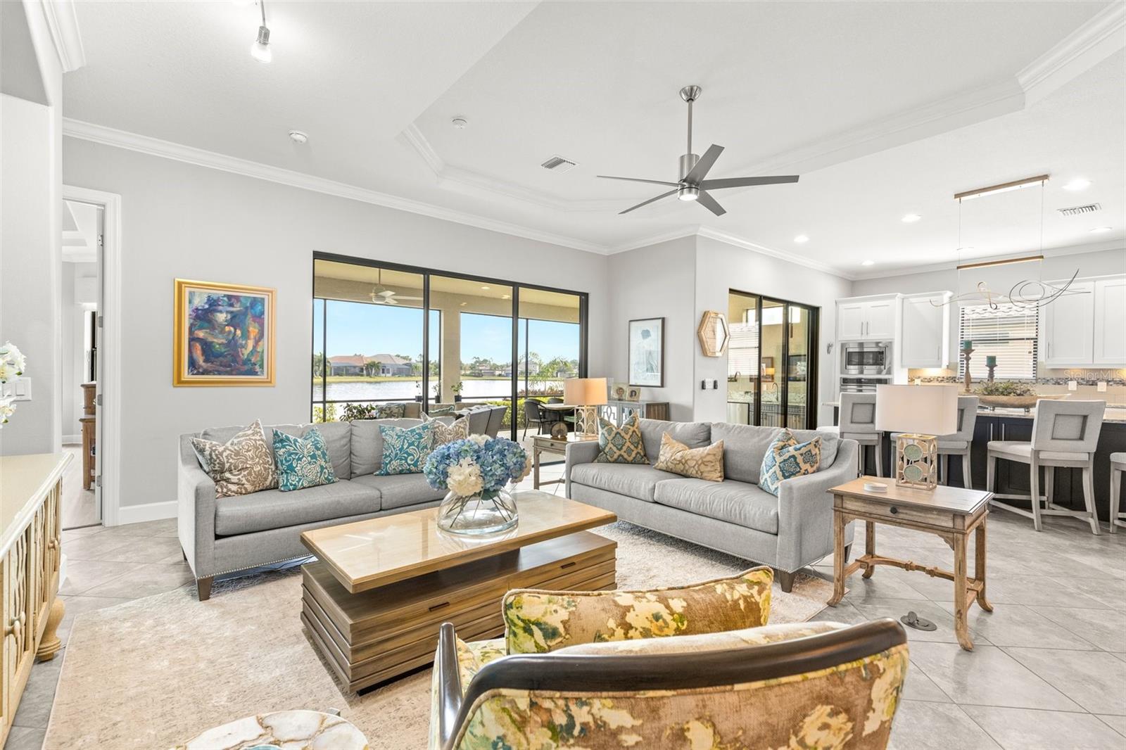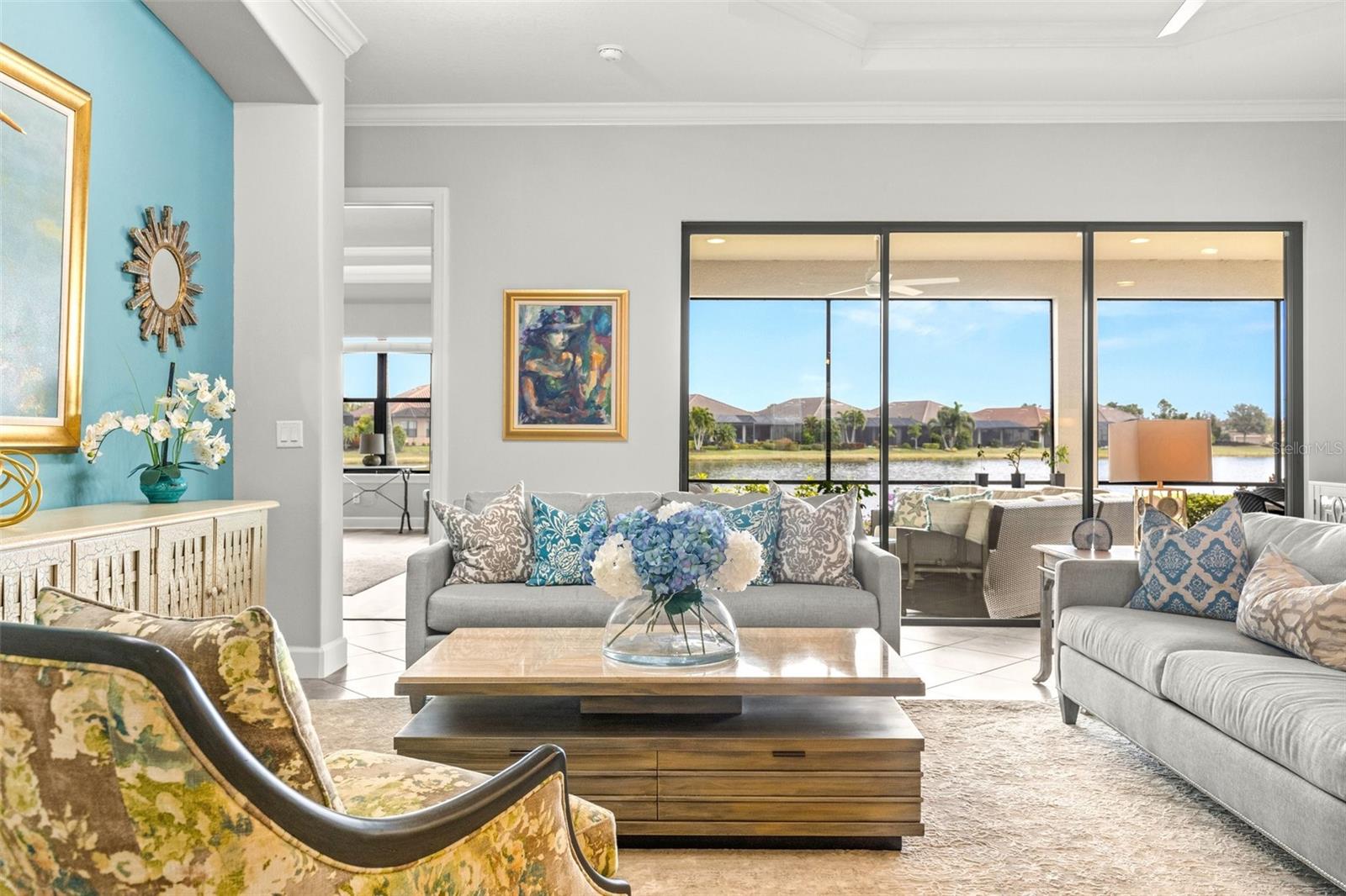 This stunning golf deeded home offers over 3,000 square feet of bright, airy living space in the amenity-rich Esplanade Golf and Country Club, nestled in the heart of Lakewood Ranch. This popular Pallazio model is designed with an open floor plan and features three spacious bedrooms, three full bathrooms, a versatile den/office, and a gourmet kitchen. The large lanai is the perfect setting for outdoor living and a place to enjoy a beautiful sunrise. Thoughtfully upgraded, this home boasts high tray ceilings, elegant crown molding, and modern tech enhancements like integrated wiring for speakers and security cameras. A BRAND NEW HVAC system was installed in March 2025. The three-car garage includes a unique tandem area that has been enclosed as a functional workroom but can easily be converted back to its original open layout. For peace of mind during hurricane season, high impact roll down shades have been installed for the lanai and each of the side and back windows have been fitted with high impact kevlar material that is easy to install. The front door, front window and garage door are high impact rated on their own. All this AND located in a non-evacuation zone! Esplanade is resort-style living at its finest! Not only does it have an incredible 18 hole golf course, Esplanade offers an unmatched lifestyle with an array of world-class amenities, including: • multiple workout spaces • resort-style pools • The Bahama Bar, a tiki bar for casual dining and drinks • The Barrel House, a full-service restaurant • a dog park • a playground • tennis, pickleball, and bocce ball courts • and a fire pit for gathering and relaxation. Esplanade is ideally situated within Lakewood Ranch, one of the nation’s premier master-planned communities. Residents enjoy proximity to top-rated schools, an abundance of shopping opportunities, and high-end dining options. From boutique shops to fine restaurants, there’s something for everyone. With activities and amenities for all ages, this vibrant community provides an unparalleled lifestyle. This home is a perfect blend of comfort, style, and convenience. Don’t miss your chance to make it yours and experience the best of Esplanade living!