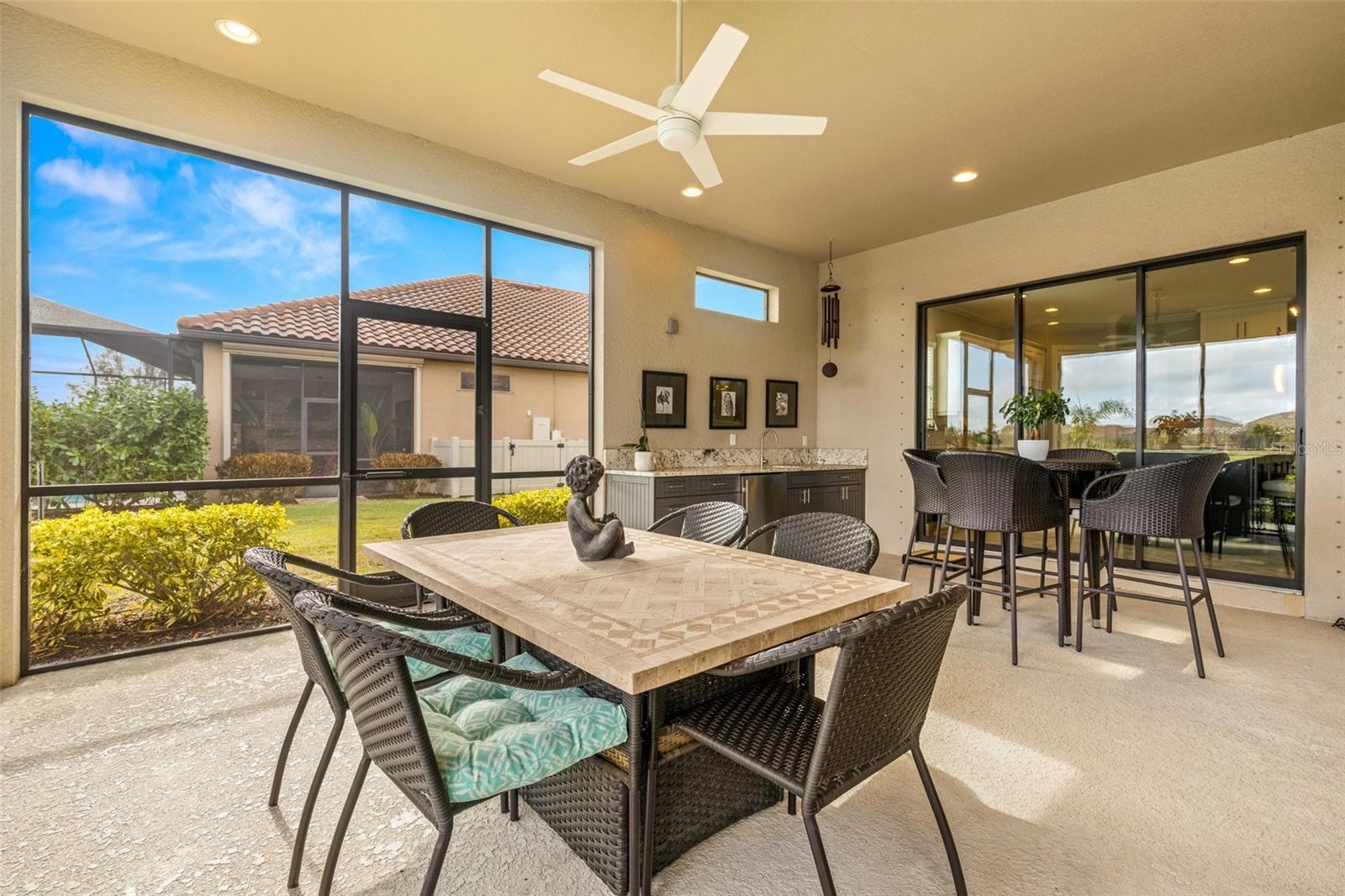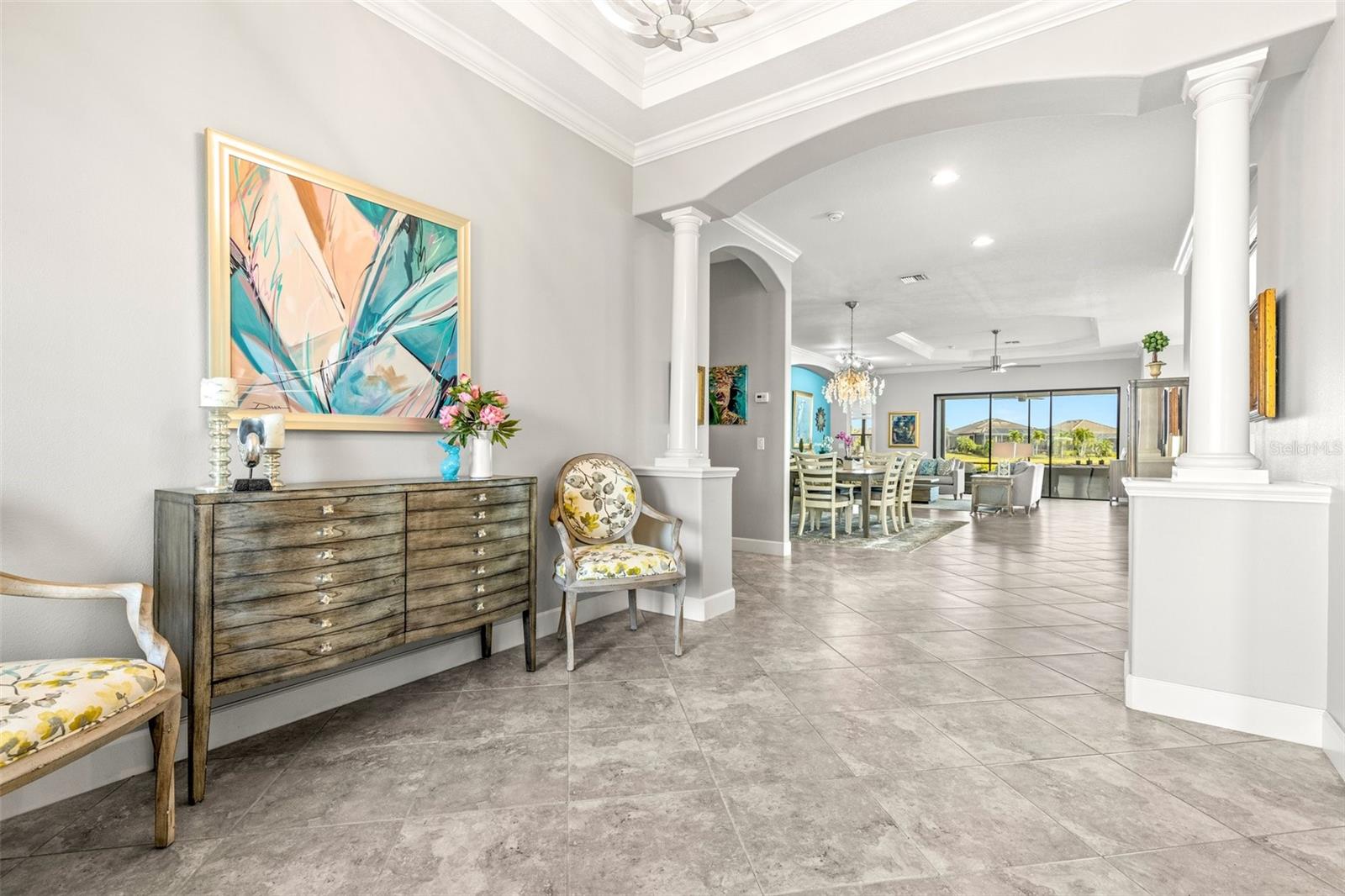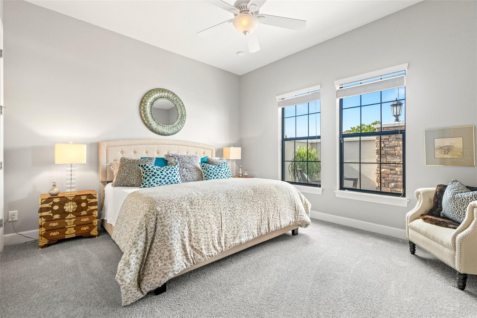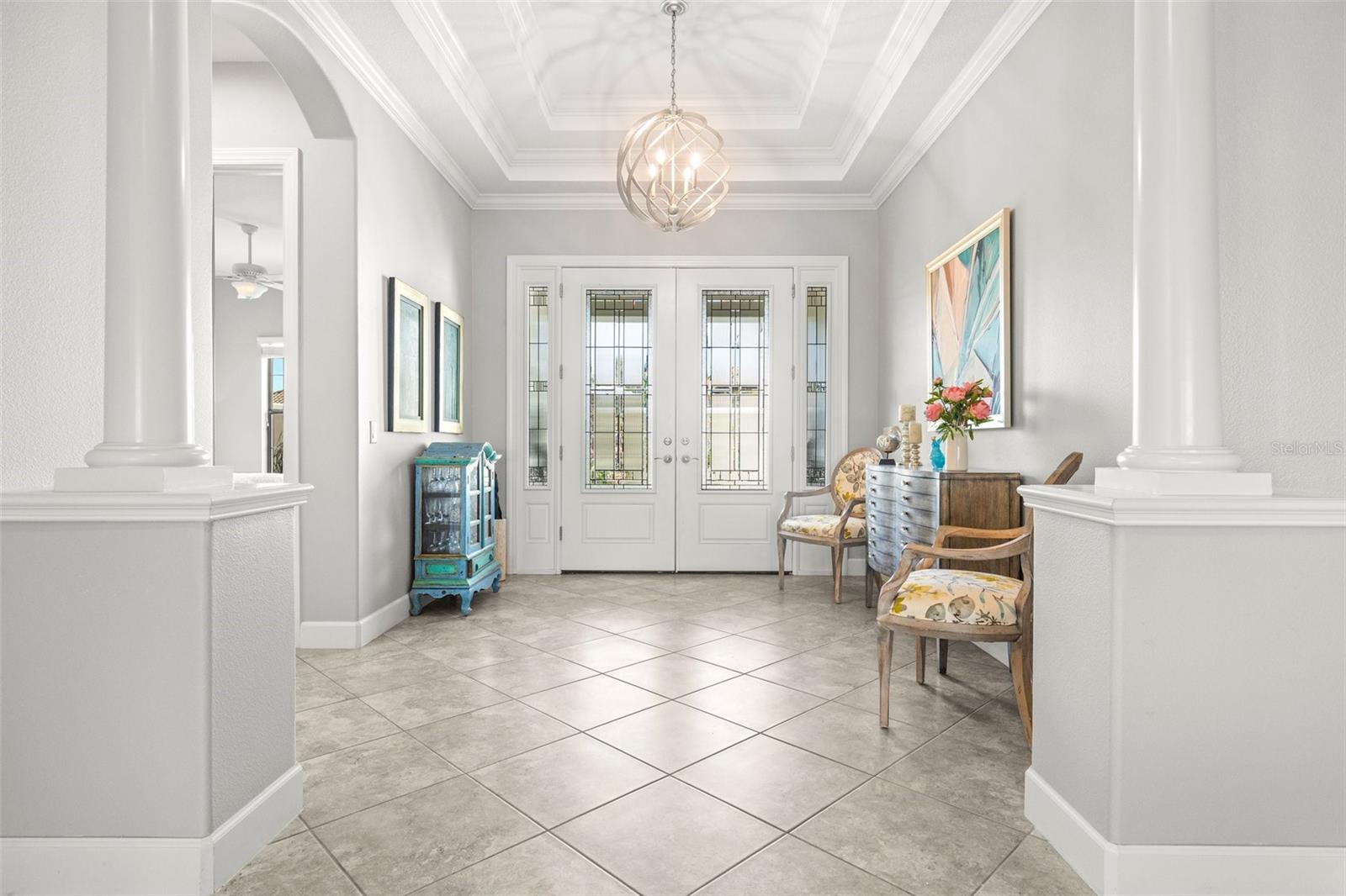 This stunning golf deeded home offers over 3,000 square feet of bright, airy living space in the amenity-rich Esplanade Golf and Country Club, nestled in the heart of Lakewood Ranch. This popular Pallazio model is designed with an open floor plan and features three spacious bedrooms, three full bathrooms, a versatile den/office, and a gourmet kitchen. The large lanai is the perfect setting for outdoor living and a place to enjoy a beautiful sunrise. Thoughtfully upgraded, this home boasts high tray ceilings, elegant crown molding, and modern tech enhancements like integrated wiring for speakers and security cameras. A BRAND NEW HVAC system was installed in March 2025. The three-car garage includes a unique tandem area that has been enclosed as a functional workroom but can easily be converted back to its original open layout. For peace of mind during hurricane season, high impact roll down shades have been installed for the lanai and each of the side and back windows have been fitted with high impact kevlar material that is easy to install. The front door, front window and garage door are high impact rated on their own. All this AND located in a non-evacuation zone! Esplanade is resort-style living at its finest! Not only does it have an incredible 18 hole golf course, Esplanade offers an unmatched lifestyle with an array of world-class amenities, including: • multiple workout spaces • resort-style pools • The Bahama Bar, a tiki bar for casual dining and drinks • The Barrel House, a full-service restaurant • a dog park • a playground • tennis, pickleball, and bocce ball courts • and a fire pit for gathering and relaxation. Esplanade is ideally situated within Lakewood Ranch, one of the nation’s premier master-planned communities. Residents enjoy proximity to top-rated schools, an abundance of shopping opportunities, and high-end dining options. From boutique shops to fine restaurants, there’s something for everyone. With activities and amenities for all ages, this vibrant community provides an unparalleled lifestyle. This home is a perfect blend of comfort, style, and convenience. Don’t miss your chance to make it yours and experience the best of Esplanade living!