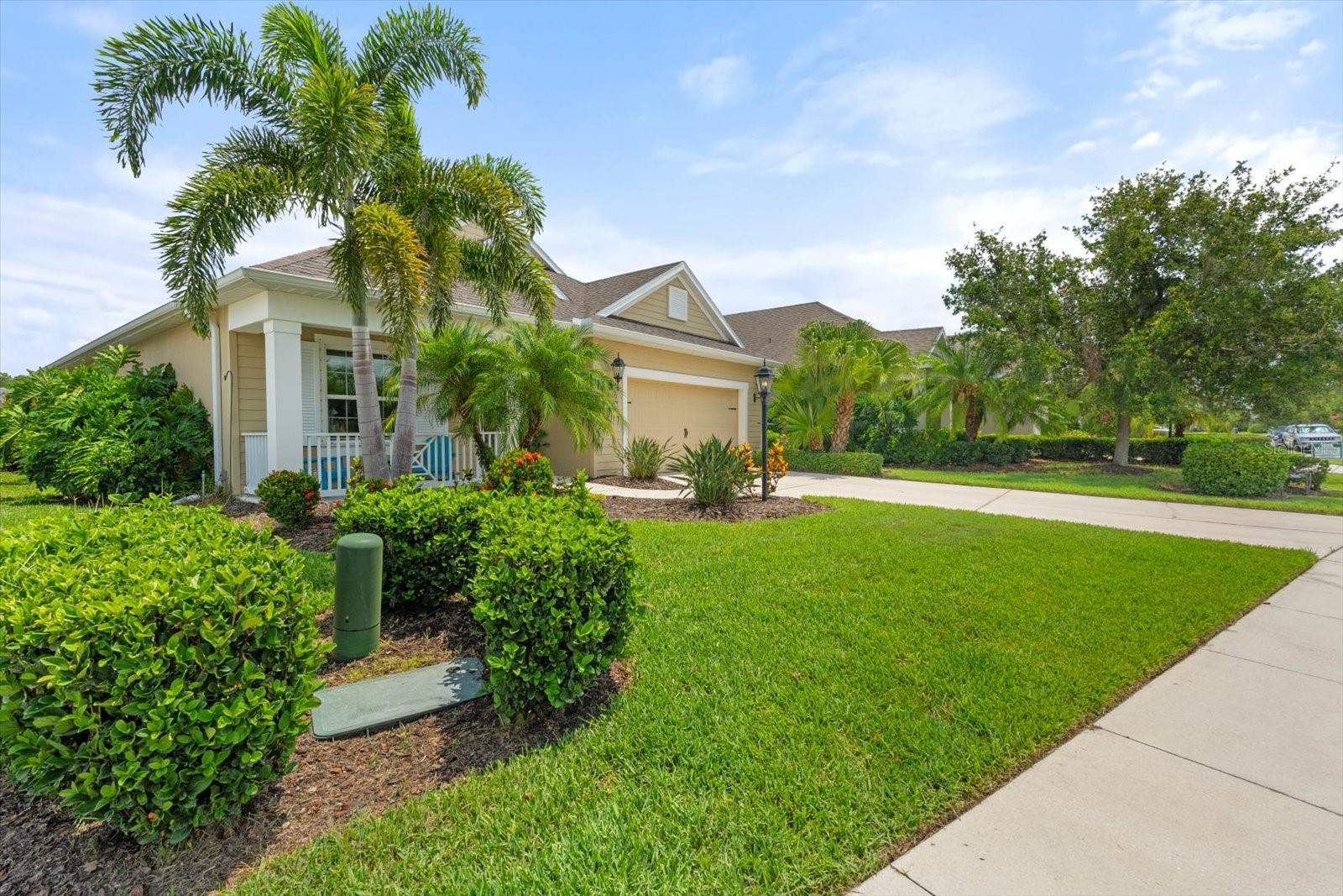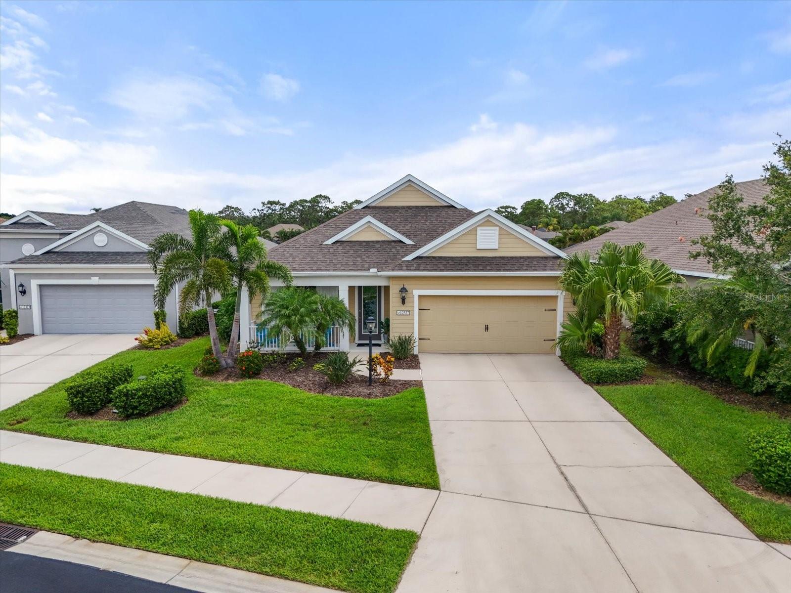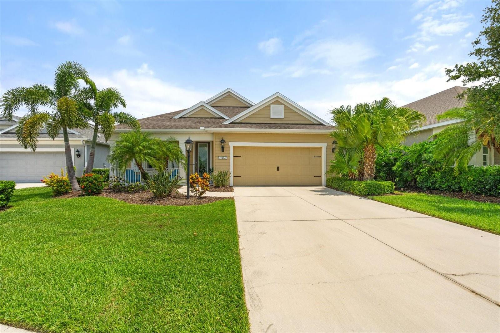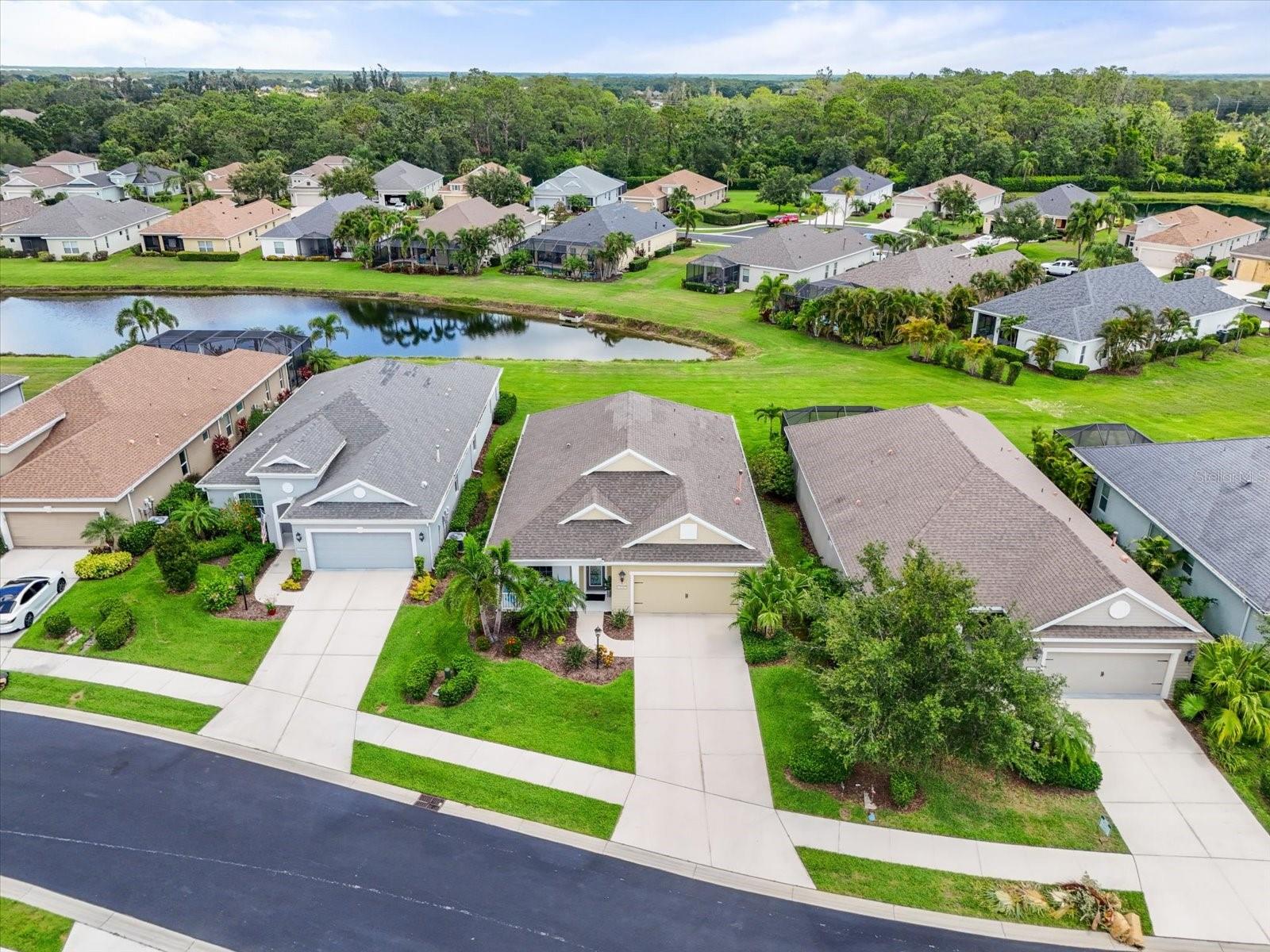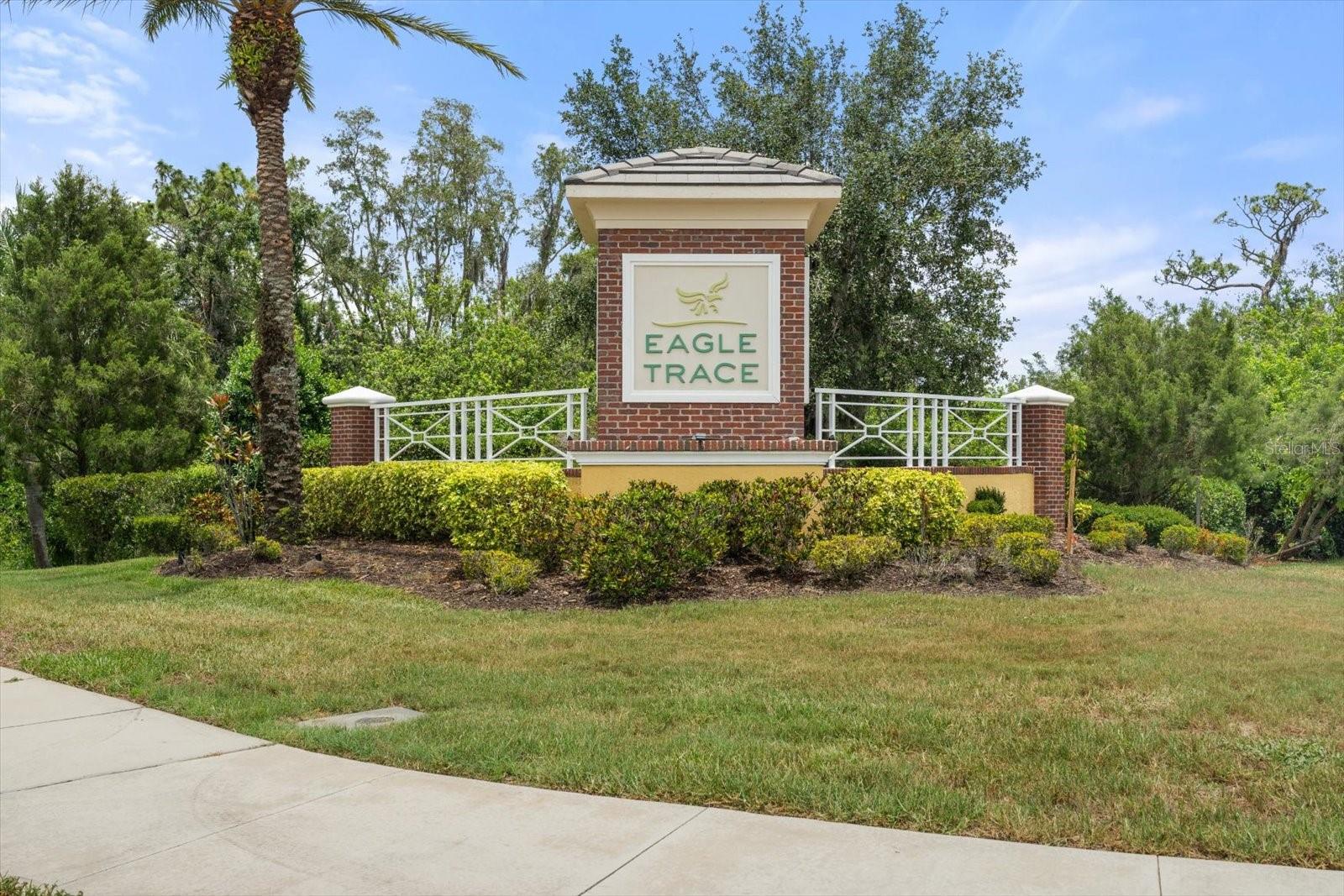 This meticulously cared-for home, inside and out, is truly move-in ready! Located on a cul-de-sac in the highly sought-after gated community of Eagle Trace, this property offers the perfect blend of comfort, functionality, and charm. Enjoy your morning coffee on the inviting front porch, then step through the glass front door into a naturally lit, open-concept layout with a direct view of the serene pond in the backyard. A spacious front den offers the ideal space for a home office, playroom, or reading nook. The heart of the home features a stylish kitchen complete with gas stainless steel appliances, a large island with seating, backsplash, and a walk-in pantry. Best of all—this home has no carpet!Plantation shutters, updated light fixtures, and ceiling fans throughout the home. Down the hallway, you'll find two generously sized bedrooms, a guest bathroom, and a laundry room with washer and dryer included. The split floor plan ensures privacy, with the spacious primary suite located at the back of the home. The primary bedroom is filled with natural light and includes an en-suite bathroom with double sinks and a walk-in shower. Enjoy Florida living year-round on the screened-in lanai overlooking the peaceful pond. Best of all, the home is not in a flood zone and no CDD fee! Eagle Trace HOA covers front and backyard irrigation, lawn maintenance, and access to fantastic amenities including a community pool, hot tub, pickleball courts, playground, and dog park. Conveniently located near SR-64, US-301, I-75, and I-275, yet tucked away in a private neighborhood—this is the perfect place to call home.