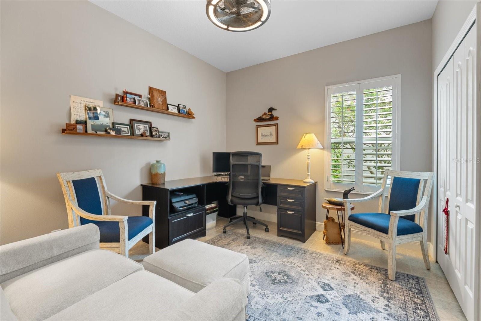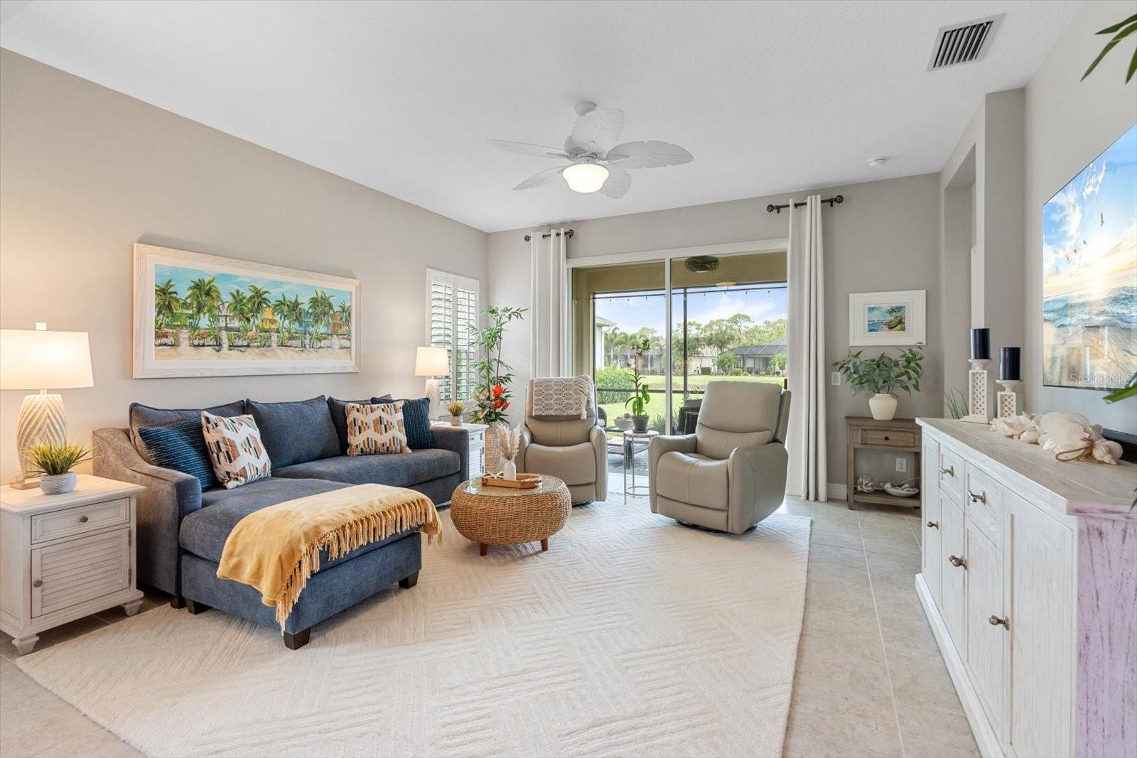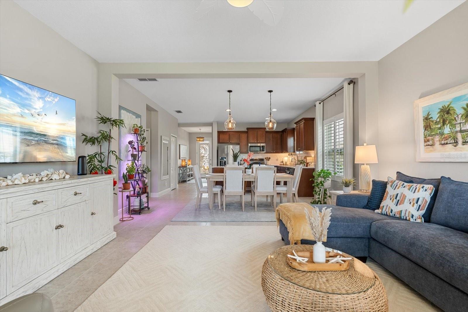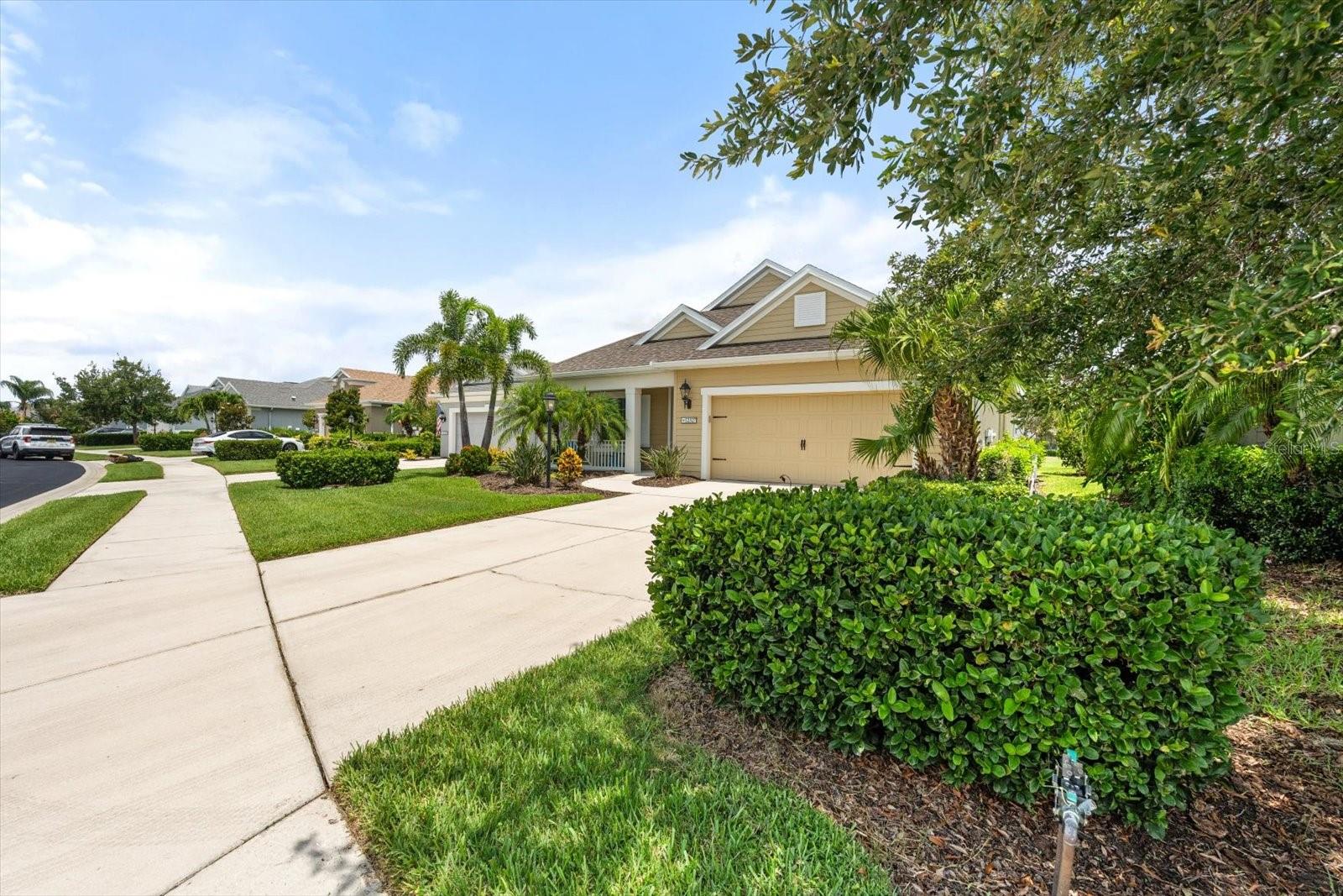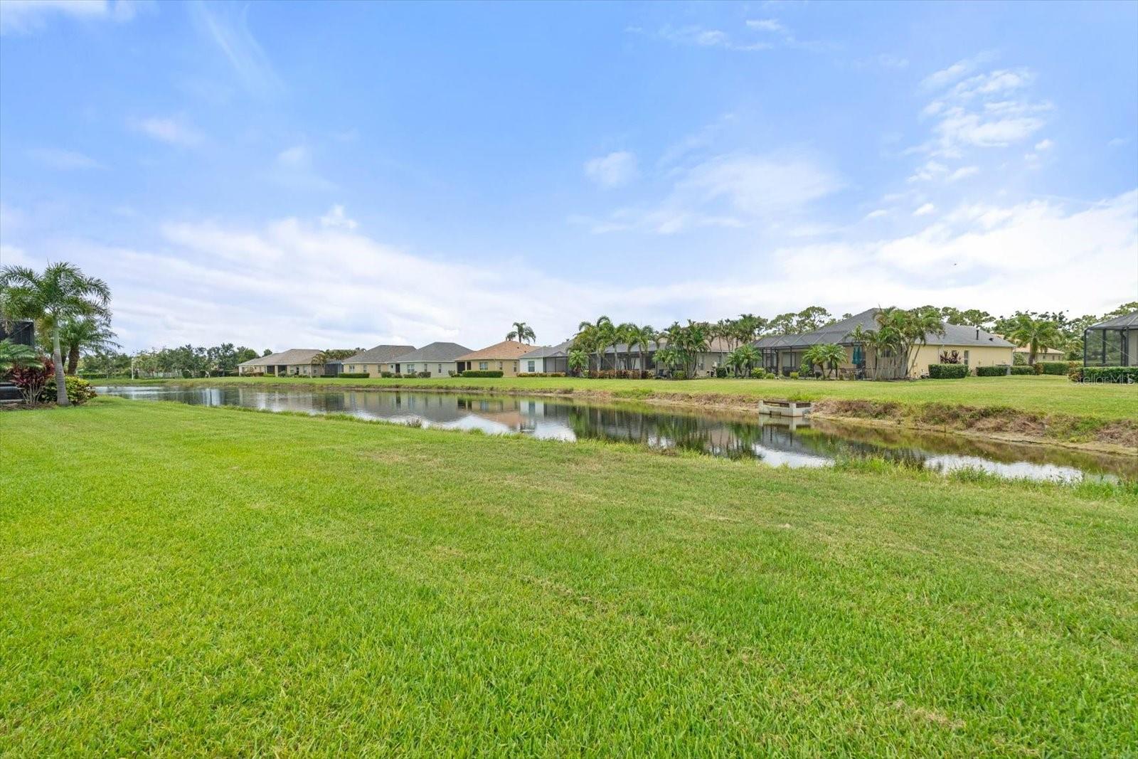 This meticulously cared-for home, inside and out, is truly move-in ready! Located on a cul-de-sac in the highly sought-after gated community of Eagle Trace, this property offers the perfect blend of comfort, functionality, and charm. Enjoy your morning coffee on the inviting front porch, then step through the glass front door into a naturally lit, open-concept layout with a direct view of the serene pond in the backyard. A spacious front den offers the ideal space for a home office, playroom, or reading nook. The heart of the home features a stylish kitchen complete with gas stainless steel appliances, a large island with seating, backsplash, and a walk-in pantry. Best of all—this home has no carpet!Plantation shutters, updated light fixtures, and ceiling fans throughout the home. Down the hallway, you'll find two generously sized bedrooms, a guest bathroom, and a laundry room with washer and dryer included. The split floor plan ensures privacy, with the spacious primary suite located at the back of the home. The primary bedroom is filled with natural light and includes an en-suite bathroom with double sinks and a walk-in shower. Enjoy Florida living year-round on the screened-in lanai overlooking the peaceful pond. Best of all, the home is not in a flood zone and no CDD fee! Eagle Trace HOA covers front and backyard irrigation, lawn maintenance, and access to fantastic amenities including a community pool, hot tub, pickleball courts, playground, and dog park. Conveniently located near SR-64, US-301, I-75, and I-275, yet tucked away in a private neighborhood—this is the perfect place to call home.