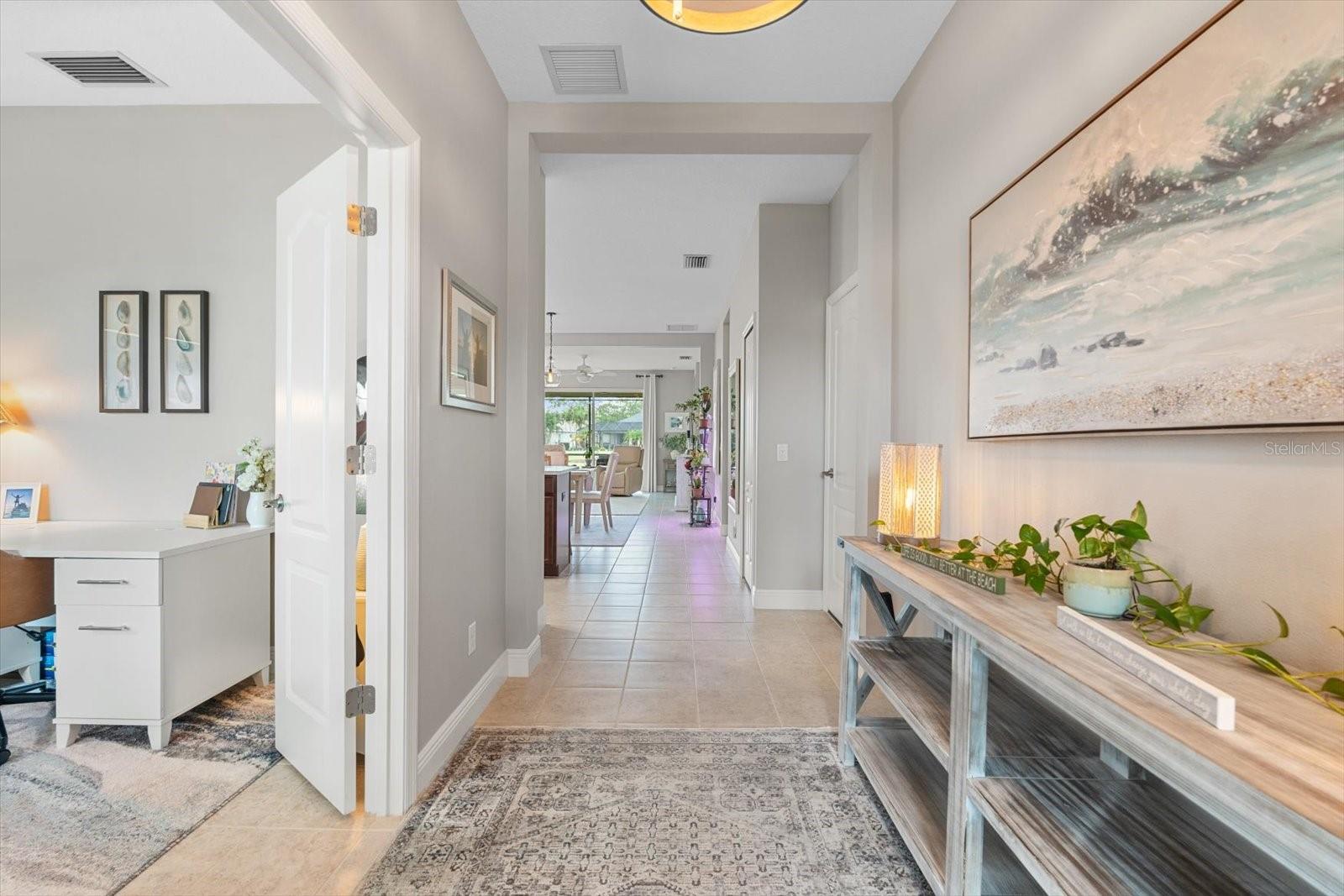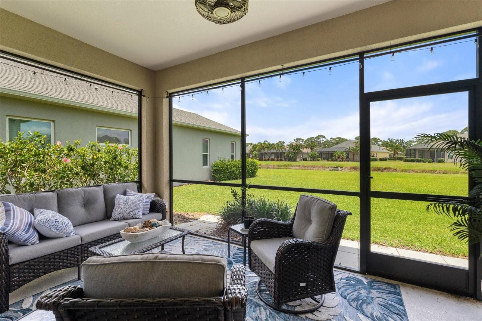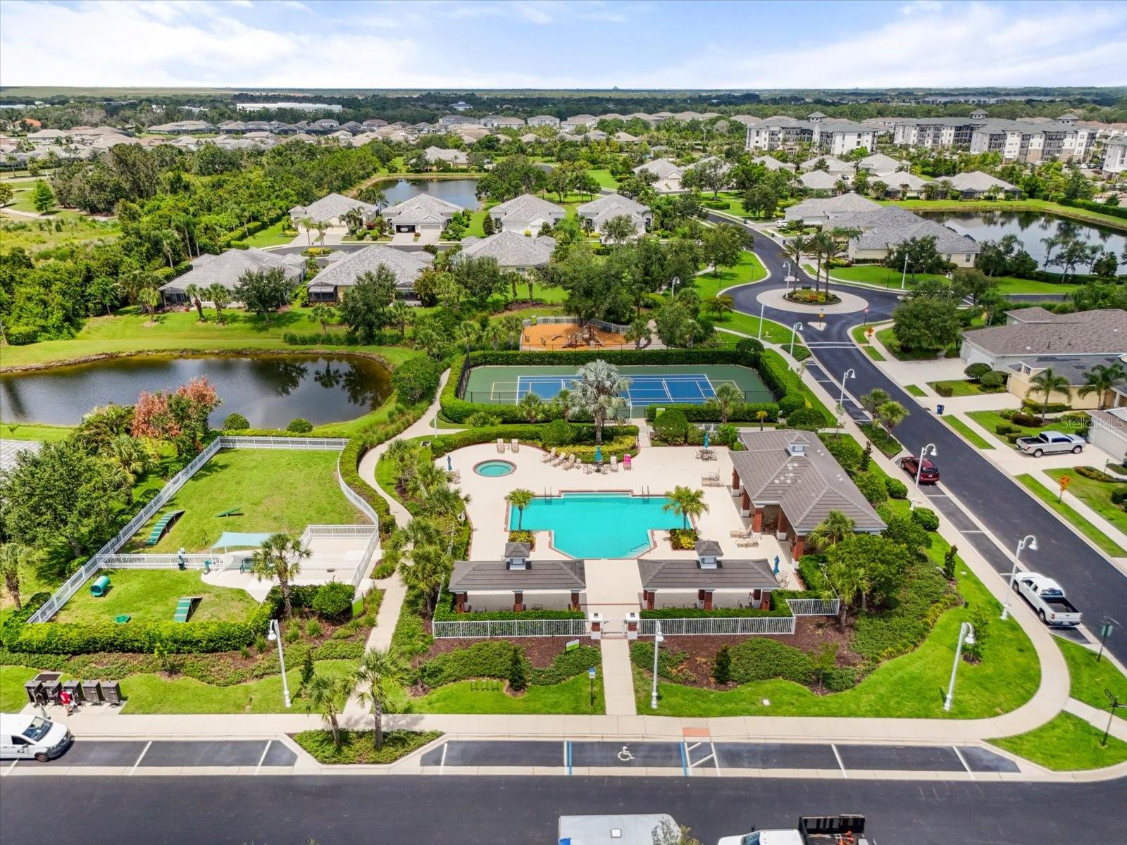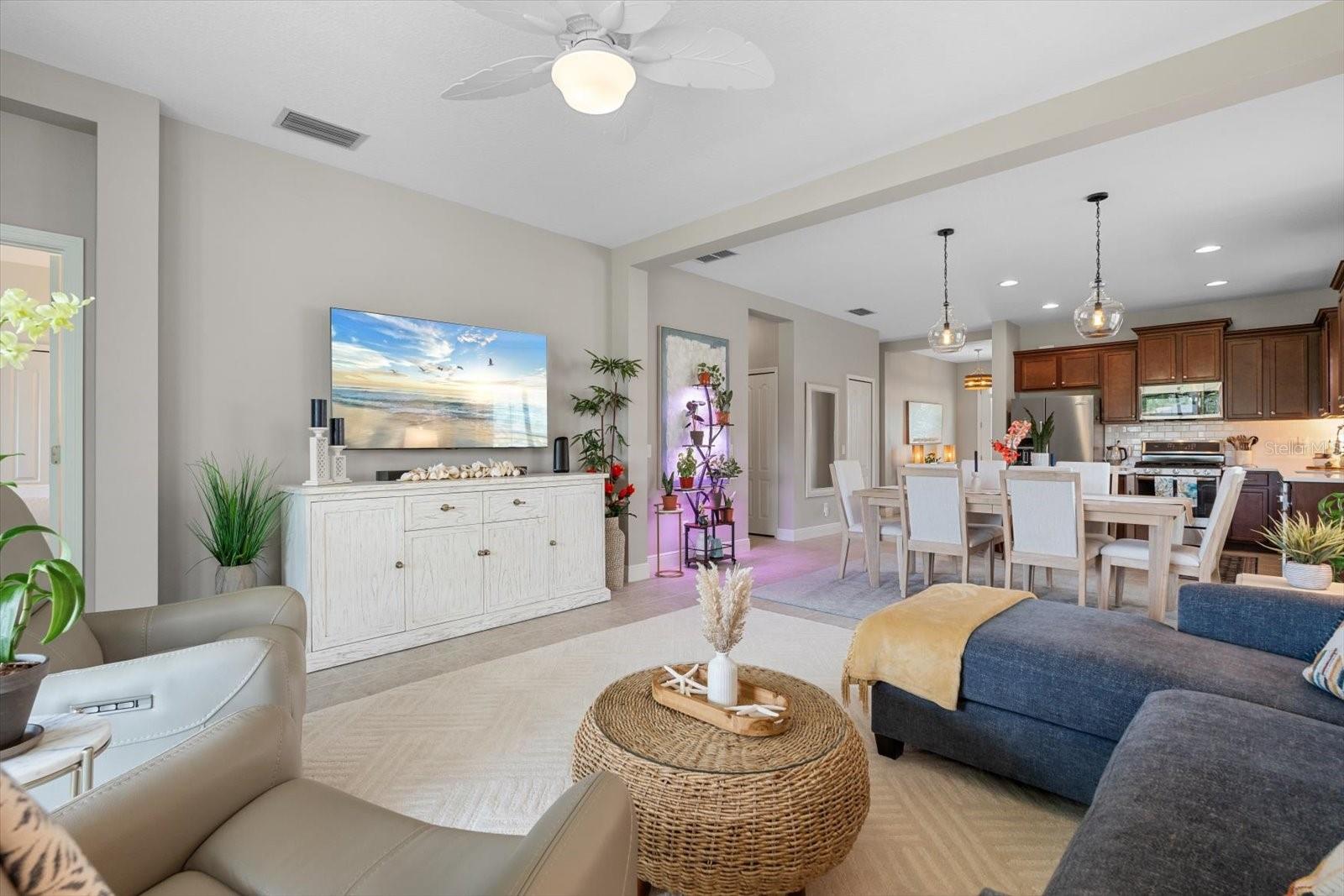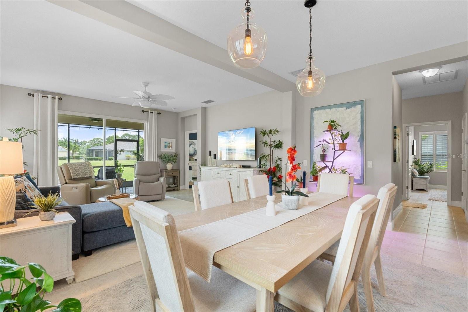 This meticulously cared-for home, inside and out, is truly move-in ready! Located on a cul-de-sac in the highly sought-after gated community of Eagle Trace, this property offers the perfect blend of comfort, functionality, and charm. Enjoy your morning coffee on the inviting front porch, then step through the glass front door into a naturally lit, open-concept layout with a direct view of the serene pond in the backyard. A spacious front den offers the ideal space for a home office, playroom, or reading nook. The heart of the home features a stylish kitchen complete with gas stainless steel appliances, a large island with seating, backsplash, and a walk-in pantry. Best of all—this home has no carpet!Plantation shutters, updated light fixtures, and ceiling fans throughout the home. Down the hallway, you'll find two generously sized bedrooms, a guest bathroom, and a laundry room with washer and dryer included. The split floor plan ensures privacy, with the spacious primary suite located at the back of the home. The primary bedroom is filled with natural light and includes an en-suite bathroom with double sinks and a walk-in shower. Enjoy Florida living year-round on the screened-in lanai overlooking the peaceful pond. Best of all, the home is not in a flood zone and no CDD fee! Eagle Trace HOA covers front and backyard irrigation, lawn maintenance, and access to fantastic amenities including a community pool, hot tub, pickleball courts, playground, and dog park. Conveniently located near SR-64, US-301, I-75, and I-275, yet tucked away in a private neighborhood—this is the perfect place to call home.