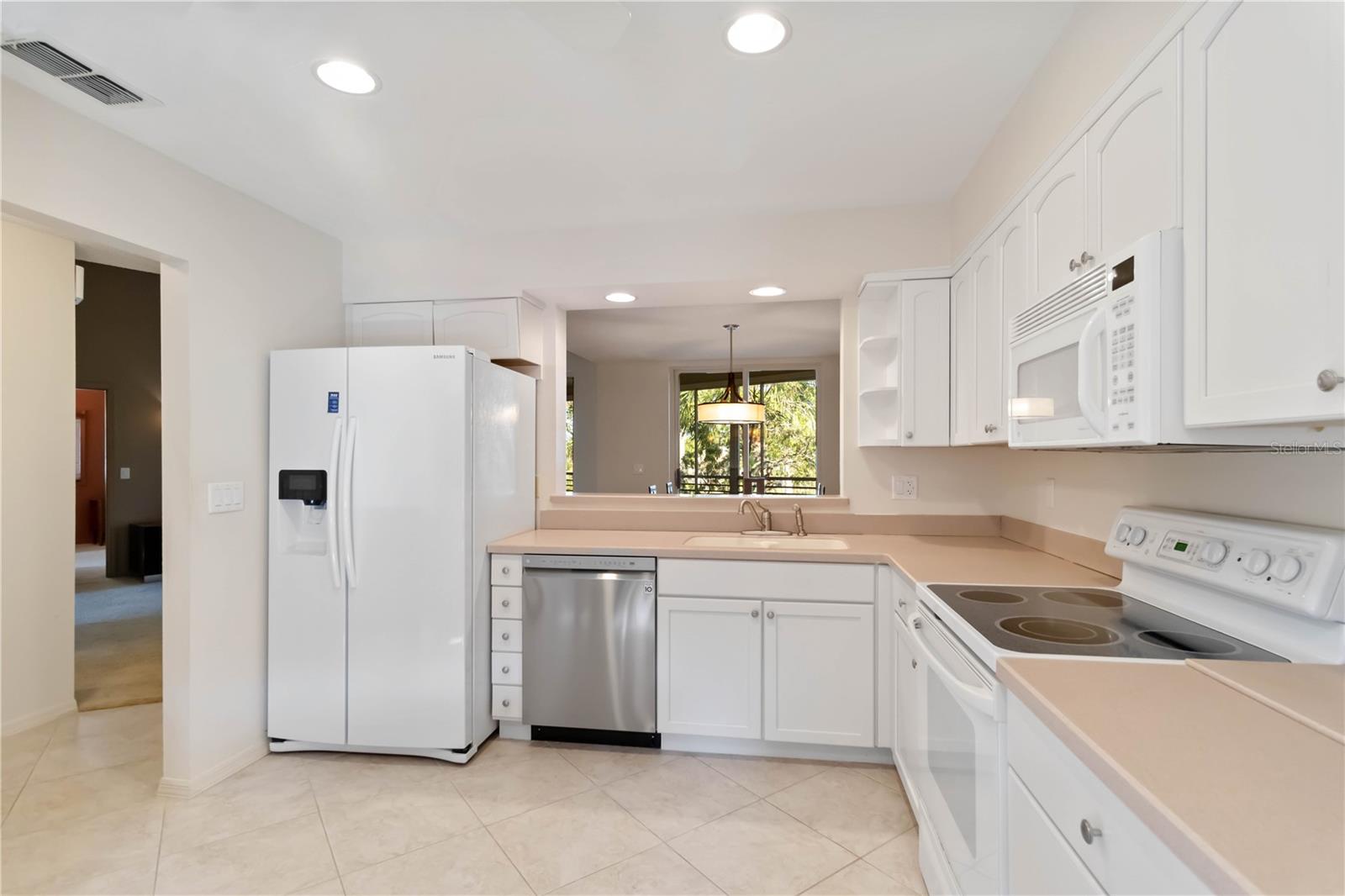 FULLY FURNISHED TURN KEY CONDO!! Mediterranean Elegance in the Heart of Florida! Welcome to Vizcaya, a beautifully maintained and highly sought-after gated condo community offering 24-hour security, lush landscaping, and resort-style amenities. This renovated second-floor end unit is the perfect blend of comfort, style, and tranquility. Step inside and you'll immediately notice the vaulted ceilings and abundance of natural light that pours in through large windows and sliding glass doors. The spacious balcony is ideal for morning coffee or evening relaxation, offering picturesque views of the serene pond, elegant fountain, and manicured grounds. The kitchen is both functional and charming, featuring cream-colored wood cabinetry, Corian countertops, and ample storage—perfect for home chefs and casual entertainers alike. The open-concept layout flows seamlessly into the living and dining areas, creating an inviting space to gather and unwind. The primary suite is a true retreat, complete with dual walk-in closets and a renovated spa-like bathroom that includes dual sinks, a glass-enclosed walk-in shower, and a separate vanity area. The split-bedroom floor plan allows for privacy and flexibility, making it ideal for hosting guests or setting up a home office. Vizcaya is more than just a place to live—it's a lifestyle. Residents enjoy access to an elegant clubhouse, one of the largest heated community pools in the area, fitness centers, saunas, a large meeting and event room, and a calendar full of community activities and social gatherings. The beautifully landscaped grounds, walking paths, and tranquil water features make every day feel like a vacation. Ideally located near shopping, dining, golf courses, medical facilities, and the Gulf beaches, Vizcaya offers a prime location with the peace and privacy of a gated oasis. Don’t miss this rare opportunity to enjoy elegant Florida living in one of the area's most established and well-kept communities!