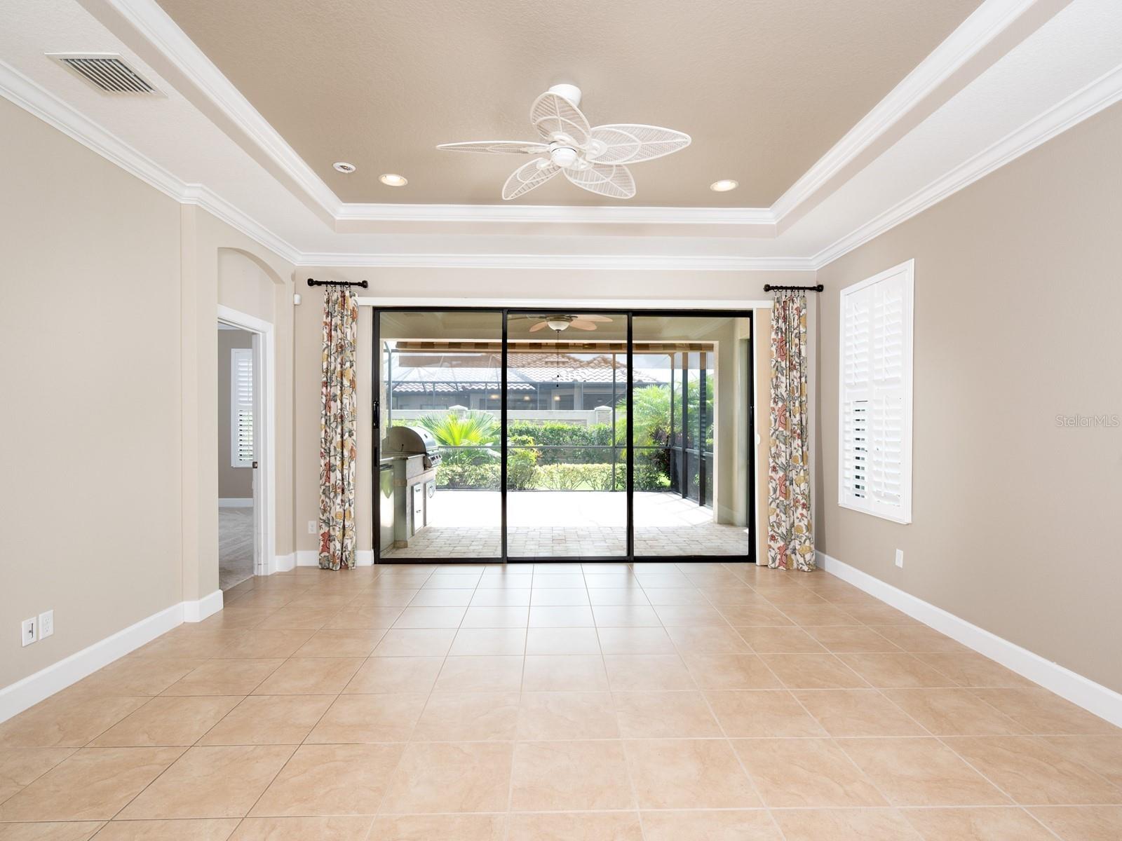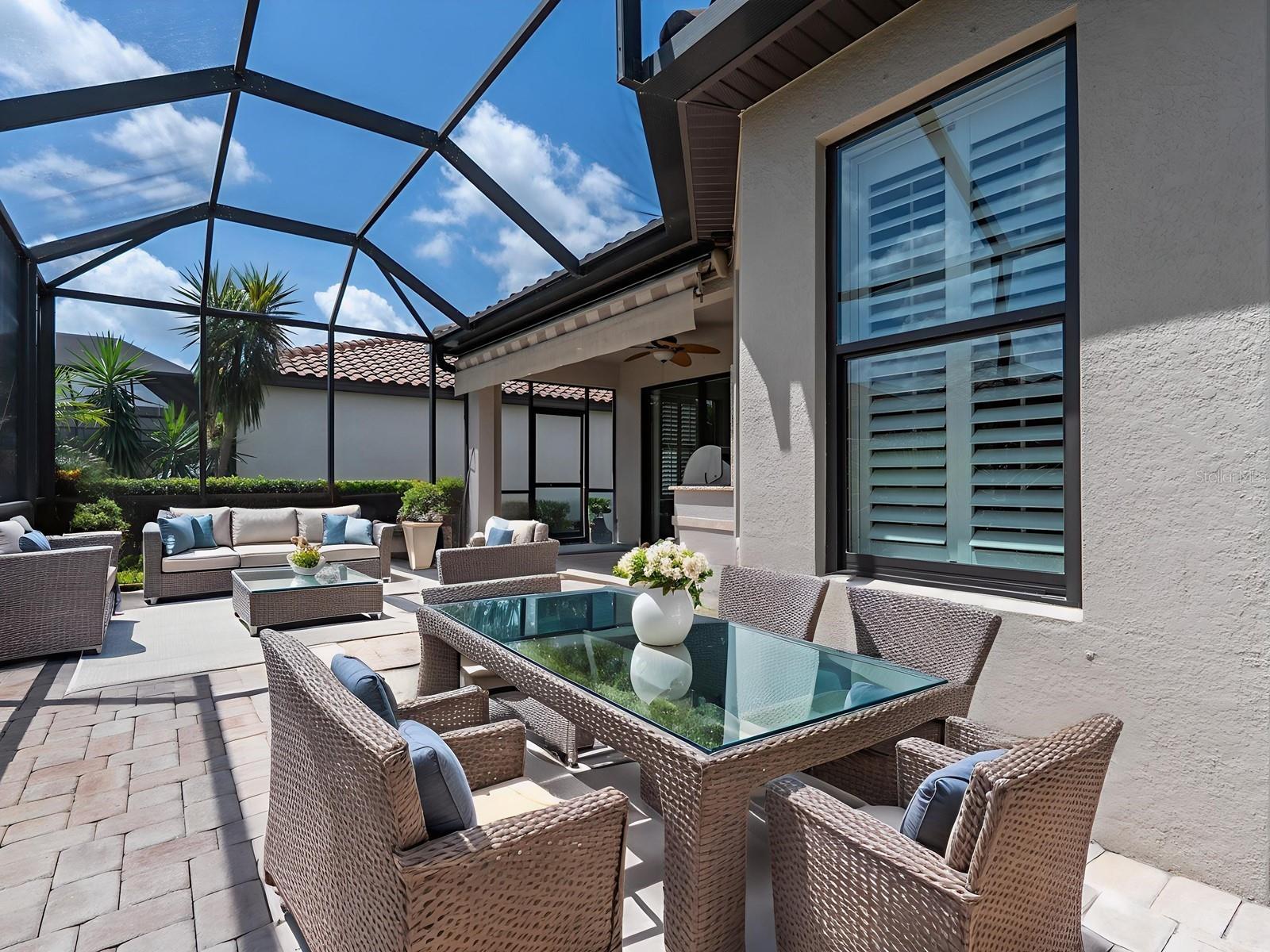 One or more photo(s) has been virtually staged. MAINTENANCE FREE! Move in now to embrace the incredible Florida lifestyle! You’ll be about a quarter of a mile from the beautiful Esplanade Golf & Country Club and less than half a mile from the exclusive Amenity Center, perfect for relaxation and recreation. This home boasts an attractive design with a 2-car garage facing southwest and a front porch oriented toward the southeast. Inside, you'll find two bedrooms, a den/study, and two bathrooms, arranged in an open floor plan that distinguishes the living area from the flex room or dining area. The architectural features of the home include elegant tray ceilings, sophisticated crown molding, striking clerestory windows, plantation shutters, recessed lighting, stylish fixtures, arched entryways, and practical pocket doors. Most rooms are finished with ceramic tiled flooring, while the bedrooms include brand-new carpet. Enjoy seamless indoor-outdoor living with beautiful triple sliding glass doors that lead to an extended, screened brick-paver lanai. An inviting outdoor space includes a covered area with an additional awning for extra shade, as well as a fully equipped summer kitchen, making it the perfect setting for entertaining or relaxing in style. The beautifully designed open kitchen offers Corian countertops, a breakfast bar, and rich wood cabinetry, all enhanced by a stylish tiled backsplash. It has a built-in pantry and a gas range that complement modern stainless-steel appliances. The den/study, or guest room provides privacy with double pocket doors. There is a front bedroom with an en suite bath and a walk-in closet featuring built-ins, which has direct access to the secondary bath. The primary suite includes a large walk-in closet with custom built-ins. The private en-suite bathroom features wood cabinetry, Corian countertops, dual sinks, a water closet, and a walk-in shower with glass doors. As a final touch, the home is finished with a well-appointed laundry room. At Esplanade at Lakewood Ranch, your fees include not only lawn mowing but also access to a variety of wonderful amenities, including a special 'Resident Only' area. This private section has its own pool, a clubhouse with a fitness center, sports courts, a fire pit, and a gazebo by the water. Additionally, there is a park and a playground for all residents to enjoy. As part of your fees, you gain access to the Esplanade Golf and Country Club. Here, you can unwind at the Health and Wellness Center, featuring a cutting-edge gym and a relaxing spa. Enjoy racquet sports such as tennis and pickleball, take advantage of the clubhouse, and dine at the culinary center. Don't miss the tropical pool complete with a tanning ledge. For golf lovers, you have the option to play on the 18-hole championship course for a fee (a golf membership is not included and is not required). Additionally, the facility includes a driving range and a pro shop. Just minutes away from I-75, making commuting north or south a breeze. The Lakewood Ranch area boasts its own Main Street, featuring charming boutique shops, dining options, and medical facilities. Additionally, it’s a short drive to the University Town Center Mall and the vibrant new Town Center at Waterside.
