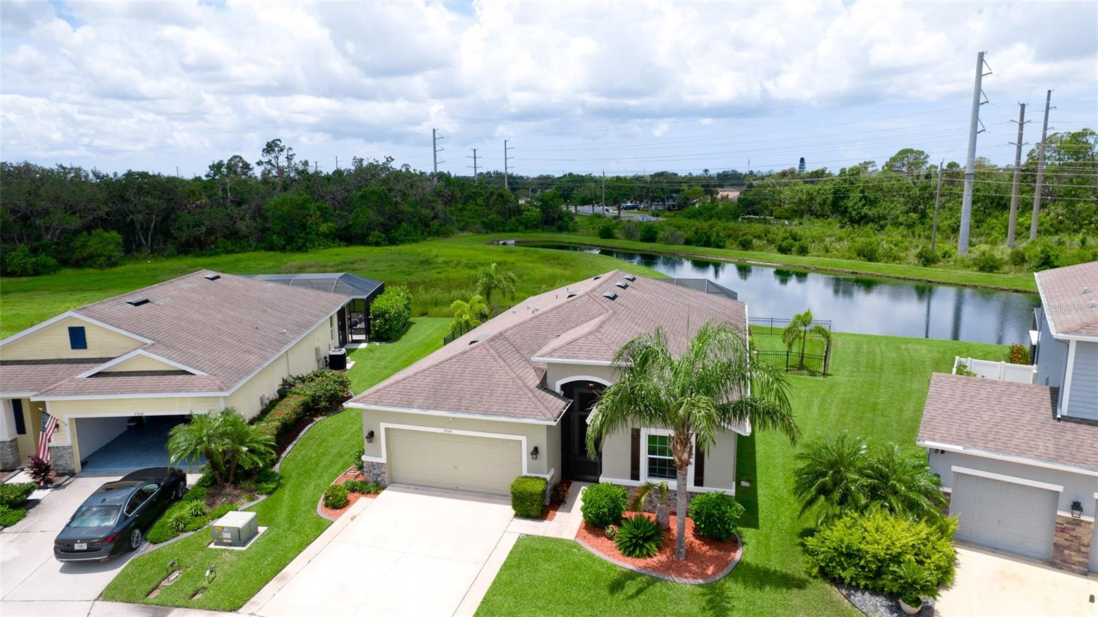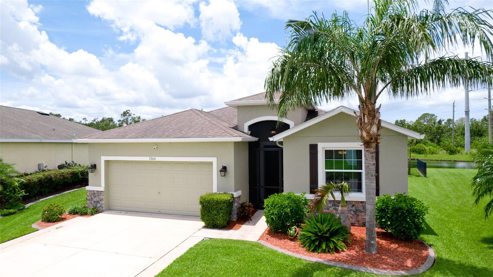 Welcome to this immaculately maintained original home in the desirable community of Stoneledge. With 3 bedrooms, a den, and 2.5 baths across 2,035 square feet, this residence offers a seamless blend of comfort, style, and thoughtful upgrades. Freshly painted interior 11/2025. Nestled on a fully fenced homesite overlooking a tranquil pond, the backyard is your private oasis—complete with an extended screened lanai, pavered patio, Edison-style lighting, and concrete under the rear fence for added security. Enjoy spectacular evening sunsets right from your backyard. Inside, you’ll find tile flooring throughout the main living areas, luxury vinyl waterproof plank flooring in the office, and carpet in primary & one guest bedroom. The wide entry foyer, custom crown molding, updated baseboards, and plantation shutters at the dining room and office enhance the home’s elegant character. The gourmet kitchen is equipped with stainless steel appliances, 42-inch wood cabinetry, granite countertops, under-cabinet lighting, USB-equipped, pendant lights over the island, and slide-out drawers in the lower cabinets. A pantry with durable steel shelving completes the space. Additional highlights include: Accordion and roll-down hurricane shutters throughout, included generator, 20-amp service in the den for an extra fridge or freezer, Primary suite with double vanities, soaking tub, and separate shower, large front-load washer and dryer with storage shelves, closet upgrades with double-door entry and blackout curtains in one guest room. Low monthly HOA of just $92, covering ponds, common areas, entrance, dog park, and mailboxes. New AC system (Feb 2024) with transferable 10 year warranty. Average electric bill of just $125/month. Every detail has been thoughtfully designed and lovingly cared for—this is truly a move-in-ready gem in a sought-after neighborhood.