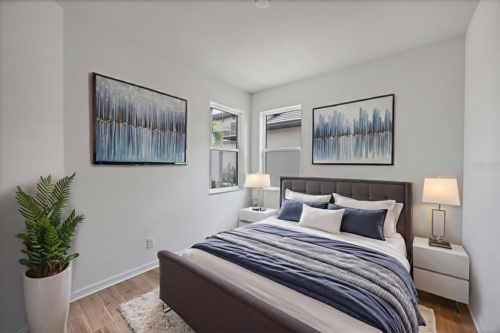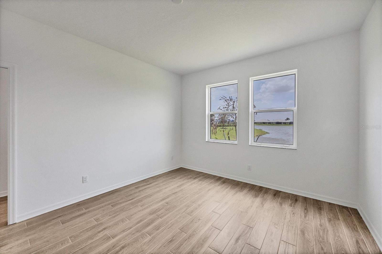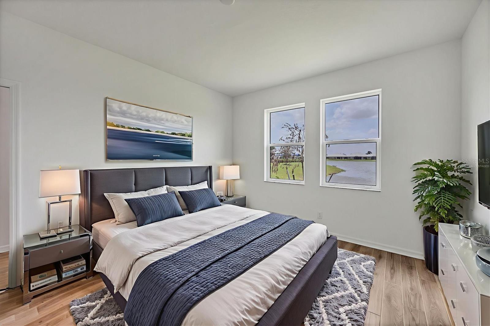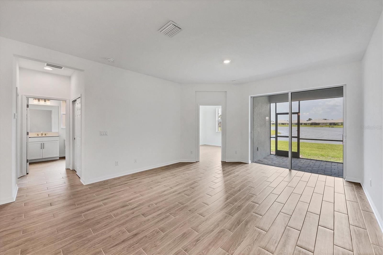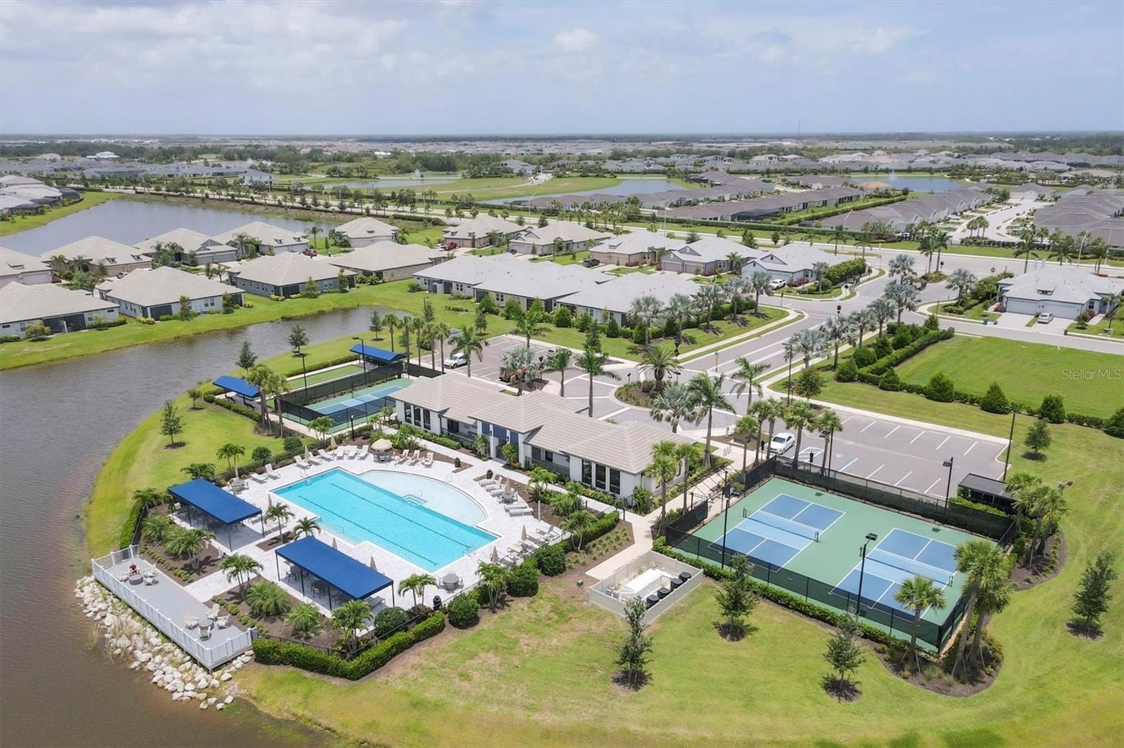 One or more photo(s) has been virtually staged. Why wait to build when you can move right into this new, never-lived-in Emerald model by M/I Homes? Enjoy serene, long water views from this beautifully designed maintenance-free villa near the Sweetwater Villas amenity center and pool. This thoughtfully laid-out home features two bedrooms plus a versatile den with double doors, ideal as a home office, guest room or hobby space. The open-concept floor plan flows seamlessly from the spacious great room to the paver, screened lanai overlooking the lake, an ideal setting for relaxing or entertaining. Inside, you'll find neutral tile flooring throughout, bright white paint and an elegant kitchen featuring white cabinetry, new stainless steel appliances, quartz countertops, a breakfast bar and a sleek glossy white backsplash. The primary suite offers peaceful lake views, a large walk-in closet, and an en-suite bath with dual sinks, quartz counters, white cabinetry and a walk-in glass-enclosed shower. The guest suite is privately tucked away and includes a stylish bath with a marbled tile walk-in shower. A two-car garage and paver driveway complete this move-in-ready home. Enjoy effortless, maintenance-free living with professional landscaping and irrigation included, all in a gated neighborhood offering plentiful resort-style amenities for a carefree lifestyle. Sweetwater at Lakewood Ranch offers an exceptional array of amenities, including two amenity centers, heated pool, playground, multi-purpose sports court, pickleball courts, bocce ball courts, a 24-hour fitness room, social hall, festival lawn and amphitheater. Easy living, lock and leave, ideal for a winter getaway! Your new home awaits in this vibrant, amenity-rich community. This is Florida living at its finest.