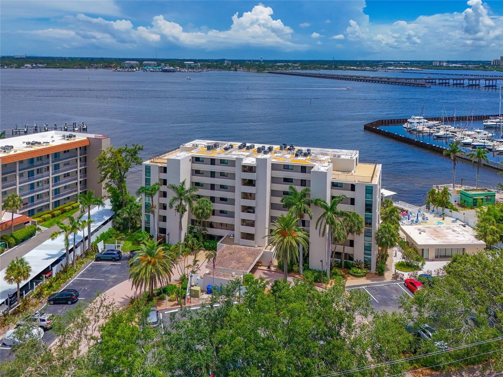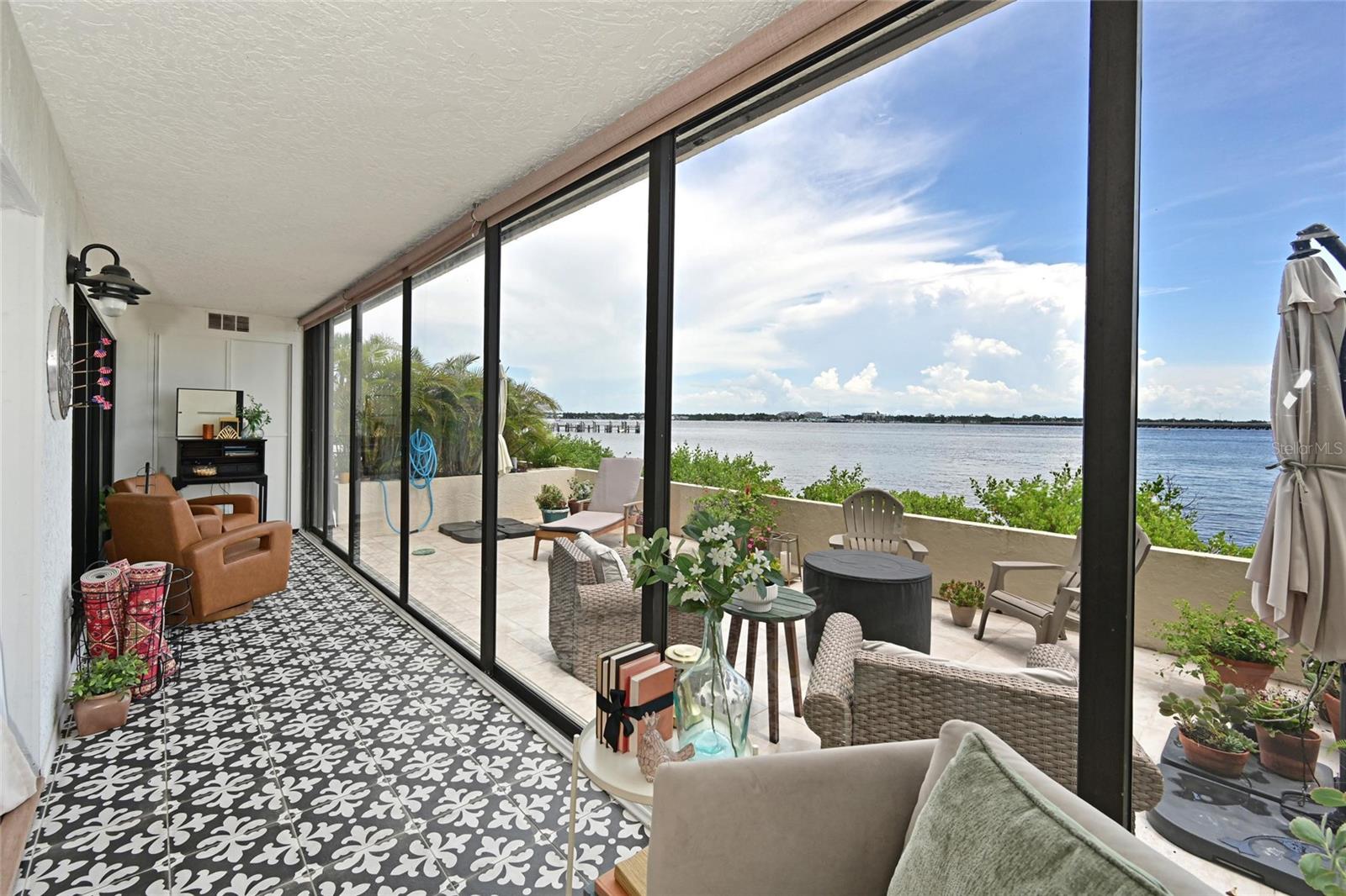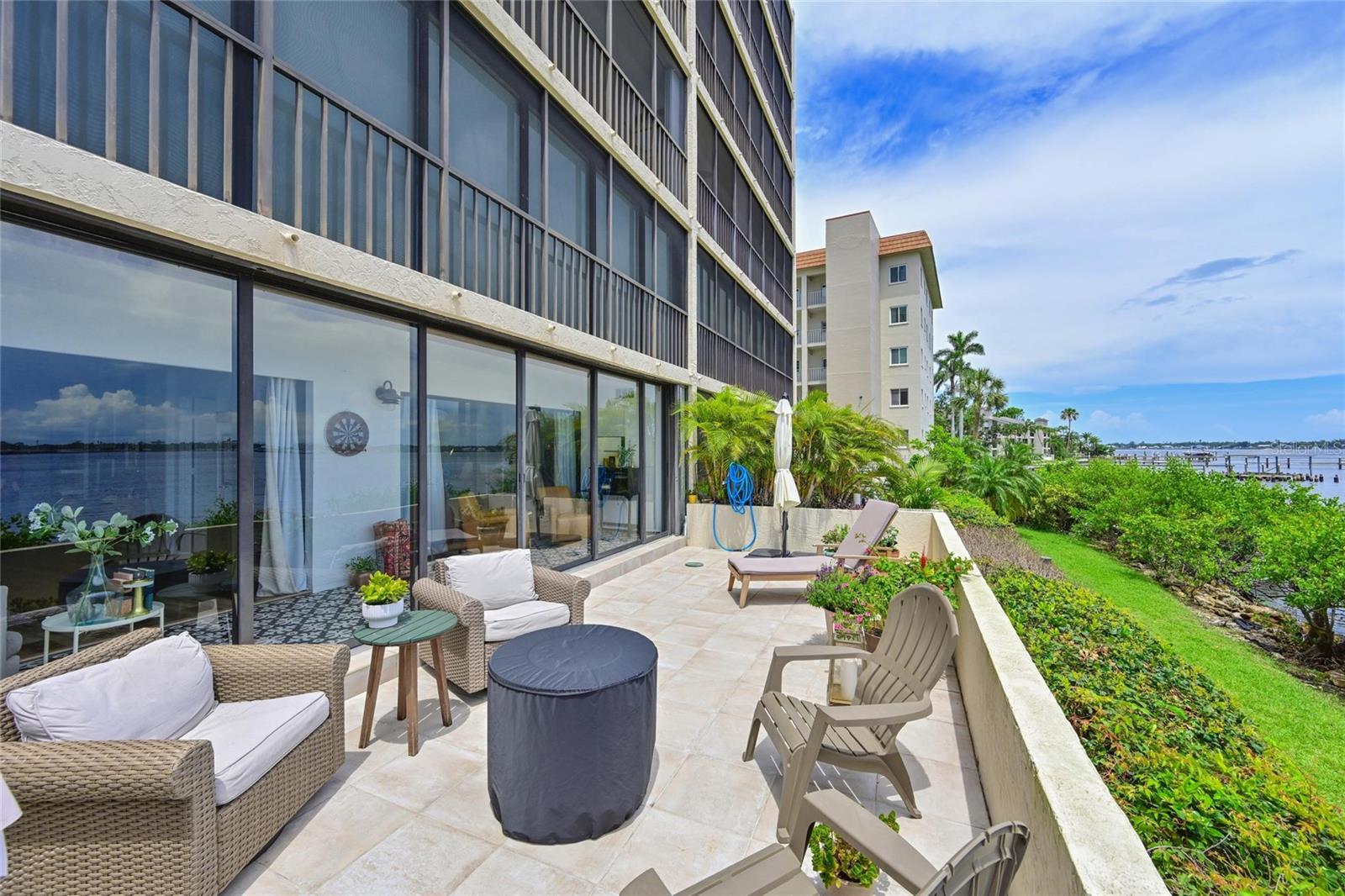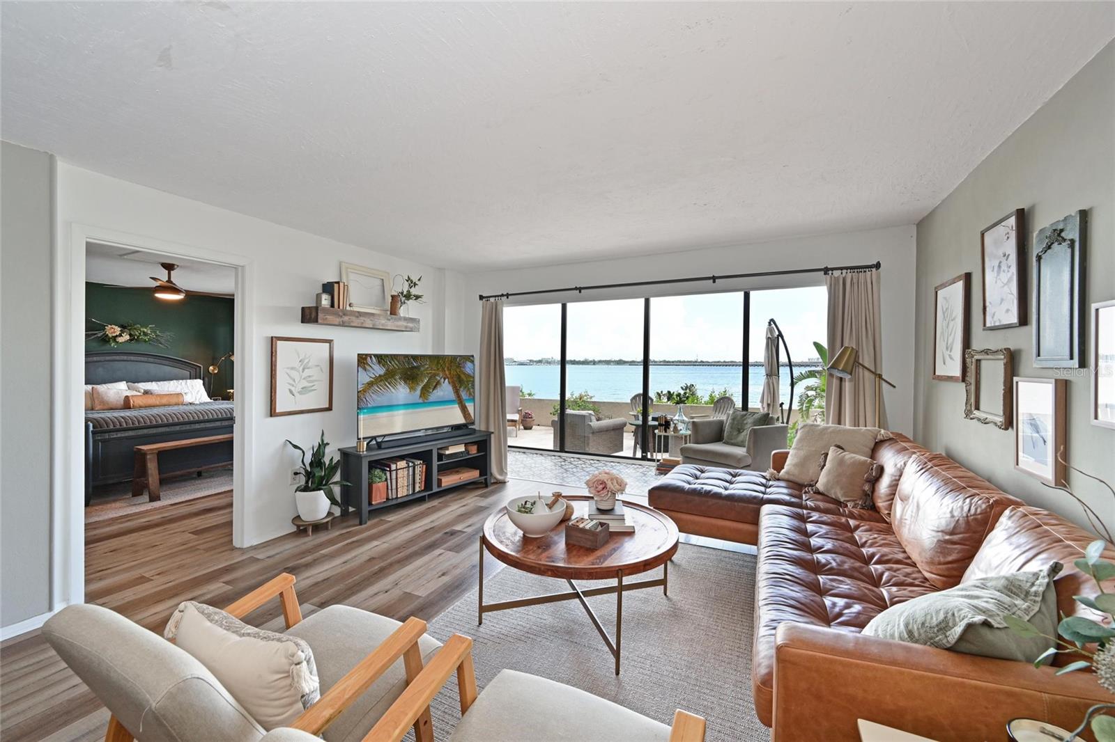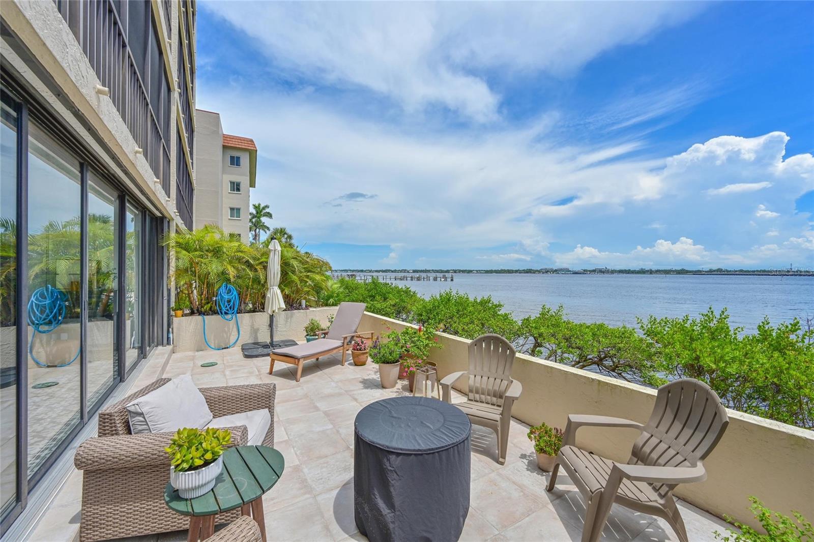 Direct Waterfront Condo with Stunning Panoramic River Views. If you're seeking an alluring ambiance paired with exceptional waterfront living, look no further—this beautifully remodeled 2-bedroom, 2-bath condo is the one. Perfectly positioned in a direct waterfront location, it boasts unobstructed, panoramic views of the Manatee River from the great room, kitchen, dining, master suite, and the oversized outdoor Veranda. Step inside and feel immediately at home in the warmth and character of this thoughtfully renovated residence. The open-concept great room is anchored by luxury vinyl plank flooring, designer lighting, and stylish accent wall, creating a welcoming and modern space for relaxing or entertaining. The gourmet kitchen is both beautiful and functional, featuring quartz countertops, stainless steel appliances, a double oven range, tile backsplash, tray ceiling, recessed lighting, and plantation shutters—all elevated by elegant finishes and attention to detail. The spacious master bedroom offers breathtaking water views and access to an ensuite bath with quartz countertops, showcasing high-end flooring, framed mirror, seamless glass shower doors, and dual closets. The guest bedroom and bath are equally refined with upgraded tile, plantation shutters, framed mirror, and generous closet space. There is additional living space in an enclosed lanai area that opens through sliders to the extended outdoor living space of the Veranda. Additional features include a stackable washer/dryer, impact-resistant front windows, new tile on Veranda and a 2023 AC unit. HOA fees cover water, sewer, trash, cable TV, and WiFi—adding ease to a maintenance free lifestyle. Outdoor enthusiasts will love the direct shoreline access, ideal for fishing or launching a kayak. A fishing kayak is included and kayak storage is conveniently located under the pool deck. The complex also offers a private beach, plus resort-style amenities: pool, spa, clubhouse, sauna, billiards, and a scenic water gazebo. Situated on the west end of the Riverwalk, you’re just steps from Twin Dolphins Marina—perfect for boaters—and close to Pier 22 for waterfront dining. Explore the vibrant downtown Bradenton scene, enjoy the weekly Farmers Market, or take a short drive to the world-class beaches of Sarasota, Bradenton, St. Pete, and near by Anna Maria Island. With easy access to both Sarasota and Tampa airports, this location is as convenient as it is captivating.