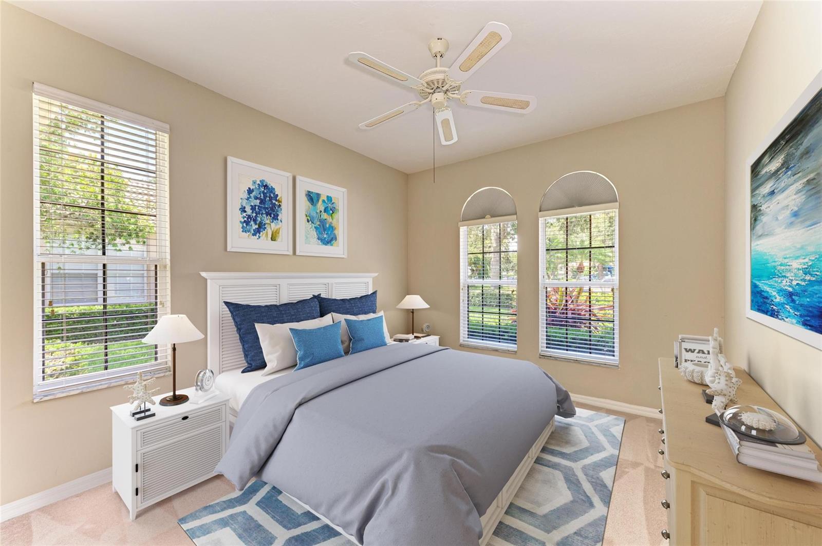 One or more photo(s) has been virtually staged. GREAT OPPORTUNITY TO BE ABLE TO PURCHASE IN THE ESTEEMED NEIGHBORHOOD OF "THE GREENS" WITHIN THE IMG COUNTRY CLUB COMMUNITY. Just reduced for exceptional value. Situated on a choice, deep lot on the cul-du sac with Eastern exposure, this charming home satisfies all the wish list. Pristine interiors are complimented by volume ceilings with recessed lighting, ceiling fans, tile floors, plantation shutters and decorative columns and arches. Updated kitchen with granite counters, tiled backsplash & generous cabinetry with upgraded hardware. A flowing, open plan with split bedroom design....guest bedroom plus a den/study with closet (easily converted to a 3rd BR) on one side with the primary bedroom in the rear enjoying restful views out to the private greenbelt with heavily treed preserve beyond...excellent walk-in closet with lovely bath featuring contemporary double square sinks, separate shower with new shower door and jacuzzi garden tub. This home is value packed with new a/c system (June 2024) PLUS a quality new barrel tile roof (September 2024). For those not wanting the care of a pool....this home has a private rear patio, but is pool free! (with room to add if so desire.) Interior laundry room and two car garage complete the list. The Greens is a very pretty neighborhood of only 43 single family homes with appealing Southern Mediterranean architecture and superior concrete block construction. Surrounded by preserves, lakes and the IMG golf course with sidewalks and garden benches around center lake encouraging nature walks with friends and pets. The ease of maintenance free yard care is included in the low HOA along with cable, Internet and outside water. Moments to golf, close to IMG Sports Academy and an easy zip to our renown Gulf beaches as well as the cultural arts of Sarasota. If you are ready for the Florida lifestyle now - this ideal home is vacant and available for immediate occupancy. Don't suffer through another cold winter when this wonderful, sunny home could be yours! FHA and VA mortgage options.
