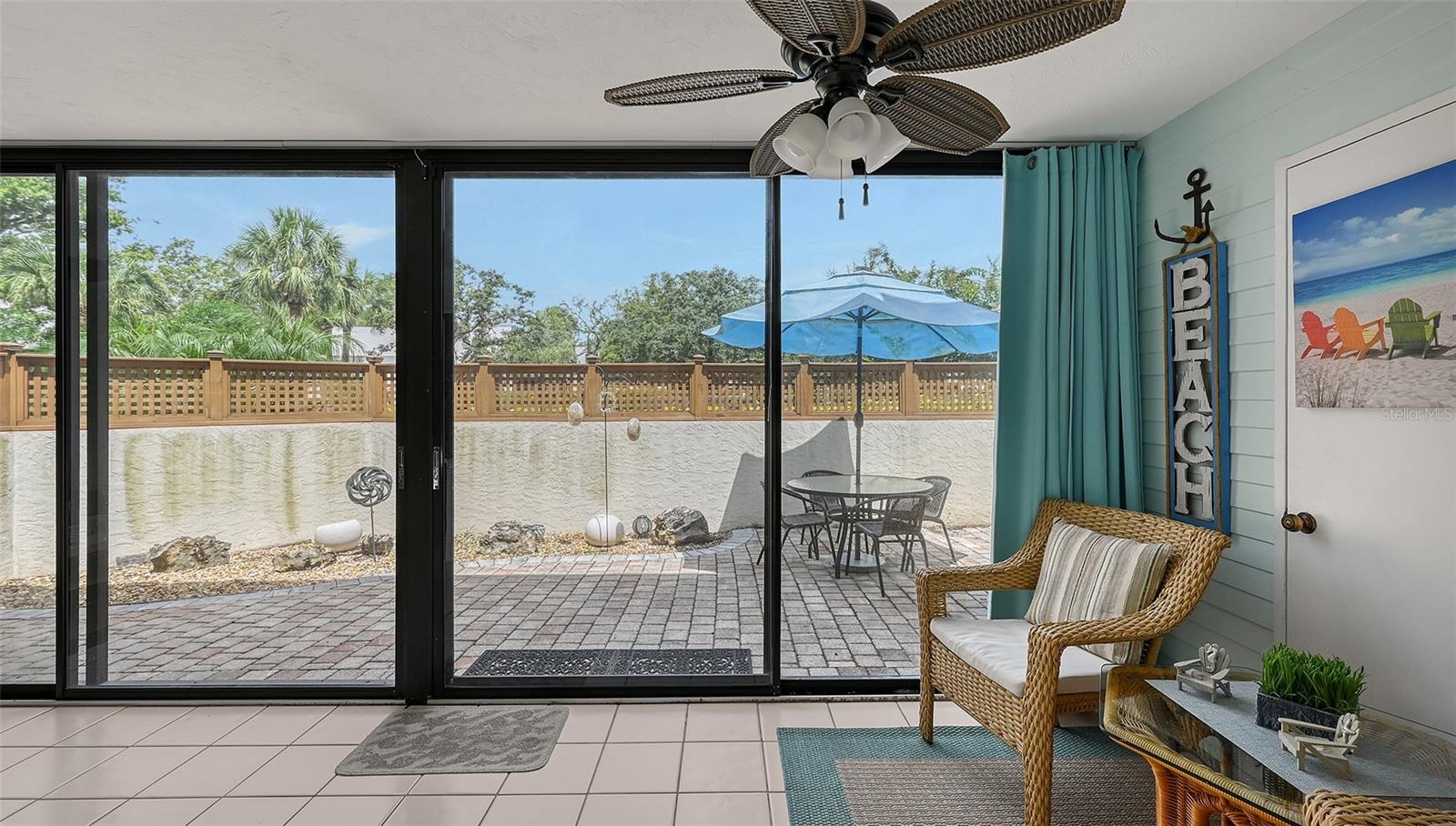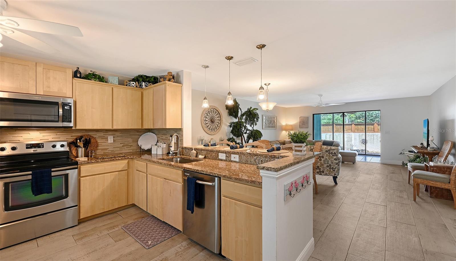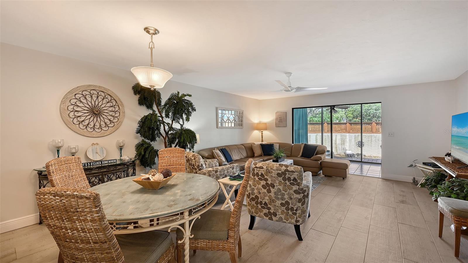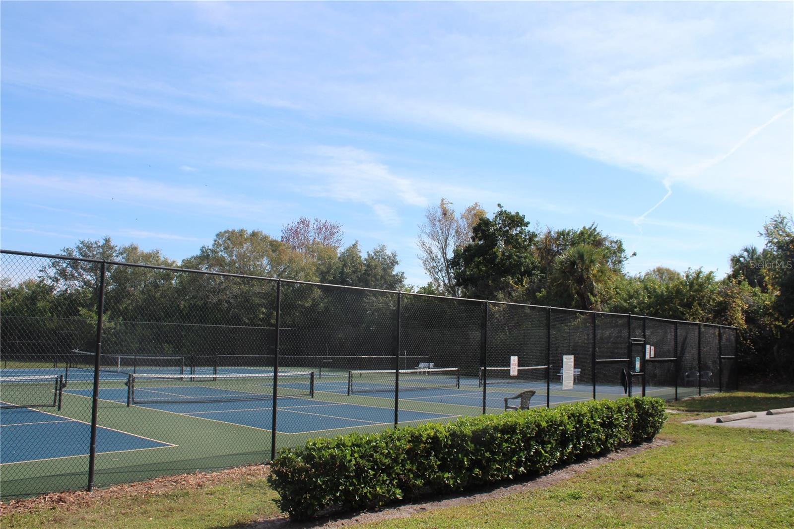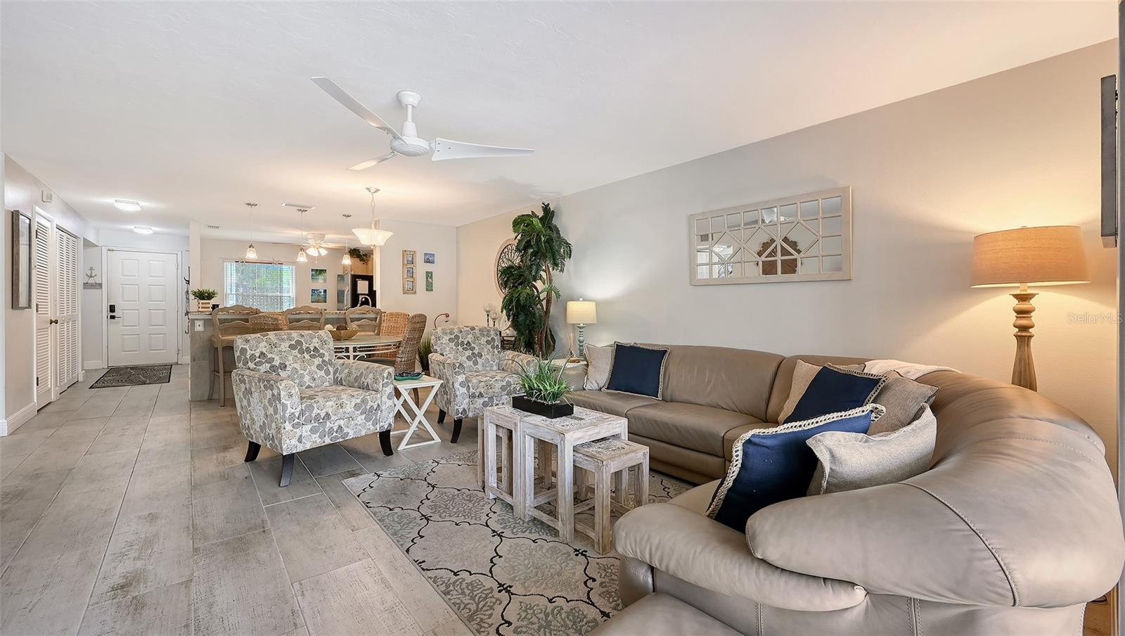 Convenience of a 1st floor corner unit is just the beginning of all the positives this home has to deliver. First, open floor plan with spaciousness, relaxing colors, neutral plank tile flooring throughout, granite counters, stainless steel appliances & location is what Florida comfort living is all about! Starting with the large open eat in kitchen, complete with a new hurricane window, which looks out to your front walkway & private front patio. Large floor to ceiling pantry & numerous cabinets for the gourmets' essentials, in addition to a generous amount of counter space for food prep & entertaining. Right off the kitchen, is a large laundry closet with storage cabinets up above & a newer full-size washer & dryer. Within the open kitchen is counter area for bar stool gatherings & meals, then onto the dining area & living room. The large, enclosed lanai is directly off of the living room. This area has a wall of sliders with screens to enjoy the fall/winter breezes. There is also a large storage closet, right within the lanai. Perfect spot for your bicycles, beach gear, holiday items & general storage, yes, it's that big! Beyond the lanai is an enclosed 3/4 wall, just high enough for privacy but low enough to see over. There's also a door for easy access for a quick walk to the tennis/pickle ball courts. Once back inside, there is also a slider to your sizeable primary bedroom. The elation that comes with this room is the dual sink vanity with the commode & tub area just beyond & separated by a pocket door for privacy. Also within this area is a generous size walk in closet. Once you leave the primary you enter into a short hallway before entering back into the main areas. Within this hallway, you have a double wide closet, use it for extra storage, coats/jackets, paper supplies, kitchen appliances, the sky is the limit. Then, back into the main area, head towards the front, here you will find the guest bathroom along with a fully tiled walk-in shower. Adjacent to the guest bathroom is relaxing guest bedroom along with a very large walk-in closet. The guest room has a full slider which allows natural light to permeate in through the very decorative steel security door. The neutral design & the warm color palate is very inviting & tranquil. Numerous ceiling fans throughout add to the ambiance. the barstool foot wall also has the tile running up it to prevent your guests from leaving their footprints behind. The wall is completely maintenance free & beautiful. Two pools along with hot tubs are close by to enjoy. Each pool area also has restrooms for convenience. This court had a new roof installed & completed in September along with new gutters. The air conditioners were put on platforms & anchored down. The Spring Lakes/Wildewood Spring Community is a beautiful place to call home or choose as your seasonal retreat. It spans 88 acres of meandering roads, several ponds, numerous species of birds for the enthusiast to put the binoculars & camera to use. Enjoy walks catching up with friends & letting fido make some new friends as well. It's also 5 minutes to the Campus of IMG, close proximity to airports, the closest, just 15 minutes away, beaches are a straight run just 15 minutes away, restaurants galore, from quick serve to 5 star gourmet dining. Other fun things to do are: playing a round of golf, fishing boating, theater, spring training, museums, shopping & boutiques. Water Heater 5/25, A/C 2019, Roof 10/24