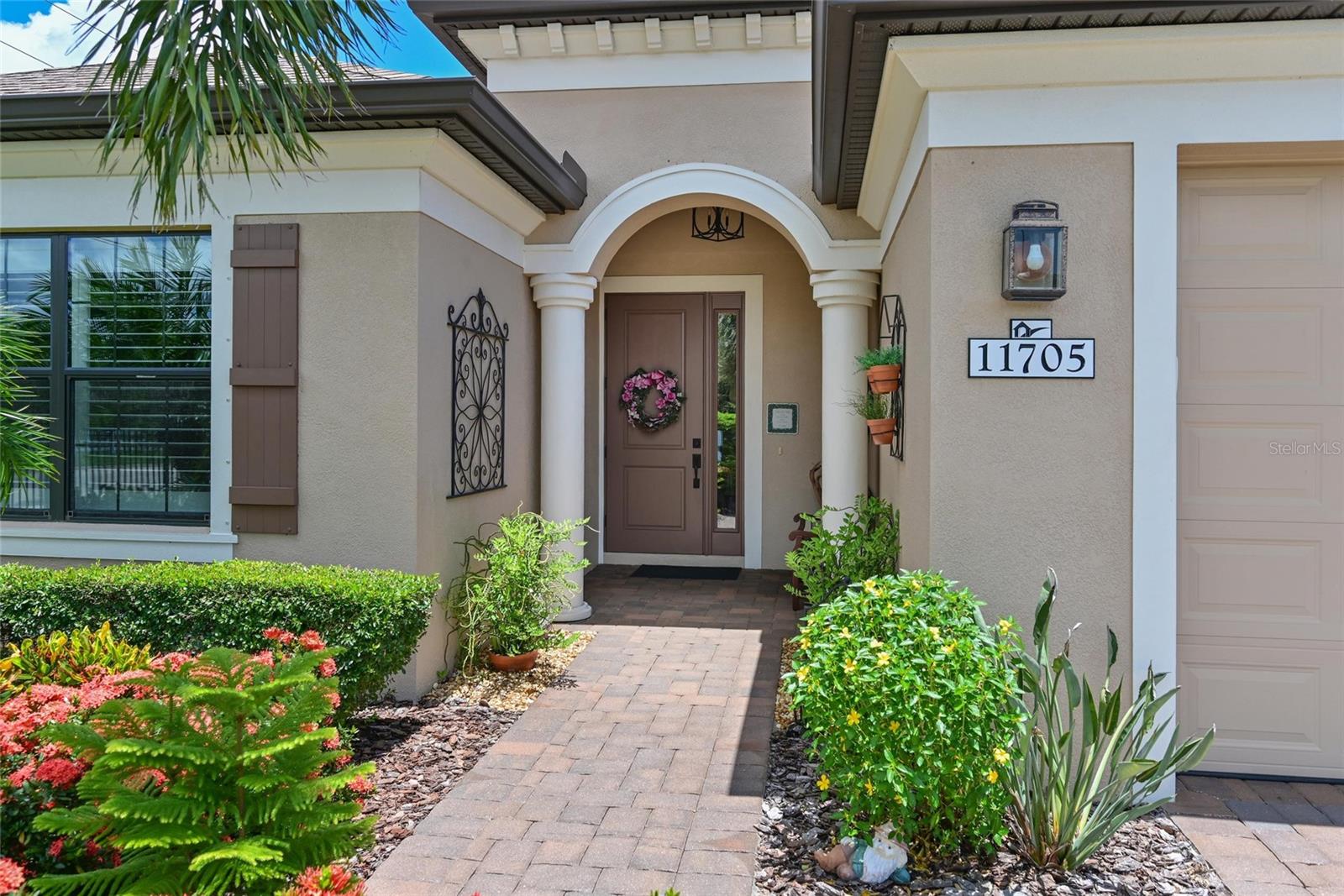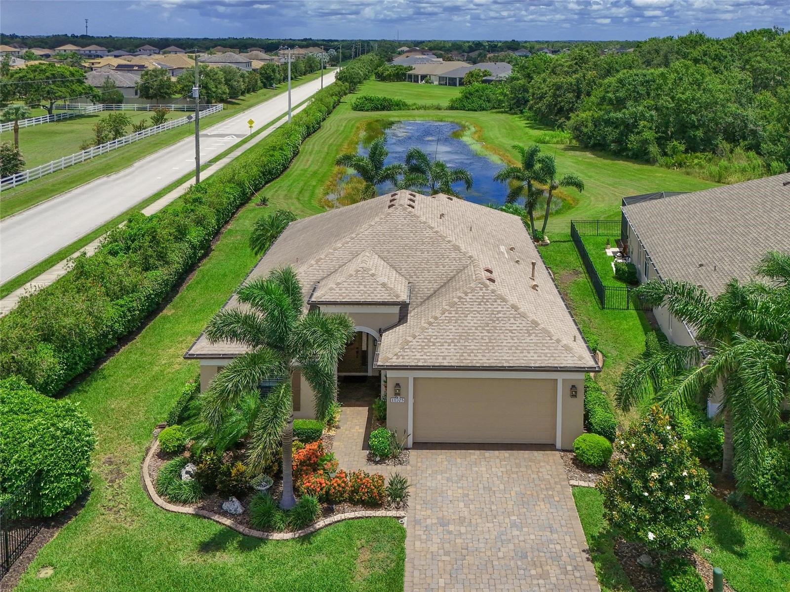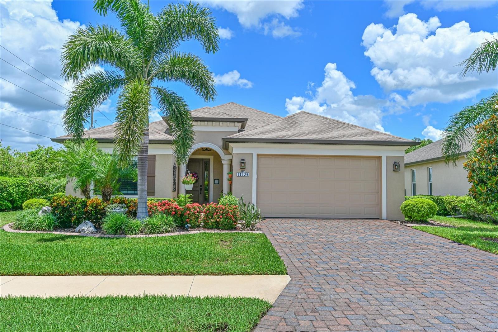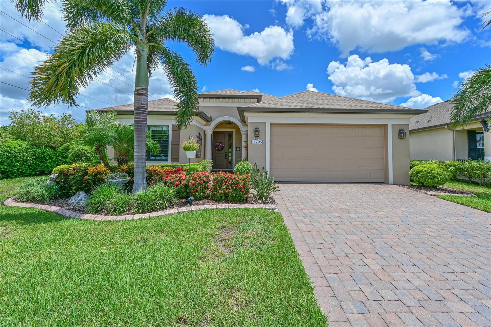 Impeccably Maintained Home in the Gated Community of Greyhawk Landing. Enjoy serene lake views and a lifestyle of comfort in this beautifully cared-for home, set on a premium lot with manicured landscaping and a paver driveway. Inside, a welcoming foyer greets you with warm wood-look plank tile flooring and 8’ doors, setting the tone for the stylish touches found throughout. This thoughtfully designed 2-bedroom, 2-bath home includes a versatile den or home office, perfect for today’s flexible living needs. The popular great room floor plan features a spacious living area with a tray ceiling accented by decorative wood beams and crown molding throughout the entire home, creating an elegant ambiance. The chef’s kitchen is both functional and modern, equipped with stainless steel appliances, granite countertops, gas stove, under-cabinet lighting, a double garbage pull-out, tile backsplash and a stylish Café refrigerator. Upper and lower cabinet crown molding and a closet pantry complete the space with efficiency and style. The spacious primary suite features luxury vinyl flooring, a tray ceiling, plantation shutters, and a generous walk-in closet. The ensuite bath is beautifully upgraded with quartz countertops, dual sinks, modern lighting and faucets, a tiled-to-ceiling walk-in shower, and plantation shutters. Enjoy the Florida lifestyle on the covered screened, paver lanai or relax under the modern pergola overlooking the tranquil lake. The split floor plan offers privacy for guests or family members, with a secondary bedroom and bath located at the front of the home. Additional highlights include: Whole-house water filtration system, Plantation shutters throughout, dedicated laundry room with front-load washer and dryer, sink, and cabinetry, mudroom entry from the garage with barn wood bench and storage, gutters, curbed landscaping, two-car garage with overhead hanging storage and included hurricane shutters. Residents have access to exceptional community amenities. Featuring 2 resort-style pools, 2 Community centers, Playgrounds, fitness center, Tennis, pickleball and basketball courts, soccer and baseball fields, bass-stocked lakes, and miles of nature trails. Situated in the heart of Sarasota/Bradenton with close proximity to world-renowned Beaches, and great shopping and dining at UTC Mall. Easy commute to Sarasota and Tampa airports. This home combines elegant upgrades with practical features in one of the area’s most desirable gated communities.