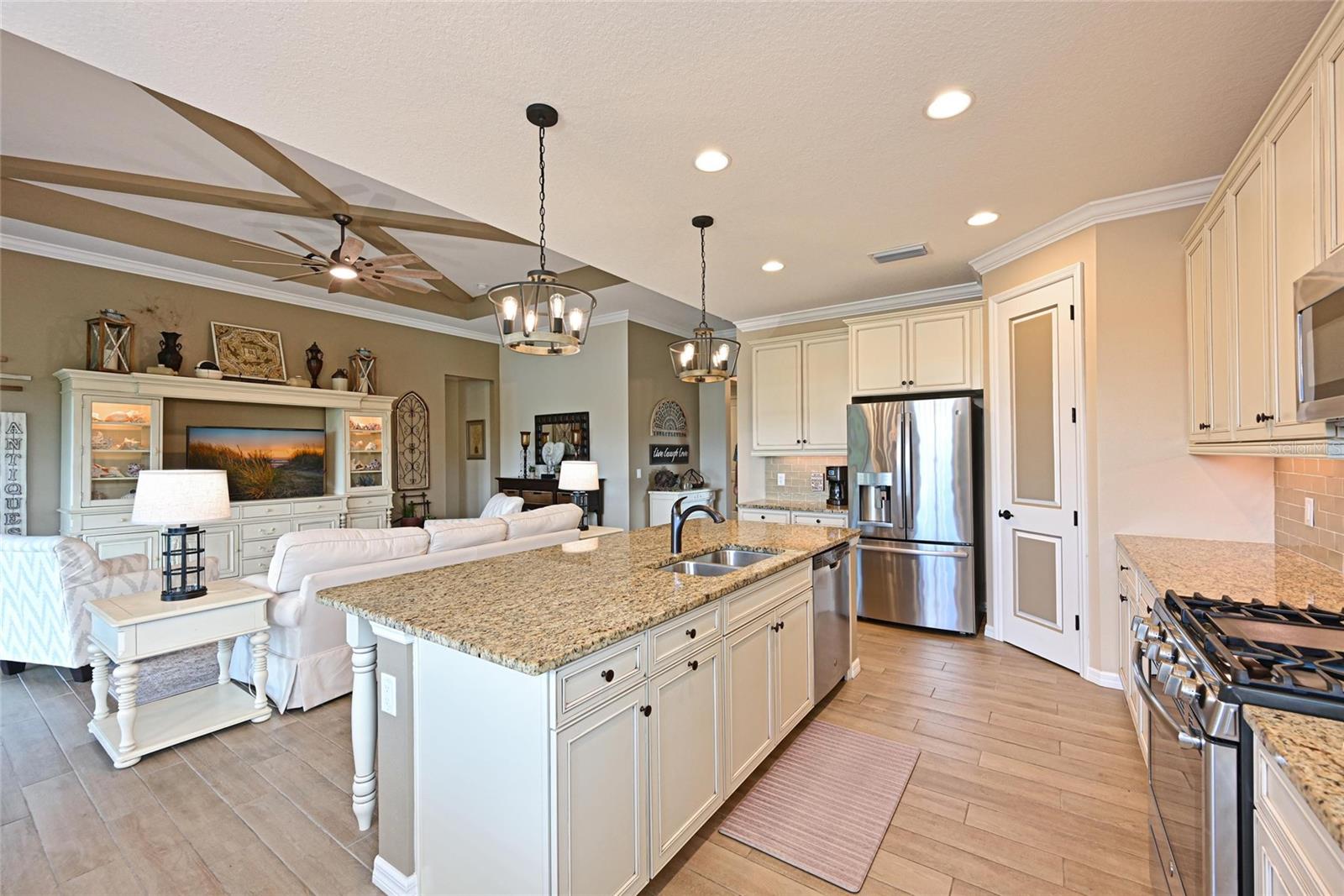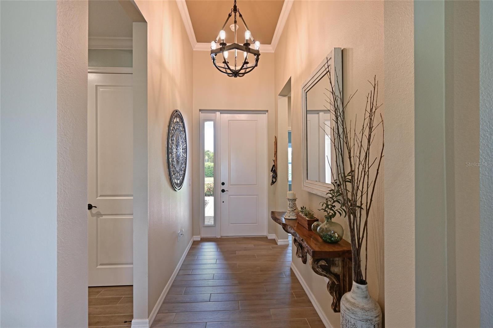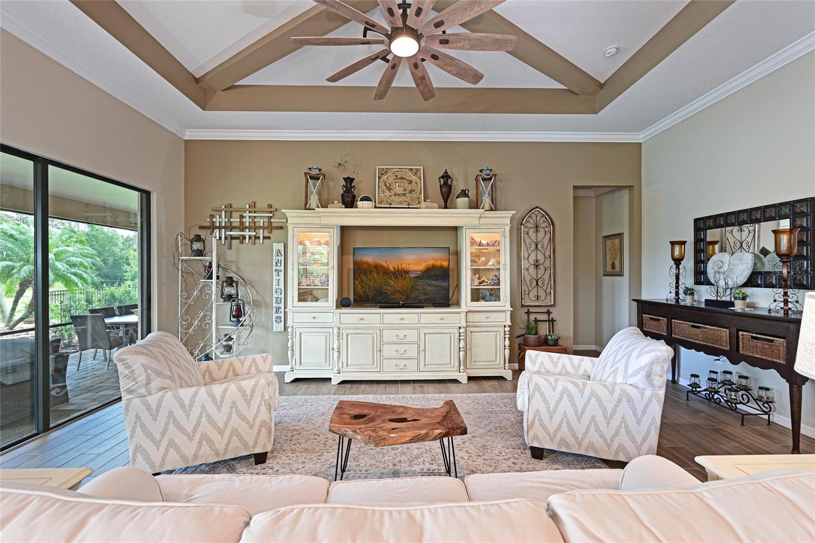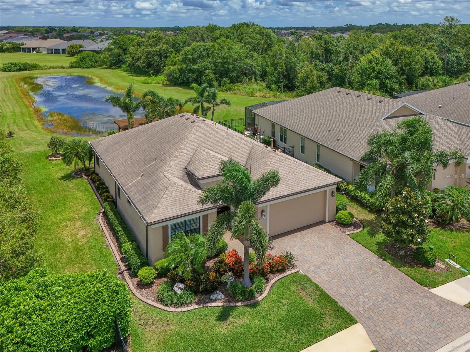 Impeccably Maintained Home in the Gated Community of Greyhawk Landing. Enjoy serene lake views and a lifestyle of comfort in this beautifully cared-for home, set on a premium lot with manicured landscaping and a paver driveway. Inside, a welcoming foyer greets you with warm wood-look plank tile flooring and 8’ doors, setting the tone for the stylish touches found throughout. This thoughtfully designed 2-bedroom, 2-bath home includes a versatile den or home office, perfect for today’s flexible living needs. The popular great room floor plan features a spacious living area with a tray ceiling accented by decorative wood beams and crown molding throughout the entire home, creating an elegant ambiance. The chef’s kitchen is both functional and modern, equipped with stainless steel appliances, granite countertops, gas stove, under-cabinet lighting, a double garbage pull-out, tile backsplash and a stylish Café refrigerator. Upper and lower cabinet crown molding and a closet pantry complete the space with efficiency and style. The spacious primary suite features luxury vinyl flooring, a tray ceiling, plantation shutters, and a generous walk-in closet. The ensuite bath is beautifully upgraded with quartz countertops, dual sinks, modern lighting and faucets, a tiled-to-ceiling walk-in shower, and plantation shutters. Enjoy the Florida lifestyle on the covered screened, paver lanai or relax under the modern pergola overlooking the tranquil lake. The split floor plan offers privacy for guests or family members, with a secondary bedroom and bath located at the front of the home. Additional highlights include: Whole-house water filtration system, Plantation shutters throughout, dedicated laundry room with front-load washer and dryer, sink, and cabinetry, mudroom entry from the garage with barn wood bench and storage, gutters, curbed landscaping, two-car garage with overhead hanging storage and included hurricane shutters. Residents have access to exceptional community amenities. Featuring 2 resort-style pools, 2 Community centers, Playgrounds, fitness center, Tennis, pickleball and basketball courts, soccer and baseball fields, bass-stocked lakes, and miles of nature trails. Situated in the heart of Sarasota/Bradenton with close proximity to world-renowned Beaches, and great shopping and dining at UTC Mall. Easy commute to Sarasota and Tampa airports. This home combines elegant upgrades with practical features in one of the area’s most desirable gated communities.