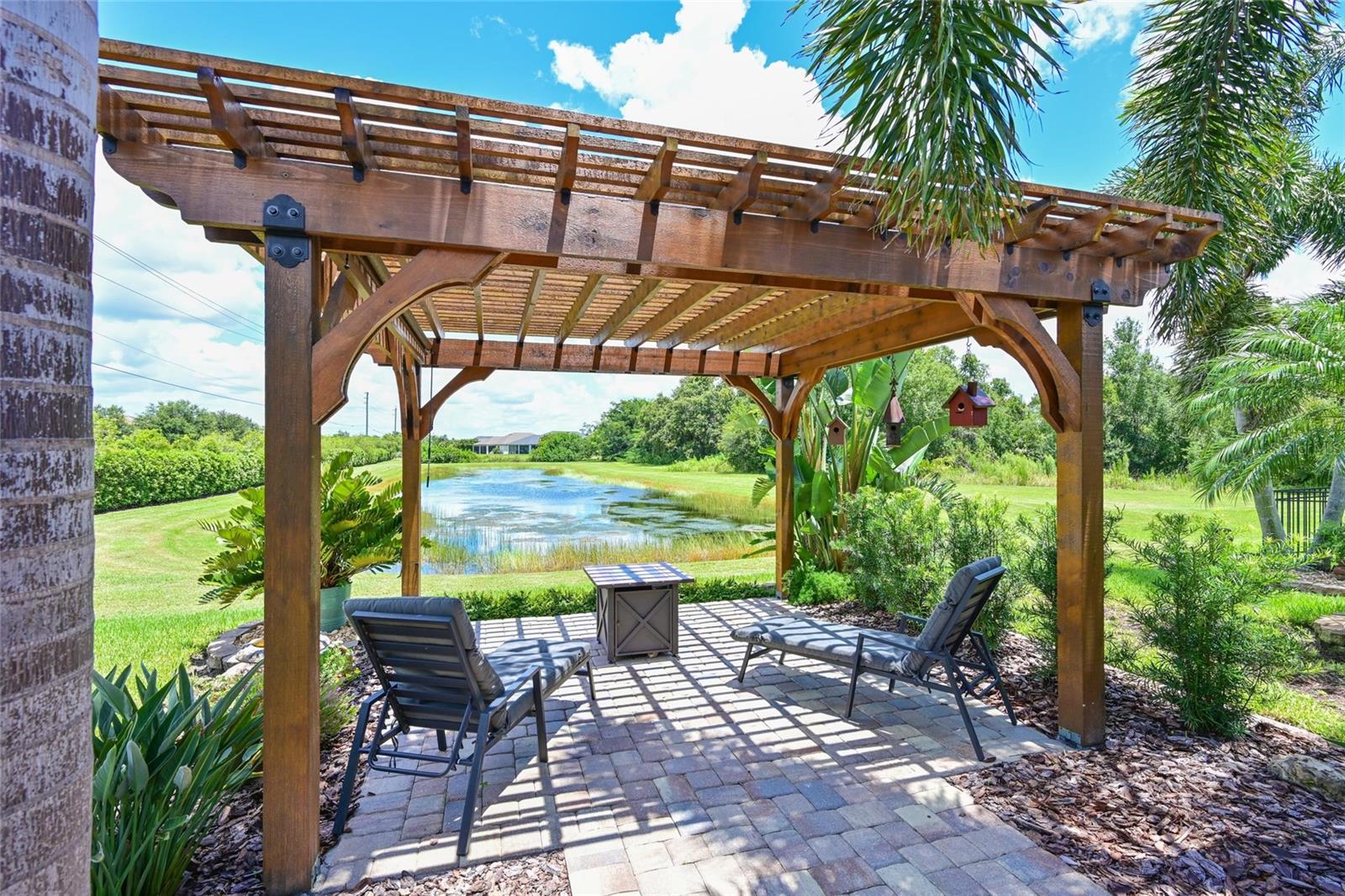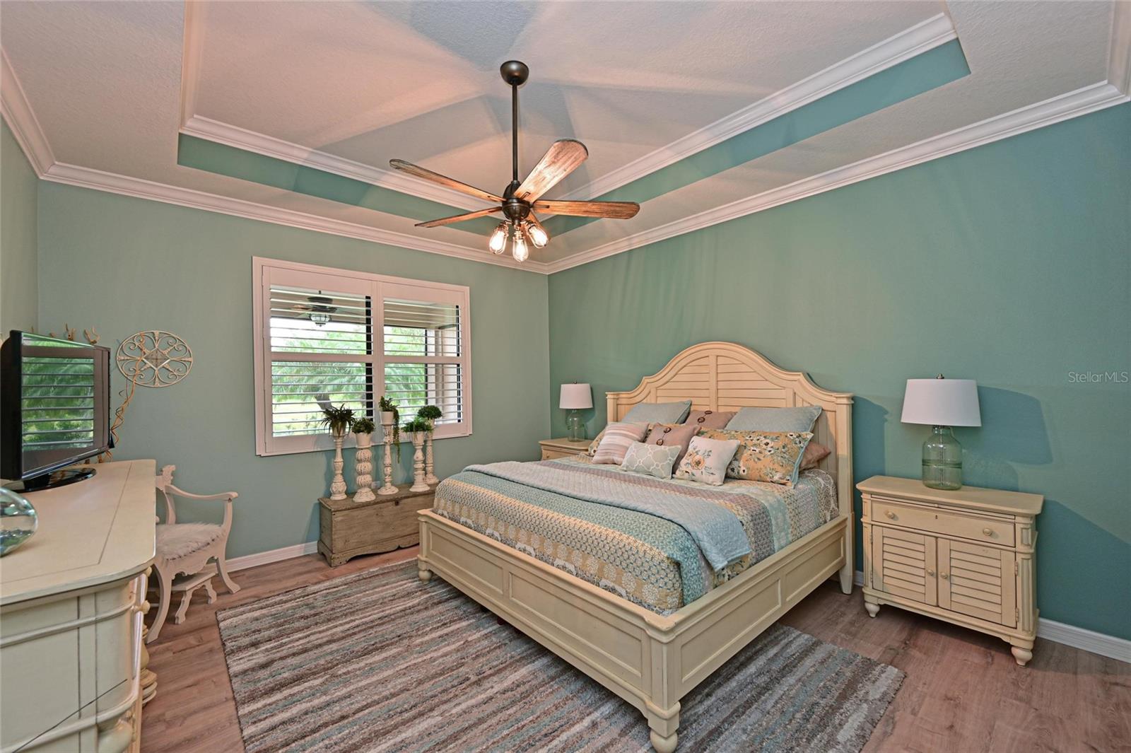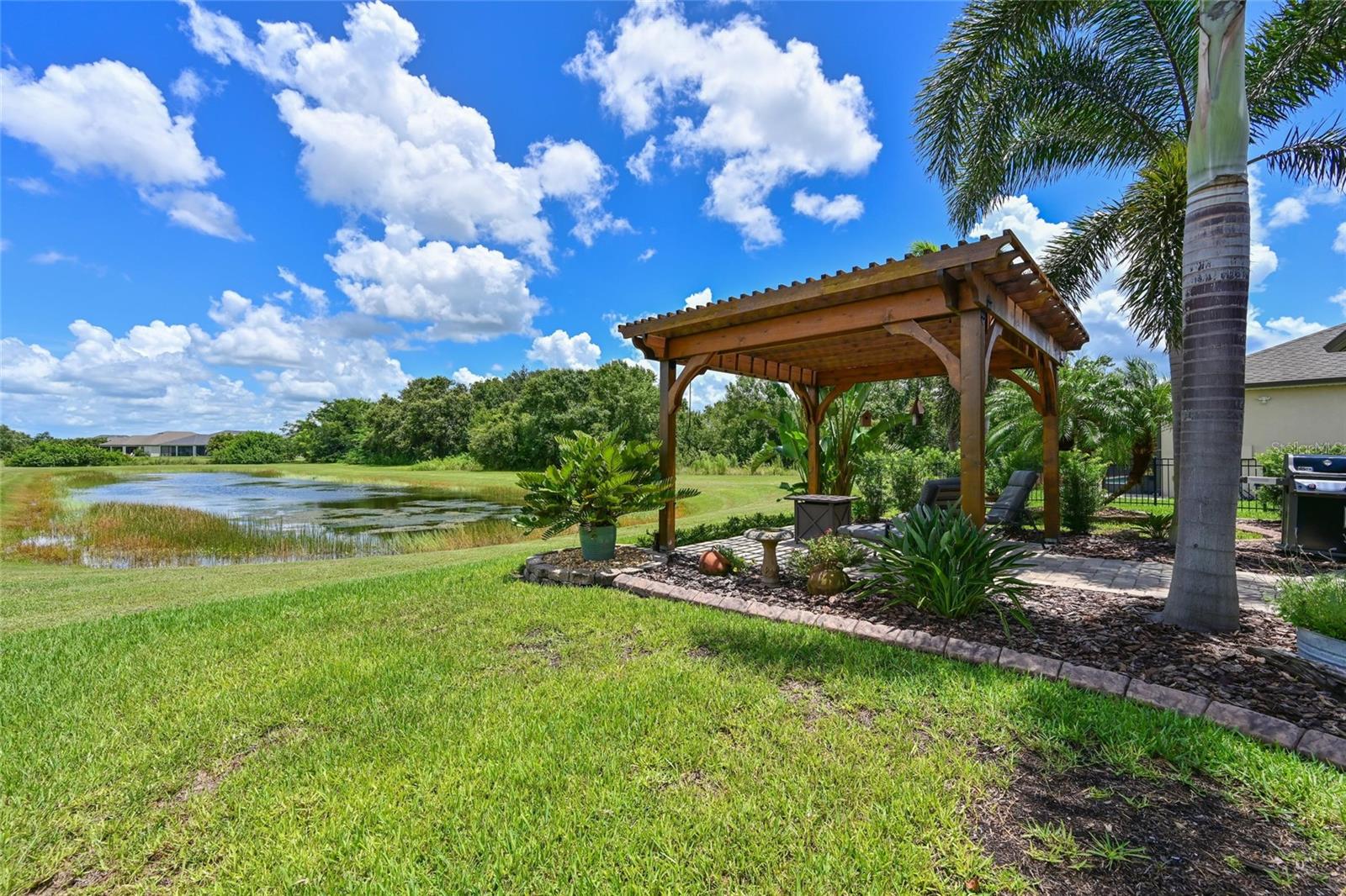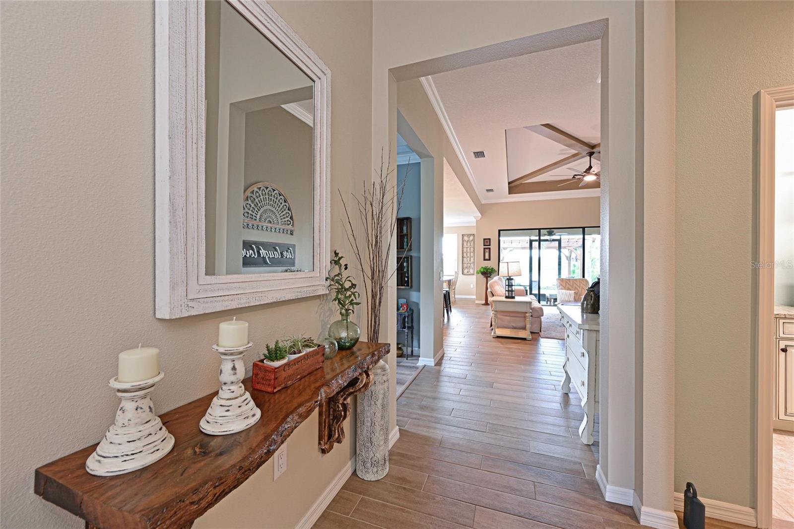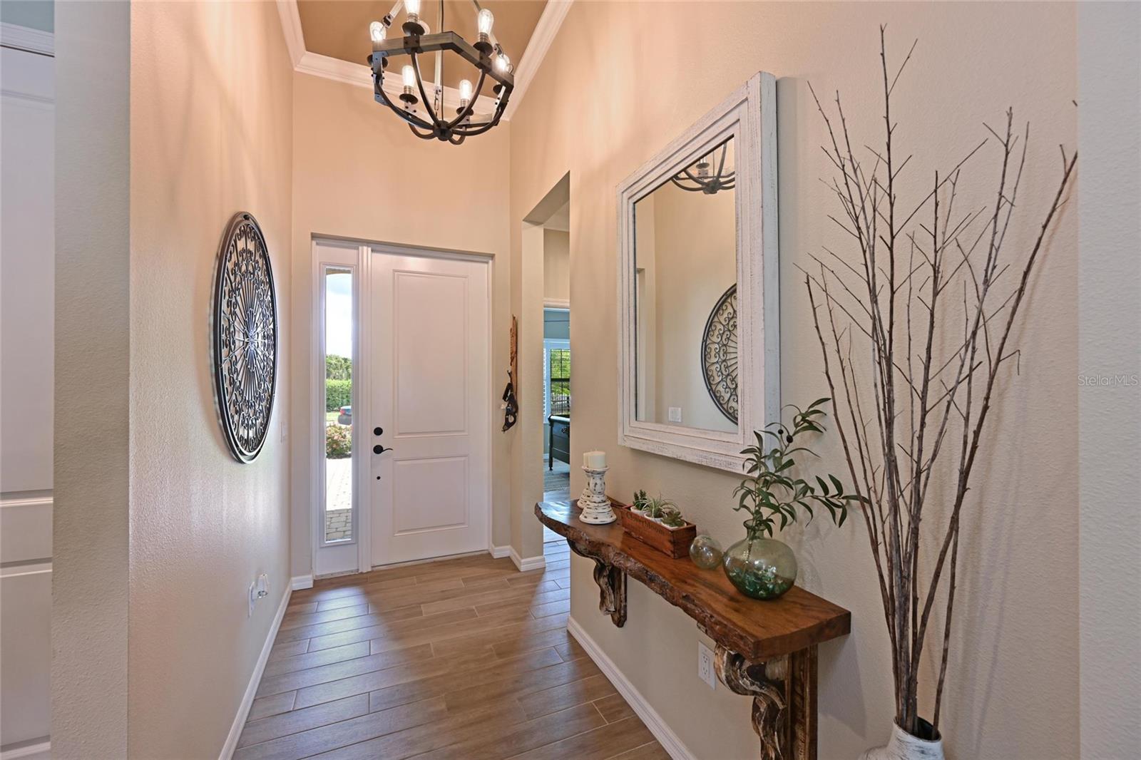 Impeccably Maintained Home in the Gated Community of Greyhawk Landing. Enjoy serene lake views and a lifestyle of comfort in this beautifully cared-for home, set on a premium lot with manicured landscaping and a paver driveway. Inside, a welcoming foyer greets you with warm wood-look plank tile flooring and 8’ doors, setting the tone for the stylish touches found throughout. This thoughtfully designed 2-bedroom, 2-bath home includes a versatile den or home office, perfect for today’s flexible living needs. The popular great room floor plan features a spacious living area with a tray ceiling accented by decorative wood beams and crown molding throughout the entire home, creating an elegant ambiance. The chef’s kitchen is both functional and modern, equipped with stainless steel appliances, granite countertops, gas stove, under-cabinet lighting, a double garbage pull-out, tile backsplash and a stylish Café refrigerator. Upper and lower cabinet crown molding and a closet pantry complete the space with efficiency and style. The spacious primary suite features luxury vinyl flooring, a tray ceiling, plantation shutters, and a generous walk-in closet. The ensuite bath is beautifully upgraded with quartz countertops, dual sinks, modern lighting and faucets, a tiled-to-ceiling walk-in shower, and plantation shutters. Enjoy the Florida lifestyle on the covered screened, paver lanai or relax under the modern pergola overlooking the tranquil lake. The split floor plan offers privacy for guests or family members, with a secondary bedroom and bath located at the front of the home. Additional highlights include: Whole-house water filtration system, Plantation shutters throughout, dedicated laundry room with front-load washer and dryer, sink, and cabinetry, mudroom entry from the garage with barn wood bench and storage, gutters, curbed landscaping, two-car garage with overhead hanging storage and included hurricane shutters. Residents have access to exceptional community amenities. Featuring 2 resort-style pools, 2 Community centers, Playgrounds, fitness center, Tennis, pickleball and basketball courts, soccer and baseball fields, bass-stocked lakes, and miles of nature trails. Situated in the heart of Sarasota/Bradenton with close proximity to world-renowned Beaches, and great shopping and dining at UTC Mall. Easy commute to Sarasota and Tampa airports. This home combines elegant upgrades with practical features in one of the area’s most desirable gated communities.