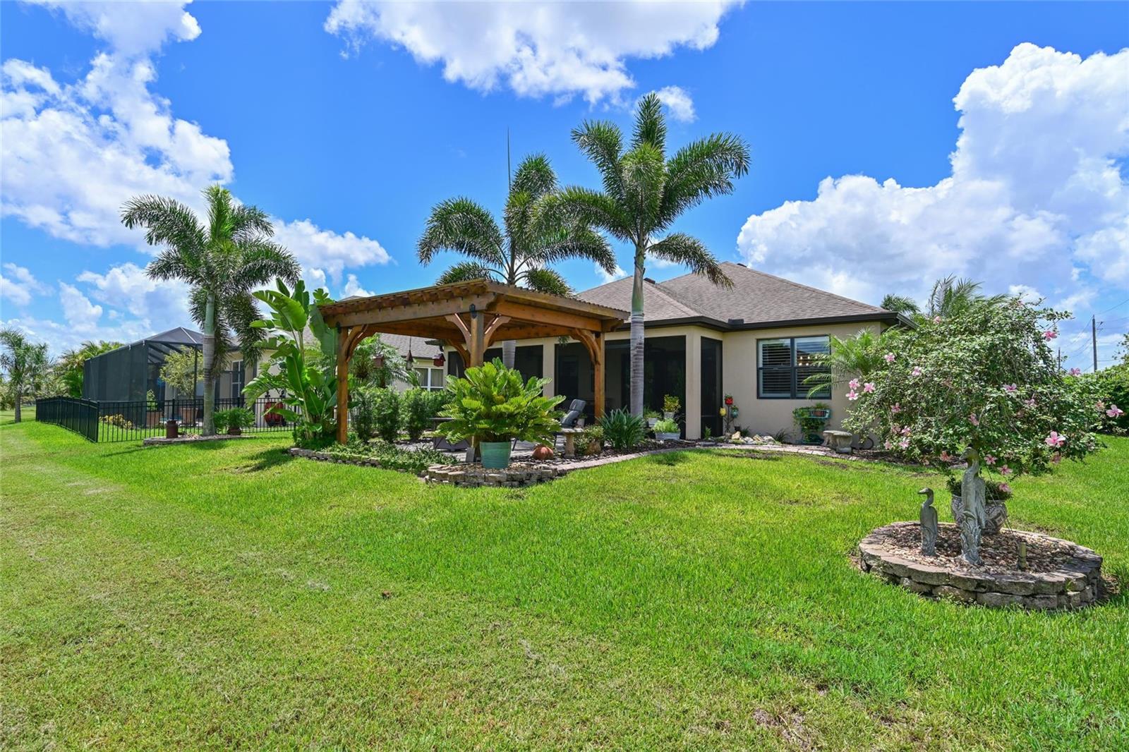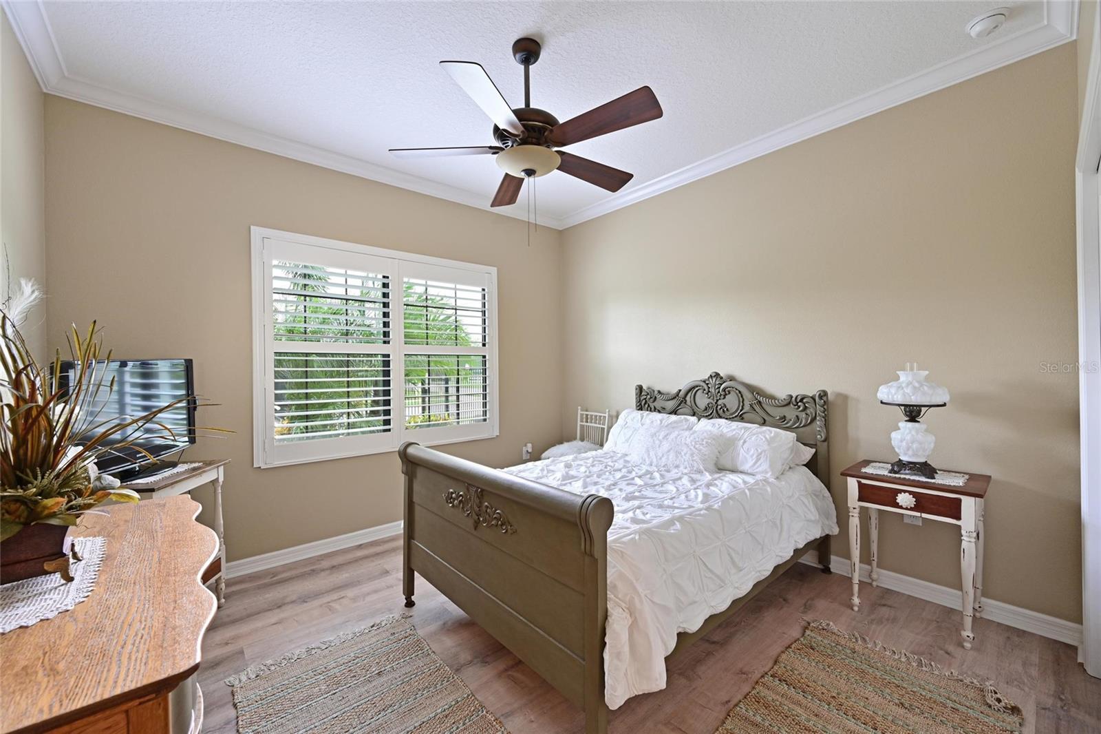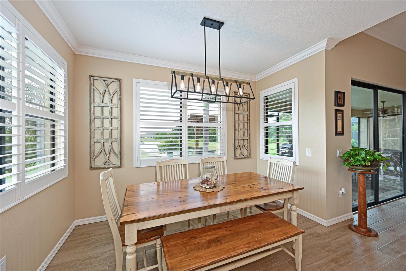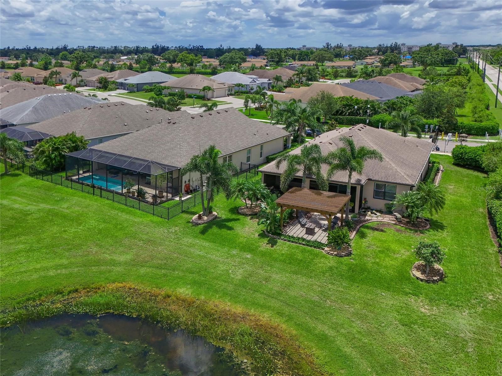 Impeccably Maintained Home in the Gated Community of Greyhawk Landing. Enjoy serene lake views and a lifestyle of comfort in this beautifully cared-for home, set on a premium lot with manicured landscaping and a paver driveway. Inside, a welcoming foyer greets you with warm wood-look plank tile flooring and 8’ doors, setting the tone for the stylish touches found throughout. This thoughtfully designed 2-bedroom, 2-bath home includes a versatile den or home office, perfect for today’s flexible living needs. The popular great room floor plan features a spacious living area with a tray ceiling accented by decorative wood beams and crown molding throughout the entire home, creating an elegant ambiance. The chef’s kitchen is both functional and modern, equipped with stainless steel appliances, granite countertops, gas stove, under-cabinet lighting, a double garbage pull-out, tile backsplash and a stylish Café refrigerator. Upper and lower cabinet crown molding and a closet pantry complete the space with efficiency and style. The spacious primary suite features luxury vinyl flooring, a tray ceiling, plantation shutters, and a generous walk-in closet. The ensuite bath is beautifully upgraded with quartz countertops, dual sinks, modern lighting and faucets, a tiled-to-ceiling walk-in shower, and plantation shutters. Enjoy the Florida lifestyle on the covered screened, paver lanai or relax under the modern pergola overlooking the tranquil lake. The split floor plan offers privacy for guests or family members, with a secondary bedroom and bath located at the front of the home. Additional highlights include: Whole-house water filtration system, Plantation shutters throughout, dedicated laundry room with front-load washer and dryer, sink, and cabinetry, mudroom entry from the garage with barn wood bench and storage, gutters, curbed landscaping, two-car garage with overhead hanging storage and included hurricane shutters. Residents have access to exceptional community amenities. Featuring 2 resort-style pools, 2 Community centers, Playgrounds, fitness center, Tennis, pickleball and basketball courts, soccer and baseball fields, bass-stocked lakes, and miles of nature trails. Situated in the heart of Sarasota/Bradenton with close proximity to world-renowned Beaches, and great shopping and dining at UTC Mall. Easy commute to Sarasota and Tampa airports. This home combines elegant upgrades with practical features in one of the area’s most desirable gated communities.