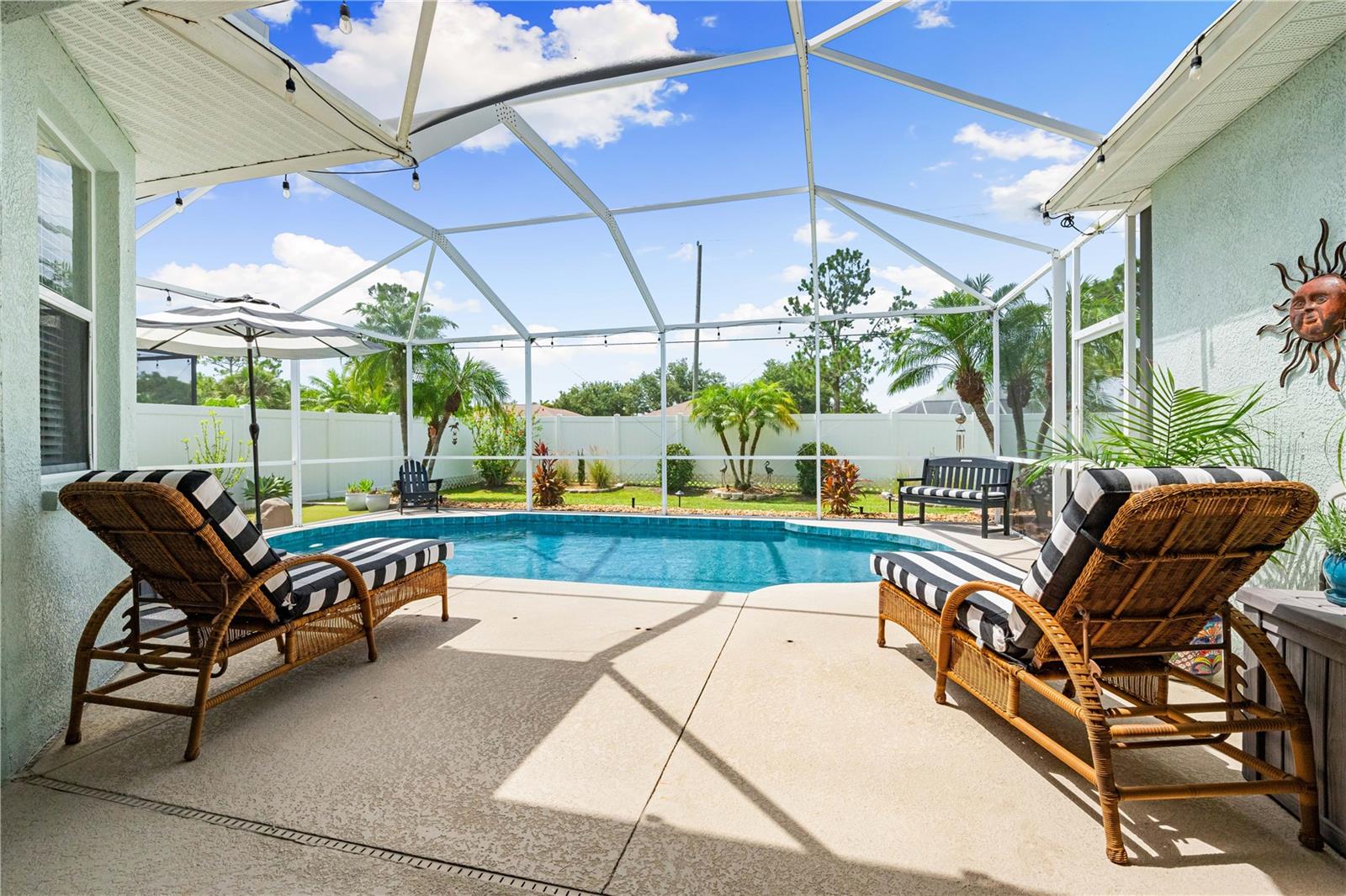 Welcome to this stunning home in the desirable Whisper Bend community featuring three bedrooms, two bathrooms, plus a bonus room/den and over 2,100 square feet of Florida living at its finest! This meticulously maintained and upgraded home is your gateway to the ultimate Florida lifestyle. The gourmet kitchen boasts upgraded cabinets with brand new brushed nickel hardware, granite countertops, Samsung and LG stainless steel appliances, a natural gas stainless steel range, subway tile backsplash, and a reverse osmosis drinking water system. The eat-in area overlooks your private saltwater pool oasis. The spacious Primary suite features additional HVAC ductwork for optimal cooling and opens directly to the lanai for seamless indoor-outdoor living. The Primary bathroom offers dual sinks, separate garden tub, and a large walk-in shower with rainfall and spa showerhead. The great room showcases a custom shiplap wall, and built-in electric fireplace. Interior upgrades include luxury vinyl plank flooring, a fully updated guest bath with quartz countertops, window treatments, vaulted ceilings, electrician-installed dimmer switches throughout, and a newer roof installed in 2020. For ultimate peace of mind, enjoy a Briggs and Stratton whole house generator (2023) with automatic weekly testing, professionally maintained HVAC, and 4-year-old Rinnai tankless water heater. Your private Florida paradise awaits in the large fenced backyard! Dive into the upgraded saltwater pool with new LED lighting, perfect your game on the putting green, or relax on the paved patio. A child safety pool fence ensures family security. Additional features include all TV mounts, recycling center cabinet, abundant storage, and convenient laundry room. Located minutes from pristine beaches, world-class shopping, and restaurants with easy interstate access - this is Florida living at its absolute best!