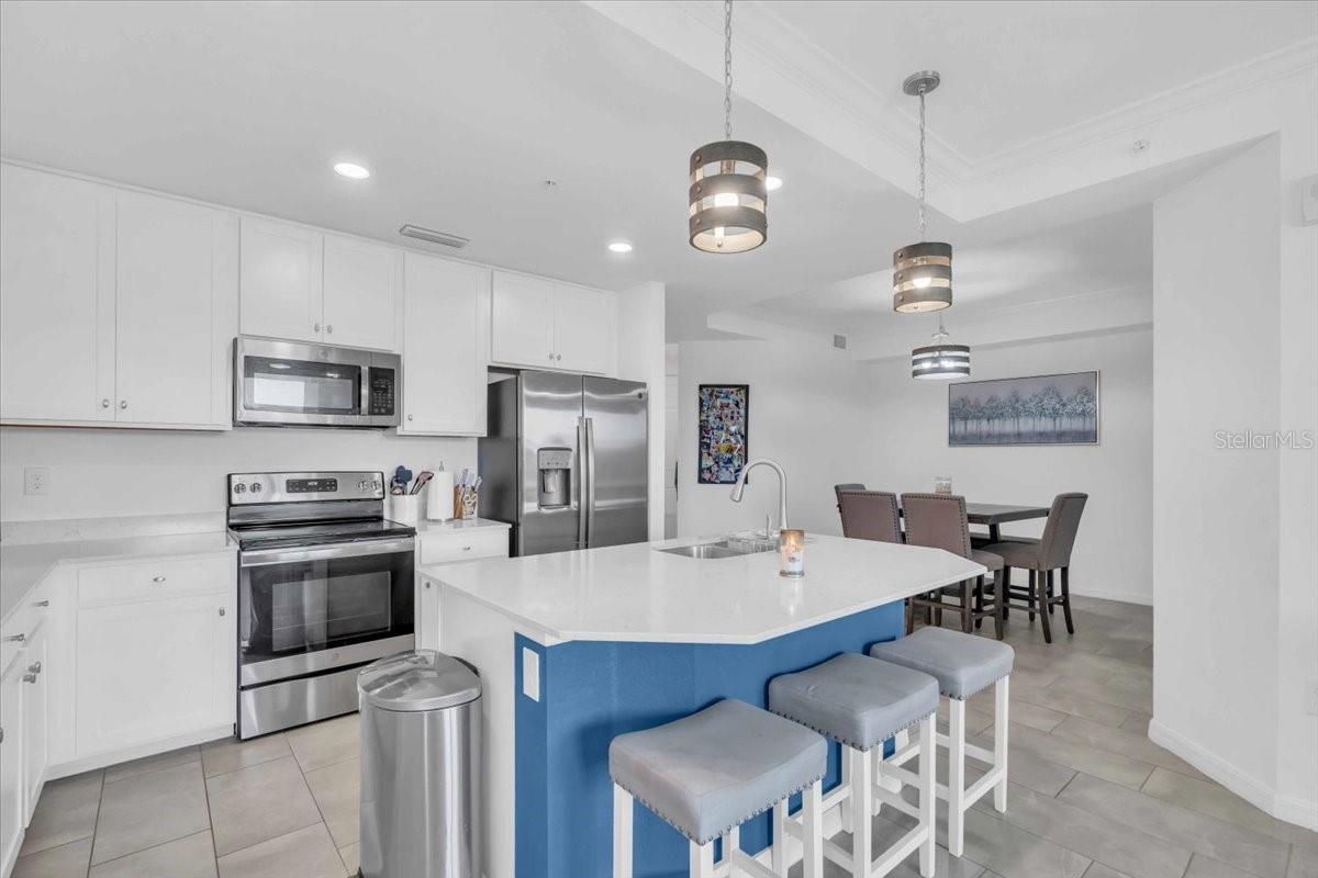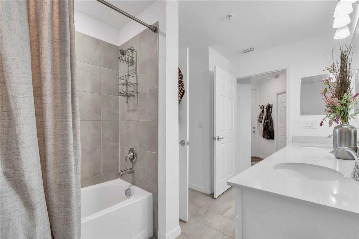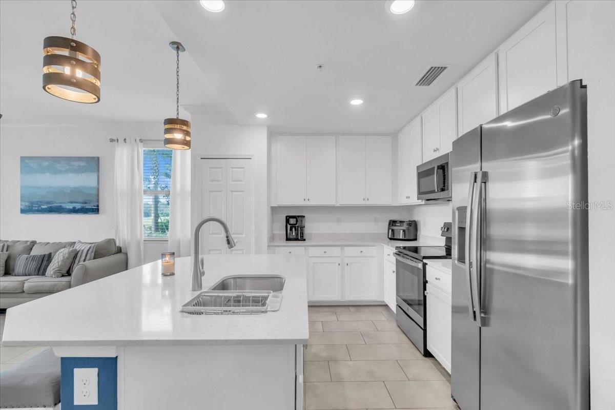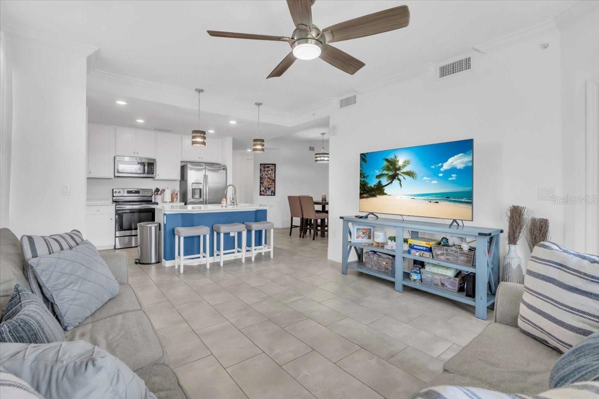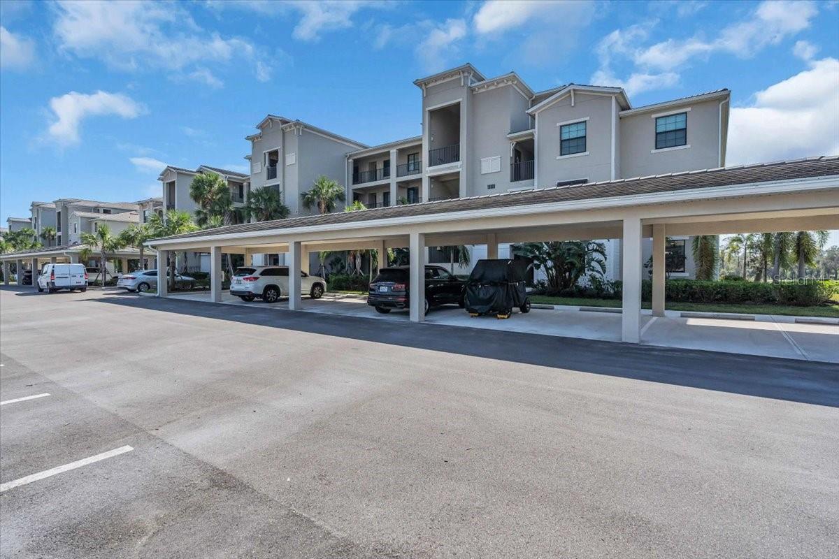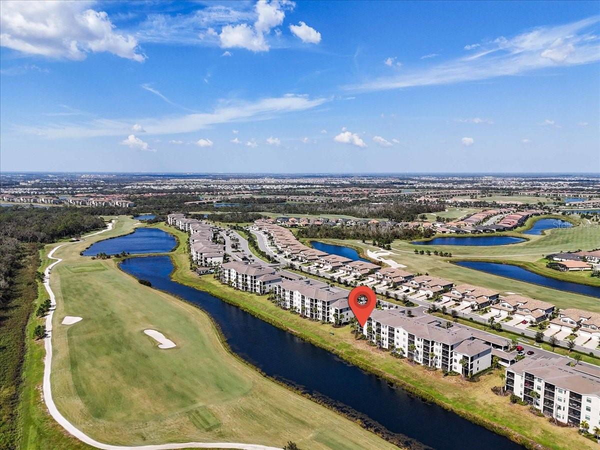 GROUND FLOOR, END UNIT, 3-bedroom, 2 bathroom condominium with golf membership in an amenity-rich community! NO CARPET. Beautifully designed and perfectly situated on the ground floor, offering easy access. Open floor plan filled with natural light, featuring a spacious living area that seamlessly flows into a modern kitchen equipped with stainless steel appliances and ample quartz counter space. The center island is a great place to have breakfast or a snack. Off the kitchen is a generous dining area. The primary suite boasts a private bathroom and a dual closets and is at the back of the home with water views, providing a tranquil retreat at the end of the day. The covered and screened lanai is next to the primary suite, off of the living area. It is a great place to enjoy your morning coffee or unwind in the evening with beautiful water and golf views. The split floor plan places the two additional bedrooms at the front of the unit, with one of the bedrooms connecting to the other full bath. Guests are able to access that bathroom from the hallway as well. The third bedrooms makes a great guest space, home office, or a hobby space. The unit comes with an outdoor storage closet as well as a reserved, covered parking space. Plenty of guest parking available. This property includes coveted golf membership, allowing you to enjoy the pristine greens of the community’s Arnold Palmer Championship 36-hole golf course. Beyond your front door, indulge in a wealth of amenities, including a grand clubhouse with beach entry lagoon pool, fitness center, clay tennis courts, casual poolside dining, full service spa, and so much more. Feel safe and secure with guarded gate access. Convenient access to everything Lakewood Ranch has to offer. Close to I-75, Waterside, UTC, top rated schools, shopping and dining. Not in a flood or evacuation zone but still close enough to all your favorite beaches. Within 22 miles of Siesta Key, Lido Key, and Anna Maria Island.